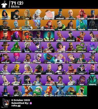 [PC/PSN/XBOX] 71 skins | FNCS 3:1 Champion | Era | Zeus | Snap | Peter Griffin | Omegarok | Paradigm (Reality-659) | Valeria | Optimus Prime | Malik | 2450 VB / FN