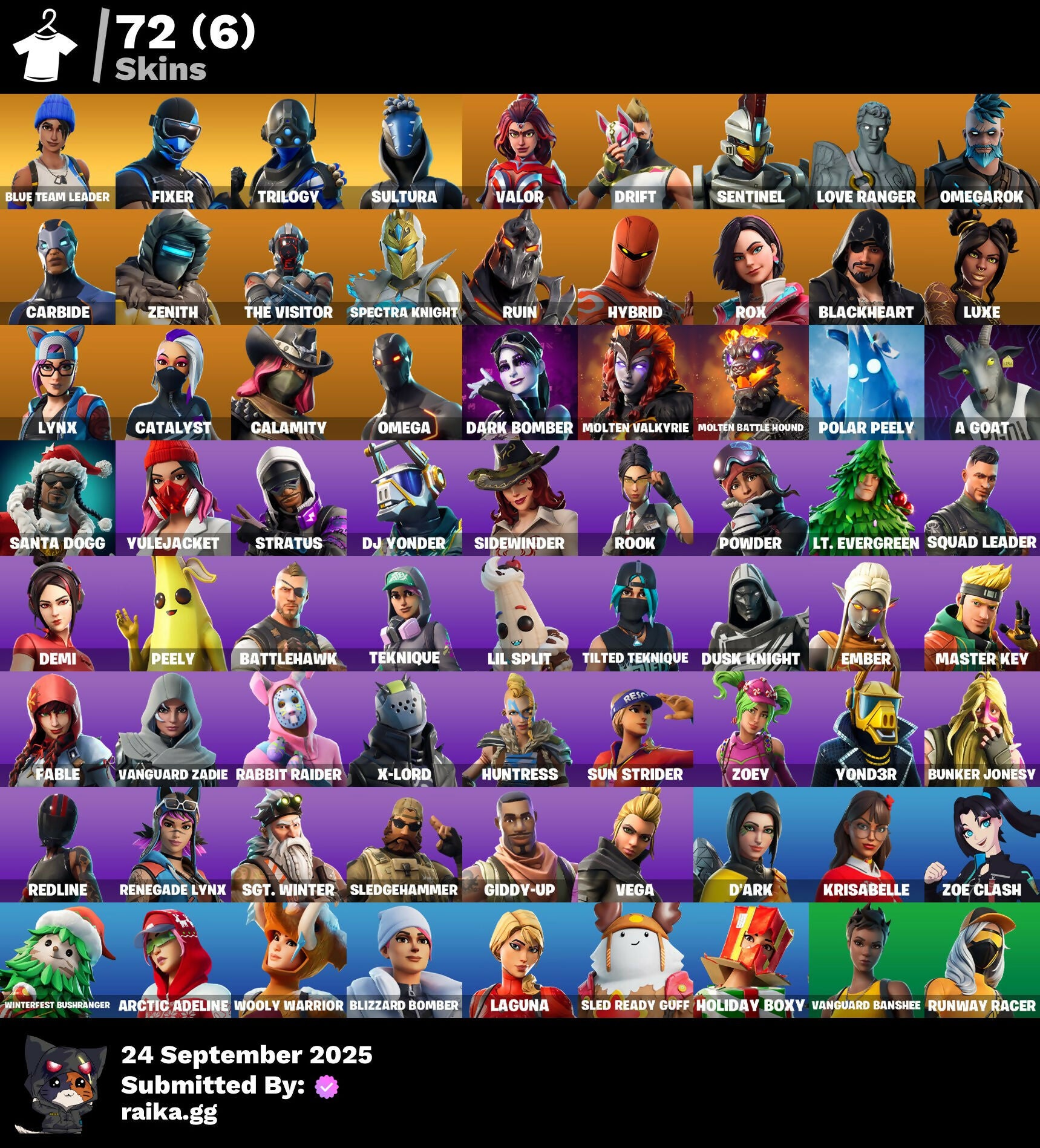 [PC/PSN/XBOX] 72 skins | Blue Team Leader | Fixer | Trilogy | Sultura | Valor | Drift | Sentinel | Love Ranger | Omegarok | Carbide | Zenith | The Visitor | 0 VB / FN