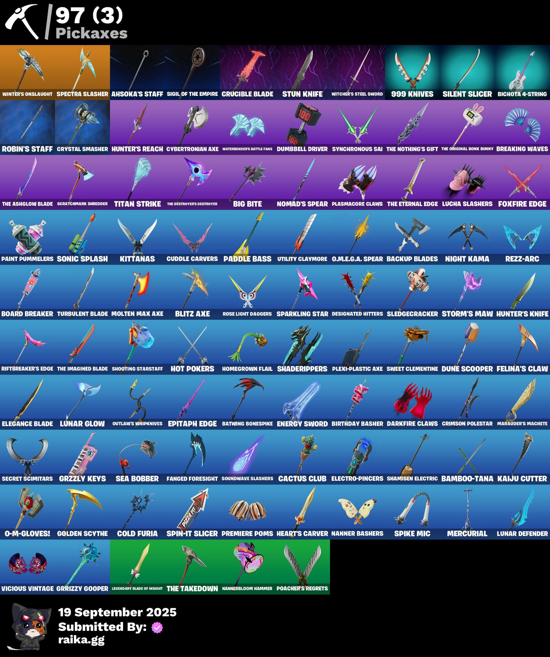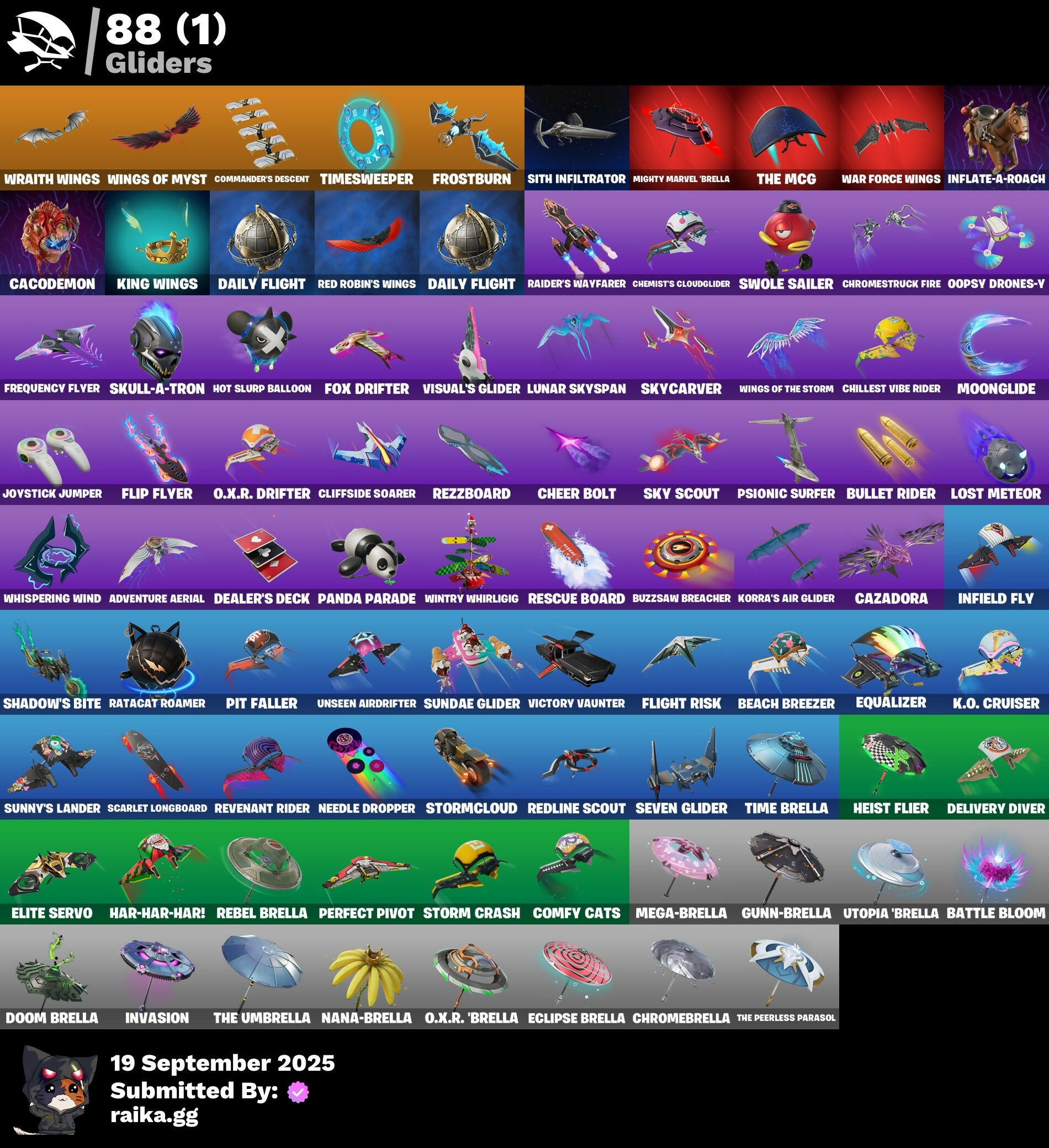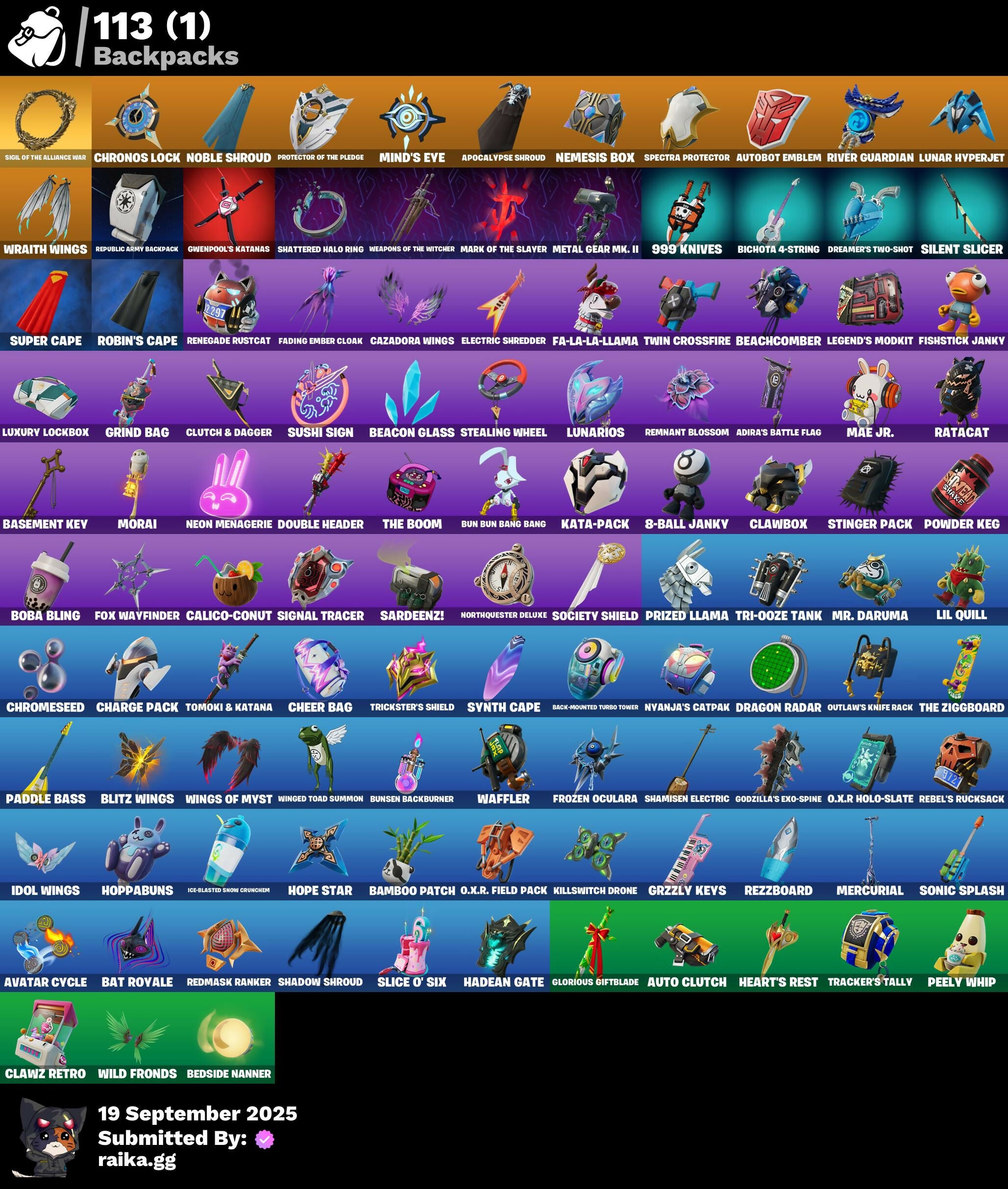 8-Ball Janky, 999 Knives, Adira's Armor, Adira's Battle Flag, Adventure Aerial, Aerial, Agent Patch, Ahsoka Tano, Ahsoka's Staff, All-Nighter, Antonia, Antonia In Action, Aphrodite, Apocalypse Shroud, Appeeling Drive, Arcade Cat, Arcane Research, Arctic Adeline, Ascension Nezumi, Astro Armor, Attraction, Auntie Dot, Auto Clutch, Autobot, Autobot Emblem, Avatar Cycle, Avatar's Flourish, B.R.U.T.E. Gunner, Back-Mounted Turbo Tower, Backup Blades, Balance Board, Bam-Boom!, Bamboo Patch, Bamboo-Tana, Baseball, Basement Key, Bat Royale, Battle Bloom, Battle Gamer Mae, Battle Mode, Battle Ready Era, Battle-Tested, Batwing Bonespike, Beach Breezer, Beachcomber, Beacon Glass, Beatzbunny, Bedside Nanner, Belt It!, Bichota 4-String, Big Bite, Big Guns, Bike To Go, Birdarang Flourish, Birthday Basher, Birthday Bud, Birthday Dash, Black Hole, Blitz Axe, Blitz Wings, Blocko, Board Breaker, Boba Bling, Boba Snack, Boneyard Brand, Boogie Down, Breaking Waves, Bruteball, Bubblegum Highwire, Buffer Fish, Bug Spray, Bullet Rider, Bullpen Brawler Dusty, Bun Bun Bang Bang, Bunsen Backburner, Bushie Bright, Buzzsaw Breacher, Bytes, Bytes (Lone Traveler), Bytes' Sigil, Cacodemon, Cactus Club, Calico Holiday, Calico-Coconut, Calico-Conut, Call Me, Called Shot, Carbon Scarlet, Cazadora, Cazadora Wings, Cerberus, Cerberus Medallion, Chaos Directive, Charge Pack, Cheer Bag, Cheer Bolt, Chef's Special, Chemist's Cloudglider, Chillest Vibe Rider, Choppy, Chrome Marked, Chrome Punk, Chromebrella, Chromeseed, Chromestruck Fire, Chronos Lock, Classic Age, Clawbox, Clawz Retro, Cliffside Soarer, Club President Helsie, Clutch & Dagger, Cold Furia, Collector Kado Thorne, Comet, Comfy Cats, Commander's Descent, Contour Camo, Coral Commando, Coral Crush, Count It!, Courageous Mikasa, Crack It, Crimson Polestar, Crowning Achievement, Crucible Blade, Crystal Smasher, Cuddle Carvers, Cybertronian Axe, Cyclo Curl, Daily Flight, Daisies, Darkfire Claws, Dealer's Deck, Delivery Diver, Designated Hitters, Destroyer Signature, Determined Korra, Determined Renegade, Dice Roll, Diva's Grin, Do The 'Split, Don't Mess With Patch, Doom Brella, Doom Slayer, Double Header, Doze Dab, Dragon Radar, Dragon Rune Lances, Dragon Spirit, Dramatic Flares, Dreamer's Two-Shot, Drones-V View, Dumbbell Driver, Dumbell Driver, Dune Scooper, Dusk Knight, Dusty, E.G.O., Easter Egg, Eclipse Brella, Electric Shredder, Electro-Pincers, Elegance Blade, Elite Servo, Empress Fan Dance, Energy Sword, Epitaph Edge, Equalizer, Era, Eren Jaeger, Eren's Faceoff, Escapees, Exile's Emblem, Expressionism, Eye Of Agamotto, Fa-La-La-Llama, Fading Ember Cloak, Fan Attack, Fang Dance, Fanged Foresight, Felina's Claw, Final Eclipse, Final Harbinger, Fish Thicc, Fishstick Janky, Fizzix, Flaky Feast, Flashback Breakdown, Flight Risk, Flip Flyer, Flippin' Away, Flood, For O.X.R.!, Fox Drifter, Fox Wayfinder, Foxfire Edge, Frequency Flyer, Frostburn, Frozen Oculara, Frozen Over, Fryangles, Fully Charged Drift, Fusion!, G1 Optimus Prime, GG Snowman, Galactic Roundel, Geralt, Geralt Of Rivia, Get Out Of Your Mind, Gila, Gila Classic, Gilded Heart, Glorious Giftblade, Godzilla's Exo-Spine, Golden Scythe, Good Game!, Good Sportsmanship, Gothic Morgan, Grind Bag, Grizzly Gunz, Grizzly Keys, Groovy!, Grriz, Grrizzy Gooper, Grzzly Keys, Guggi Was Here, Gunn-Brella, Gunnar's Special, Gwenpool's Katanas, Gwetterman Jacket, Hadean Gate, Hand Of Trace, Har-Har-Har!, Harbinger Armor Omegarok, Haute Hustle, Haylee Skye, Heart Collector, Heart's Carver, Heart's Rest, Heavy Metal Omega, Heist Flier, Helsie, High Stakes Club, Highwire, Highwire Hop, Highwired, Holiday Boxy, Homegrown Flail, Hope, Hope Star, Hope's Look, Hoppabuns, Horizon’s Call, Hot Pokers, Hot Slurp Balloon, Hunter Purple, Hunter's Knife, Hunter's Reach, Hype!, Hypno-Bat, Hypnot-Eyes, I Need You To Concentrate, I'm A Mystery, Ice-Blasted Snow Crunchem, Iconic Age, Iconic Era, Idol Lights, Idol Wings, Igni Sign, Imagined Edge, Imagined Order, Imani, Imperial March, Infield Fly, Inflate-A-Roach, Influential, Intentions Unknown, Invasion, It Is Finished, It's Like This, Jones Underground, Joystick Jumper, Jujutsu Kaisen Emblem, K.O. Cruiser, Ka-Choom!, Kado Thorne, Kaiju Cutter, Kamino's Finest, Kata-Pack, Khaby Lame, Killswitch, Killswitch Drone, Killswitch Insignia, King Wings, King's Seal, Kittanas, Knight's Honor, Kon's Bark, Korra, Korra's Air Glider, Kryptonian Crest, Kymera Swarm, Lady In Gold, Laser Focused, Lbc Signature, Leafy Longboardin', Leelah, Legend's Modkit, Legend's Retribution, Legendary Blade of Insight, Lennox Rose, Lightrider, Lightrider Insignia, Lil Quill, Lil Split, Lil T-6 Shuttle, Lil' Ghost, Lil' Longboat, Lil' Podracer, Lil' Prancer, Lithic, Lobby Classic, Lord Vader, Lorenzo, Lorenzo Explores, Lorenzo The Reckless, Lost Meteor, Lt. Ripp Slade, Lucha Slashers, Lunar Defender, Lunar Glow, Lunar Hyperjet, Lunar Party, Lunar Skyspan, Lunarian Luxury, Lunarios, Luxury Lockbox, Machinist In Control, Mad Mask, Mae, Mae Jr., Mae's Sigil, Magmatic Mizuki, Major Mancake, Make A Seat, Marauder's Machete, Mariposa, Mariposa's Mask, Mark Of The Champion, Mark Of The Slayer, Massai, Massai Fire, Master Plan, Mega-Brella, Menacing Trace, Meow Skulls, Mercurial, Metal Gear Mk. II, Midnight Mycology, Midnight Rumble, Mighty Marvel 'Brella, Mind's Eye, Mini Slayer Fistbump, Missing: Peely, Mizuki, Modern Rōnin, Molten Max Axe, Monstrous Hunger, Moonglide, Moonglow, Alight, Morai, Morales Mark, Morgan Myst, Morgan Myst Insignia, Mr. Daruma, Multiplayer, Muscle Memory, Mystica, Nana-Brella, Nanner Bashers, Nannerbloom Hammer, Naughty Or Nice?, Needle Dropper, Nemesis Box, Neon Menagerie, Never Yield, Nezumi, Night Kama, Noble Shroud, Nolan Chance, Nolan Takes Aim, Nolan's Sigil, Nomad's Spear, Northquester Deluxe, Nyanja's Catpak, O-M-Gloves!, O.M.E.G.A. Spear, O.X.R Holo-Slate, O.X.R. 'Brella, O.X.R. Drifter, O.X.R. Field Pack, Omegarok, Omegarok Grin, Ooh Yum!, Oopsy Drones-Y, Oozey, Optimus Prime, Original Is