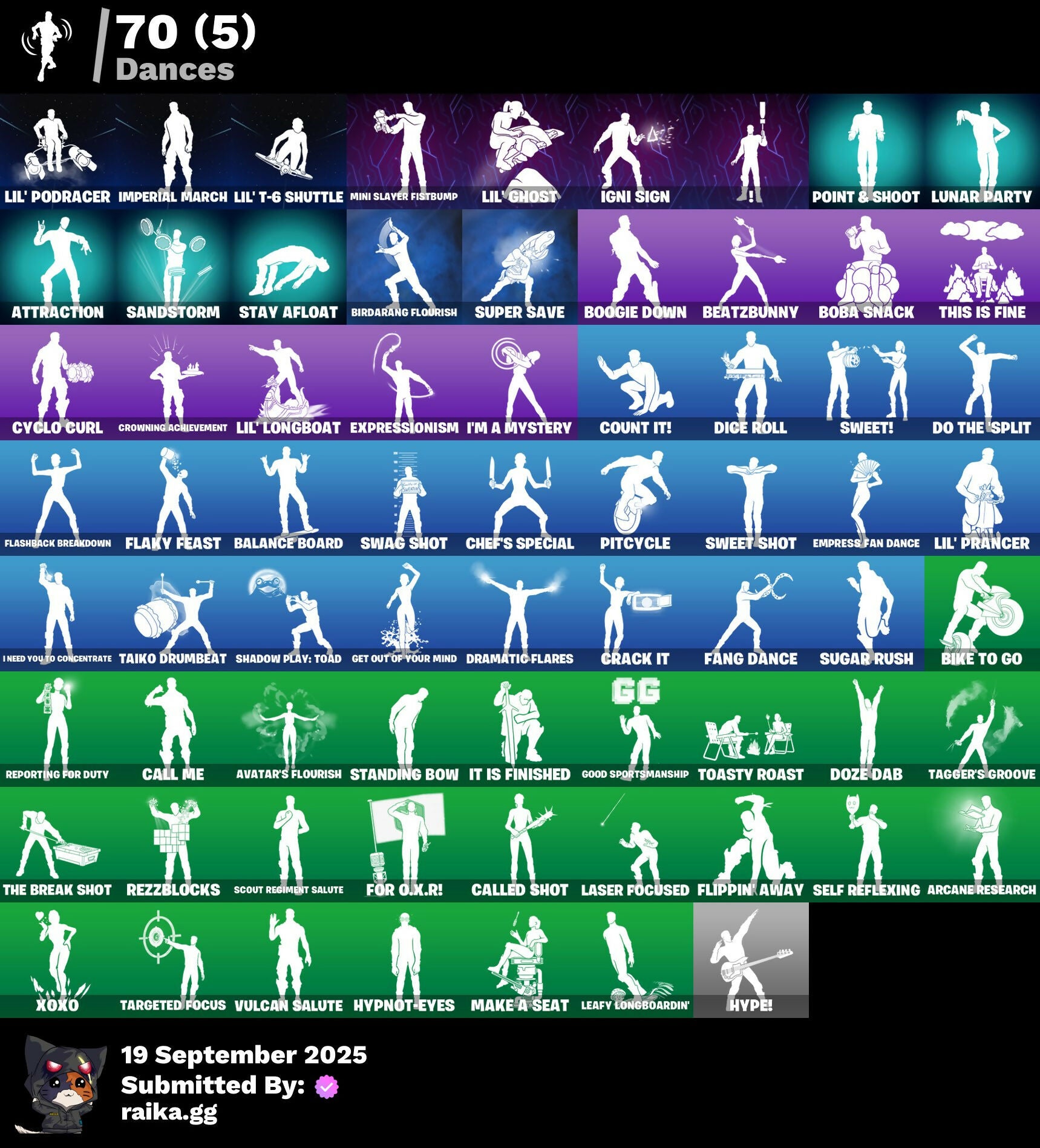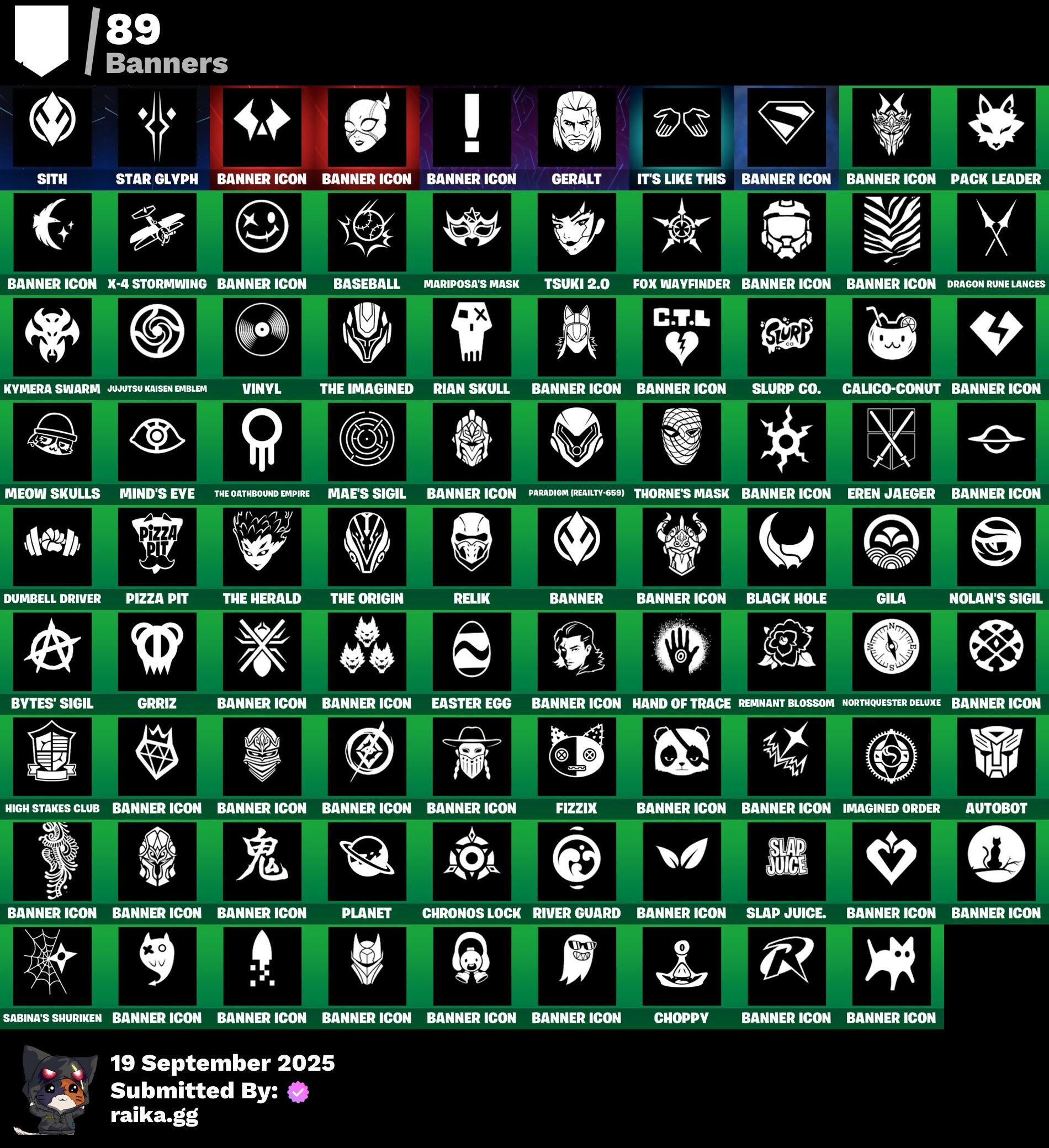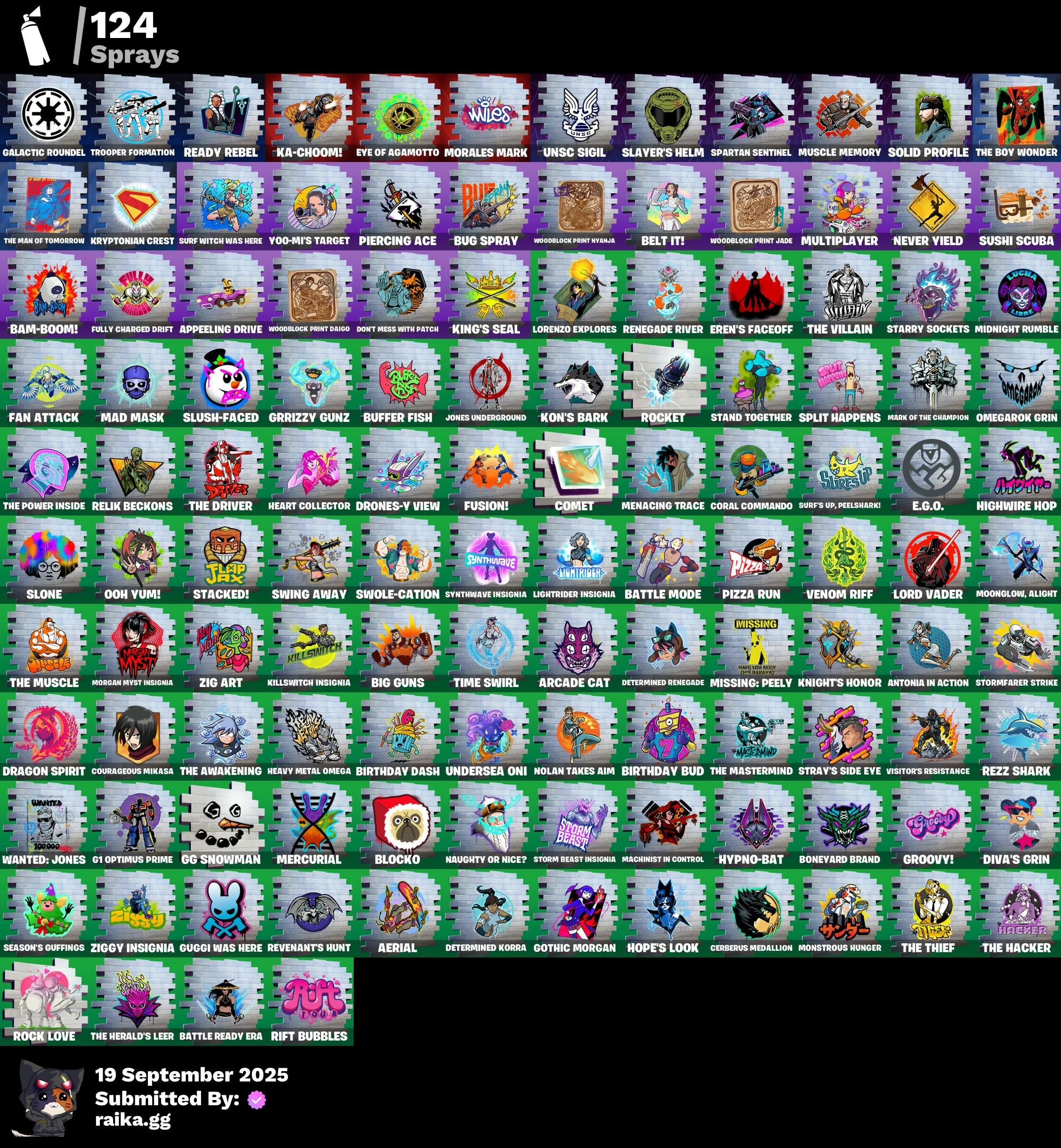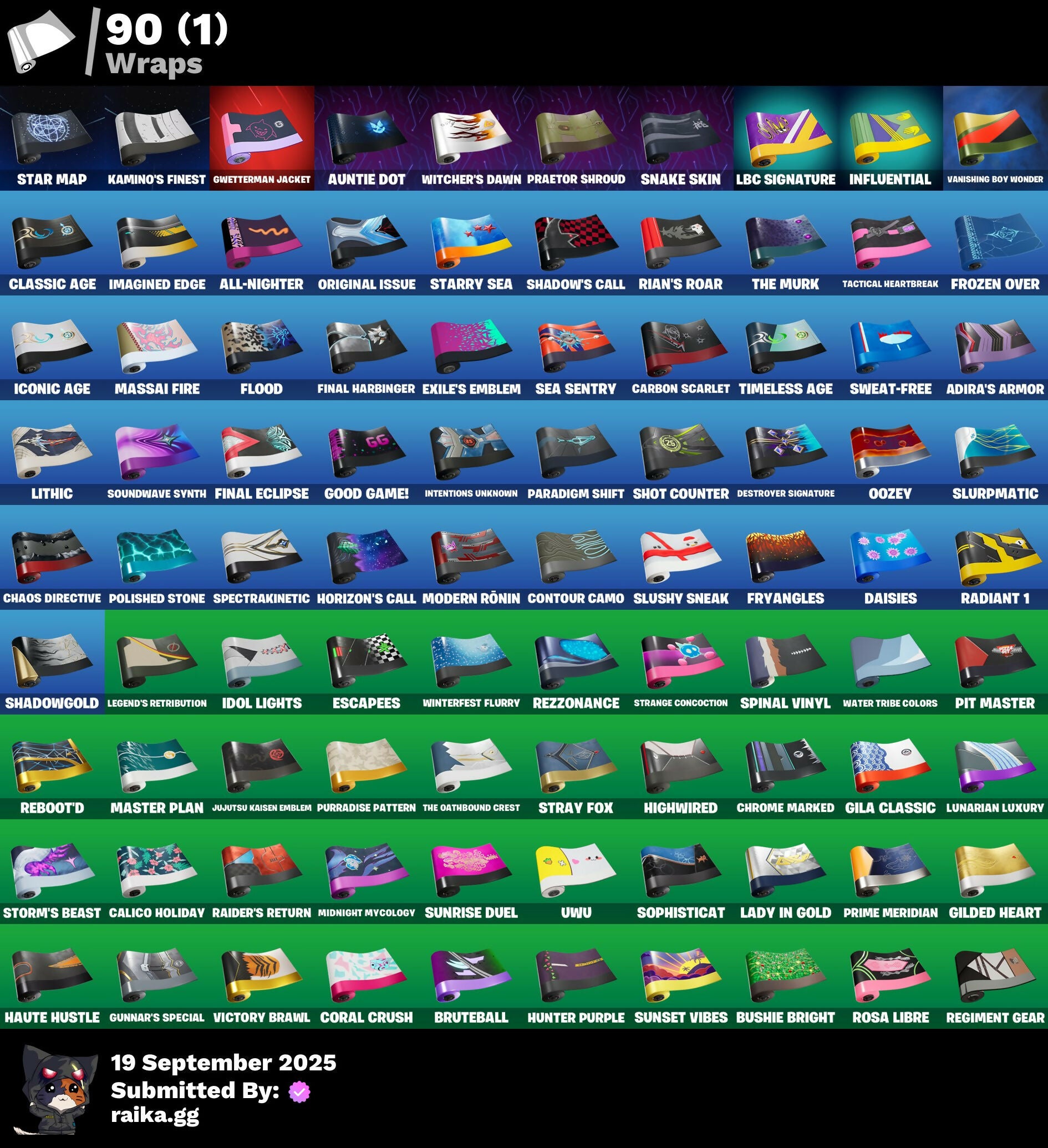 8-Ball Janky, 999 Knives, Adira's Armor, Adira's Battle Flag, Adventure Aerial, Aerial, Agent Patch, Ahsoka Tano, Ahsoka's Staff, All-Nighter, Antonia, Antonia In Action, Aphrodite, Apocalypse Shroud, Appeeling Drive, Arcade Cat, Arcane Research, Arctic Adeline, Ascension Nezumi, Astro Armor, Attraction, Auntie Dot, Auto Clutch, Autobot, Autobot Emblem, Avatar Cycle, Avatar's Flourish, B.R.U.T.E. Gunner, Back-Mounted Turbo Tower, Backup Blades, Balance Board, Bam-Boom!, Bamboo Patch, Bamboo-Tana, Baseball, Basement Key, Bat Royale, Battle Bloom, Battle Gamer Mae, Battle Mode, Battle Ready Era, Battle-Tested, Batwing Bonespike, Beach Breezer, Beachcomber, Beacon Glass, Beatzbunny, Bedside Nanner, Belt It!, Bichota 4-String, Big Bite, Big Guns, Bike To Go, Birdarang Flourish, Birthday Basher, Birthday Bud, Birthday Dash, Black Hole, Blitz Axe, Blitz Wings, Blocko, Board Breaker, Boba Bling, Boba Snack, Boneyard Brand, Boogie Down, Breaking Waves, Bruteball, Bubblegum Highwire, Buffer Fish, Bug Spray, Bullet Rider, Bullpen Brawler Dusty, Bun Bun Bang Bang, Bunsen Backburner, Bushie Bright, Buzzsaw Breacher, Bytes, Bytes (Lone Traveler), Bytes' Sigil, Cacodemon, Cactus Club, Calico Holiday, Calico-Coconut, Calico-Conut, Call Me, Called Shot, Carbon Scarlet, Cazadora, Cazadora Wings, Cerberus, Cerberus Medallion, Chaos Directive, Charge Pack, Cheer Bag, Cheer Bolt, Chef's Special, Chemist's Cloudglider, Chillest Vibe Rider, Choppy, Chrome Marked, Chrome Punk, Chromebrella, Chromeseed, Chromestruck Fire, Chronos Lock, Classic Age, Clawbox, Clawz Retro, Cliffside Soarer, Club President Helsie, Clutch & Dagger, Cold Furia, Collector Kado Thorne, Comet, Comfy Cats, Commander's Descent, Contour Camo, Coral Commando, Coral Crush, Count It!, Courageous Mikasa, Crack It, Crimson Polestar, Crowning Achievement, Crucible Blade, Crystal Smasher, Cuddle Carvers, Cybertronian Axe, Cyclo Curl, Daily Flight, Daisies, Darkfire Claws, Dealer's Deck, Delivery Diver, Designated Hitters, Destroyer Signature, Determined Korra, Determined Renegade, Dice Roll, Diva's Grin, Do The 'Split, Don't Mess With Patch, Doom Brella, Doom Slayer, Double Header, Doze Dab, Dragon Radar, Dragon Rune Lances, Dragon Spirit, Dramatic Flares, Dreamer's Two-Shot, Drones-V View, Dumbbell Driver, Dumbell Driver, Dune Scooper, Dusk Knight, Dusty, E.G.O., Easter Egg, Eclipse Brella, Electric Shredder, Electro-Pincers, Elegance Blade, Elite Servo, Empress Fan Dance, Energy Sword, Epitaph Edge, Equalizer, Era, Eren Jaeger, Eren's Faceoff, Escapees, Exile's Emblem, Expressionism, Eye Of Agamotto, Fa-La-La-Llama, Fading Ember Cloak, Fan Attack, Fang Dance, Fanged Foresight, Felina's Claw, Final Eclipse, Final Harbinger, Fish Thicc, Fishstick Janky, Fizzix, Flaky Feast, Flashback Breakdown, Flight Risk, Flip Flyer, Flippin' Away, Flood, For O.X.R.!, Fox Drifter, Fox Wayfinder, Foxfire Edge, Frequency Flyer, Frostburn, Frozen Oculara, Frozen Over, Fryangles, Fully Charged Drift, Fusion!, G1 Optimus Prime, GG Snowman, Galactic Roundel, Geralt, Geralt Of Rivia, Get Out Of Your Mind, Gila, Gila Classic, Gilded Heart, Glorious Giftblade, Godzilla's Exo-Spine, Golden Scythe, Good Game!, Good Sportsmanship, Gothic Morgan, Grind Bag, Grizzly Gunz, Grizzly Keys, Groovy!, Grriz, Grrizzy Gooper, Grzzly Keys, Guggi Was Here, Gunn-Brella, Gunnar's Special, Gwenpool's Katanas, Gwetterman Jacket, Hadean Gate, Hand Of Trace, Har-Har-Har!, Harbinger Armor Omegarok, Haute Hustle, Haylee Skye, Heart Collector, Heart's Carver, Heart's Rest, Heavy Metal Omega, Heist Flier, Helsie, High Stakes Club, Highwire, Highwire Hop, Highwired, Holiday Boxy, Homegrown Flail, Hope, Hope Star, Hope's Look, Hoppabuns, Horizon’s Call, Hot Pokers, Hot Slurp Balloon, Hunter Purple, Hunter's Knife, Hunter's Reach, Hype!, Hypno-Bat, Hypnot-Eyes, I Need You To Concentrate, I'm A Mystery, Ice-Blasted Snow Crunchem, Iconic Age, Iconic Era, Idol Lights, Idol Wings, Igni Sign, Imagined Edge, Imagined Order, Imani, Imperial March, Infield Fly, Inflate-A-Roach, Influential, Intentions Unknown, Invasion, It Is Finished, It's Like This, Jones Underground, Joystick Jumper, Jujutsu Kaisen Emblem, K.O. Cruiser, Ka-Choom!, Kado Thorne, Kaiju Cutter, Kamino's Finest, Kata-Pack, Khaby Lame, Killswitch, Killswitch Drone, Killswitch Insignia, King Wings, King's Seal, Kittanas, Knight's Honor, Kon's Bark, Korra, Korra's Air Glider, Kryptonian Crest, Kymera Swarm, Lady In Gold, Laser Focused, Lbc Signature, Leafy Longboardin', Leelah, Legend's Modkit, Legend's Retribution, Legendary Blade of Insight, Lennox Rose, Lightrider, Lightrider Insignia, Lil Quill, Lil Split, Lil T-6 Shuttle, Lil' Ghost, Lil' Longboat, Lil' Podracer, Lil' Prancer, Lithic, Lobby Classic, Lord Vader, Lorenzo, Lorenzo Explores, Lorenzo The Reckless, Lost Meteor, Lt. Ripp Slade, Lucha Slashers, Lunar Defender, Lunar Glow, Lunar Hyperjet, Lunar Party, Lunar Skyspan, Lunarian Luxury, Lunarios, Luxury Lockbox, Machinist In Control, Mad Mask, Mae, Mae Jr., Mae's Sigil, Magmatic Mizuki, Major Mancake, Make A Seat, Marauder's Machete, Mariposa, Mariposa's Mask, Mark Of The Champion, Mark Of The Slayer, Massai, Massai Fire, Master Plan, Mega-Brella, Menacing Trace, Meow Skulls, Mercurial, Metal Gear Mk. II, Midnight Mycology, Midnight Rumble, Mighty Marvel 'Brella, Mind's Eye, Mini Slayer Fistbump, Missing: Peely, Mizuki, Modern Rōnin, Molten Max Axe, Monstrous Hunger, Moonglide, Moonglow, Alight, Morai, Morales Mark, Morgan Myst, Morgan Myst Insignia, Mr. Daruma, Multiplayer, Muscle Memory, Mystica, Nana-Brella, Nanner Bashers, Nannerbloom Hammer, Naughty Or Nice?, Needle Dropper, Nemesis Box, Neon Menagerie, Never Yield, Nezumi, Night Kama, Noble Shroud, Nolan Chance, Nolan Takes Aim, Nolan's Sigil, Nomad's Spear, Northquester Deluxe, Nyanja's Catpak, O-M-Gloves!, O.M.E.G.A. Spear, O.X.R Holo-Slate, O.X.R. 'Brella, O.X.R. Drifter, O.X.R. Field Pack, Omegarok, Omegarok Grin, Ooh Yum!, Oopsy Drones-Y, Oozey, Optimus Prime, Original Is
