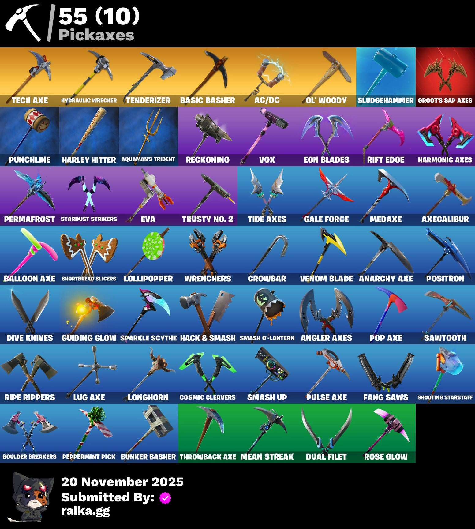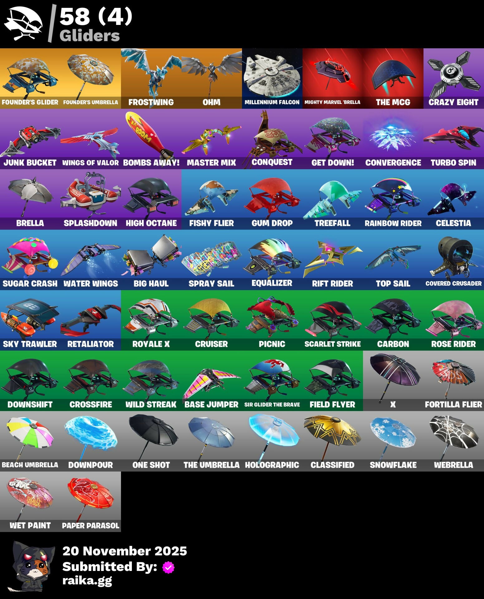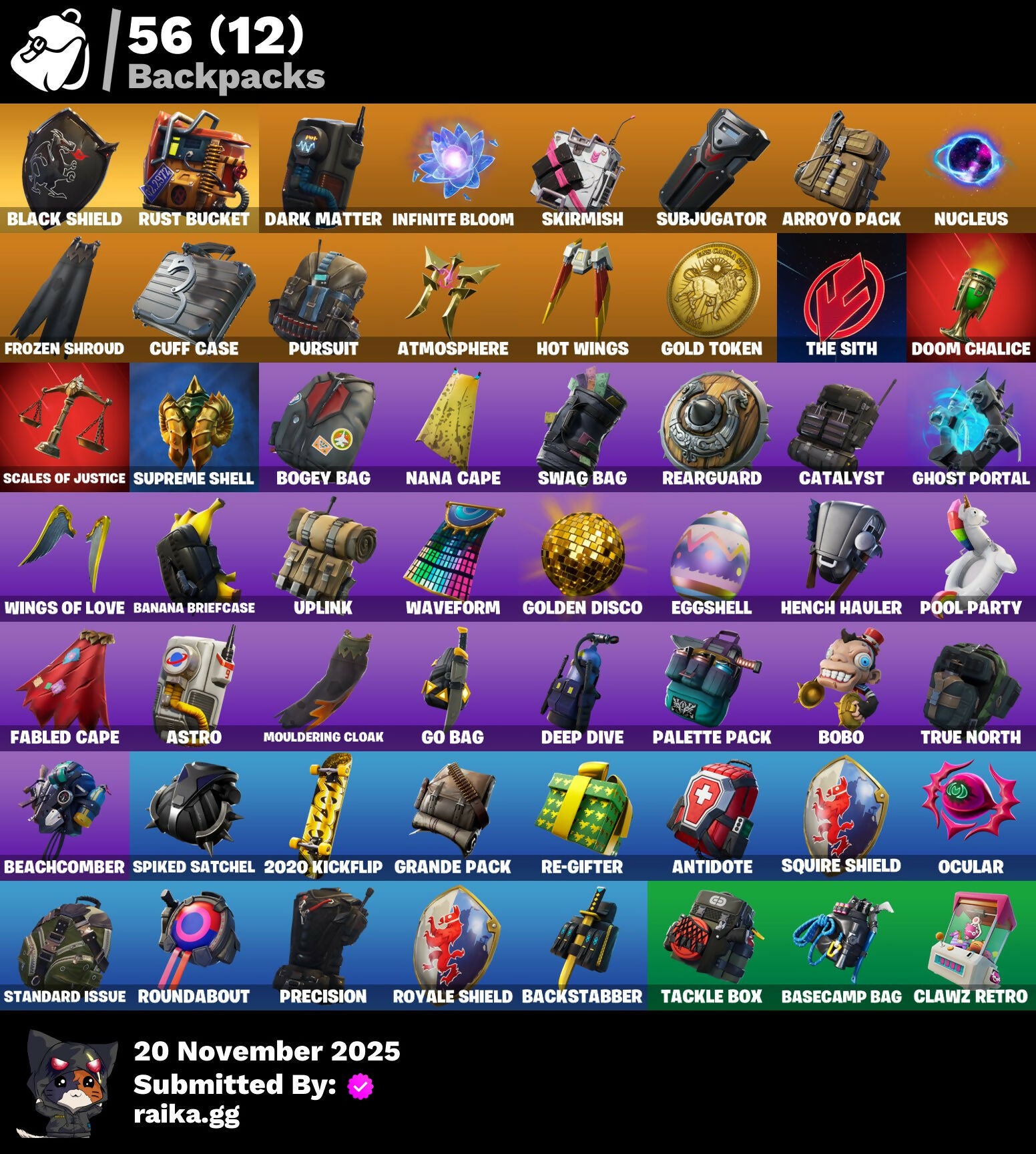 2020 Kickflip, 8-Ball, A.L.T.E.R., AC/DC, Afterparty, Agent Nana, Agent Peely, Air Shredder, Anarchy Axe, Angler Axes, Antidote, Aquaman, Aquaman's Trident, Ark, Arrow, Arroyo Pack, Asmodeus, Astro, Atmosphere, Axecalibur, B.R.U.T.E. Navigator, Backstabber, Bacon, Balloon Axe, Banana Briefcase, Banner, Banner Icon, Base Jumper, Basecamp Bag, Basic Basher, Batman, Battle Bus, Battlehawk, Beach Chair, Beach Umbrella, Beachcomber, Bee, Bees!, Best Mates, Big Haul, Birdie, Black Knight, Black Shield, Blowing Bubbles, Blue Squire, Bobo, Bogey Bag, Bombs Away!, Bone, Boogeyman, Boogie, Boogie Down, Bot, Boulder Breakers, Bowling, Breakdown, Brella, Brutus, Bunker Basher, Bunker Jonesy, Bunny Brawler, Bush, Bush Peek, Busy, Butterfly, Cake, Calamity, Calculated, Call Me, Cameo, Campfire, Candy Cane, Cap Kick, Carbide, Carbon, Cash Grab, Cat Soldier, Catalyst, Celestia, Chains, Chalk Outline, Chick, Circle, Classified, Clawz Retro, Cloudburst, Cluck Strut, Cobra, Comet, Conquest, Constructor, Converge, Convergence, Cosmic Cleavers, Covered Crusader, Crab, Crabby King, Crazy Castle, Crazy Eight, Crossfire, Crosshair, Crowbar, Cruiser, Crunk Bunny, Cube, Cuddly Bear, Cuff Case, Cursed, DJ Yonder, Dabstand, Dark Matter, Dark Voyager, Deadpool, Deep Dab, Deep Dive, Demi, Diamond Shapes, Dice, Dinosaur, Dinosaur Skull, Dip, Dive Knives, Doctor Doom, Dog Bowl, Dog Collar, Dolphin, Doom Chalice, Downpour, Downshift, Dragon, Dream Feet, Drift, Droop, Dual Filet, Duck, Durrr, Durrr Burger, E.G.O., EVA, Eagle, Egg, Eggshell, Electro Shuffle, Elite Agent, Emote Camo, Enforcer, Eon Blades, Eq, Equalizer, Explosion, Fabled Cape, Face Palm, Fade, Fake Door, Falcon, Fang Saws, Fate, Featherweight, Fence, Field Flyer, Fire V Ice, Fish Hook, Fishy, Fishy Flier, Flail, Flapper, Flippin' Away, Floating Island, Floss, Flowy Hat, Fortilla Flier, Founder's Glider, Founder's Umbrella, Fox Clan Mask, Freestylin', Frosted, Frostwing, Frozen Shroud, Fryangles, Funk Ops, GG Ornament, GG Potion, GG Smiley, GG Snowman, Galaxy Scout, Gale Force, Gas Mask, Gear Specialist Maya, Gentleman's Dab, Get Down!, Ghost Portal, Giddy-Up, Go Bag, Gold Token, Golden Disco, Golf Ball, Good Vibes, Grande Pack, Grid, Groot's Sap Axes, Guiding Glow, Gum Drop, Hack & Smash, Hammerhead, Hand Horns, Happy Cloud, Happy Kit, Harley Hitter, Harley Quinn, Harmonic Axes, Hearts, Heat, Hench, Hench Hauler, Hero Emblem, High Five, High Octane, Hollowhead, Holographic, Hoodie, Hot Wings, Hula Hoopin', Huntress, Hybrid Egg, Hydraulic Wrecker, Ice Cream, Ice Cream Truck, Industrious, Infectious, Infinite Bloom, Iris, It's Go Time!, Jaywalking, Journey, Journey Vs Hazard, Jubilation, Jules, Jules' Mask, Jump Jets, Junk Bucket, Kaboom!, Kenshi Yonezu, Kevin, Kevin Runes, Keyed Up, Kit, Knighted, Laser Chomp, Lazer Blast, Lightning, Lion Herald, Liteshow, Llama De Muertos, Llamacorn, Lobby Classic, Lock It Up, Log, Lollipopper, Longhorn, Looted, Lt. Evergreen, Lucha GG, Lug Axe, Manhole Cover, Masked Scuba Jonesy, Master Engineer, Master Mix, Mayhem, Mean Streak, Mecha Fish, Medaxe, Meow Moon, Meowabunga!, Meowstermind, Midas' Shadow, Mighty Marvel 'Brella, Millennium Falcon, Mission Specialist, Moisty Mire, Monks, Monster Truck, Moonwalker, Mouldering Cloak, Nana Cape, Nana Nana, New Year 2020, Night, Ninja, Nope, Norse Llama, Nucleus, Ocean, Ocean Wave, Ocular, Ohm, Ol' Woody, One Shot, Oni Mask, Only 90's Kids, Orange Justice, Out West, Outlander, Overcharged, Paint Brush, Palette Pack, Palm Trees, Paper Parasol, Paper Plane, Paw, Peace Out, Peppermint Pick, Permafrost, Phantom, Pickaxe, Picnic, Pink, Pink Splatter, Pixel Jonesy, Pixels Royale, Pizza, Planet, Poised Playmaker, Pony Up, Pool Party, Pop Axe, Popcorn, Positron, Potato Aim, Precision, Psycho, Pulse Axe, Punchline, Punk Ororo, Pursuit, Racing Checkers, Rage Quit, Ragnarok, Rainbow, Rainbow Fog, Rainbow Rider, Rattlesnake, Re-Gifter, Reanimated, Rearguard, Reckoning, Red, Redline, Regal Wave, Remedy Vs Toxin, Respect The Peace, Retaliator, Retro Llama, Ride The Corn!, Ride The Pony, Rift, Rift Edge, Rift Rider, Rio Grande, Ripe, Ripe Rippers, Rippley, Rippley Vs Sludge, Riptide, Riptide Ocean, Risky Reels, Rock Love, Rocket, Rocket Blaster, Rogue Agent, Rook, Rose Glow, Rose Rider, Rose Team Leader, Roundabout, Rox, Royal Stroll, Royale Knight, Royale Shield, Royale X, Running Man, Rust Bucket, Rust Lord, Sad Trombone, Salt, Salute, Sap, Sawtooth, Saxy Groove, Scales Of Justice, Scarlet Strike, Scavenger, Scimitar, Scuba Gear, Scuba Jonesy, Sentinel, Shades, Shadow Ghost, Shark, Shooting Star, Shooting Starstaff, Shopping Cart, Shortbread Slicers, Showstopper, Sign Spinner, Sir Glider The Brave, Sith, Skirmish, Skull, Skull & Beard, Skull Trooper, Sky Trawler, Sledgehammer, Slow Clap, Sludgehammer, Smash O'-Lantern, Smash Up, Snowflake, Snowshaker, So Square, Soldier, Spade, Sparkle Scythe, Sparkle Specialist, Spider Badass, Spiderweb, Spiked Satchel, Splashdown, Spray Can, Spray Sail, Squire Shield, Stage 5, Stage 5 - No Shoulder Pad, Standard Issue, Star Scout, Stardust Strikers, Stay Smooth, Steel Wool, Stoneheart, Storm, Stratus, Strawberry Paws, Stride, Subjugator, Sugar Crash, Suited Up, Sun, Sun Strider, Sunbird, Supreme Shell, Sushi, Swag Bag, Swipe It, T-Pose, T-Rex Head, Tackle Box, Take The L, Tank, Target, Teal, Tech Axe, Teknique, Tenderizer, That Way, The Ace, The Mcg, The Reaper, The Robot, The Sith, The Umbrella, The Worm, This Many, This Way, Throwback Axe, Tic-Tac-Toe, Tide Axes, Tilted Map, Tilted Teknique, Tippy Tap, Too Tilted, Top Hat, Top Sail, Tra La La, Traffic Cone, Trailblazer, Treefall, Trident!, Trophy, True North, Trusty No. 2, Turbo Spin, Turk Vs Riptide, Undercurrent, Uplink, Vault, Vault Banner, Vega, Venom Blade, Verve, Viking Ship, Violin, Vox, Voyager, Vulture, Wade Grenade, Warpaint, Water Wings, Wave, Waveform, Wavy T, Webrella, Weeping Woods, Well Wrapped, Wet Paint, Whale, Wild Card, Wild Streak, Wilde, Wing, Wingman, Wings Of Love, Wings Of Valor, Wolf