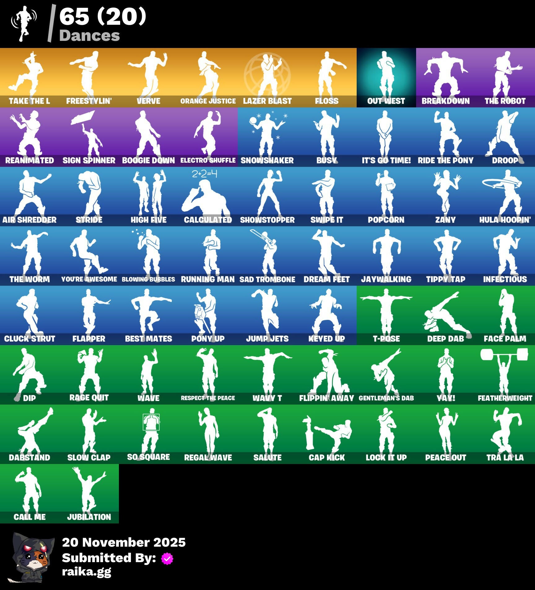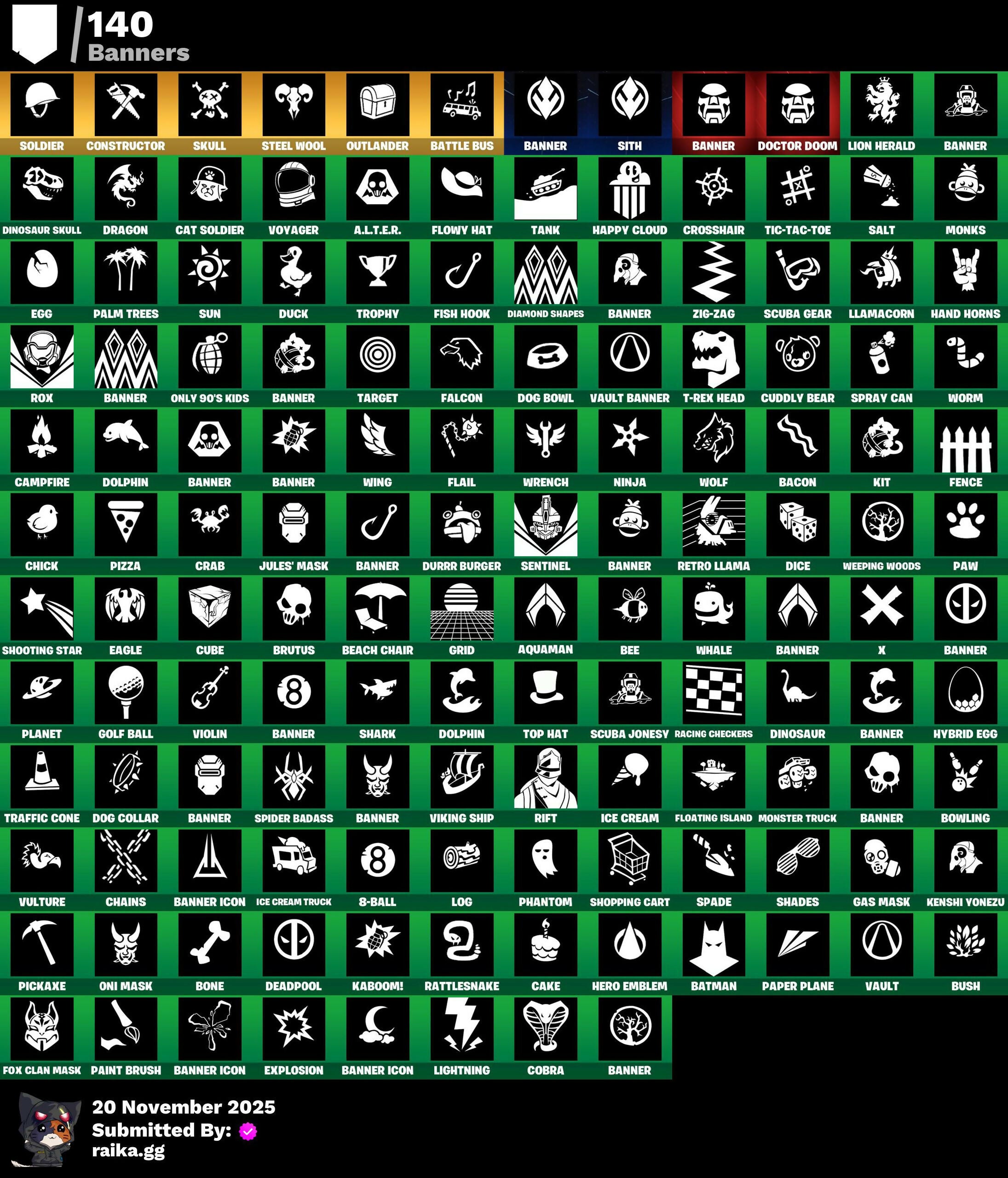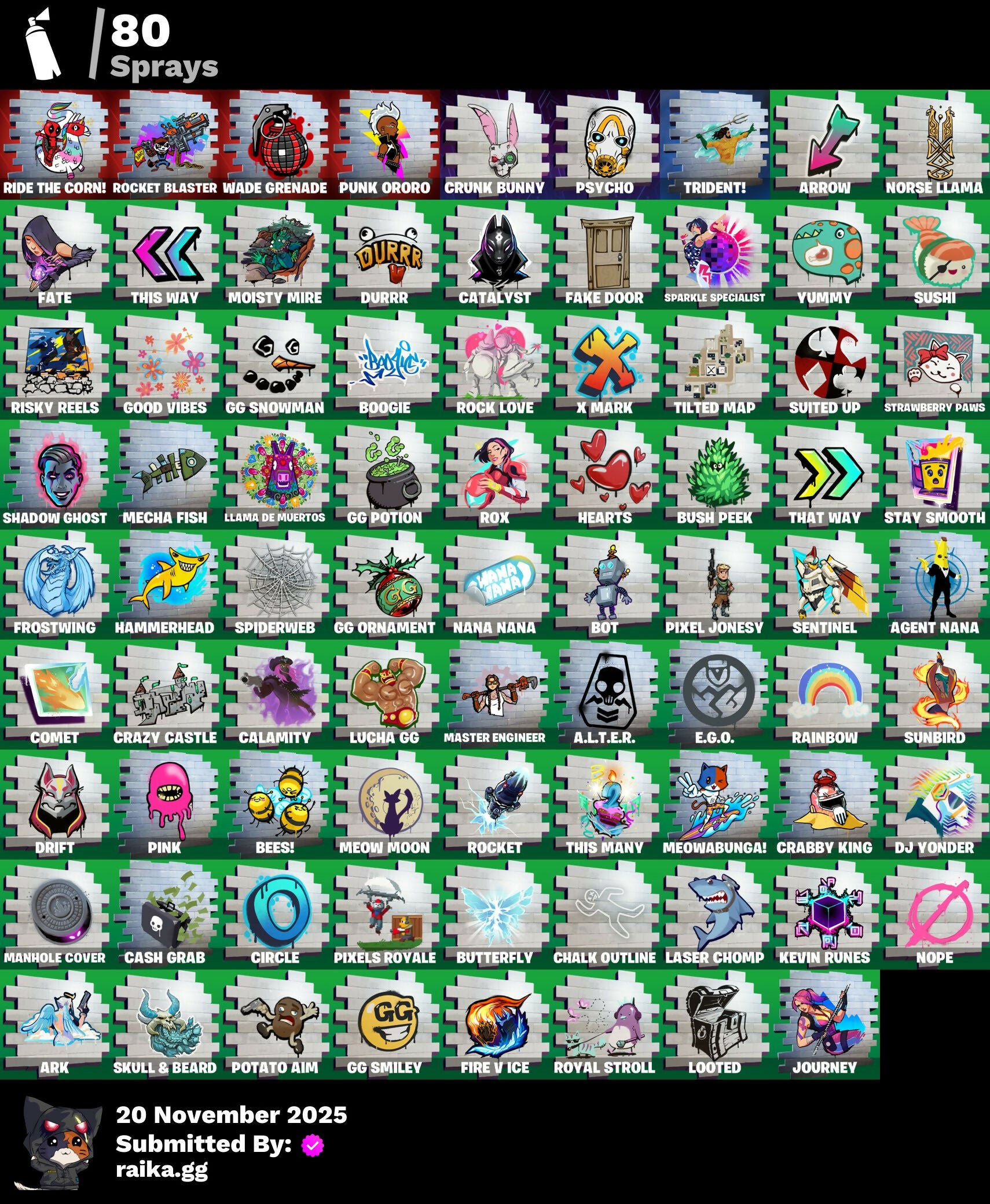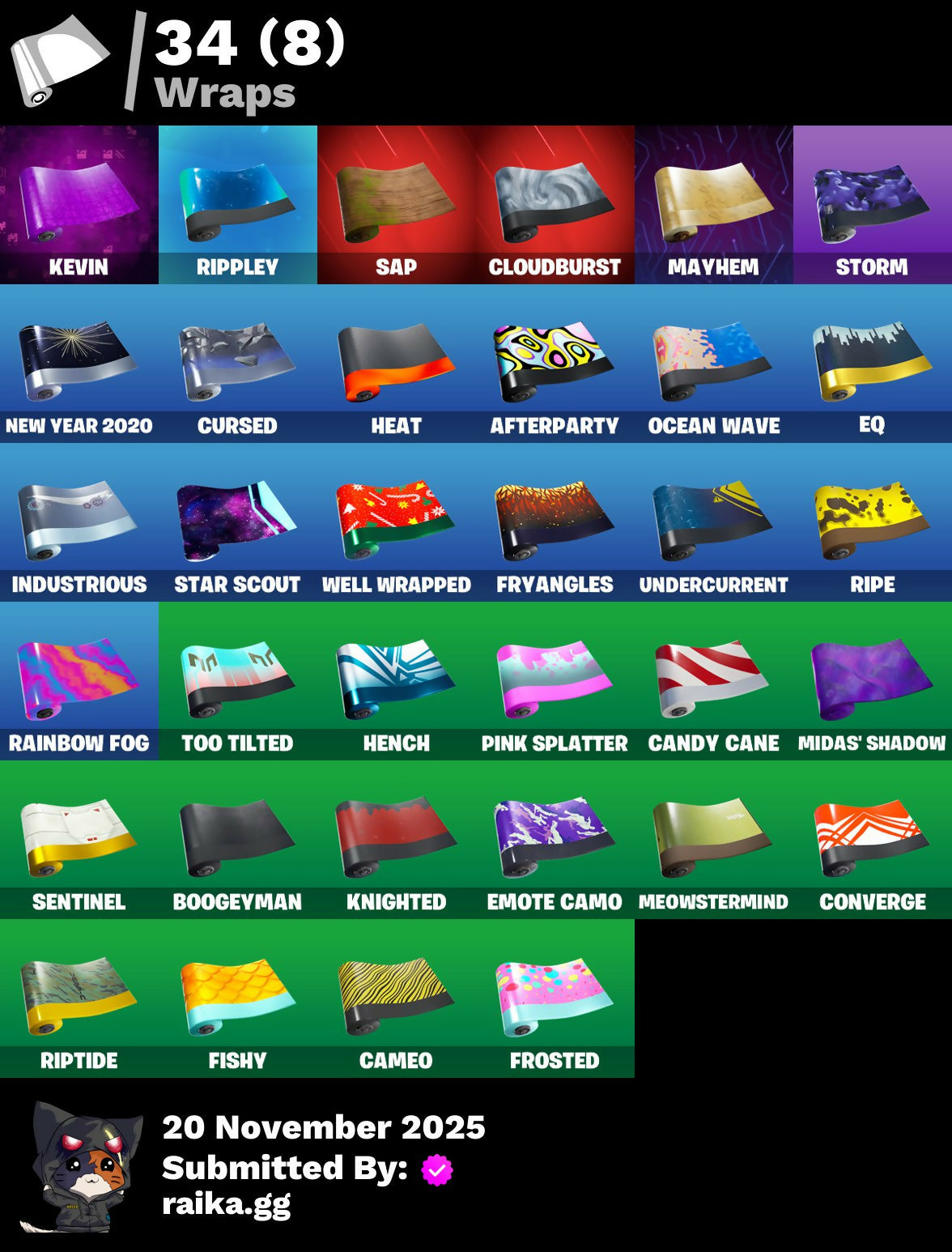 2020 Kickflip, 8-Ball, A.L.T.E.R., AC/DC, Afterparty, Agent Nana, Agent Peely, Air Shredder, Anarchy Axe, Angler Axes, Antidote, Aquaman, Aquaman's Trident, Ark, Arrow, Arroyo Pack, Asmodeus, Astro, Atmosphere, Axecalibur, B.R.U.T.E. Navigator, Backstabber, Bacon, Balloon Axe, Banana Briefcase, Banner, Banner Icon, Base Jumper, Basecamp Bag, Basic Basher, Batman, Battle Bus, Battlehawk, Beach Chair, Beach Umbrella, Beachcomber, Bee, Bees!, Best Mates, Big Haul, Birdie, Black Knight, Black Shield, Blowing Bubbles, Blue Squire, Bobo, Bogey Bag, Bombs Away!, Bone, Boogeyman, Boogie, Boogie Down, Bot, Boulder Breakers, Bowling, Breakdown, Brella, Brutus, Bunker Basher, Bunker Jonesy, Bunny Brawler, Bush, Bush Peek, Busy, Butterfly, Cake, Calamity, Calculated, Call Me, Cameo, Campfire, Candy Cane, Cap Kick, Carbide, Carbon, Cash Grab, Cat Soldier, Catalyst, Celestia, Chains, Chalk Outline, Chick, Circle, Classified, Clawz Retro, Cloudburst, Cluck Strut, Cobra, Comet, Conquest, Constructor, Converge, Convergence, Cosmic Cleavers, Covered Crusader, Crab, Crabby King, Crazy Castle, Crazy Eight, Crossfire, Crosshair, Crowbar, Cruiser, Crunk Bunny, Cube, Cuddly Bear, Cuff Case, Cursed, DJ Yonder, Dabstand, Dark Matter, Dark Voyager, Deadpool, Deep Dab, Deep Dive, Demi, Diamond Shapes, Dice, Dinosaur, Dinosaur Skull, Dip, Dive Knives, Doctor Doom, Dog Bowl, Dog Collar, Dolphin, Doom Chalice, Downpour, Downshift, Dragon, Dream Feet, Drift, Droop, Dual Filet, Duck, Durrr, Durrr Burger, E.G.O., EVA, Eagle, Egg, Eggshell, Electro Shuffle, Elite Agent, Emote Camo, Enforcer, Eon Blades, Eq, Equalizer, Explosion, Fabled Cape, Face Palm, Fade, Fake Door, Falcon, Fang Saws, Fate, Featherweight, Fence, Field Flyer, Fire V Ice, Fish Hook, Fishy, Fishy Flier, Flail, Flapper, Flippin' Away, Floating Island, Floss, Flowy Hat, Fortilla Flier, Founder's Glider, Founder's Umbrella, Fox Clan Mask, Freestylin', Frosted, Frostwing, Frozen Shroud, Fryangles, Funk Ops, GG Ornament, GG Potion, GG Smiley, GG Snowman, Galaxy Scout, Gale Force, Gas Mask, Gear Specialist Maya, Gentleman's Dab, Get Down!, Ghost Portal, Giddy-Up, Go Bag, Gold Token, Golden Disco, Golf Ball, Good Vibes, Grande Pack, Grid, Groot's Sap Axes, Guiding Glow, Gum Drop, Hack & Smash, Hammerhead, Hand Horns, Happy Cloud, Happy Kit, Harley Hitter, Harley Quinn, Harmonic Axes, Hearts, Heat, Hench, Hench Hauler, Hero Emblem, High Five, High Octane, Hollowhead, Holographic, Hoodie, Hot Wings, Hula Hoopin', Huntress, Hybrid Egg, Hydraulic Wrecker, Ice Cream, Ice Cream Truck, Industrious, Infectious, Infinite Bloom, Iris, It's Go Time!, Jaywalking, Journey, Journey Vs Hazard, Jubilation, Jules, Jules' Mask, Jump Jets, Junk Bucket, Kaboom!, Kenshi Yonezu, Kevin, Kevin Runes, Keyed Up, Kit, Knighted, Laser Chomp, Lazer Blast, Lightning, Lion Herald, Liteshow, Llama De Muertos, Llamacorn, Lobby Classic, Lock It Up, Log, Lollipopper, Longhorn, Looted, Lt. Evergreen, Lucha GG, Lug Axe, Manhole Cover, Masked Scuba Jonesy, Master Engineer, Master Mix, Mayhem, Mean Streak, Mecha Fish, Medaxe, Meow Moon, Meowabunga!, Meowstermind, Midas' Shadow, Mighty Marvel 'Brella, Millennium Falcon, Mission Specialist, Moisty Mire, Monks, Monster Truck, Moonwalker, Mouldering Cloak, Nana Cape, Nana Nana, New Year 2020, Night, Ninja, Nope, Norse Llama, Nucleus, Ocean, Ocean Wave, Ocular, Ohm, Ol' Woody, One Shot, Oni Mask, Only 90's Kids, Orange Justice, Out West, Outlander, Overcharged, Paint Brush, Palette Pack, Palm Trees, Paper Parasol, Paper Plane, Paw, Peace Out, Peppermint Pick, Permafrost, Phantom, Pickaxe, Picnic, Pink, Pink Splatter, Pixel Jonesy, Pixels Royale, Pizza, Planet, Poised Playmaker, Pony Up, Pool Party, Pop Axe, Popcorn, Positron, Potato Aim, Precision, Psycho, Pulse Axe, Punchline, Punk Ororo, Pursuit, Racing Checkers, Rage Quit, Ragnarok, Rainbow, Rainbow Fog, Rainbow Rider, Rattlesnake, Re-Gifter, Reanimated, Rearguard, Reckoning, Red, Redline, Regal Wave, Remedy Vs Toxin, Respect The Peace, Retaliator, Retro Llama, Ride The Corn!, Ride The Pony, Rift, Rift Edge, Rift Rider, Rio Grande, Ripe, Ripe Rippers, Rippley, Rippley Vs Sludge, Riptide, Riptide Ocean, Risky Reels, Rock Love, Rocket, Rocket Blaster, Rogue Agent, Rook, Rose Glow, Rose Rider, Rose Team Leader, Roundabout, Rox, Royal Stroll, Royale Knight, Royale Shield, Royale X, Running Man, Rust Bucket, Rust Lord, Sad Trombone, Salt, Salute, Sap, Sawtooth, Saxy Groove, Scales Of Justice, Scarlet Strike, Scavenger, Scimitar, Scuba Gear, Scuba Jonesy, Sentinel, Shades, Shadow Ghost, Shark, Shooting Star, Shooting Starstaff, Shopping Cart, Shortbread Slicers, Showstopper, Sign Spinner, Sir Glider The Brave, Sith, Skirmish, Skull, Skull & Beard, Skull Trooper, Sky Trawler, Sledgehammer, Slow Clap, Sludgehammer, Smash O'-Lantern, Smash Up, Snowflake, Snowshaker, So Square, Soldier, Spade, Sparkle Scythe, Sparkle Specialist, Spider Badass, Spiderweb, Spiked Satchel, Splashdown, Spray Can, Spray Sail, Squire Shield, Stage 5, Stage 5 - No Shoulder Pad, Standard Issue, Star Scout, Stardust Strikers, Stay Smooth, Steel Wool, Stoneheart, Storm, Stratus, Strawberry Paws, Stride, Subjugator, Sugar Crash, Suited Up, Sun, Sun Strider, Sunbird, Supreme Shell, Sushi, Swag Bag, Swipe It, T-Pose, T-Rex Head, Tackle Box, Take The L, Tank, Target, Teal, Tech Axe, Teknique, Tenderizer, That Way, The Ace, The Mcg, The Reaper, The Robot, The Sith, The Umbrella, The Worm, This Many, This Way, Throwback Axe, Tic-Tac-Toe, Tide Axes, Tilted Map, Tilted Teknique, Tippy Tap, Too Tilted, Top Hat, Top Sail, Tra La La, Traffic Cone, Trailblazer, Treefall, Trident!, Trophy, True North, Trusty No. 2, Turbo Spin, Turk Vs Riptide, Undercurrent, Uplink, Vault, Vault Banner, Vega, Venom Blade, Verve, Viking Ship, Violin, Vox, Voyager, Vulture, Wade Grenade, Warpaint, Water Wings, Wave, Waveform, Wavy T, Webrella, Weeping Woods, Well Wrapped, Wet Paint, Whale, Wild Card, Wild Streak, Wilde, Wing, Wingman, Wings Of Love, Wings Of Valor, Wolf