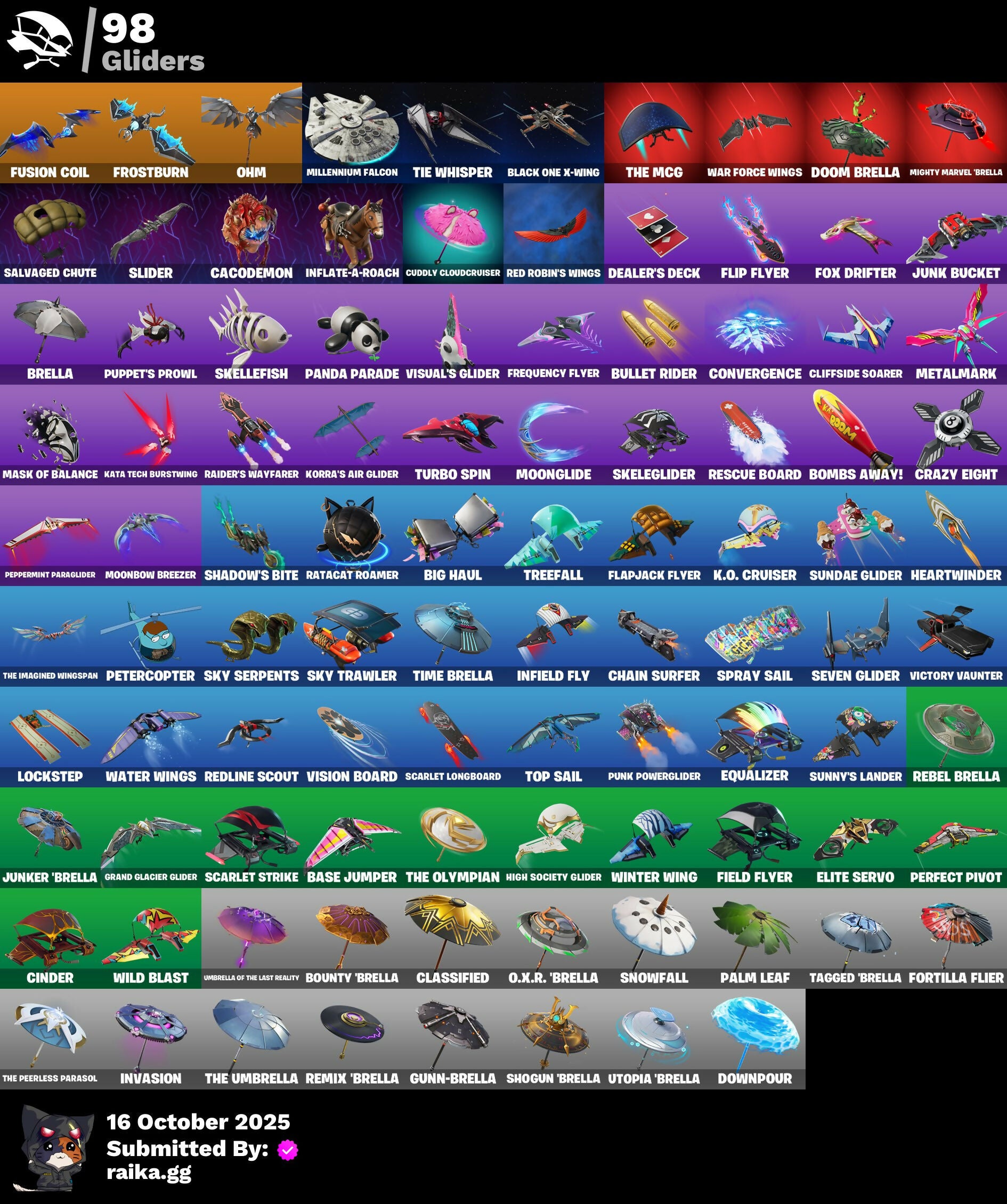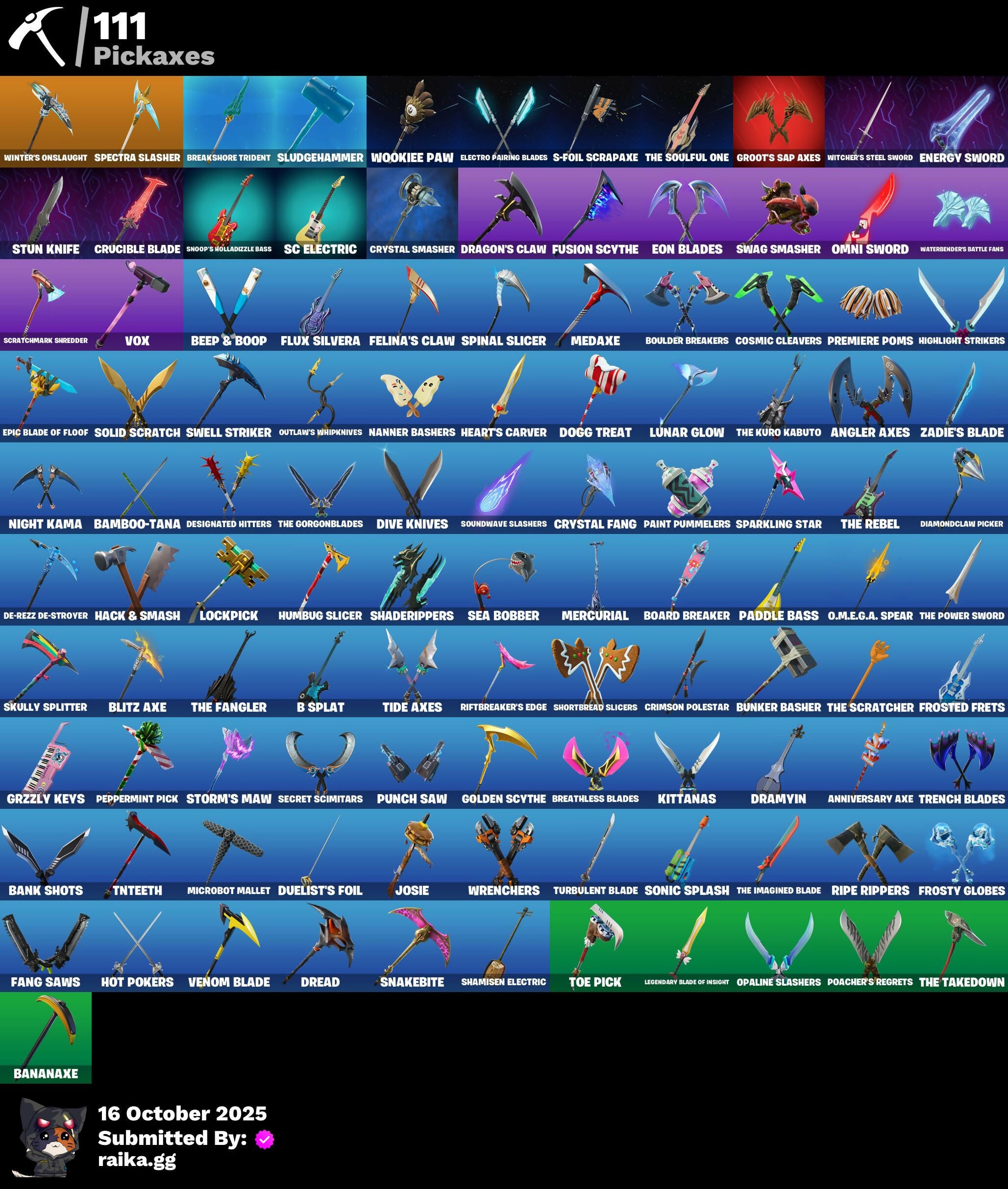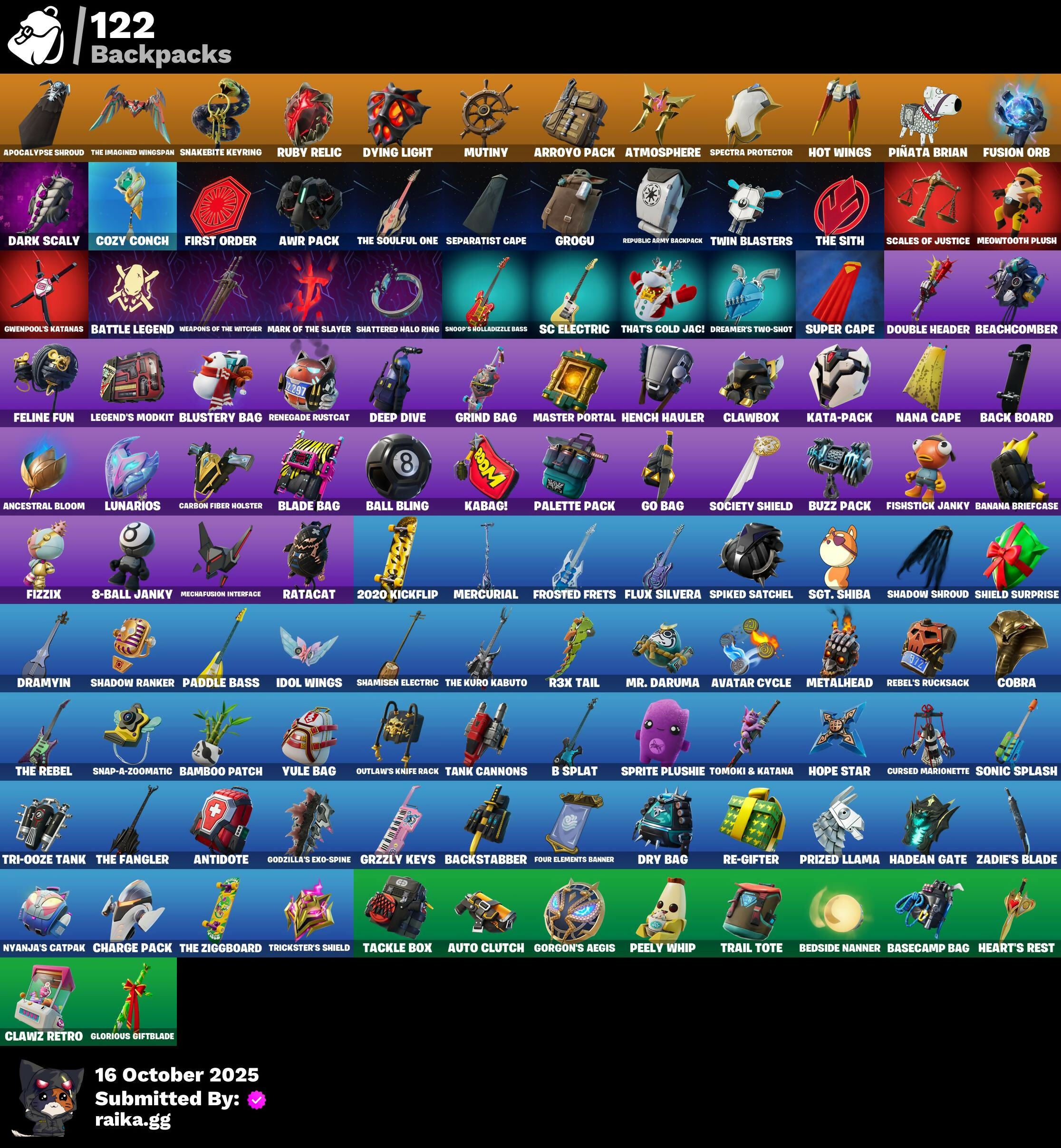 2.0's Revenge, 2020 Kickflip, 212th Battalion Trooper, 501st Trooper, 8-Ball, 8-Ball Janky, 8-Ball Vs Scratch, A.L.T.E.R., Aerial, Aerial Classic, Aerial Swagger, Afterparty, Agent Jones, Agent Nana, Agent Patch, Agent Peely, Ahsoka's Clone Trooper, Air Shredder, Ancestral Bloom, Angler Axes, Anniversary Axe, Antidote, Aphrodite, Apocalypse Shroud, Appeeling Drive, Ark, Arroyo Pack, Astro Armor, Atmosphere, Auntie Dot, Auto Clutch, Avatar Cycle, Avatar's Flourish, Avengers Logo, Awr Pack, B Splat, Back Board, Backstabber, Bacon, Balance Board, Ball Bling, Bam-Boom!, Bamboo Patch, Bamboo-Tana, Banana Briefcase, Bananaxe, Bank Shots, Base Jumper, Basecamp Bag, Battle Legend, Beach Chair, Beachcomber, Bedside Nanner, Beep & Boop, Bees!, Belt It!, Big Guns, Big Haul, Bike To Go, Black Hole, Black Leader, Black One X-Wing, Blackheart, Blade Bag, Blasted, Blitz Axe, Blocko, Blustery Bag, Board Breaker, Boing!, Bombs Away!, Bone, Both Eyes Open, Boulder Breakers, Bounty 'Brella, Breakshore Trident, Breathless Blades, Brella, Brutus, Bullet Rider, Bunker Basher, Bunker Jonesy, Bush Peek, Bushie Bright, Butterfly, Buzz Pack, Cacodemon, Calico, Call Me, Cameo, Cameo Vs Chic, Captain America’s Shield, Carbon Fiber Holster, Carbon Scarlet, Cash Grab, Catalyst, Cerberus, Cerberus Bite, Chain Surfer, Chaos Directive, Charge Pack, Chic, Choose Naughty, Choppy, Cinder, Classified, Clawbox, Clawz Retro, Clean Sweep, Cliffside Soarer, Clone Trooper, Cluck Strut, Cobra, Coconuts, Combat Elite, Comet, Compass, Conch Call, Confetti, Confident Iridia, Conga, Controlled Focus, Convergence, Corrosive Stripe, Corrupted, Coruscant Guard, Cosmic Cleavers, Cowboy Chat, Cozy Conch, Crabby King, Crashed Chiller, Crazy Eight, Crimson Polestar, Crowning Achievement, Crucible Blade, Crystal Fang, Crystal Smasher, Cube, Cuddle Hearts, Cuddly Cloudcruiser, Cursed, Cursed Marionette, Cyclo Curl, Dabstand, Dance Mat, Dark, Dark Rex, Dark Scaly, De-Rezz De-Stroyer, Deadpool, Dealer's Deck, Deep Dive, Designated Hitters, Determined Korra, Determined Renegade, Diamond Shapes, Diamond Throne, Diamondclaw Picker, Diva's Grin, Dive Knives, Do The Split, Dogg Treat, Doggo, Dolphin, Don't Mess With Patch, Doom Brella, Doom Slayer, Double Header, Downpour, Doze Dab, Dragon Stance, Dragon's Claw, Dramyin, Dread, Dreamer's Two-Shot, Driftwood, Droop, Dropout, Dry Bag, Duelist's Foil, Dying Light, Dynamic Tntina, Dynamite, E.G.O., Elemental Cycle, Elite Servo, Emote Camo, Energy Sword, Eon Blades, Epic Blade of Floof, Eq, Equalizer, Everything's Fine, Eye of Agamotto, Fade, Fallen Love Ranger, Fang Saws, Fate, Felina's Claw, Feline Fun, Field Flyer, Final Harbinger, Fire V Ice, First Order, Fish Hook, Fishbone, Fishstick Janky, Fist Bump, Fizzix, Flapjack Flyer, Flash Of Lightning, Flashback Breakdown, Flip Flyer, Flippin' Away, Flux Silvera, Foil Flex, Fortilla Flier, Four Elements Banner, Fox, Fox Drifter, Frequency Flyer, Frostburn, Frosted, Frosted Frets, Frostwing, Frosty Globes, Fryangles, Fully Charged Drift, Fusion, Fusion Coil, Fusion Orb, Fusion Scythe, G.O.A.T., GG Snakes, GG Snowman, Gear Specialist Maya, Geared Up, Geralt, Geralt Of Rivia, Gilded Heart, Glorious Giftblade, Go Bag, Go Megazord!, Godzilla's Exo-Spine, Golden Scythe, Golf Clap, Gorgon's Aegis, Grand Glacier Glider, Grav-Fusion, Grind Bag, Grogu, Groot's Sap Axes, Groovy!, Grzzly Keys, Guggi Was Here, Gunn-Brella, Gunnar, Gunnar's Special, Gwenpool's Katanas, Gweterman Jacket, Hack & Smash, Hadean Gate, Hades Insignia, Halo Ring, Hammerhead, Harbinger Armor Omegarok, Haute Hustle, Heart Collector, Heart's Rest, Hearts Carver, Heartwinder, Heavy Metal Omega, Hello Friend, Hench, Hench Hauler, High Five, High Society Glider, Highlight Strikers, Holiday Boxy, Hoodie, Hope, Hope Star, Hope's Look, Hot Pokers, Hot Wings, Hula Hoopin', Humbug Slicer, Hybrid, Hybrid Egg, Hype!, I'm A Mystery, Idol Wings, If Looks Could..., Igni Sign, Imagined Edge, Imagined Order, Industrious, Infield Fly, Infinite Swirl, Infinity Gauntlet, Inflate-A-Roach, Intentions Unknown, Invasion, Jaywalking, Je Suis Montague, Jedi Training, Jellyfish, Jet Signals, Jolly Roger, Jones Underground, Josie, Journey, Journey Vs Hazard, Jules, Jump Jets, Junk Bucket, Junker 'Brella, Just Desserts, K.O. Cruiser, Ka-Choom!, Kabag!, Kaboom!, Kata Tech Burstwing, Kata-Pack, Kenshi Yonezu, Kiara K.O., Kittanas, Knight's Helm, Knight's Honor, Knighted, Korra, Korra's Air Glider, Kymera Swarm, Laroi Was Here, Laroi's Tag, Lbc Signature, Legend's Modkit, Legend's Retribution, Legendary Blade of Insight, Lil AT-AT, Lil Ghost, Lil Longboat, Lil Split, Lion's Roar, Lockpick, Lockstep, Love Ranger, Lt. Evergreen, Lunar Glow, Lunar Party, Lunarian Luxury, Lunarios, Machinist In Control, Maelstrom, Make A Seat, Mark of the Slayer, Mask Of Balance, Masked Hades, Massai, Massai Fire, Master Engineer, Master Portal, Matte Black, Mecha Wrecks, Medaxe, Medusa, Menace, Meowabunga!, Meowscles, Meowtooth Plush, Mercurial, Mermaid, Metalhead, Metlamark, Microbot Mallet, Mighty Marvel 'Brella, Millennium Falcon, Mini Dogfight, Mini Slayer Fistbump, Missing: Peely, Modern Rōnin, Moisty Mire, Monks, Montague, Moonbow Breezer, Moonglide, Moonglow, Alight, Mr. Daruma, Murktide, Muscle Memory, Mushroom, Mutiny, Nana Cape, Nana Nana, Nanner Bashers, Never Yield, New Year 2020, Night Kama, Ninja Stance: Leo, Nisha, Nope, Nyanja's Catpak, O.M.E.G.A. Spear, O.X.R. 'Brella, Ocean, Ocean Wave, Ohm, OmegaRok, Omegarok Grin, Omni Sword, Oni Mask, Oozey, Opaline Slashers, Oscar, Outlaw's Knife Rack, Outlaw's Whipknives, Paddle Bass, Paint Brush, Paint Pummellers, Palette Pack, Palm Leaf, Panda Parade, Pandemonium, Paw Mark, Paws & Claws, Peace Out, Peeled, Peelverine's Attack, Peely, Peely Whip, Peppermint Paraglider, Peppermint Pick, Perfect Pivot, Peter Griffin, Petercopter, Petervision, Piercing Ace, Pineapple, Pink, Pink Splatter, Pixel Jonesy, Piñata Brian, Planet, Poacher's Regrets, Poseidon, Praetor Shroud, Premiere Poms, Priz