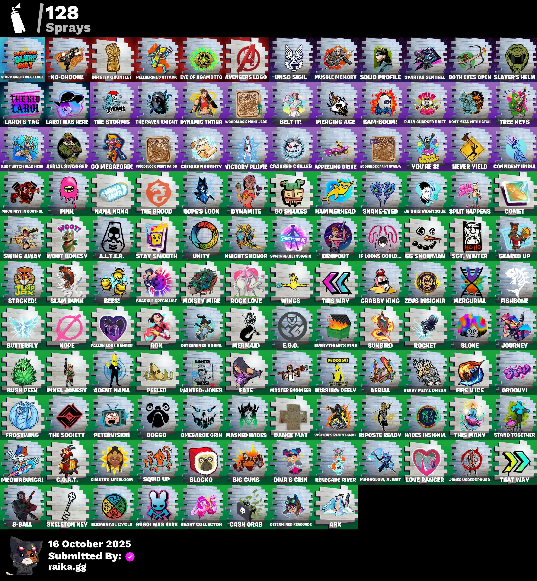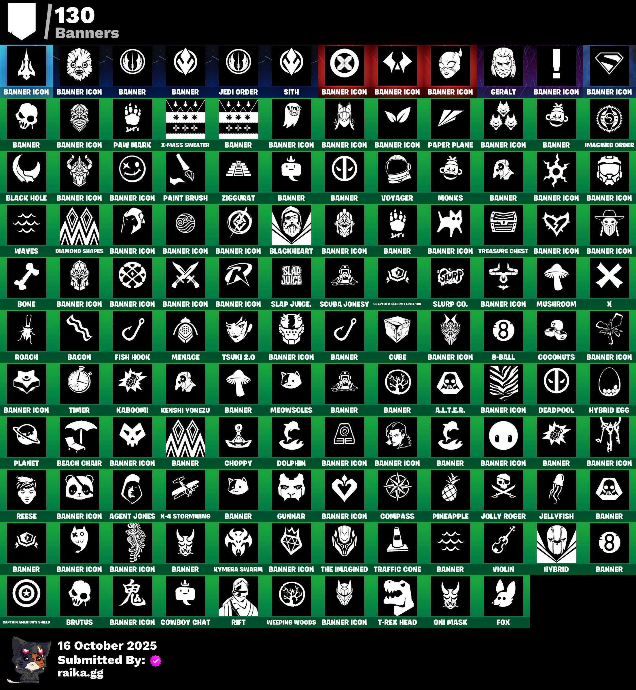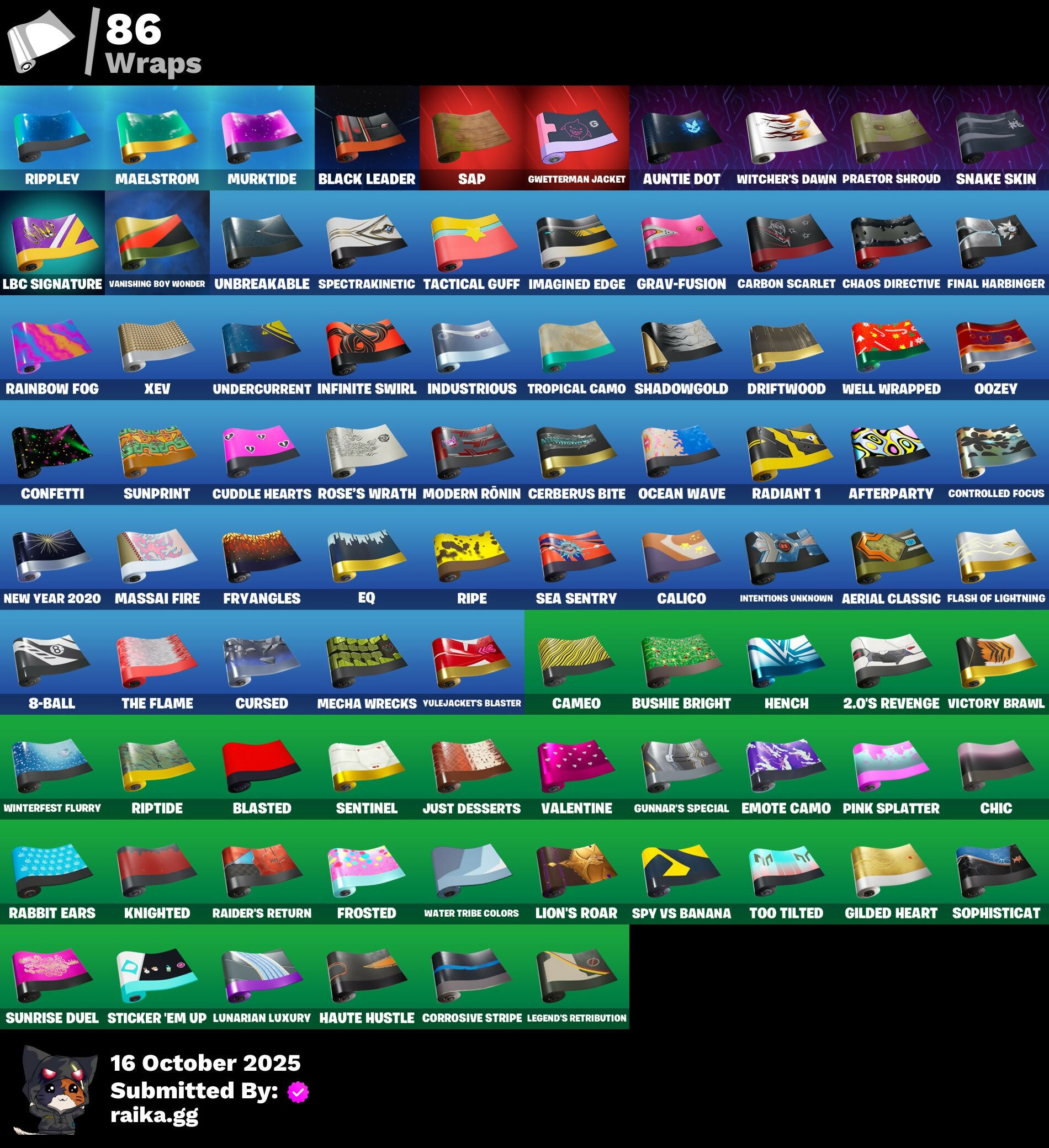 2.0's Revenge, 2020 Kickflip, 212th Battalion Trooper, 501st Trooper, 8-Ball, 8-Ball Janky, 8-Ball Vs Scratch, A.L.T.E.R., Aerial, Aerial Classic, Aerial Swagger, Afterparty, Agent Jones, Agent Nana, Agent Patch, Agent Peely, Ahsoka's Clone Trooper, Air Shredder, Ancestral Bloom, Angler Axes, Anniversary Axe, Antidote, Aphrodite, Apocalypse Shroud, Appeeling Drive, Ark, Arroyo Pack, Astro Armor, Atmosphere, Auntie Dot, Auto Clutch, Avatar Cycle, Avatar's Flourish, Avengers Logo, Awr Pack, B Splat, Back Board, Backstabber, Bacon, Balance Board, Ball Bling, Bam-Boom!, Bamboo Patch, Bamboo-Tana, Banana Briefcase, Bananaxe, Bank Shots, Base Jumper, Basecamp Bag, Battle Legend, Beach Chair, Beachcomber, Bedside Nanner, Beep & Boop, Bees!, Belt It!, Big Guns, Big Haul, Bike To Go, Black Hole, Black Leader, Black One X-Wing, Blackheart, Blade Bag, Blasted, Blitz Axe, Blocko, Blustery Bag, Board Breaker, Boing!, Bombs Away!, Bone, Both Eyes Open, Boulder Breakers, Bounty 'Brella, Breakshore Trident, Breathless Blades, Brella, Brutus, Bullet Rider, Bunker Basher, Bunker Jonesy, Bush Peek, Bushie Bright, Butterfly, Buzz Pack, Cacodemon, Calico, Call Me, Cameo, Cameo Vs Chic, Captain America’s Shield, Carbon Fiber Holster, Carbon Scarlet, Cash Grab, Catalyst, Cerberus, Cerberus Bite, Chain Surfer, Chaos Directive, Charge Pack, Chic, Choose Naughty, Choppy, Cinder, Classified, Clawbox, Clawz Retro, Clean Sweep, Cliffside Soarer, Clone Trooper, Cluck Strut, Cobra, Coconuts, Combat Elite, Comet, Compass, Conch Call, Confetti, Confident Iridia, Conga, Controlled Focus, Convergence, Corrosive Stripe, Corrupted, Coruscant Guard, Cosmic Cleavers, Cowboy Chat, Cozy Conch, Crabby King, Crashed Chiller, Crazy Eight, Crimson Polestar, Crowning Achievement, Crucible Blade, Crystal Fang, Crystal Smasher, Cube, Cuddle Hearts, Cuddly Cloudcruiser, Cursed, Cursed Marionette, Cyclo Curl, Dabstand, Dance Mat, Dark, Dark Rex, Dark Scaly, De-Rezz De-Stroyer, Deadpool, Dealer's Deck, Deep Dive, Designated Hitters, Determined Korra, Determined Renegade, Diamond Shapes, Diamond Throne, Diamondclaw Picker, Diva's Grin, Dive Knives, Do The Split, Dogg Treat, Doggo, Dolphin, Don't Mess With Patch, Doom Brella, Doom Slayer, Double Header, Downpour, Doze Dab, Dragon Stance, Dragon's Claw, Dramyin, Dread, Dreamer's Two-Shot, Driftwood, Droop, Dropout, Dry Bag, Duelist's Foil, Dying Light, Dynamic Tntina, Dynamite, E.G.O., Elemental Cycle, Elite Servo, Emote Camo, Energy Sword, Eon Blades, Epic Blade of Floof, Eq, Equalizer, Everything's Fine, Eye of Agamotto, Fade, Fallen Love Ranger, Fang Saws, Fate, Felina's Claw, Feline Fun, Field Flyer, Final Harbinger, Fire V Ice, First Order, Fish Hook, Fishbone, Fishstick Janky, Fist Bump, Fizzix, Flapjack Flyer, Flash Of Lightning, Flashback Breakdown, Flip Flyer, Flippin' Away, Flux Silvera, Foil Flex, Fortilla Flier, Four Elements Banner, Fox, Fox Drifter, Frequency Flyer, Frostburn, Frosted, Frosted Frets, Frostwing, Frosty Globes, Fryangles, Fully Charged Drift, Fusion, Fusion Coil, Fusion Orb, Fusion Scythe, G.O.A.T., GG Snakes, GG Snowman, Gear Specialist Maya, Geared Up, Geralt, Geralt Of Rivia, Gilded Heart, Glorious Giftblade, Go Bag, Go Megazord!, Godzilla's Exo-Spine, Golden Scythe, Golf Clap, Gorgon's Aegis, Grand Glacier Glider, Grav-Fusion, Grind Bag, Grogu, Groot's Sap Axes, Groovy!, Grzzly Keys, Guggi Was Here, Gunn-Brella, Gunnar, Gunnar's Special, Gwenpool's Katanas, Gweterman Jacket, Hack & Smash, Hadean Gate, Hades Insignia, Halo Ring, Hammerhead, Harbinger Armor Omegarok, Haute Hustle, Heart Collector, Heart's Rest, Hearts Carver, Heartwinder, Heavy Metal Omega, Hello Friend, Hench, Hench Hauler, High Five, High Society Glider, Highlight Strikers, Holiday Boxy, Hoodie, Hope, Hope Star, Hope's Look, Hot Pokers, Hot Wings, Hula Hoopin', Humbug Slicer, Hybrid, Hybrid Egg, Hype!, I'm A Mystery, Idol Wings, If Looks Could..., Igni Sign, Imagined Edge, Imagined Order, Industrious, Infield Fly, Infinite Swirl, Infinity Gauntlet, Inflate-A-Roach, Intentions Unknown, Invasion, Jaywalking, Je Suis Montague, Jedi Training, Jellyfish, Jet Signals, Jolly Roger, Jones Underground, Josie, Journey, Journey Vs Hazard, Jules, Jump Jets, Junk Bucket, Junker 'Brella, Just Desserts, K.O. Cruiser, Ka-Choom!, Kabag!, Kaboom!, Kata Tech Burstwing, Kata-Pack, Kenshi Yonezu, Kiara K.O., Kittanas, Knight's Helm, Knight's Honor, Knighted, Korra, Korra's Air Glider, Kymera Swarm, Laroi Was Here, Laroi's Tag, Lbc Signature, Legend's Modkit, Legend's Retribution, Legendary Blade of Insight, Lil AT-AT, Lil Ghost, Lil Longboat, Lil Split, Lion's Roar, Lockpick, Lockstep, Love Ranger, Lt. Evergreen, Lunar Glow, Lunar Party, Lunarian Luxury, Lunarios, Machinist In Control, Maelstrom, Make A Seat, Mark of the Slayer, Mask Of Balance, Masked Hades, Massai, Massai Fire, Master Engineer, Master Portal, Matte Black, Mecha Wrecks, Medaxe, Medusa, Menace, Meowabunga!, Meowscles, Meowtooth Plush, Mercurial, Mermaid, Metalhead, Metlamark, Microbot Mallet, Mighty Marvel 'Brella, Millennium Falcon, Mini Dogfight, Mini Slayer Fistbump, Missing: Peely, Modern Rōnin, Moisty Mire, Monks, Montague, Moonbow Breezer, Moonglide, Moonglow, Alight, Mr. Daruma, Murktide, Muscle Memory, Mushroom, Mutiny, Nana Cape, Nana Nana, Nanner Bashers, Never Yield, New Year 2020, Night Kama, Ninja Stance: Leo, Nisha, Nope, Nyanja's Catpak, O.M.E.G.A. Spear, O.X.R. 'Brella, Ocean, Ocean Wave, Ohm, OmegaRok, Omegarok Grin, Omni Sword, Oni Mask, Oozey, Opaline Slashers, Oscar, Outlaw's Knife Rack, Outlaw's Whipknives, Paddle Bass, Paint Brush, Paint Pummellers, Palette Pack, Palm Leaf, Panda Parade, Pandemonium, Paw Mark, Paws & Claws, Peace Out, Peeled, Peelverine's Attack, Peely, Peely Whip, Peppermint Paraglider, Peppermint Pick, Perfect Pivot, Peter Griffin, Petercopter, Petervision, Piercing Ace, Pineapple, Pink, Pink Splatter, Pixel Jonesy, Piñata Brian, Planet, Poacher's Regrets, Poseidon, Praetor Shroud, Premiere Poms, Priz