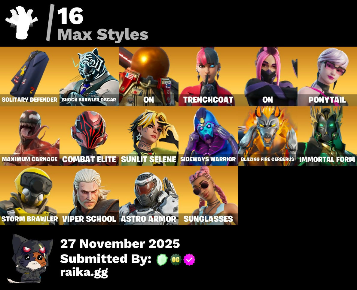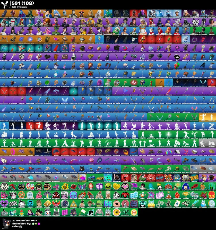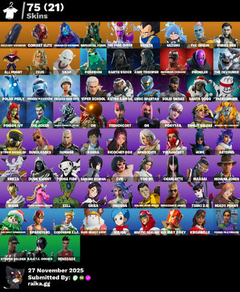 (Remainder of the text is too small to confidently read), AWR Trooper, All Might, Aphrodite, Arctic Adeline, Artemis, Astro Armor, B.R.U.T.E. Gunner, Blazing Fire Cerberus, Bulma, Cell, Charlotte, Codename E.L.F., Combat Elite, Darth Vader, Dusk Knight, Erisa, Evie, Fabio Sparklemarine, Frieza, Frozen Fishstick, Frozen Nog Ops, Gold Midas, Golden Gear Midas, Gunnar, Holiday Boxy, Hope, Immortal Form, Indiana Jones, Korra, Krisabelle, Marshinobi, Massai, Maximum Carnage, Medusa, Midas Rex, Nezumi, Nisha, On, Peter Griffin, Poised Playmaker, Poison Ivy, Polar Peely, Ponytail, Poseidon, Prowler, Rag, Rage, Rage (listed twice), Ragnarok, Raider, Rally, Ramirez, Ramirez (listed thrice), Ramirez (listed twice), Rampart, Raptor, Raptor (listed twice), Raptr, Ravage, Raven, Ravenpool, Ravenpool (listed twice), Raz, Raz (listed twice), Raze, Raze (listed twice), Razor, Reader, Ready Penny, Reaper, Rebel, Rebirth Raven, Red Eye, Red Jade, Red Joker, Red Knight, Red Rebel, Red Strike, Redline, Redline (listed thrice), Redline (listed twice), Reef Ranger, Reese, Reese (listed twice), Remedy, Renegade, Renegade Raider, Rexa, Rey, Reyna, Ribbit, Rick Sanchez, Rico, Ricochet Rox, Riot, Ripley, Rippley, Rippley Patroller, Rix, Rogue Spider Knight, Rojo, Rok, Roman, Romero, Romero Steady, Ronin, Rook, Rosa, Rosie, Roth, Rox, Rox (listed five times), Rox (listed four times), Rox (listed thrice), Rox (listed twice), Ruby, Ruckus, Rukus, Rust Lord, Rust Lord (listed twice), Rux, Santa Dogg, Sasuke Uchiha, Shock Brambler Oscar, Shock Brawler Oscar, Sideways Warrior, Sing Along, Sled Ready GuFi, Snap, Solid Snake, Solitary Defender, Soundwave Series - Hamaki, Sparkplug, Storm Brambler, Storm Brawler, Striped Soldier, Sunglasses, Sunlit Selene, The Cube Queen, The Devourer, The Joker, The Origin, The Reaper, Toona Fish, Trenchcoat, Tsuki 2.0, UNSC Spartan, Vegeta, Vengeance Jones, Verve, Viper School, Vulejacket, Winterfest Bushranger, Yoo-Mi, Zeus