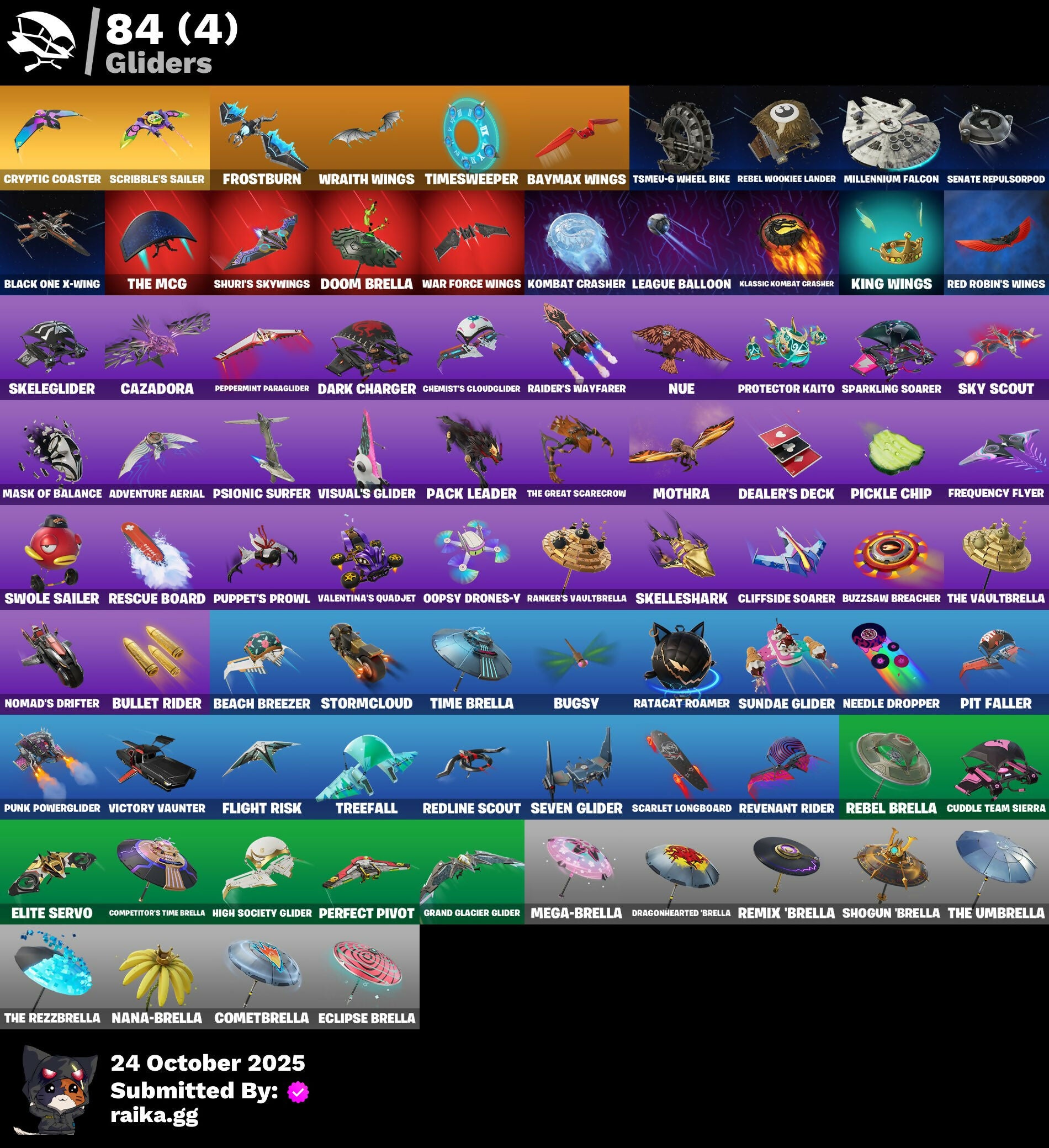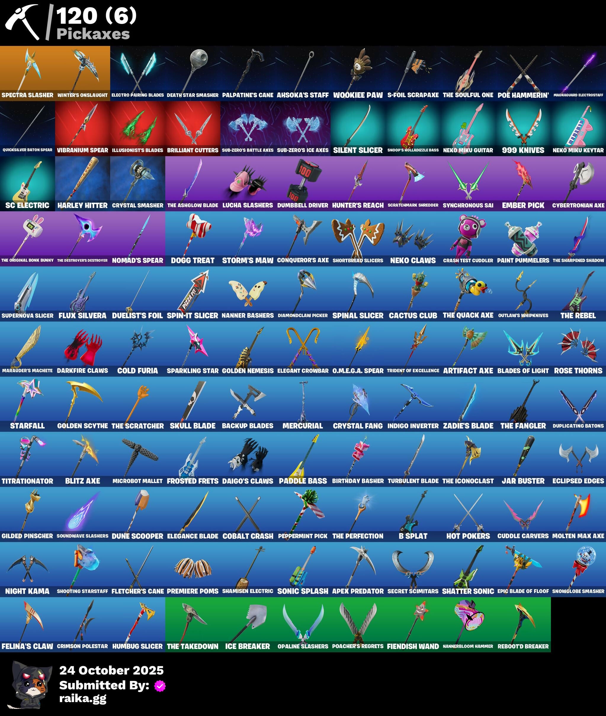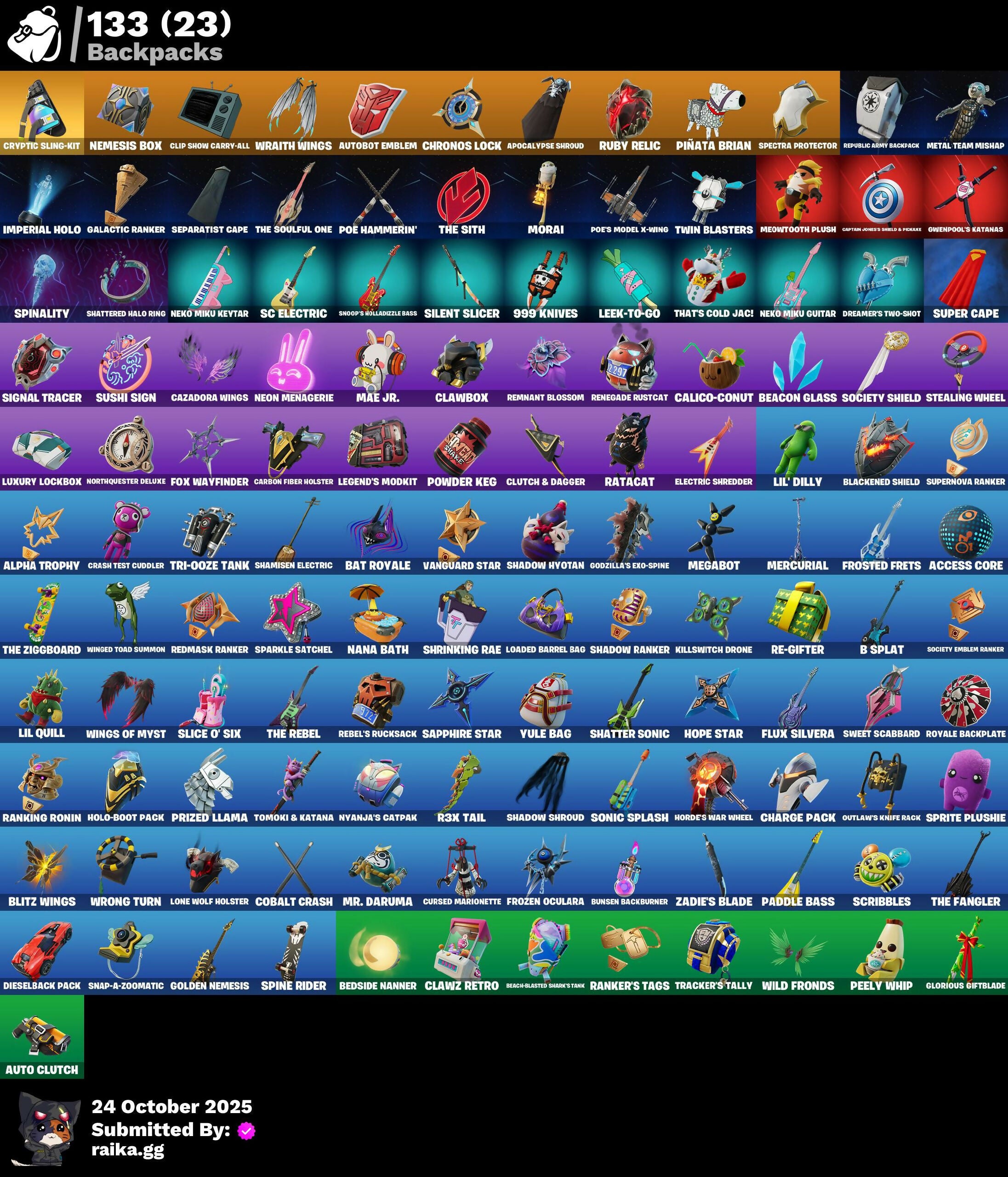 999 Knives, Access Core, Ace Pilot Poe, Adventure Aerial, Aerial Classic, Aerial Swagger, Ahsoka's Staff, Alpha Trophy, Antonia, Antonia In Action, Apex Predator, Apocalypse Shroud, Appeeling Drive, Apprentice Evie, Arctic Achiever, Artifact Axe, Auntie Dot, Auto Clutch, Autobot, Autobot Emblem, Axo's Big Moment, B Splat, B.R.U.T.E. Competitor, Backup Blades, Baron Kane, Baron's Hoard, Bat Royale, Batman, Battle Blessing, Battle Ready Era, Battle Ready Poe, Battle-Tested, Baymax Wings, Be The Mastermind, Beach Breezer, Beach-Blasted Shark's Tank, Beacon Glass, Bear Hug, Beatzbunny, Bedside Nanner, Belt It!, Bi-Han, Big Dill, Big Fan, Bike To Go, Birthday Basher, Birthday Dash, Black Leader, Black One X-Wing, Blackened Shield, Blades of Light, Blitz Axe, Blitz Wings, Blocko, Bones, Boogie Down, Boot It, Brilliant Cutters, Brite Hatsune Miku, Buffer Fish, Bugsy, Bullet Rider, Bunsen Backburner, Burn Bright, Burning Ambition Valeria, Bushie Bright, Buzzsaw Breacher, By The Horns, Cactus Club, Calico Holiday, Calico-Conut, Cap Attack, Captain Jones's Shield & Pznake, Captain Llamerica, Carbon Fiber Holster, Carbon Scarlet, Card Drop, Carmine Rosso, Cassidy Quinn, Cauldron Chill, Cazadora, Cazadora Wings, Chaos Directive, Charge Pack, Chemist's Cloudglider, Choose Naughty, Chronos Lock, Classic Age, Clawbox, Clawz Retro, Cliffside Soarer, Clip Show Carry-All, Clutch & Dagger, Cobalt Crash, Cobalt Snowfoot, Cold Furia, Collector Kado Thorne, Combat Giller, Come Get Me!, Comet, Cometbrella, Competitor's Time Brella, Confident Iridia, Conqueror's Axe, Conqueror's Charge, Conqueror's Claim, Conqueror's Stare, Console Cup, Contour Camo, Coral Crush, Count It!, Courageous Mikasa, Crack It, Crash Test Cuddler, Crashed Chiller, Crashed Shield, Crimson Polestar, Cross Grand Entrance, Cross Your Heart, Crowning Achievement, Cryptic Coaster, Cryptic Sling-Kit, Crystal Fang, Crystal Smasher, Cuddle Carvers, Cuddle Team Sierra, Cuddle Team Specialist, Cuddle's Garden, Cursed Marionette, Cybertronian Axe, Daigo, Daigo's Claws, Daigo's Stance, Dancefloor Diva, Dark Charger, Darkfire Claws, Deal'em Cassidy Quinn, Dealer's Deck, Death Star Smasher, Demon Hunter Hope, Determined Kendo, Determined Renegade, Diamond Throne, Diamondclaw Picker, Dice Roll, Dieselback Pack, Digital Dream, Dill With It, Dillicious, Dillinger The Gherk, Direct The Chaos, Diva Fever, Diva's Dancefloor, Diva's Grin, Do The Split, Dogg Treat, Doom Brella, Double-Suited Queen, Dough On The Go, Doze Dab, Dragonhearted 'Brella, Dramatic Flares, Dreamer's Two-Shot, Drones-Y View, Duelist's Card Trick, Duelist's Foil, Dumbbell Driver, Dumbell Driver, Dummy, Dune Scooper, Dupli-Kate, Duplicating Batons, Duplikates, Dusk Knight, Dynamic Tntina, E.G.O., Easter Egg, Eclipse Brella, Eclipsed Edges, Electric Shredder, Electro Pairing Blades, Elegance Blade, Elegant Crowbar, Elite Servo, Ember Pick, Emma's Influence, Emperor Palpatine, Emperor's Might, Energized Godzilla, Epic Blade of Floof, Era, Evie's Force Balance, Evie's Saber Attack, Evolved Heat Ray, Eyes Of The Cuddle Team, Fan Attack, Fancy Peter Griffin, Fang Dance, Feel The Force, Felina, Felina's Claw, Fiendish Wand, Final Eclipse, Final Harbinger, Fish Hook, Fish Thicc, Fist Bump, Fizzle, Flaky Feast, Flashback Breakdown, Fletcher Kane, Fletcher's Cane, Flight Risk, Flood, Flux Silvera, Foil Flex, Force Lightning, Fox Wayfinder, Frequency Flyer, Front Page Pose, Frostburn, Frosted Frets, Frozen Oculata, Frozen Over, Frozen Treat Cart, Fryangles, Full Moon Fletcher Kane, Furrmidable Meowscles, G1 Optimus Prime, GG Cuddlez, Galactic Ranker, General Grievous, Get Griddy, Get Out Of Your Mind, Gg Snakes, Gg Snowman, Gila Classic, Gilded Pinscher, Glorious Giftblade, Godzilla Awaits, Godzilla Evolved, Godzilla's Exo-Spine, Golden Conqueror, Golden Ghoul, Golden Nemesis, Golden Scythe, Golden Wolf, Good Game, Well Played, Grand Glacier Glider, Groovy!, Gwenpool's Katanas, Gwetterman Jacket, Hand of Trace, Harbinger Armor Omegarok, Harbinger Of Victory, Harley Hitter, Haruka Of The Masks, Haute Hustle, Heart Chopper, Heartburst, Heavy Metal Omega, Helmet On, Hero Baymax, Heroic Baymax, High Society Glider, Highwire Hop, Holiday Boxy, Holo-Boot Pack, Hope, Hope Star, Hope You're Ready, Hope's Look, Hordes War Wheel, Hot 'N Sour, Hot Pokers, Howlin', Humbug Slicer, Hunter's Reach, Hype!, Hypno-Bat, I'm A Mystery, IWD 2023 Banner, Ice Breaker, Iconic Age, Idol Lights, Illusion Master, Illusionist's Blades, Imperial Holo, Indigo Inverter, Infinite Swirl, Influential, Intentions Unknown, Invisible Cut, It's Chemistry!, It's Like This, It's Miku!, Jackie, Jade, Jade's Curse, Jar Buster, Je Suis Montague, Jelly Jammin', Jet Signals, Jones Underground, Joss, Joss' Chaos, Jujutsu Kaisen Emblem, Jungle King, Just Desserts, Ka-Choorn!, Kado Thorne, Kehlani, Keisha Cross, Kendo, Khaby Lame, Killswitch Drone, Killswitch Ready, King Of The Outlaws, King Wings, King's Seal, Kintsugi Daigo, Klassic Kombat Crasher, Knife Sharpener, Knight Conqueror, Knight's Helm, Knights Honor, Kombat Crasher, Kon's Bark, LBC Signature, Lady in Gold, League Balloon, Leek-To-Go, Legend's Modkit, Legend's Retribution, Let The Wookiee Win, Lightrider Insignia, Lil Quill, Lil Split, Lil' Dilly, Lil' Godzilla Attack, Lil' Longboat, Lil' Resistance Bomber, Lil' T-6 Shuttle, Lithic, Loaded Barrel Bag, Lobby Classic, Lone Wolf Holster, Loot Stash, Lorenzo, Lorenzo Explores, Lorenzo The Reckless, Lovely Skully, Lt. Evergreen, Lucha Slashers, Lucky Nyanja, Luxury Lockbox, Mae, Mae Jr., Mae's Sigil, Magnaguard Electrostaff, Marauder's Machete, Mariposa, Mariposa's Mask, Mask of Balance, Masked Victory, Master Plan, Mecha Wrecks, Mega-Brella, Megabot, Melty Team Leader, Menacing Trace, Meowtooth Plush, Mercurial, Metal Team Mishap, Microbot Mallet, Midnight Rumble, Millennium Falcon, Mini Dogfight, Missing: Peely, Modern Rōnin, Molten Max Axe, Monks, Monstrous Hunger, Montague, Morai, Morales Mark, Mothra, Mr. Daruma, Mystery Chemistry