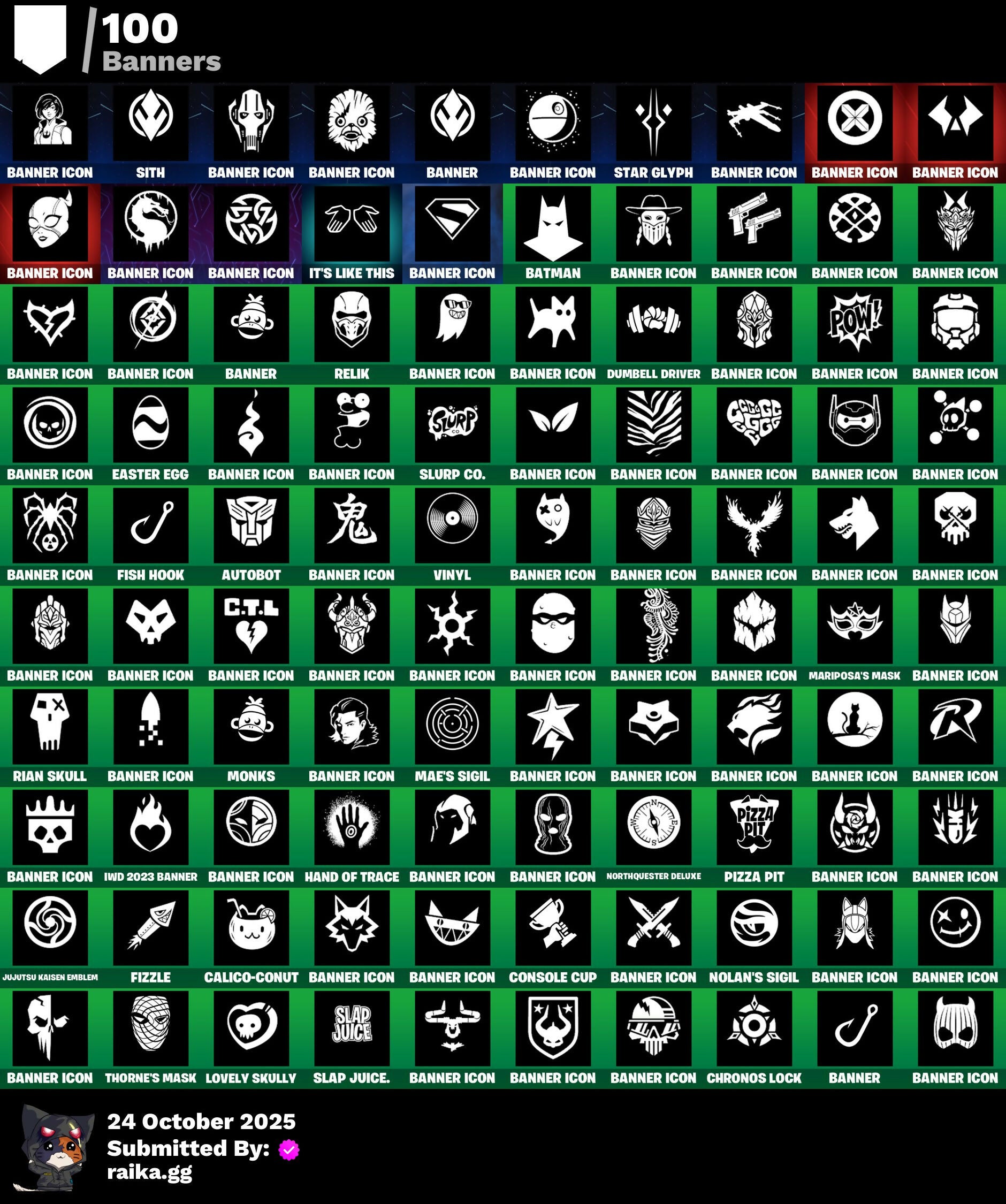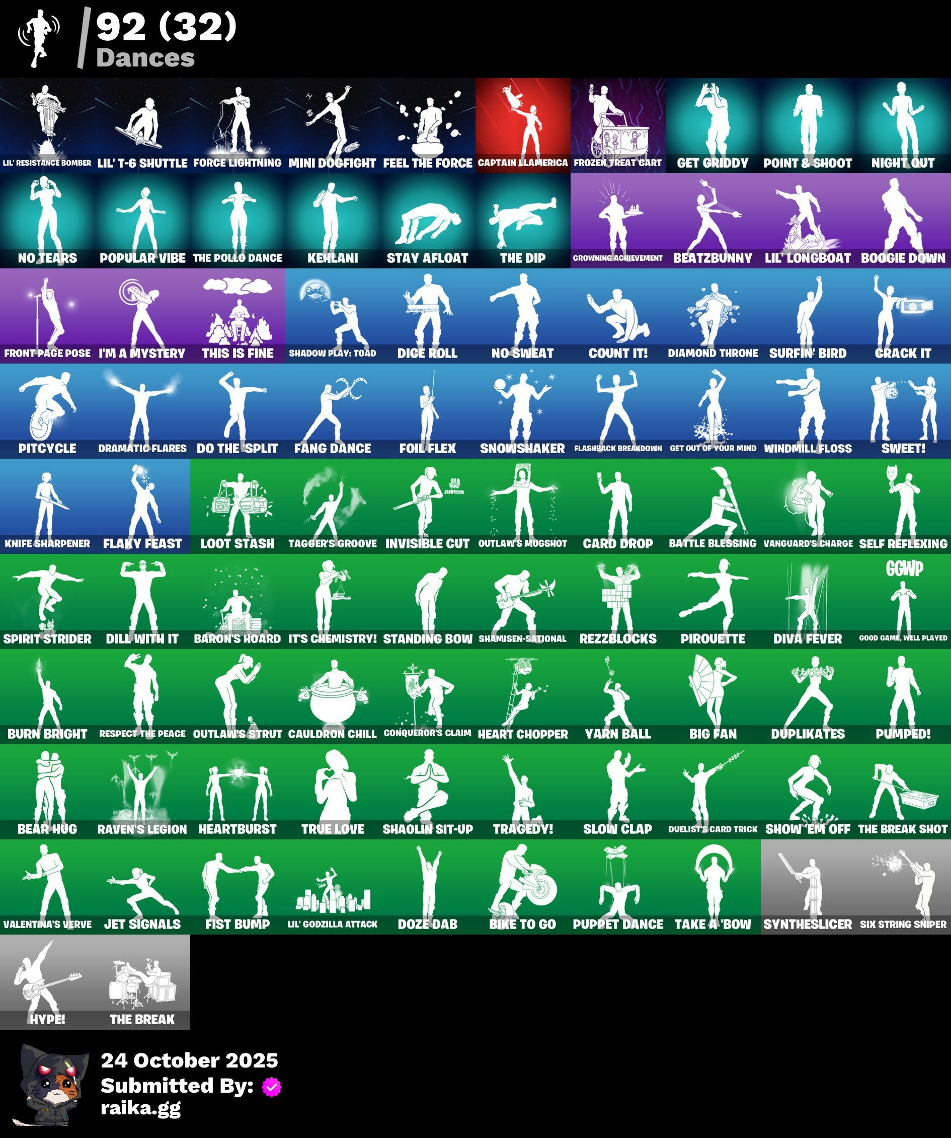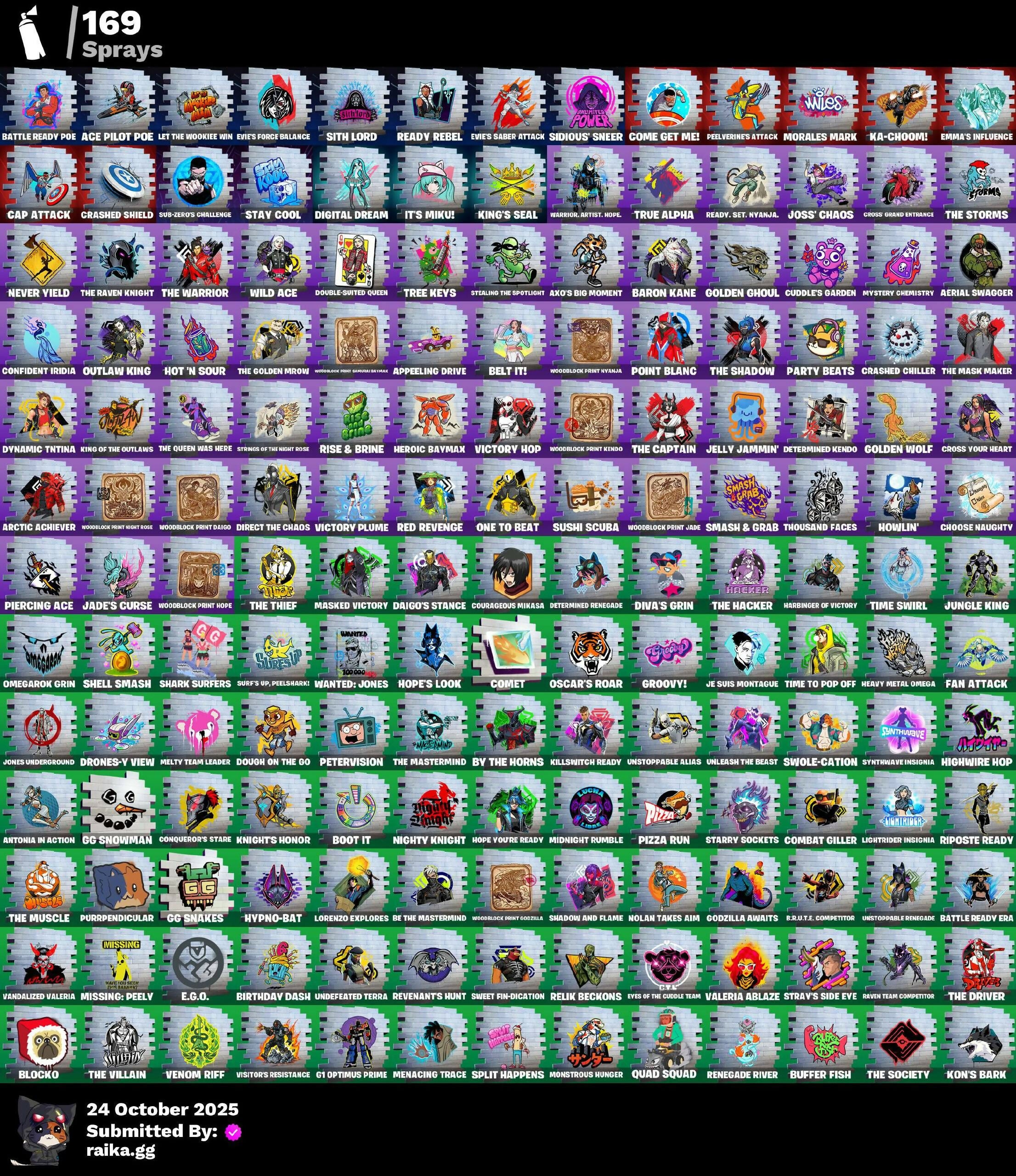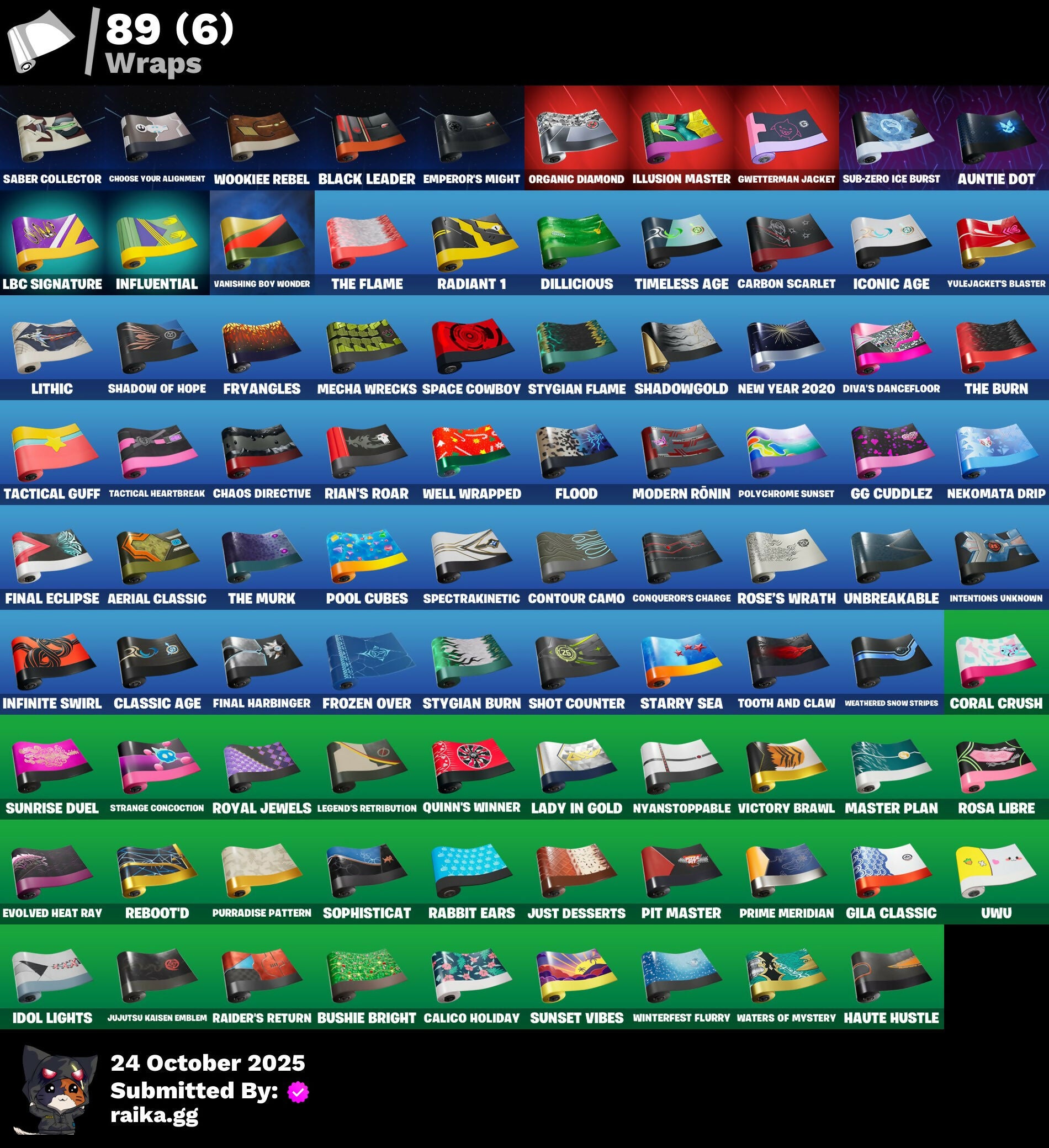 999 Knives, Access Core, Ace Pilot Poe, Adventure Aerial, Aerial Classic, Aerial Swagger, Ahsoka's Staff, Alpha Trophy, Antonia, Antonia In Action, Apex Predator, Apocalypse Shroud, Appeeling Drive, Apprentice Evie, Arctic Achiever, Artifact Axe, Auntie Dot, Auto Clutch, Autobot, Autobot Emblem, Axo's Big Moment, B Splat, B.R.U.T.E. Competitor, Backup Blades, Baron Kane, Baron's Hoard, Bat Royale, Batman, Battle Blessing, Battle Ready Era, Battle Ready Poe, Battle-Tested, Baymax Wings, Be The Mastermind, Beach Breezer, Beach-Blasted Shark's Tank, Beacon Glass, Bear Hug, Beatzbunny, Bedside Nanner, Belt It!, Bi-Han, Big Dill, Big Fan, Bike To Go, Birthday Basher, Birthday Dash, Black Leader, Black One X-Wing, Blackened Shield, Blades of Light, Blitz Axe, Blitz Wings, Blocko, Bones, Boogie Down, Boot It, Brilliant Cutters, Brite Hatsune Miku, Buffer Fish, Bugsy, Bullet Rider, Bunsen Backburner, Burn Bright, Burning Ambition Valeria, Bushie Bright, Buzzsaw Breacher, By The Horns, Cactus Club, Calico Holiday, Calico-Conut, Cap Attack, Captain Jones's Shield & Pznake, Captain Llamerica, Carbon Fiber Holster, Carbon Scarlet, Card Drop, Carmine Rosso, Cassidy Quinn, Cauldron Chill, Cazadora, Cazadora Wings, Chaos Directive, Charge Pack, Chemist's Cloudglider, Choose Naughty, Chronos Lock, Classic Age, Clawbox, Clawz Retro, Cliffside Soarer, Clip Show Carry-All, Clutch & Dagger, Cobalt Crash, Cobalt Snowfoot, Cold Furia, Collector Kado Thorne, Combat Giller, Come Get Me!, Comet, Cometbrella, Competitor's Time Brella, Confident Iridia, Conqueror's Axe, Conqueror's Charge, Conqueror's Claim, Conqueror's Stare, Console Cup, Contour Camo, Coral Crush, Count It!, Courageous Mikasa, Crack It, Crash Test Cuddler, Crashed Chiller, Crashed Shield, Crimson Polestar, Cross Grand Entrance, Cross Your Heart, Crowning Achievement, Cryptic Coaster, Cryptic Sling-Kit, Crystal Fang, Crystal Smasher, Cuddle Carvers, Cuddle Team Sierra, Cuddle Team Specialist, Cuddle's Garden, Cursed Marionette, Cybertronian Axe, Daigo, Daigo's Claws, Daigo's Stance, Dancefloor Diva, Dark Charger, Darkfire Claws, Deal'em Cassidy Quinn, Dealer's Deck, Death Star Smasher, Demon Hunter Hope, Determined Kendo, Determined Renegade, Diamond Throne, Diamondclaw Picker, Dice Roll, Dieselback Pack, Digital Dream, Dill With It, Dillicious, Dillinger The Gherk, Direct The Chaos, Diva Fever, Diva's Dancefloor, Diva's Grin, Do The Split, Dogg Treat, Doom Brella, Double-Suited Queen, Dough On The Go, Doze Dab, Dragonhearted 'Brella, Dramatic Flares, Dreamer's Two-Shot, Drones-Y View, Duelist's Card Trick, Duelist's Foil, Dumbbell Driver, Dumbell Driver, Dummy, Dune Scooper, Dupli-Kate, Duplicating Batons, Duplikates, Dusk Knight, Dynamic Tntina, E.G.O., Easter Egg, Eclipse Brella, Eclipsed Edges, Electric Shredder, Electro Pairing Blades, Elegance Blade, Elegant Crowbar, Elite Servo, Ember Pick, Emma's Influence, Emperor Palpatine, Emperor's Might, Energized Godzilla, Epic Blade of Floof, Era, Evie's Force Balance, Evie's Saber Attack, Evolved Heat Ray, Eyes Of The Cuddle Team, Fan Attack, Fancy Peter Griffin, Fang Dance, Feel The Force, Felina, Felina's Claw, Fiendish Wand, Final Eclipse, Final Harbinger, Fish Hook, Fish Thicc, Fist Bump, Fizzle, Flaky Feast, Flashback Breakdown, Fletcher Kane, Fletcher's Cane, Flight Risk, Flood, Flux Silvera, Foil Flex, Force Lightning, Fox Wayfinder, Frequency Flyer, Front Page Pose, Frostburn, Frosted Frets, Frozen Oculata, Frozen Over, Frozen Treat Cart, Fryangles, Full Moon Fletcher Kane, Furrmidable Meowscles, G1 Optimus Prime, GG Cuddlez, Galactic Ranker, General Grievous, Get Griddy, Get Out Of Your Mind, Gg Snakes, Gg Snowman, Gila Classic, Gilded Pinscher, Glorious Giftblade, Godzilla Awaits, Godzilla Evolved, Godzilla's Exo-Spine, Golden Conqueror, Golden Ghoul, Golden Nemesis, Golden Scythe, Golden Wolf, Good Game, Well Played, Grand Glacier Glider, Groovy!, Gwenpool's Katanas, Gwetterman Jacket, Hand of Trace, Harbinger Armor Omegarok, Harbinger Of Victory, Harley Hitter, Haruka Of The Masks, Haute Hustle, Heart Chopper, Heartburst, Heavy Metal Omega, Helmet On, Hero Baymax, Heroic Baymax, High Society Glider, Highwire Hop, Holiday Boxy, Holo-Boot Pack, Hope, Hope Star, Hope You're Ready, Hope's Look, Hordes War Wheel, Hot 'N Sour, Hot Pokers, Howlin', Humbug Slicer, Hunter's Reach, Hype!, Hypno-Bat, I'm A Mystery, IWD 2023 Banner, Ice Breaker, Iconic Age, Idol Lights, Illusion Master, Illusionist's Blades, Imperial Holo, Indigo Inverter, Infinite Swirl, Influential, Intentions Unknown, Invisible Cut, It's Chemistry!, It's Like This, It's Miku!, Jackie, Jade, Jade's Curse, Jar Buster, Je Suis Montague, Jelly Jammin', Jet Signals, Jones Underground, Joss, Joss' Chaos, Jujutsu Kaisen Emblem, Jungle King, Just Desserts, Ka-Choorn!, Kado Thorne, Kehlani, Keisha Cross, Kendo, Khaby Lame, Killswitch Drone, Killswitch Ready, King Of The Outlaws, King Wings, King's Seal, Kintsugi Daigo, Klassic Kombat Crasher, Knife Sharpener, Knight Conqueror, Knight's Helm, Knights Honor, Kombat Crasher, Kon's Bark, LBC Signature, Lady in Gold, League Balloon, Leek-To-Go, Legend's Modkit, Legend's Retribution, Let The Wookiee Win, Lightrider Insignia, Lil Quill, Lil Split, Lil' Dilly, Lil' Godzilla Attack, Lil' Longboat, Lil' Resistance Bomber, Lil' T-6 Shuttle, Lithic, Loaded Barrel Bag, Lobby Classic, Lone Wolf Holster, Loot Stash, Lorenzo, Lorenzo Explores, Lorenzo The Reckless, Lovely Skully, Lt. Evergreen, Lucha Slashers, Lucky Nyanja, Luxury Lockbox, Mae, Mae Jr., Mae's Sigil, Magnaguard Electrostaff, Marauder's Machete, Mariposa, Mariposa's Mask, Mask of Balance, Masked Victory, Master Plan, Mecha Wrecks, Mega-Brella, Megabot, Melty Team Leader, Menacing Trace, Meowtooth Plush, Mercurial, Metal Team Mishap, Microbot Mallet, Midnight Rumble, Millennium Falcon, Mini Dogfight, Missing: Peely, Modern Rōnin, Molten Max Axe, Monks, Monstrous Hunger, Montague, Morai, Morales Mark, Mothra, Mr. Daruma, Mystery Chemistry