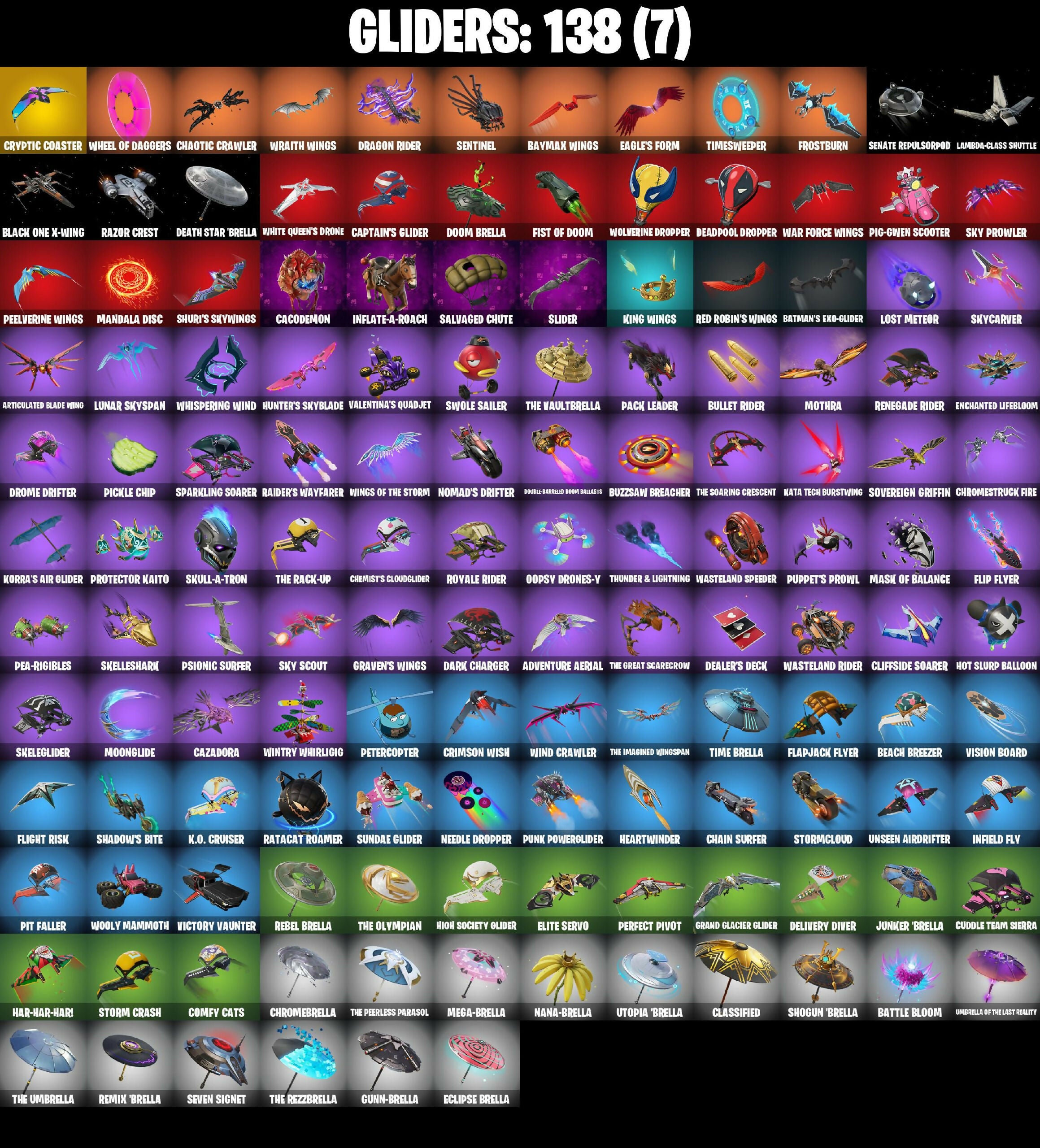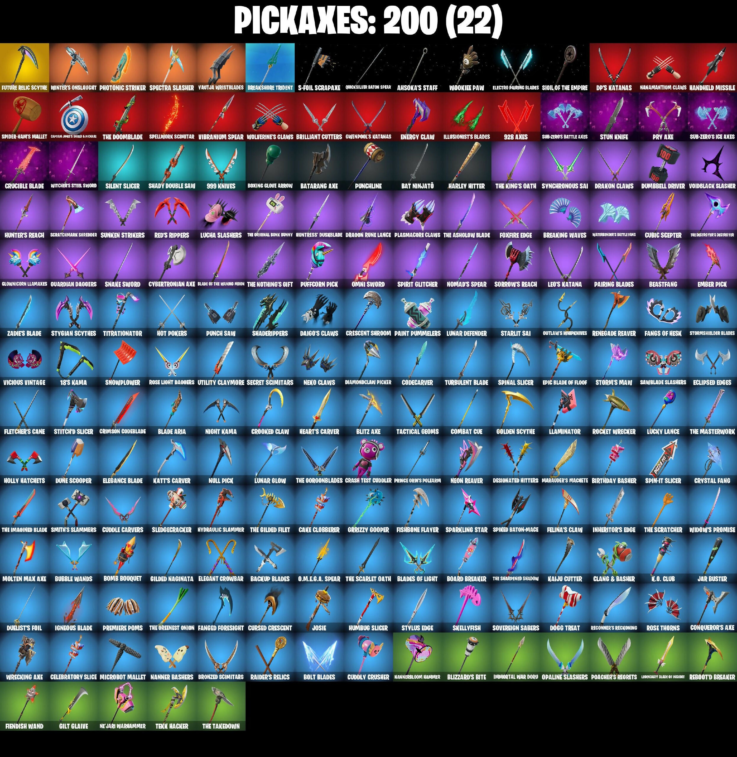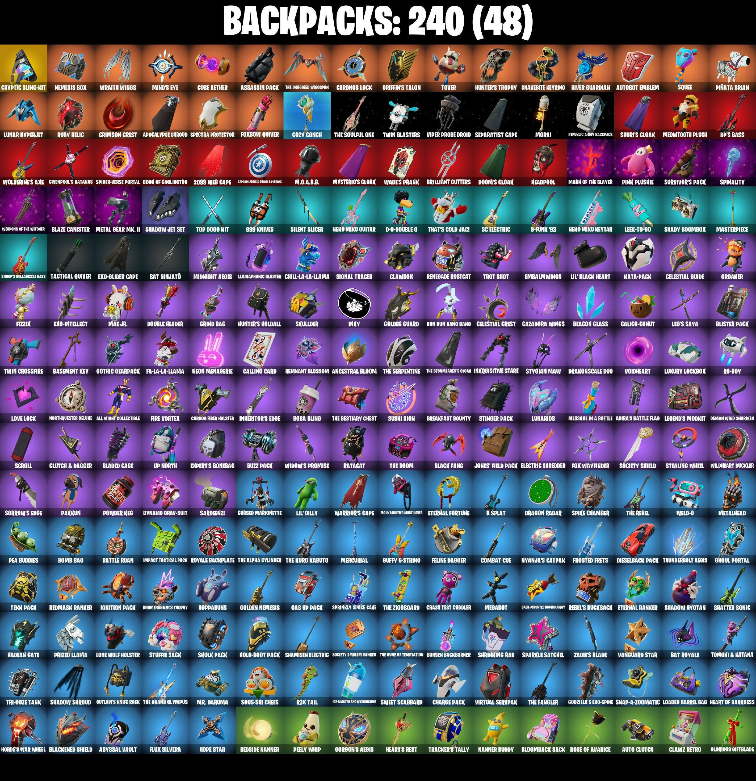 (Snikti!), 1-Ball, 18's Kama, 2099 Web Cape, 928 Axes, 999 Knives, Abyssal Vault, Adira, Adira'S Battle Flag, Adventure Aerial, Aerial Assault Bomber, Agent Jones, Ahsoka Tano, Ahsoka's Staff, All Might Collectible, Alli, Aloy, Always Fantabulous, Ancestral Bloom, Andy Fangerson, Antonia, Aphrodite, Apocalypse Shroud, Arctic Adeline, Ares, Armored Batman Zero, Articulated Blade Wing, Ash Thicc, Assassin Pack, Astrea, Astro Armor, Auto Clutch, Autobot Emblem, B Splat, Back-Mounted Bombs Away, Backup Blades, Balance Board, Baron's Hoard, Basement Key, Bat Ninjato, Bat Ninjaṭō, Bat Royale, Batarang Axe, Batman’s Exo-Glider, Battle Blessing, Battle Bloom, Battle Ruin, Baymax Wings, Beach Breezer, Beacon Glass, Beast Blastin', Beastfang, Bedside Nanner, Bi-Han, Big Dill, Bim Bam Boom, Birthday Basher, Black Fang, Black One X-Wing, Black Panther (Shuri), Black Queen, Blackened Shield, Blade Aria, Blade of the Waning Moon, Bladed Cage, Blades of Light, Blaze Canister, Blister Pack, Blitz Axe, Blizzard Bomber, Blizzard's Bite, Bloomback Sack, Blowin' Up, Blue-Blood, Board Breaker, Boba Bling, Bolt Blades, Bomb Bag, Bomb Bouquet, Bombastic, Boogie Down, Book of Caoliostro, Boomin', Boxing Glove Arrow, Breakfast Bounty, Breaking Waves, Breakshore Trident, Breezabelle, Brilliant Cutters, Brite Hatsune Miku, Bronzed Scimitars, Bubble Wands, Bubblegum Highwire, Bullet Rider, Bun Bun Bang Bang, Bunsen Backburner, Burning Ambition Valeria, Burnoff, Bust A Move, Buzz Pack, Buzzsaw Breacher, Bye Bye Bye, Bytes, Cacodemon, Caffeinated, Cairo, Cake Clobberer, Calico-Coconut, Call Me, Calling Card, Camo War Machine, Captain America'S Shield & Falcon, Captain America's Shield & Pickaxe, Captain Clamerica, Captain Jones, Captain Jones (Pen & Ink), Captain's Glider, Carbon Fiber Holster, Card Drop, Cassidy Quinn, Cauldron Chill, Cazadora, Cazadora Wings, Celebratory Slice, Celestial Crest, Celestial Guide, Cerberus, Chain Surfer, Chalked Up 1-Ball, Chaos Director, Chaotic Crawler, Charge Pack, Charlotte, Chef's Special, Chemist's Cloudglider, Chill-La-La-Llama, Choice Knit, Chromebrella, Chromestruck Fire, Chronos Lock, Clang & Basher, Classic Peelverine, Classified, Clawbox, Clawz Retro, Clean Sweep, Cliffside Soarer, Clutch & Dagger, Coddu Team Specialist, Codecarver, Combat Cue, Combat Elite, Comfy Cats, Conch Call, Conjure Weapon, Conqueror's Axe, Conqueror's Claim, Cosmic Legacy, Count It!, Cozy Conch, Crack It, Crash Test Cuddler, Crescent Shroom, Crimson Codeblade, Crimson Crest, Crimson Wish, Crooked Claw, Crowning Achievement, Crucible Blade, Cryptic Coaster, Cryptic Sling-Kit, Crystal Fang, Cube Aether, Cubic Scepter, Cuddle Carvers, Cuddle Team Sierra, Cuddly Crusher, Cursed Crescent, Cursed Marionette, Cybertronian Axe, Cyclo Curl, D-O-Double G, DP'S Bass, DPS Katanas, Dagger Dance, Dahlia, Daigo, Daigo's Claws, Dali, Dancefloor Diva, Dark Charger, Dark Gwenpool, Darth Vader, Deadpool (Pen & Ink), Deadpool Dropper, Dealer's Deck, Death Star 'Brella, Deimos, Delivery Diver, Demon Hunter Hope, Demon Wind Shuriken, Designated Hitters, Desirable, Diamond Throne, Diamondclaw Picker, Dice Roll, Dieselback Pack, Dillinger The Other, Dimensional, Diva Fever, Do The Split, Doctor Strange, Dogg Treat, Don't Start Now, Doom, Doom Brella, Doom Slayer, Doom'S Cloak, Doom's Domain, Double Header, Double-Barreled Doom Ballista, Doze Dab, Dragon Radar, Dragon Rider, Dragon Rune Lance, Dragon Steel Hybrid, Dragonscale Duo, Drakon Claws, Dramatic Flares, Drome Drifter, Dromerunner'S Trophy, Duelist's Card Trick, Duelist's Foil, Dumbbell Driver, Dune Scooper, Durrr Taisho, Dusty, Dynamo Grav-Suit, Dynamo Tintina, Dynamo Tntoon-A, Eagle’s Form, Eclipse Brella, Eclipsed Edges, Electric Shredder, Electro Pairing Blades, Elegance Blade, Elegant Crowbar, Elite Servo, Embalmwings, Ember Pick, Emma Frost, Empress Fan Dance, Enchanted Lifebloom, Energized Godzilla, Energy Claw, Epic Blade of Floof, Era, Erisa, Eternal Fortune, Eternal Ranker, Evasive Maneuvers, Evie, Exo-Glider Cape, Exo-Intellect, Expert'S Bonebag, Expressionism, Fa-La-La-Llama, Fang Dance, Fanged Foresight, Fangs of Hesk, Felina, Felina's Claw, Feline Dagger, Fiendish Wand, Fire Show, Fire Vortex, Fireworks Salvo, Fishbone Flayer, Fist Bump, Fist of Doom, Fizzix, Flaky Feast, Flapjack Flyer, Flashback Breakdown, Fletcher Kane, Fletcher's Cane, Flight Risk, Flip Flyer, Flux Silvera, Foil Flex, Forget Me Not, Fox Wayfinder, Foxbow Quiver, Foxfire Edge, Front Page Pose, Frostburn, Frosted Frets, Future Relic Scythe, G-Funk '93, Gas Up Pack, Geralt Of Rivia, Get Out Of Your Mind, Ghoul Portal, Gilded Naginata, Gildhart, Gilt Glaive, Glorious Giftblade, Glownicorn Llamaxes, Goated, Godzilla Evolved, Godzilla'S Exo-Spine, Golden Guard, Golden Nemesis, Golden Scythe, Gorgon'S Aegis, Gothic Gearpack, Grand Glacier Glider, Grave Feather, Graven, Graven's Wings, Green Arrow, Griffin's Talon, Grind Bag, Grizz, Grizzy Gooper, Groaker, Groove Destroyer, Guardian Daggers, Guffy G-String, Gunn-'Brella, Gunnar, Gwen-Step, Gwenpool, Gwenpool'S Katanas, Hadean Gate, Handheld Missile, Har-Har-Har!, Harley Hitter, Harley Quinn, Haruka Of The Masks, Headpool, Heart Chopper, Heart of Darkness, Heart'S Rest, Heart's Carver, Heartwinder, Helichopper, Hellfire Dance, Helmet On, Hero Baymax, Hex-Glasted Snow Cruncher, High Society Glider, Highwire, Holiday Boxy, Holly Hatchets, Holo-Boot Pack, Hope, Hope Star, Hoppabuns, Horde'S War Wheel, Hot Pokers, Hot Slurp Balloon, Humbug Slicer, Hunter'S Holdall, Hunter's Reach, Hunter's Skyblade, Hunter's Trophy, Huntress' Duskblade, Hydraulic Slammer, Hypnot-Eyes, I'm A Mystery, Ice Hunter Aloy, Igneous Blade, Igni Sign, Ignition Pack, Illusionist's Blades, Illusory Mysterio, Imani, Immortal War Doru, Impact Tactical Pack, Imperial March, Infield Fly, Inflate-A-Roach, Inheritor'S Edge, Inkquisitive Stare, Inky, Invisible Cut, It Is Finished, It's Chemistry!, It's Complicated, Izuku Midoriya, Jackie, Jade, Jar Buster, Jet Signals, Jin