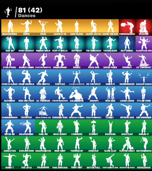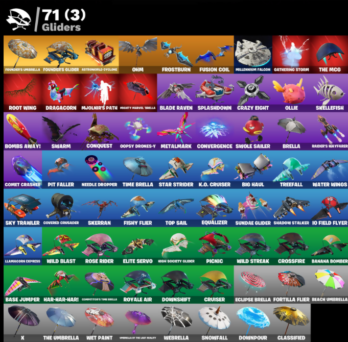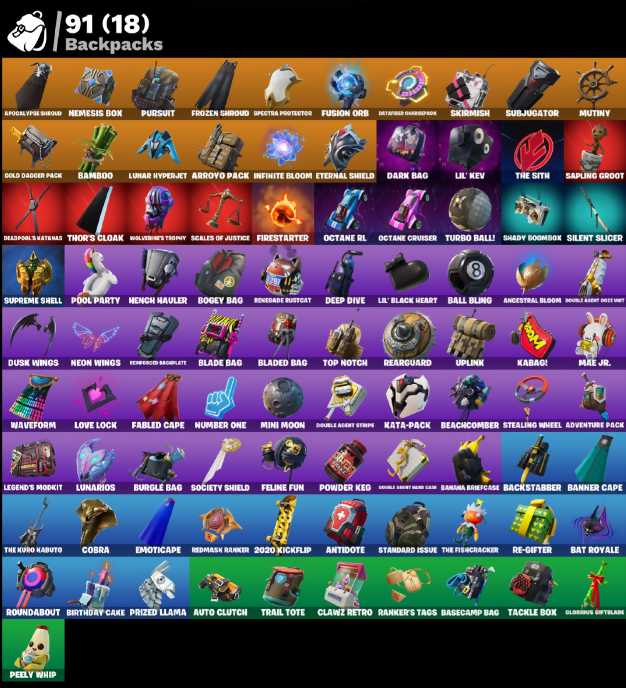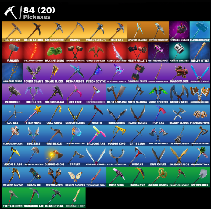 2020 Kickflip, 8-Ball vs Scratch, Adventure Pack, Agent Peely, Air Shredder, Ancestral Bloom, Angler Axes, Antidote, Apocalypse Shroud, Aquaman, Aquaman's Trident, Arroyo Pack, Astroworld Cyclone, Aura, Auto Clutch, Backlash, Backstabber, Backup Blades, Ball Bling, Balloon Axe, Bamboo, Banana Bomber, Banana Briefcase, Bananaxe, Bank Shots, Banner Cape, Base Jumper, Basecamp Bag, Basic Basher, Bat Royale, Bat Signal, Batsickle, Battle Call, Beach Umbrella, Beachcomber, Beep Beep, Big Haul, Birthday Cake, Blackheart, Blade Bag, Blade Raven, Blade of the Warning Moon, Bladed Bag, Blaze, Bogey Bag, Boing!, Bombs Away!, Boogie Down, Boulder Breakers, Breakdown, Brella, Burgle Bag, Calamity, Calculated, Call Me, Cameo vs Chic, Carver, Cat's Claw, Champion Kyra, Chaos Double Agent, Chimichanga!, Classified, Clawz Retro, Clutch, Cobalt, Cobra, Coin Flip, Comet Crasher, Competitor's Time Brella, Conquest, Convergence, Covered Crusader, Crazy Eight, Crescent Shroom, Crossfire, Cruiser, Crystal, Curling Iron, Cyclo Curl, DJ Yonder, Dagger Dance, Dark Bag, Dark Bomber, Databier Chargpack, Deadpool, Deadpool's Katanas, Deep Dive, Disco Fever, Dive Knives, Do The Split, Double Agent Hard Case, Double Agent Hush, Double Agent Ooze Unit, Double Agent Stripe, Double Agent Wildcard, Downpour, Downshift, Doze Dab, Dragacorn, Dragon Stance, Dragon's Claw, Drift, Droop, Dumbbell Driver, Dusk, Dusk Wings, Eclipse Brella, Electro Shuffle, Elite Servo, Emoticape, End Zone, Enforcer, Eon Blades, Epic Swords of Wonder, Equalizer, Eternal Knight, Eternal Shield, Fa-La-La-La Fishstick, Fable, Fabled Cape, Fade, Feline Fun, Firestarter, Fishy Flier, Flashback Breakdown, Flippin Away, Foil Flex, Fortilla Flier, Founder's Glider, Founder's Umbrella, Frostburn, Frozen Shroud, Fusion, Fusion Coil, Fusion Orb, Fusion Scythe, Gathering Storm, Gear Specialist Maya, Gentleman's Dab, Giddy-Up, Glorious Giftblade, Gold Brutus, Gold Crow, Gold Dagger Pack, Gold Meowscles, Gold Midas, Golden King, Golden Pigskin, Golf Clap, Grind, Groot, Groot's Sap Axes, Guiding Glow, Hack & Smash, Hammers of Justice, Hand Signals, Hand of Lightning, Har-Har-Har!, Harley Hitter, Have A Seat, Head Banger, Hench Hauler, High Five, High Society Glider, Highlight Strikers, Holiday Boxy, Hula Hoopin', Hulk Smashers, Huntress, Hybrid, Hydraulic Wrecker, I Declare!, Ice Breaker, Infinite Bloom, Infinite Dab, Io Field Flyer, Iris, It's Go Time!, Jennifer Walters, Journey vs Hazard, Jubilation, Jules, K.O. Cruiser, Kabag!, Kata-Pack, Keep It Mello, Keyed Up, Kit, Knight's Treachery, Laugh It Up, Legend's Modkit, Legendary Blade of Insight, Lil Sput, Lil' Black Heart, Lil' Kev, Lil' Longboat, Lil' Prancer, Living Large, Llamacorn Express, Love Lock, Lt. Evergreen, Lug Axe, Lunar Hyperjet, Lunarios, Mae Jr., Manner Bashers, Marsh Walk, Marshmello, Marshy Smasher, Mayhem Scythe, Mean Streak, Meaty Mallets, Medaxe, Metalmark, Mighty Marvel Brella, Millennium Falcon, Mini Moon, Mjolnir, Mjolnir's Path, Mutiny, Nailed It, Needle Dropper, Nemesis Box, Neon Wings, Ninja Stance, Leo, Number One, Ocean, Octane Cruiser, Octane RL, Octane Whomper, Ohm, Ol' Woody, Ollie, Omegarok, Oopsy Drones-V, Orange Justice, Out West, P.A.N.D.A Team Leader, Pandemonium, Paws & Claws, Peely Whip, Peppermint Pick, Permafrost, Picnic, Pit Faller, Planetary Vibe, Point & Shoot, Pool Party, Pop Axe, Powder Keg, Power Claws, Premiere Poms, Prized Llama, Pursuit, Rage, Rage Quit, Ragnarok, Raider's Wayfarer, Raise The Cup, Ranker's Tags, Rapscallion, Re-Gifter, Reaper, Rearguard, Reckoning, Red Strike, Redline, Redmask Ranker, Regal Wave, Reinforced Backplate, Reliant Blades, Remedy vs Toxin, Reneade Rustcat, Renegade Lynx, Respect The Peace, Ride The Pony, Rift Edge, Rippley vs Sludge, Rock Out, Rook, Root Wing, Rose Glow, Rose Rider, Rose Team Leader, Roundabout, Royale Air, Running Man, Runway Racer, Sapling Groot, Say So, Scales of Justice, Scootin', Scratchmark Shredder, Scuba Jonesy, Secret Scimitars, Shadow Blades, Shadow Stalker, Shady Boombox, Sharpshooter, Shooting Starstaff, Shortbread Slicers, Side Hustle, Silent Slicer, Sing Along, Siona, Skellefish, Skerran, Skirmish, Skull Ranger, Sky Trawler, Skye, Sledgecracker, Sledgehammer, Slim Shady, Slitherin', Slow Clap, Sludgehammer, Smash Up, Snow Shaker, Snowfall, So Square, Society Shield, Solar Slicer, Solid Scratch, Specialist Pickaxe, Spectra Knight, Spectra Protector, Spectra Slasher, Spellwork Scimitar, Splashdown, Springy, Standard Issue, Star Strider, Star Wand, Stealing Wheel, Steel Shadow, Storm, Stormy, Subjugator, Summit Striker, Sun Strider, Sundae Glider, Supreme Shell, Swag Smasher, Swarm, Swipe It, Swole Sailer, TNTina, Tackle Box, Take The Cake, Tart Tycoon, Tech Axe, The Destroyer's Destroyer, The Fishcracker, The Imagined Blade, The Kuro Kabuto, The Mcg, The Renegade, The Sith, The Takedown, The Umbrella, Thor, Thor's Cloak, Throwback Axe, Thumbs Up, Thunder Crash, Tide Axes, Time Brella, Tippy Tap, Tnteeth, Toosie Slide, Top Notch, Top Sail, Tra La La, Trail Tote, Treat Yourself, Treefall, Triple-Double, Turbo Ball!, Turk vs Riptide, Twist, Umbrella of the Last Reality, Uplink, Venom Blade, Verve, Vindertech Elite, Vizion Strikers, Warpaint, Water Wings, Waterworks, Waveform, Wavy T, Webrella, Wet Paint, Wild Blast, Wild Streak, Wingman, Winters Onslaught, Wolverine's Trophy, Wrenchers, X, Yellowjacket, You're Awesome