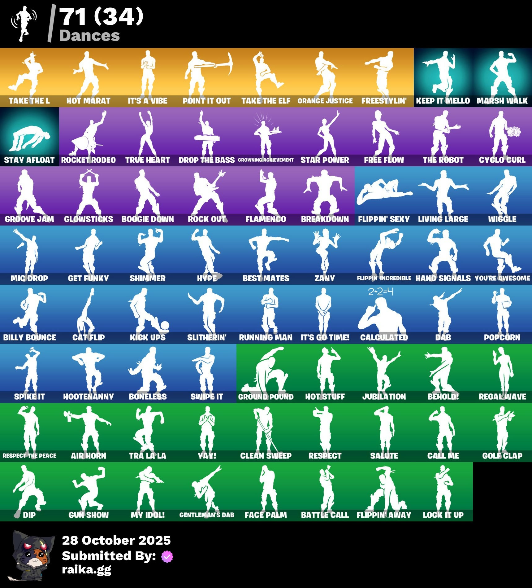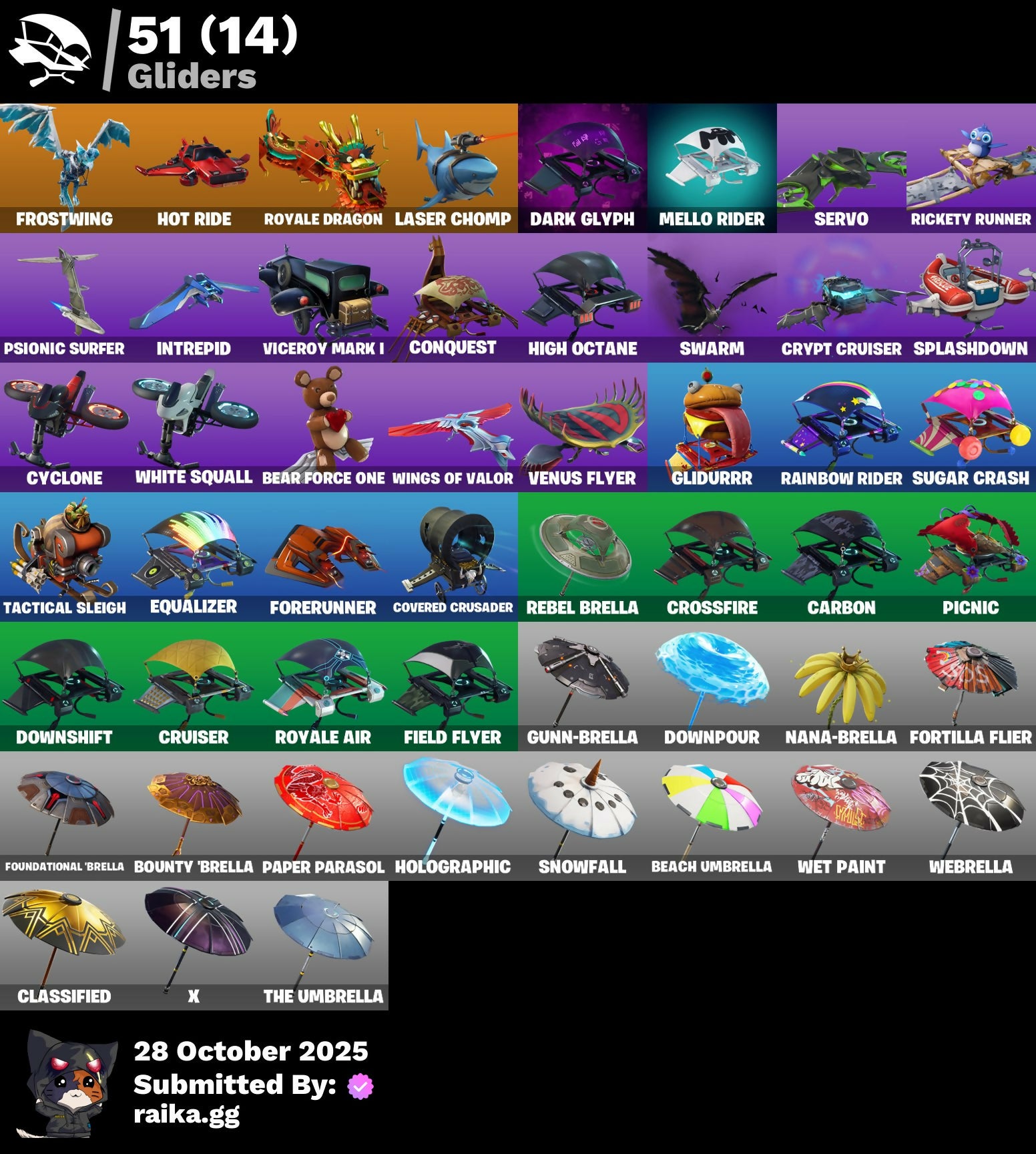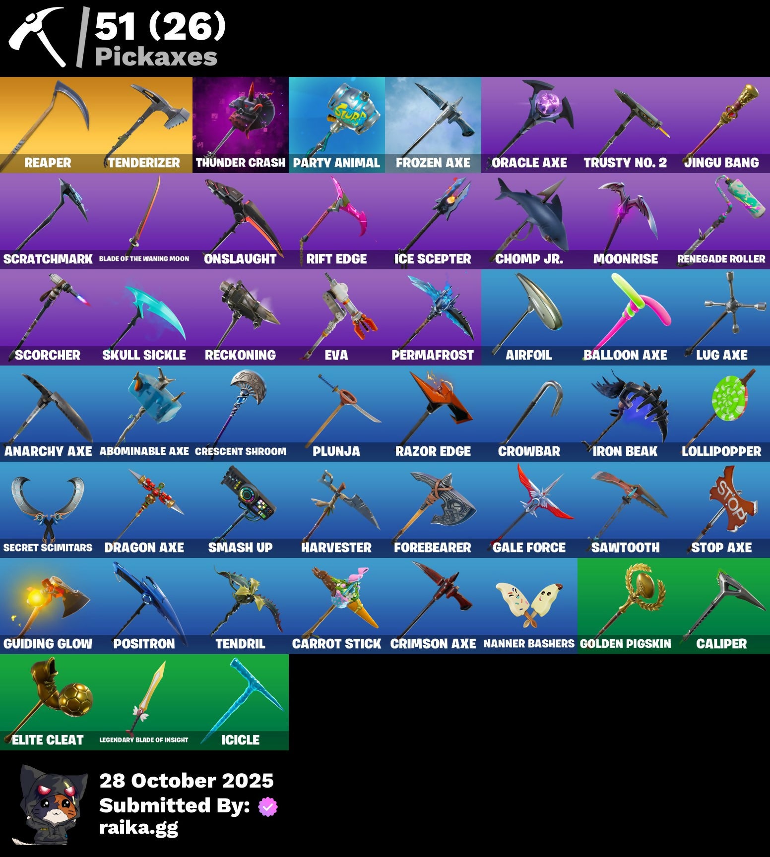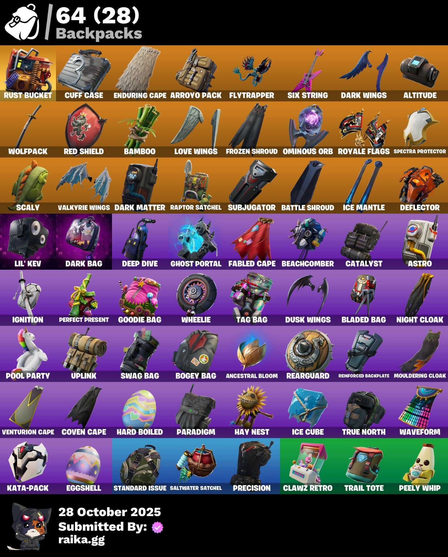 Abominable Axe, Abstrakt, Air Horn, Airfoil, Altitude, Anarchy Axe, Ancestral Bloom, Archetype, Arroyo Pack, Astro, Balloon Axe, Bamboo, Battle Call, Battle Shroud, Battlehawk, Beach Umbrella, Beachcomber, Bear Force One, Behold!, Best Mates, Billy Bounce, Blade of The Waning Moon, Bladed Bag, Blitz, Bogey Bag, Boneless, Boogie Down, Bounty 'Brella, Brainiac, Breakdown, Brilliant Striker, Bunny Brawler, Burnout, Calamity, Calculated, Caliper, Call Me, Carbide, Carbon, Carrot Stick, Cat Flip, Catalyst, Chomp Jr., Classified, Clawz Retro, Clean Sweep, Cobalt, Conquest, Coven Cape, Covered Crusader, Crescent Shroom, Crimson Axe, Crossfire, Crowbar, Crowning Achievement, Cruiser, Crypt Cruiser, Cuff Case, Cyclo Curl, Cyclone, DJ Yonder, Dab, Dark Bag, Dark Bomber, Dark Glyph, Dark Matter, Dark Voyager, Dark Wings, Deep Dive, Deflector, Diecast, Dip, Dire, Downpour, Downshift, Dragon Axe, Drift, Drop The Bass, Dusk, Dusk Wings, Eggshell, Elite Agent, Elite Cleat, Enduring Cape, Enforcer, Equalizer, Eva, Fable, Fabled Cape, Face Palm, Fate, Field Flyer, Flamenco, Flippin' Away, Flippin' Incredible, Flippin' Sexy, Flytrap, Flytrapper, Forebearer, Forerunner, Fortilla Flier, Foundational 'Brella, Free Flow, Freestylin', Frostwing, Frozen Axe, Frozen Shroud, Gale Force, Gentleman's Dab, Get Funky, Ghost Portal, Giddy-Up, Glidurr, Glowsticks, Golden Pigskin, Golf Clap, Goodie Bag, Grill Sergeant, Groove Jam, Ground Pound, Guiding Glow, Gun Show, Gunn-Brella, Hand Signals, Hard Boiled, Harvester, Hay Man, Hay Nest, High Octane, Hollowhead, Holographic, Hootenanny, Hot Marat, Hot Ride, Hot Stuff, Huntress, Hype, Ice Cube, Ice Mantle, Ice Scepter, Icicle, Ignition, Intrepid, Iron Beak, It's A Vibe, It's Go Time!, Jingu Bang, Jubilation, Kata-Pack, Keep It Mello, Kick Ups, Laser Chomp, Legendary Blade of Insight, Lil' Kev, Living Large, Lock It Up, Lollipopper, Love Ranger, Love Wings, Lug Axe, Lynx, Magnus, Marsh Walk, Marshmello, Mello Rider, Mic Drop, Mission Specialist, Moonrise, Moonwalker, Mouldering Cloak, My Idol!, Nana-Brella, Nanner Bashers, Night Cloak, Nightshade, Omega, Omen, Ominous Orb, Onesie, Onslaught, Oracle Axe, Orange Justice, P.A.N.D.A Team Leader, Paper Parasol, Paradigm, Party Animal, Peely Whip, Perfect Present, Permafrost, Picnic, Plunja, Point It Out, Pool Party, Popcorn, Positron, Powder, Power Chord, Precision, Psionic Surfer, Rabbit Raider, Ragnarok, Rainbow Rider, Raptor, Raptor Satchel, Ravage, Razor Edge, Reaper, Rearguard, Rebel Brella, Reckoning, Red Knight, Red Shield, Red Strike, Redline, Regal Wave, Reinforced Backplate, Renegade Roller, Respect, Respect The Peace, Rex, Rickety Runner, Rift Edge, Rock Out, Rocket Rodeo, Rogue Agent, Rook, Royale Air, Royale Dragon, Royale Flags, Running Man, Rust Bucket, Rust Lord, Saltwater Satchel, Salute, Sanctum, Sawtooth, Scaly, Scorcher, Scratchmark, Secret Scimitars, Servo, Sgt. Winter, Shimmer, Six String, Skull Ranger, Skull Sickle, Skull Trooper, Sledgehammer, Slitherin', Smash Up, Snowfall, Spectra Protector, Spike It, Splashdown, Squad Leader, Standard Issue, Star Power, Stay Afloat, Stop Axe, Subjugator, Sugar Crash, Sun Strider, Swag Bag, Swarm, Swipe It, Tactical Sleigh, Tag Bag, Take The Elf, Take The L, Teknique, Tenderizer, Tendril, The Ace, The Ice King, The Reaper, The Robot, The Umbrella, Thunder Crash, Tra La La, Trail Tote, Trailblazer, Trog, True Heart, True North, Trusty No. 2, Uplink, Valkyrie, Valkyrie Wings, Valor, Venturion, Venturion Cape, Venus Flyer, Vertex, Viceroy Mark I, Waveform, Webrella, Wet Paint, Wheelie, Whistle Warrior, White Squall, Whiteout, Wiggle, Wild Card, Wingman, Wings Of Valor, Wolfpack, World Cup, Wukong, X, Yay!, You're Awesome, Zany, Zenith, Zoey
