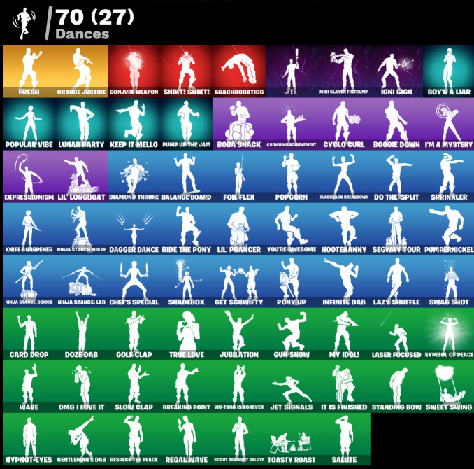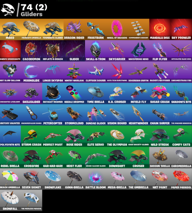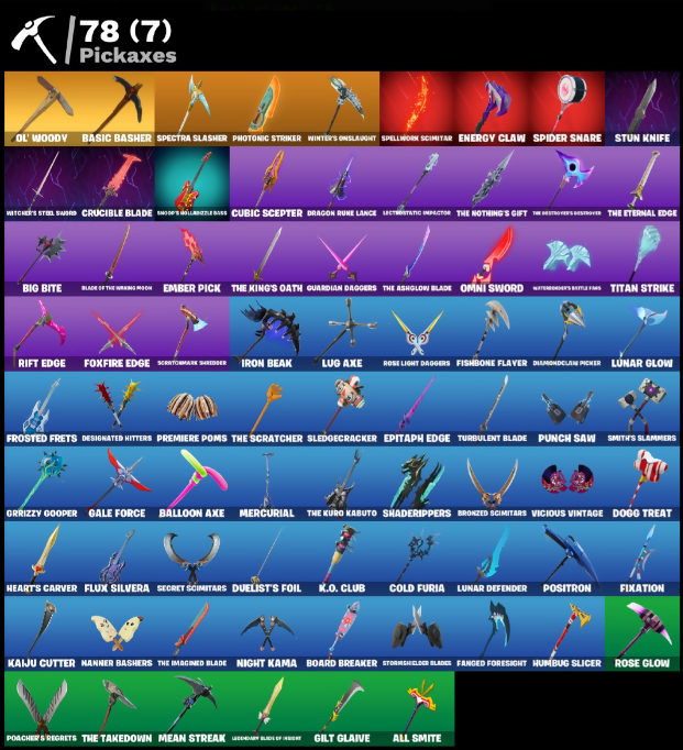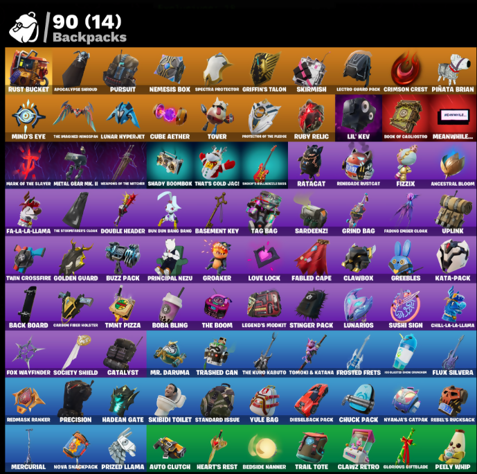 Aang, Abstrakt, All Might, All Smite, Ancestral Bloom, Aphrodite, Apocalypse Shroud, Arachnobatics, Arctic Adeline, Articulated Blade Wing, Auto Clutch, Back Board, Balance Board, Balloon Axe, Basement Key, Basic Basher, Battle Bloom, Battlehawk, Beach Umbrella, Bedside Nanner, Big Bite, Blade of the Waking Moon, Board Breaker, Boba Bling, Boba Snack, Boogie Down, Book of Cagliostro, Boy's A Liar, Breaking Point, Bronzed Scimitars, Bun Bun Bang Bang, Buzz Pack, Bytes, CTS, Cacodemon, Carbide, Carbon Fiber Holster, Card Drop, Catalyst, Cerberus, Chain Surfer, Chef's Special, Chill-La-La-Llama, Chromebrella, Chromestruck Firi, Chuck Pack, Clawbox, Clawz Retro, Cliffside Soarer, Cold Furia, Comfy Cats, Commander's Descent, Conjure Weapon, Crimson Crest, Crossfire, Crowning Achievement, Crucible Blade, Cruiser, Cube Aether, Cubic Scepter, Cyclo Curl, Dagger Dance, Designated Hitters, Diamond Throne, Diamondclaw Picker, Dieselback Pack, Do The Split, Doctor Strange, Dogg Treat, Doom Slayer, Double Header, Downshift, Doze Dab, Dragon Rider, Dragon Rune Lance, Drift, Duelist's Foil, Dusty, Electrobatic Impactor, Elite Servo, Ember Pick, Enchanted Lifebloom, Energy Claw, Epitaph Edge, Eren Jaeger, Erisa, Evie, Explorer Emilie, Expressionism, Fa-La-La-Llama, Fabled Cape, Fading Ember Cloak, Fanged Foresight, Fishbone Flayer, Fixation, Fizzix, Flashback Breakdown, Flip Flyer, Flux Silvera, Focus, Foil Flex, Founders Glider, Founders Umbrella, Fox Wayfinder, Foxfire Edge, Fresh, Frostburn, Frosted Frets, Gale Force, Gentleman's Dab, Geralt Of Rivia, Get Schwifty, Gildhart, Gilt Glaive, Glorious Giftblade, Golden Guard, Golf Clap, Grand Glacier Glider, Greebles, Griffin's Talon, Grind Bag, Grizz, Grizzy Gooper, Groaker, Guardian Daggers, Gun Show, Gunn-Brella, Gunnar, Hadean Gate, Har-Har-Har!, Heart's Rest, Hearts Carver, Heartwinder, Heist Flier, Helsie, High Society Glider, Holiday Boxy, Hootenanny, Hope, Hot Slurp Balloon, Humbug Slicer, Huntress, Hypnot-eyes, I'm A Mystery, Igni Sign, Imani, Infield Fly, Infinite Dab, Inflate-A-Roach, Iron Beak, It Is Finished, Jackie, Jet Signals, Jubilation, K.O. Club, K.O. Cruiser, Kaiju Cutter, Kata Tech Bursting, Kata-Pack, Kaws Skeleton, Keep It Mello, Kiara K.O., Knife Sharpener, Laser Focused, Lazy Shuffle, Lectro Guard Pack, Legend's Modkit, Legendary Pulse of Destiny, Lennox Rose, Lil Spuit, Lil' Kev, Lil' Longboat, Lil' Prancer, Love Lock, Lug Axe, Lunar Defender, Lunar Glow, Lunar Hyperjet, Lunar Party, Lunar Skyspan, Lunarios, Magnoroller Board, Mako, Malik, Mandala Disc, Mark of the Slayer, Massai, Mean Streak, Meanwhile..., Mega-Brella, Meow Skulls, Mercurial, Metal Gear Mk. II, Mind's Eye, Mini Slayer Fistbump, Montague, Moonglide, Mr. Dappermint, Mr. Daruma, My Idol!, Nanner Bashers, Needle Dropper, Nemesis Box, Nezumi, Night Kama, Ninja Stance: Donnie, Ninja Stance: Leo, Ninja Stance: Mikey, Nisha, Nova Snackpack, Nyana's Catpak, Ol' Woody, Omegarok, Omg I Love It, Omni Sword, Orange Justice, Oscar, Owen's Spiderchute, Paper Parasol, Paragon (Reulte 050), Peely Whip, Perfect Pivot, Peter Griffin, Petercopter, Photonic Striker, Piñata Brian, Poacher's Regrets, Polysynth Kite, Pony Up, Popcorn, Popular Vibe, Positron, Precision, Premiere Poms, Principal Nezu, Prized Llama, Protector of the Fledge, Prowler, Pump Up The Jam, Pumpernickel, Punch Saw, Pursuit, Raider's Wayfarer, Ratacat, Ratacat Roamer, Rebel Brella, Rebel's Rucksack, Redline, Redmask Ranker, Regal Wave, Renegade Lynx, Renegade Rustcat, Renzo The Destroyer, Respect The Peace, Ride The Pony, Rift Edge, Rogue Agent, Ronin, Rose Glow, Rose Light Daggers, Rose Rider, Rose Team Leader, Ruby Relic, Rufus, Runway Racer, Rust Bucket, Salute, Santa Dogg, SardeeNz!, Scout Regiment Salute, Scrapthornshark Shredder, Secret Scimitars, Segway Tour, Selene, Seven Signet, Sgt. Green Clover, Shadebox, Shaderippers, Shadow's Bite, Shady Boombox, Shanta, Shoddy's Hollowedzzel Bass, Shogun Brella, Skeleglider, Skibidi Toilet, Skirmish, Skull-A-Tron, Sky Prowler, Skycarver, Sled Ready Guff, Sledgecracker, Slider, Slim Shady, Slow Clap, Smith's Slammers, Snap, Snikt! Snikt!, Snoop's Tootblazz Burst, Snowfall, Snowflake, Society Shield, Solid Snake, Sovereign Griffin, Spectra Protector, Spectra Slasher, Spectral Knight, Spellwork Scimitar, Spider Snare, Spider-Gwen, Sprinkler, Standard Issue, Standing Bow, Stinger Pack, Storm Crash, Stormcloud, Stormfarer, Stormshielder Blades, Stray, Stun Knife, Sugar Crash, Sundae Glider, Sunspot, Sushi Sign, Swag Shot, Sweet Swing, Sylvie, Symbol Of Peace, TMNT Pizza, Tag Bag, Teknique, That's Cold Jac!, The Ashglow Blade, The Boom, The Destroyer's Destroyer, The Eternal Edge, The Herald, The Imagined, The Imagined Blade, The Imagined Wingspan, The King's Oath, The Kuro Kabuto, The Nothing's Gift, The Olympian, The Origin, The Peerless Parasol, The Scratcher, The Stompfarer's Cloak, The Takedown, The Umbrella, Thunder, Time Brella, Titan Strike, Toasty Roast, Tomoki & Katana, Tover, Trail Tote, Trashed Can, True Love, Tsuki 2.0, Turbulent Blade, Twin Crossfire, Twyn, Uplink, Valeria, Vengeance Jones, Vicious Vintage, Victory Vaunter, Vision Board, Vulejacket, Warpaint, Waterborner's Battle Fans, Wave, Weapons of the Watcher, Wet Paint, Wheel Of Daggers, Whispering Wind, Wild Streak, Winter's Onslaught, Wintry Whirligig, Witcher's Steel Slicer, Wu-Tang Is Forever, You're Awesome, Yule Bag