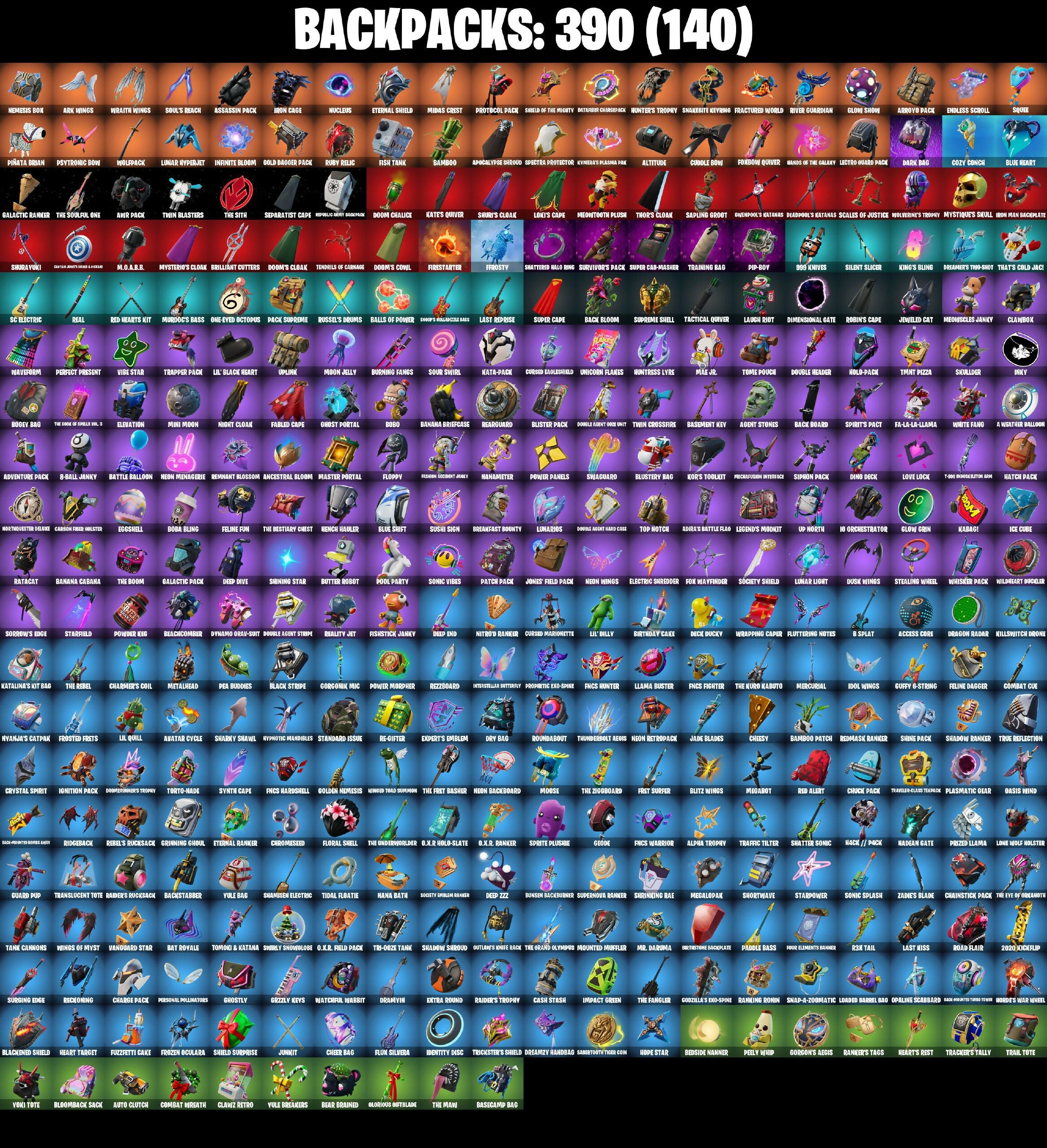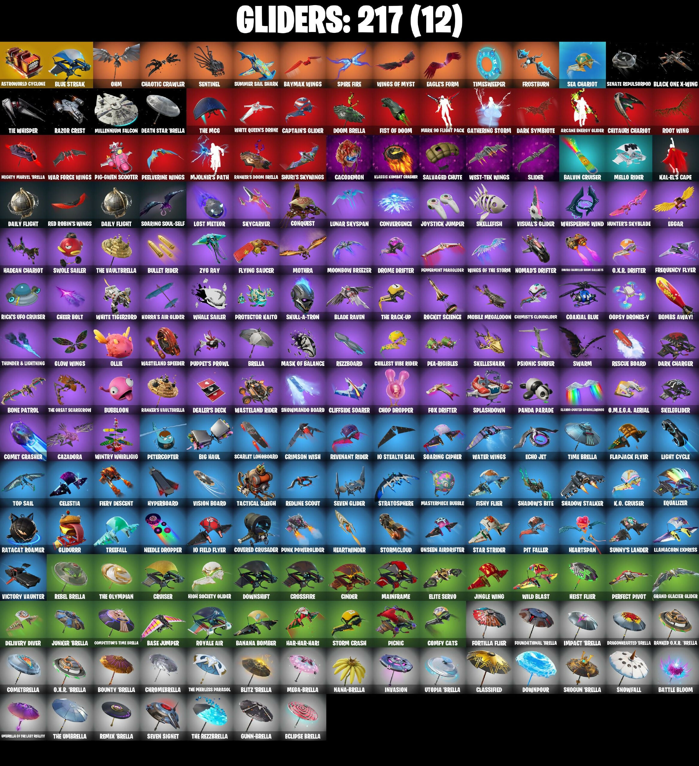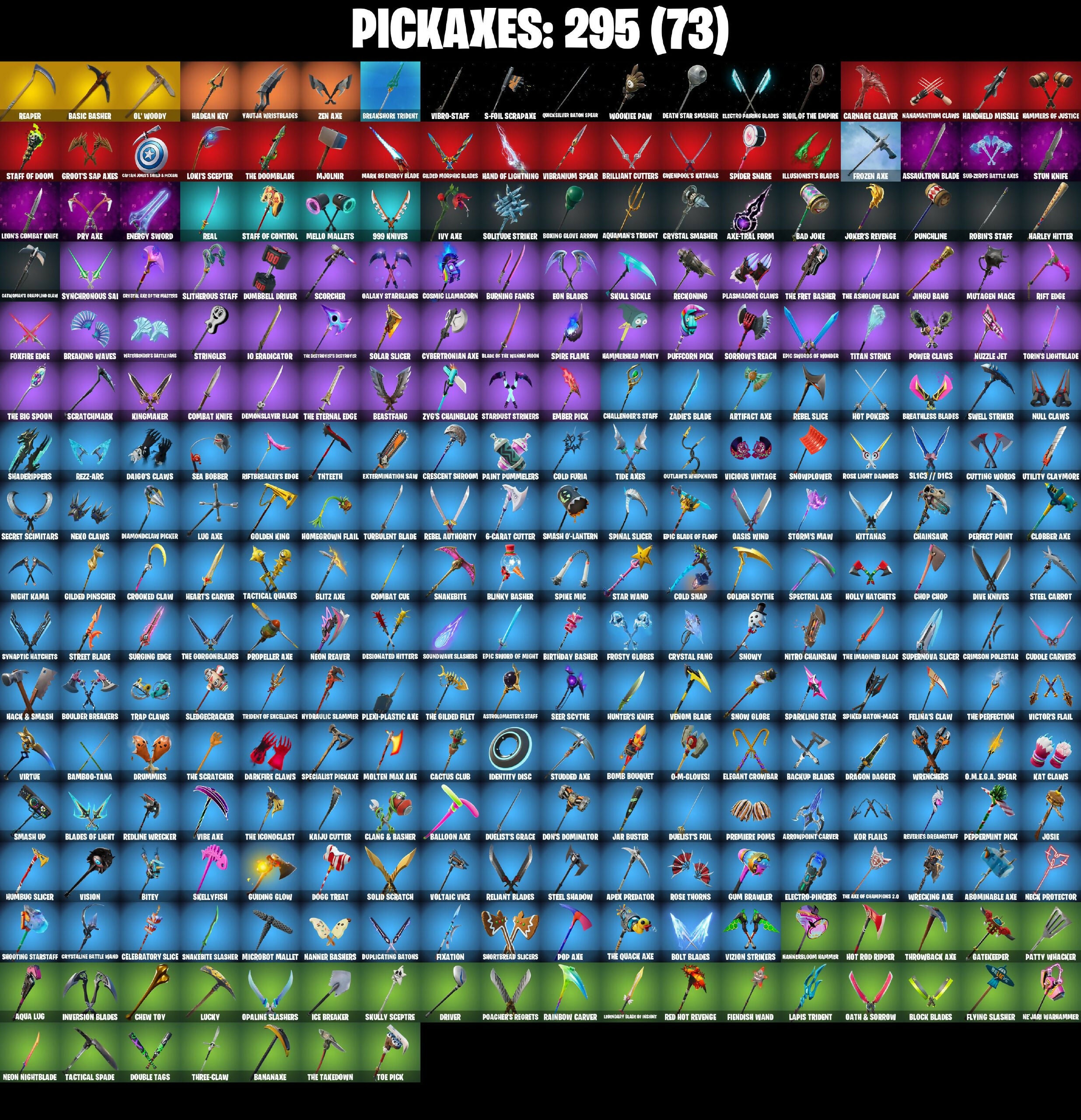 (SNIKT!), 10 Field Flyer, 10 Orchestrator, 10 Stealth Sail, 2020 Zickflip, 4-Keyed Up, 6-Carat Cutter, 8-Ball Janky, 999 Knives, A Goat, A Warrior Prepares, A Weather Balloon, AWF Snap!, Abominable Axe, Access Core, Adira's Battle Flag, Adriana Of The Deep, Advanced Math, Adventure Pack, Agent Jones, Agent Jones (Jump 3D), Agent Patch, Agent Peely, Agent Stones, Agg Ops, Air Shredder, Ako, Alli, Alpha Trophy, Altitude, Alto, Always Tangled003, Amazing Cube, Amplitude, Ancestral Bloom, Ani Konda, Apex Predator, Aphrodite, Apocalypse Shroud, Aqua Lug, Aquaman, Aquaman's Trident, Arcane Energy Glider, Arcane Research, Arctic Adeline, Ark, Ark Wings, Arrowpoint Carver, Arroyo Pack, Artemis, Arthur Curby, Artifact Axe, Ask Me, Aspen, Assassin Pack, Assault Iron Blade, Astra, Astrolomaster's Staff, Astroworld Cyclone, Aube, Augury, Auto Clutch, Avatar Cycle, Avatar's Flourish, Aw, Shucks., Awir Pack, Axe-Tral Form, Azareth Retrospect 2016-2020, B Splat, Back Bloom, Back Board, Back-Alley-Style Tongue, Backstabber, Backup Blades, Bad Joke, Balanced, Balloon Axe, Balls Of Power, Balvin Cruiser, Bamboo, Bamboo Patch, Bamboo-Tana, Banana Bomber, Banana Briefcase, Banana Cabana, Bananaxe, Band Pass, Bandwidth, Baron's Hoard, Base Jumper, Basecamp Bag, Basement Key, Basic Basher, Bat Royale, Batarang-Charged Axe, Battle Balloon, Battle Blessing, Battle Bloom, Battle Bus Balloon, Battle Call, Battle Dame Mae, Battle Gunner, Baymax Wings, Beach Jules, Beach-Bot's Bombs Away, Beachcomber, Beachcomber Jonesy, Bean Bag, Bear Brained, Bear Hug, Beastfang, Bedside Manner, Beep Beep, Benzo The Destroyer, Bernie, Besskar, Big Haul, Bike To Go, Birdarang Flouviash, Birdix, Birthday Basher, Birthday Cake, Bitey, Black One X-Wing, Black Panther (Shora) Masked Scuba Jonesy, Black Queen, Black Stripe, Black Werewolf, Blackened Shield, Blade Raven, Blades Of Light, Blaze, Blazing Fire Cerberus, Blinky, Blinky Basher, Blister Pack, Blitz 'Brella, Blitz Axe, Blitz Wings, Block Blades, Bloomback Sack, Bloomin' Bouquet, Blue Heart, Blue Shift, Blue Streak, Blue Striker, Blue Team Leader, Blustery Bag, Boardwalk Ruby, Boba Bling, Bobo, Bolt, Bolt Blades, Bolt Bomber, Bomb Bouquet, Bombs Away!, Bone Patrol, Boogie Down, Boogy Bag, Boomin', Boosting XI, Boots N' Cats, Boulder Breakers, Bounty ’Brella, Boxing Glove Arrow, Breakfast Bounty, Breaking Point, Breaking Waves, Breakshore Trident, Breathless Blades, Brella, Brettstone Backplate, Brilliant Cutters, Bring It Around, Brite Moves, Brite Raider, Bubbloon, Bullet Rider, Bunny Brawler, Bunsen Backburner, Burn Bright, Burning Fangs, Butter Robot, Buzz Beat, Cacodemon, Cactus Club, Calamity, Calculated, Call Me, Callum Ronnie-Flash, Camo Wear Machine, Caper, Captain Clamerica, Captain Jones, Captain’s Glider, Carbon Fiber Holster, Card Drop, Cardistry, Carnage, Carnage Cleaver, Cash Stash, Cat Flip, Catwoman Zero, Cauldron Chill, Cazadora, Celebratory Slice, Celestia, Cerberus, Chainsaur, Chainstick Pack, Chalked Up T-Ball, Challenger's Staff, Champion Kuno, Championship Aura, Chaos Director, Chaos Double Agent, Chaos Origins, Chaotic Crawler, Charge Pack, Charlotte, Charmer's Coil, Cheer Bag, Cheer Bolt, Cheesy, Chef's Special, Chemist's Cloudglider, Chew Toy, Chicken Wing It, Chigusa, Chillest Vibe Rider, Chitauri Chariot, Choice Knit, Chop Chop, Chop Dropper, Chopper, Chrome Punk, Chromebrella, Chromeseed, Cinder, Clang & Basher, Classic Pellevine, Classic Wolverine, Classified, Clawbox, Clawz Retro, Clean Sweep, Cliffside Soarer, Clix Groove, Clobber Axe, Cloud Striker, Cluck, Cluck (Slurpy), Coaxial Blue, Codsworth's Cleanup, Coin Flip, Cold Furia, Cold Snap, Combat Cue, Combat Knife, Combat Wreath, Comet, Comet Crasher, Cometbrella, Comfy Cats, Competitors Time Brella, Conch Call, Conquest, Controller Crew, Convergence, Cosmic Llamacorn, Count It!, Covered Crusader, Cozy Chomps, Cozy Conch, Crescent Shroom, Crimson Polestar, Crimson Wish, Crocue Pack, Crooked Claw, Crossfire, Crowning Achievement, Cruiser, Crystal, Crystal Fang, Crystal Smasher, Crystal Spirit, Cuddle Bow, Cuddle Carvers, Cuddle Team Leader, Cupid's Arrow, Curling Iron, Cursed Eaglebilled, Cursed Marionette, Cutting Words, Cybertronian Axe, Cyclo Curl, DJ Bop, DJ Pepperoni, DJ Yonder, Daigo, Daigo’s Claws, Daily Flight, Danica, Dark Bag, Dark Bomber, Dark Charger, Dark Symbiote, Darkfire Claws, De With A Smile Bruno, Deadpool, Deadpool's Katanas, Dealer’s Deck, Death Star 'Brella, Death Star Smasher, Deci Ducky, Deep Dive, Deep End, Deep Zzz, Deimos, Delivery Diver, Demon Hunter Roche, Demonslayer Blade, Desionated Hitters, Diamond Diva, Diamond Throne, Diamondclaw Picker, Die With A Smile, Dimensional Gate, Dino Deck, Dire, Dive Knives, Dizzie, Doctor Doom, Doctor Slone, Dogg Treat, Dom's Dominator, Doom, Doom Brella, Doom Chalice, Doom's Cloak, Doom's Cowl, Doom's Domain, Double Agent Hard Case, Double Agent Out, Double Agent Stripe, Double Agent Yush, Double Header, Double Point Wildcard, Double Tags, Doublecross, Downpour, Downshift, Doze Dab, Dragon Dagger, Dragon Daggers Song, Dragon Radar, Dragonhearted Brella, Dramyin, Dreamers Two-Shot, Dreamzy Handbag, Drift, Driftstalker Drift, Drill Conti, Driver, Drome Drifter, Droopy, Drop Dex, Drop The Bass, Drummies, Dry Bag, Duelist's Foil, Duelist's Grace, Dumbbell Driver, Duple-Harte, Duplicates, Duplicating Batons, Dusk, Dusk Knight, Dusk Wings, Dynamo Grav-Suit, Dynamo TNTina, Dynamo TNTina-X, Eagle’s Form, Echo, Echo Jet, Eclipse Brella, Ecoterrest Sugarrager, Eggar, Eggshell, Electric Shredder, Electro Paigno Blades, Electro-Pincers, Elegant Crowbar, Elevation, Elite Servo, Elmira, Elysian Artemis, Ember Pick, Emma Frost, Empress Fan Dance, Endless Scroll, Energized Godzilla, Energy Sword, Envoy, Eon Blades, Epic Blade Of Floof, Epic Sword Of Might, Equalizer, Eren Jager, Errant, Eternal Knight, Eternal Ranker, Eternal Shield, Etherea, Evasive Maneuvers, Expert's Emblem, Expressionism, Extermination Saw, Extra Round, FFC Sparkplug, 