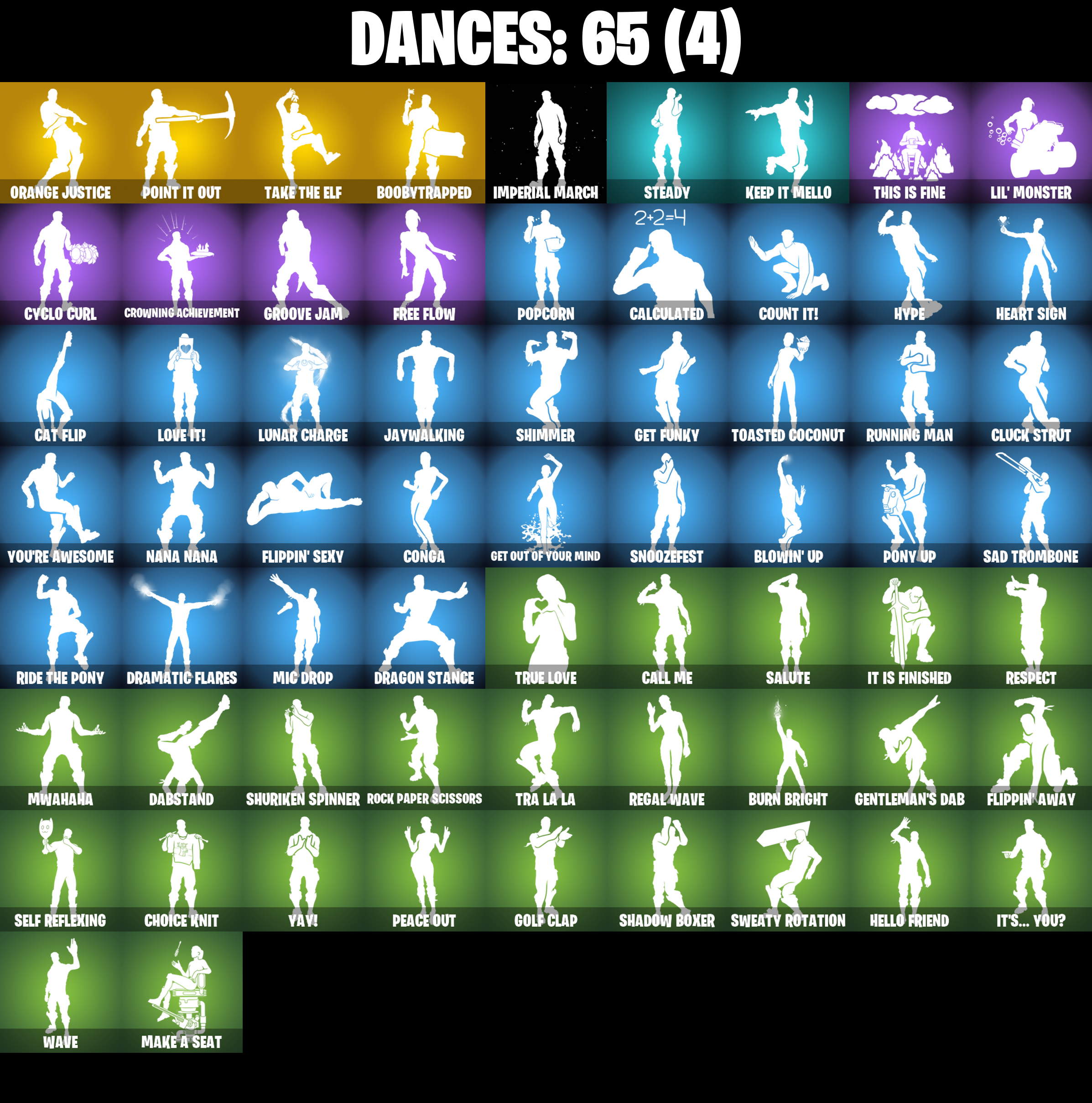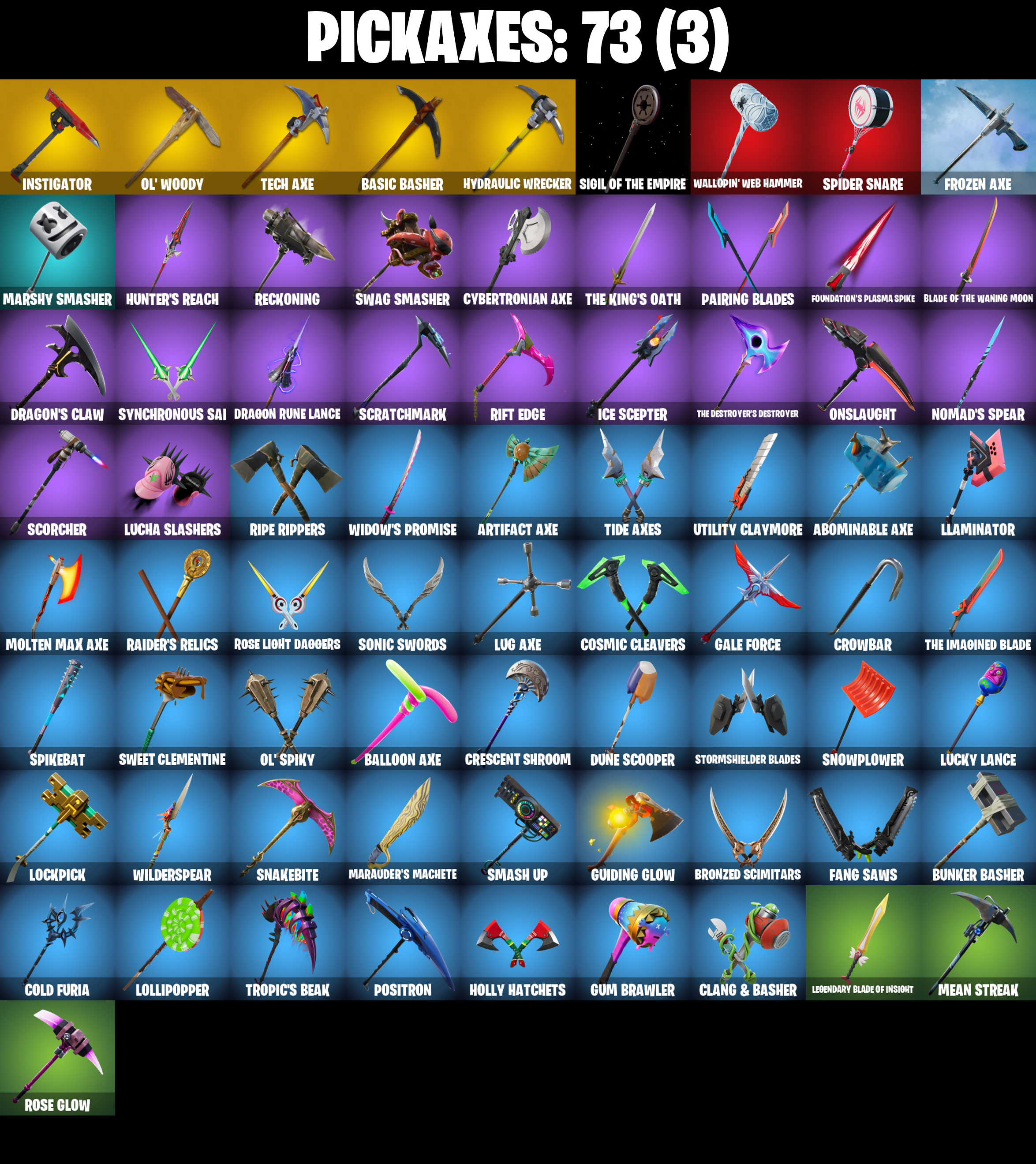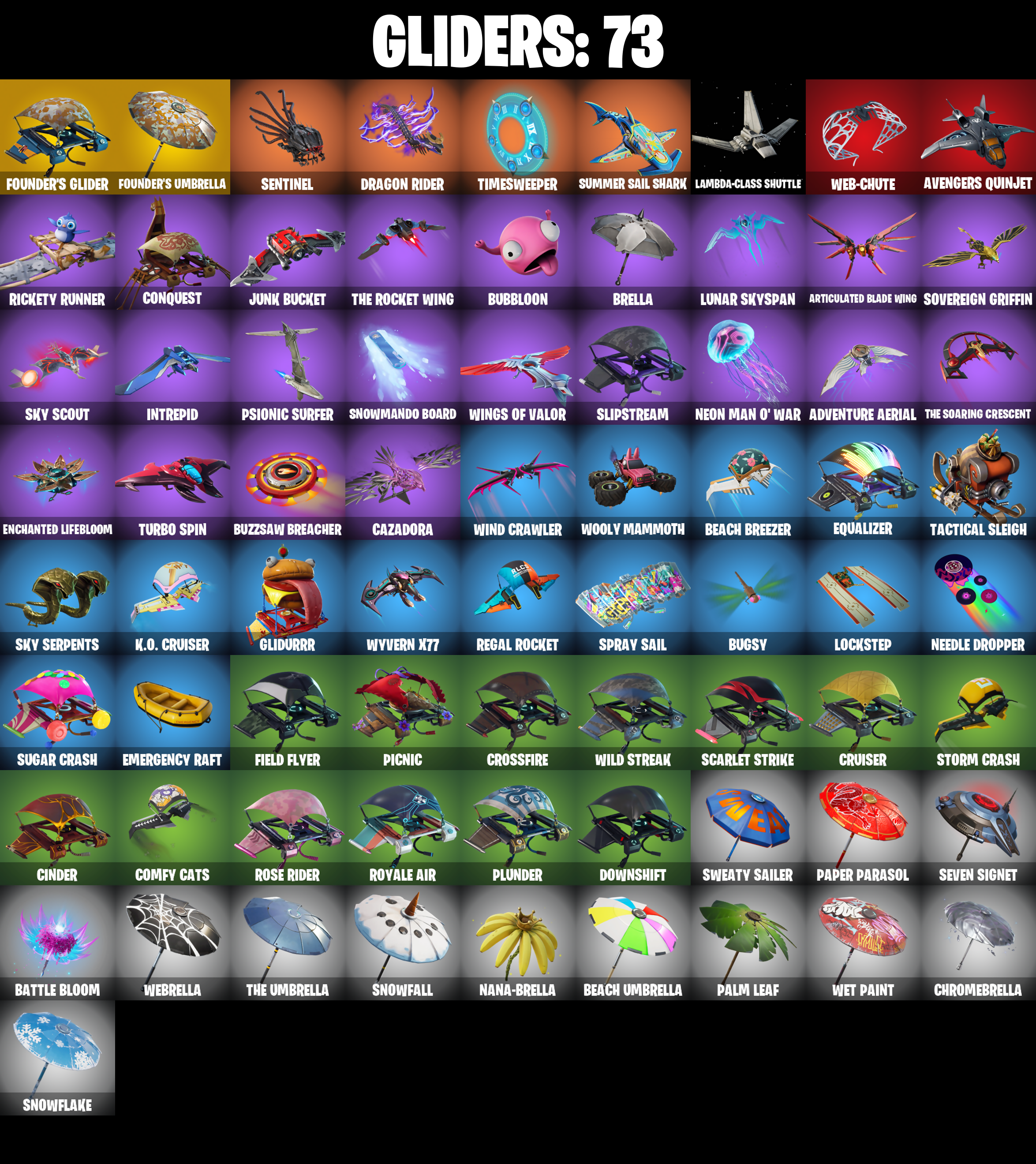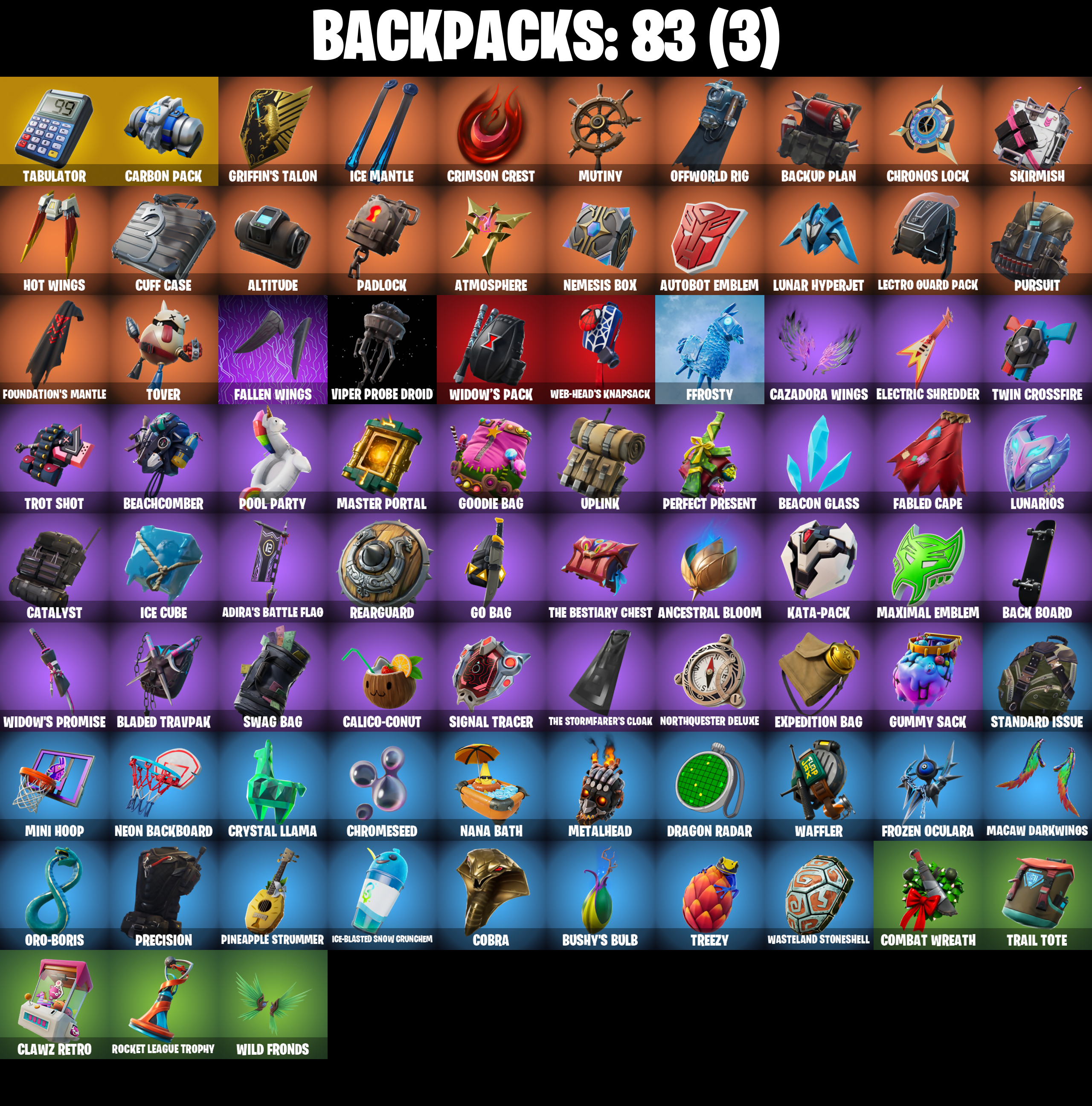 Abominable Axe, Adira (Battle Mask), Adira's Battle Flag, Adventure Aerial, Altitude, Ancestral Bloom, Articulated Blade Wing, Artifact Axe, Atmosphere, Autobot Emblem, Avengers Quinjet, Back Board, Backup Plan, Balloon Axe, Basic Basher, Battle Bloom, Battle-Tested, Beach Breezer, Beach Umbrella, Beachcomber, Beacon Glass, Blackheart (Stage 8), Blade of the Waning Moon, Bladed Travpak, Blowin' Up, Boobytrapped, Brella, Bronzed Scimitars, Bubloon, Bugsy, Bunker Basher, Burn Bright, Bushy's Bulb, Buzzsaw Breacher, Calamity Stage 5, Calculated, Calico-Conut, Call Me, Carbide Armor Stage 5, Carbon Pack, Cat Flip, Catalyst, Cazadora, Cazadora Wings, Choice Knit, Chromebrella, Chromeseed, Chronos Lock, Cinder, Clang & Basher, Clawz Retro, Cluck Strut, Cobra, Cold Furia, Combat Wreath, Comfy Cats, Conga, Conquest, Cosmic Cleavers, Count It!, Crescent Shroom, Crimson Crest, Crossfire, Crowbar, Crowning Achievement, Cruiser, Crystal Llama, Cuff Case, Cybertronian Axe, Cyclo Curl, Dabstand, Downshift, Dragon Radar, Dragon Rider, Dragon Rune Lance, Dragon Stance, Dragon's Claw, Dramatic Flares, Drift Stage 5, Dune Scooper, Electric Shredder, Emergency Raft, Enchanted Lifebloom, Equalizer, Evie (Summer Strider), Expedition Bag, Fabled Cape, Fallen Wings, Fang Saws, Ffrosty, Field Flyer, Flippin' Away, Flippin' Sexy, Foundation's Mantle, Foundation's Plasma Spike, Founder's Glider, Founder's Umbrella, Free Flow, Frozen Axe, Frozen Oculata, Gale Force, Gentleman's Dab, Get Funky, Get Out Of Your Mind, Glidurrr, Go Bag, Golf Clap, Goodie Bag, Griffin's Talon, Groove Jam, Guiding Glow, Gum Brawler, Gumbo (Sour), Gummy Sack, Harlowe (Helmet), Haven (Tropical Chirper), Heart Sign, Hello Friend, Holly Hatchets, Hot Wings, Hunter's Reach, Hybrid (Stage 4), Hydraulic Wrecker, Hype, Ice Cube, Ice King (Gold), Ice Mantle, Ice Scepter, Ice-Blasted Snow Crunchem, Iconic Era, Imperial March, Indiana Jones (Temple Explorer), Instigator, Intrepid, It Is Finished, It's... You?, Jaywalking, Junk Bucket, K.O. Cruiser, Kata-Pack, Keep It Mello, Lambda-Class Shuttle, Lectro Guard Pack, Legendary Blade of Insight, Lil' Monster, Llaminator, Lockpick, Lockstep, Lollipopper, Lorenzo The Reckless, Love It!, Lt. John Llama (Oiled Reality), Lucha Slashers, Lucky Lance, Lug Axe, Lunar Charge, Lunar Hyperjet, Lunar Skyspan, Lunarios, Lynx (Stage 4 - No Ponytail), Macaw Darkwings, Make A Seat, Malik (Solitary Defender), Marauder's Machete, Marshy Smasher, Master Portal, Maximal Emblem, Mean Streak, Metalhead, Mic Drop, Mini Hoop, Molten Max Axe, Mutiny, Mwahaha, Nana Bath, Nana Nana, Nana-Brella, Needle Dropper, Nemesis Box, Neon Backboard, Neon Man O' War, Nomad's Spear, Northquester Deluxe, Offworld Rig, Ol' Spiky, Ol' Woody, Onesie (Winter), Onslaught, Orange Justice, Oro-Boris, Padlock, Pairing Blades, Palm Leaf, Paper Parasol, Peace Out, Perfect Present, Picnic, Pineapple Strummer, Plunder, Point It Out, Pony Up, Pool Party, Popcorn, Positron, Powder (White), Precision, Psionic Surfer, Pursuit, Raider's Relics, Rearguard, Reckoning, Regal Rocket, Regal Wave, Respect, Rickety Runner, Ride The Pony, Rift Edge, Ripe Rippers, Rock Paper Scissors, Rocket League Trophy, Ronin (Cape), Rose Glow, Rose Light Daggers, Rose Rider, Rox (Stage 5), Royale Air, Running Man, Sabina (Ponytail), Sad Trombone, Salute, Scarlet Strike, Scorcher, Scratchmark, Self Reflexing, Sentinel, Seven Signet, Sgt. Winter Headgear, Shadow Boxer, Shanta (Headpiece), Shimmer, Shuriken Spinner, Sidewinder (Dark), Sigil of the Empire, Signal Tracer, Skirmish, Sky Scout, Sky Serpents, Slipstream, Smash Up, Snakebite, Snap (Kalamadness), Snoozefest, Snowfall, Snowflake, Snowmando Board, Snowplower, Sonic Swords, Sovereign Griffin, Spider Snare, Spider-Man (Oiled Reality), Spikebat, Spray Sail, Stage 4, Standard Issue, Steady, Storm Crash, Stormfarer (Storm Brawler), Stormshielder Blades, Sugar Crash, Summer Sail Shark, Swag Bag, Swag Smasher, Sweaty Rotation, Sweaty Sailer, Sweet Clementine, Synchronous Sai, Tabulator, Tactical Sleigh, Take The Elf, Tech Axe, The Bestiary Chest, The Destroyer's Destroyer, The Foundation (Helmet Off), The Imagined Blade, The King's Oath, The Rocket Wing, The Soaring Crescent, The Stormfarer's Cloak, The Umbrella, This Is Fine, Tide Axes, Tilted Teknique (Hoodie), Timesweeper, Toasted Coconut, Tover, Tra La La, Trail Tote, Treezy, Trog (Tribal), Tropic's Beak, Trot Shot, True Love, Turbo Spin, Twin Crossfire, Uplink, Utility Claymore, Viper Probe Droid, Waffler, Wallopin' Web Hammer, Wasteland Stoneshell, Wave, Web-Chute, Web-Head's Knapsack, Webrella, Wet Paint, Widow's Pack, Widow's Promise, Wild Fronds, Wild Streak, Wilderspear, Wind Crawler, Wings Of Valor, Wooly Mammoth, Wyvern X77, Yay!, You're Awesome, Zenith (Stage 4)