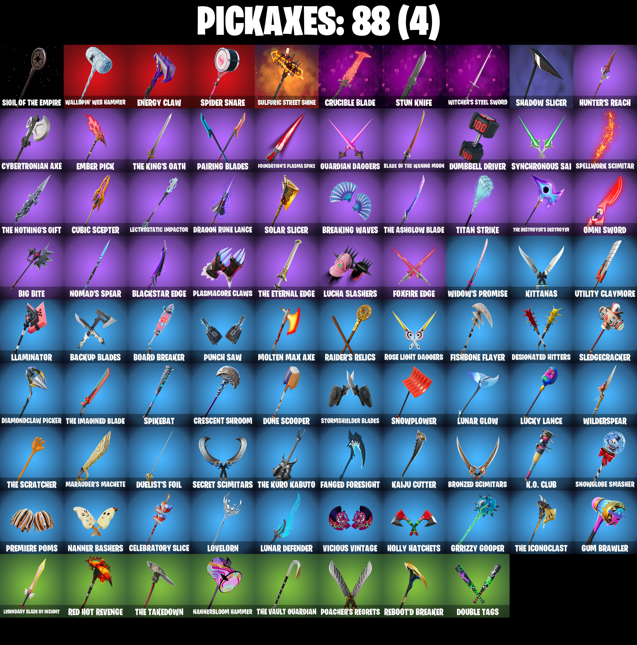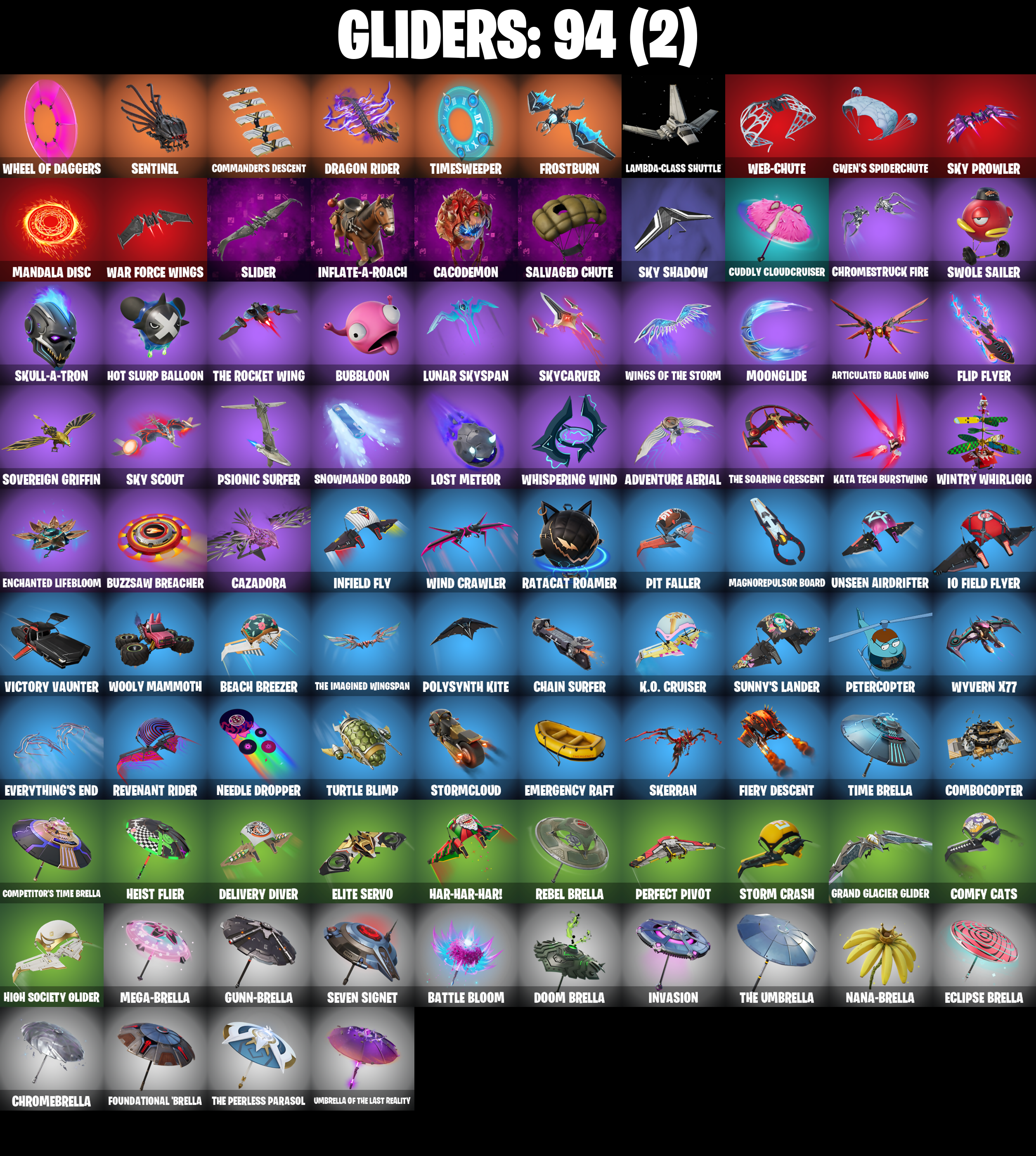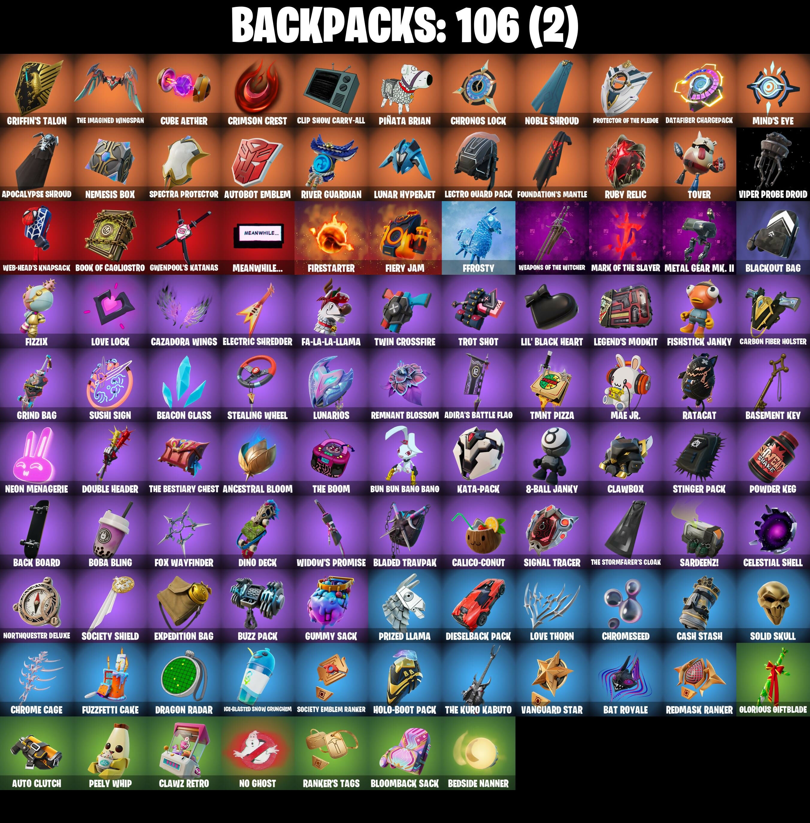 8-Ball Janky, Adira, Adira (Battle Mask), Adira's Battle Flag, Adventure Aerial, Ancestral Bloom, Apocalypse Shroud, Arachrobatics, Arctic Adeline, Articulated Blade Wing, Ascension Nezumi, Astro Armor, Auto Clutch, Autobot Emblem, Axion Sentinel, Axion Sentinel (Charged), B.R.U.T.E. Gunner, Back Board, Backup Blades, Balance Board, Basement Key, Bat Royale, Battle Bloom, Battle-Tested, Beach Breezer, Beacon Glass, Bedside Nanner, Big Bite, Big Fan, Blackout Bag, Blackstar Edge, Blade Of The Waning Moon, Bladed Travpak, Blaze, Blizzabelle, Bloomback Sack, Blowin' Up, Board Breaker, Boba Bling, Boba Snack, Boogie Down, Book of Caoliostro, Boosting Ki, Breaking Waves, Bring It Around, Bronzed Scimitars, Bubbloon, Bullpen Brawler Dusty, Bun Bun Bang Bang, Burning Ambition Valeria, Buzz Pack, Buzzsaw Breacher, Bytes, Bytes (Lone Traveler), Cacodemon, Calico-Conut, Called Shot, Carbon Fiber Holster, Card Drop, Cash Stash, Cazadora, Cazadora Wings, Celebratory Slice, Celestial Shell, Chain Surfer, Chef's Special, Choice Knit, Chrome Cage, Chrome Punk, Chromebrella, Chromeseed, Chromestruck Fire, Chronos Lock, Clawbox, Clawz Retro, Clean Sweep, Clip Show Carry-All, Club President Helsie, Cold Blooded Ace (Cold Blooded Ace), Combocopter, Comfy Cats, Commander's Descent, Competitor's Time Brella, Conjure Weapon, Count It!, Crescent Shroom, Crimson Crest, Crowning Achievement, Crucible Blade, Crystal, Cube Aether, Cubic Scepter, Cuddly Cloudcruiser, Curling Iron, Cybertronian Axe, Cyclo Curl, Dagger Dance, Darth Vader, Datafiber Chargepack, Dawn Duelist Nisha, Delivery Diver, Designated Hitters, Diamond Throne, Diamondclaw Picker, Dieselback Pack, Dino Deck, Dirtbike Challenge, Doctor Strange, Doctor Strange (Stealth Silver), Doom Brella, Doom Slayer, Double Header, Double Tags, Doze Dab, Dragon Radar, Dragon Rider, Dragoon Rune Lance, Dramatic Flares, Duelist's Foil, Dumbbell Driver, Dune Scooper, Dusty, Eclipse Brella, Electric Shredder, Elite Servo, Ember Pick, Emergency Raft, Empress Fan Dance, Enchanted Lifebloom, Energy Claw, Era, Eren Jaeger, Erisa, Erisa (Stealth Silver), Everything's End, Evie, Evie (Summer Strider), Expedition Bag, Expressionism, Fa-La-La-Llama, Fancy Peter Griffin, Fang Dance, Fanged Foresight, Ffrosty, Fiery Descent, Fiery Jam, Firestarter, Fishbone Flayer, Fishstick Janky, Fizzix, Flip Flyer, Foil Flex, Foundation's Mantle, Foundation's Plasma Spike, Foundational 'Brella, Fox Wayfinder, Foxfire Edge, Frostburn, Fuzzetti Cake, Geralt Of Rivia, Get Out Of Your Mind, Gold Blooded Ace, Good Guy, Grand Glacier Glider, Griffin's Talon, Grind Bag, Grizzy Gooper, Grriz, Guardian Daggers, Guff Gringle, Gum Brawler, Gumbo, Gumbo (Sour), Gummy Sack, Gunn-Brella, Gunnar, Gunnar (Stealth Silver), Gwen's Spiderchute, Gwenpool's Katanas, Har-Har-Har!, Harlowe, Harlowe (Helmet), Haven, Haven (Tropical Chirper), Heart Of A King, Heart Sign, Heist Flier, Helsie, High Society Glider, Highwire, Holiday Boxy, Holly Hatchets, Holo-Boot Pack, Hope, Hot Slurp Balloon, Hunter's Reach, Hypnot-Eyes, I Need You To Concentrate, I'm A Mystery, IO Field Flyer, Ice-Blasted Snow Crunchem, Iconic Era, Igni Sign, Imani, Imperial March, Indiana Jones, Infield Fly, Inflate-A-Roach, Invasion, It Is Finished, It's... You?, K.O. Club, K.O. Cruiser, KaTa Tech Burstwing, Kaiju Cutter, Kata-Pack, Kiara K.O., Kiara K.O. (Captain's Bomber), Kittanas, Knife Sharpener, Krisabelle, Lambda-Class Shuttle, Laser Focused, Lectro Guard Pack, Lectrostatic Impactor, Legend's Modkit, Legendary Blade Of Insight, Lennox Rose, Lil' Black Heart, Lil' Monster, Lil' Prancer, Llaminator, Lorenzo, Lorenzo The Reckless, Lost Meteor, Love It!, Love Lock, Love Thorn, Lovelorn, Lt. John Llama, Lt. John Llama (Oiled Reality), Lucha Slashers, Lucky Lance, Lunar Charge, Lunar Defender, Lunar Glow, Lunar Hyperjet, Lunar Party, Lunar Skyspan, Lunarios, Mae Jr., Magmatic Mizuki, MagnoRepulsor Board, Make A Seat, Malik, Malik (Solitary Defender), Mandala Disc, Marauder's Machete, Mariposa, Mark of the Slayer, Massai, Meanwhile..., Mega Wave Imani, Mega Wave Thunder, Mega-Brella, Meow Skulls, Metal Gear Mk. II, Mind's Eye, Mini Slayer Fistbump, Mizuki, Molten Max Axe, Montague, Moonglide, Mwahaha, Mystica, Nailed It, Nana-Brella, Nanner Bashers, Nanner Ringer, Nannerbloom Hammer, Needle Dropper, Nemesis Box, Neon Menagerie, Nezumi, Ninja Stance: Donnie, Ninja Stance: Leo, Ninja Stance: Mikey, Ninja Stance: Raph, Nisha, No Ghost, Noble Shroud, Nomad's Spear, Northquester Deluxe, Olorious Giftblade, Omg I Love It, Omni Sword, Optimus Prime, Orriz (Wild Beary Orriz), Oscar, Pairing Blades, Paradigm (Aurelian), Paradigm (Reality-659), Peely Whip, Perfect Pivot, Peter Griffin, Petercopter, Pinata Brian, Pit Faller, Plasmacore Claws, Poacher's Regrets, Polar Peely, Polysynth Kite, Powder Keg, Premiere Poms, Prized Llama, Protector of the Pledge, Prowler, Psionic Surfer, Punch Saw, Purradise Meowscles, Raider's Relics, Ranker's Tags, Ratacat, Ratacat Roamer, Rebel Brella, Reboot'd Breaker, Red Hot Revenge, Redmask Ranker, Regal Hunter Mariposa, Regal Hunter Relik, Regal Hunter Rian, Regal Hunter Trace, Relik, Remnant Blossom, Renzo The Destroyer, Revenant Rider, Rian, River Guardian, Rococo Cloak-O, Ronin, Ronin (Cape), Rose Light Daggers, Rough Cut Montague, Ruby Relic, Ruby Shadows, Runway Racer, Sabina, Sabina (Ponytail), Salvaged Chute, Sardeenz!, Scout Regiment Salute, Secret Scimitars, Segway Tour, Selene, Self Reflexing, Sentinel, Seven Signet, Shadow Slicer, Shanta, Shanta (Headpiece), Shock Brawler Oscar, Shuriken Spinner, Sigil Of The Empire, Signal Tracer, Skerran, Skull-A-Tron, Sky Prowler, Sky Scout, Sky Shadow, Skycarver, Sled Ready Guff, Sledgecracker, Slider, Snap, Snowglobe Smasher, Snowmando Board, Snowplower, Society Emblem Ranker, Society Shield, Solar Slicer, Solid Skull, Solid Snake, Sovereign Griffin, Spectra Protector, Spellwork Scimitar, Spider Snare, Spider-Gwen, Spider-Gwen (Gwen Stacy), Spider-Man, Spider-Man (Oiled Reali