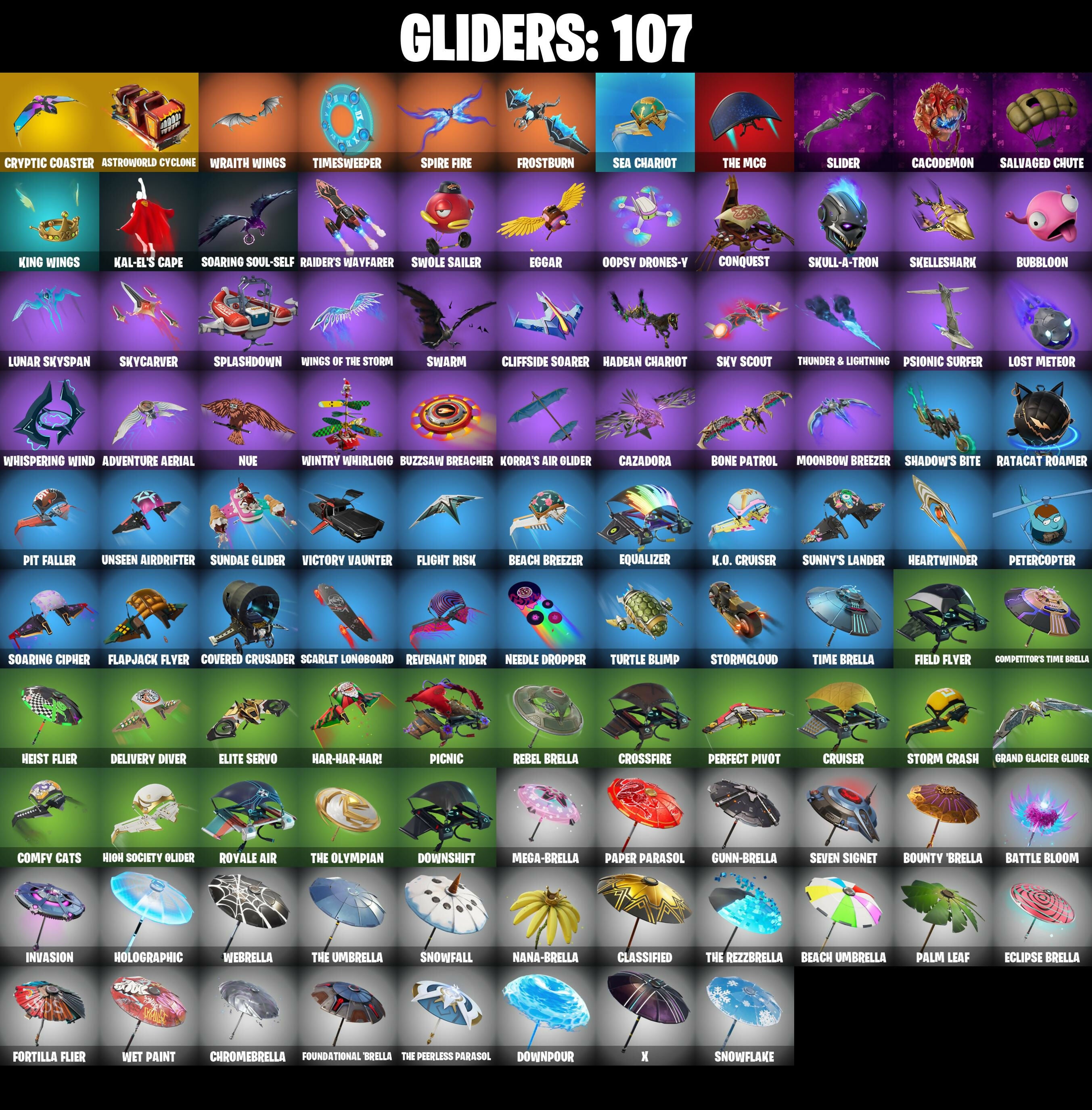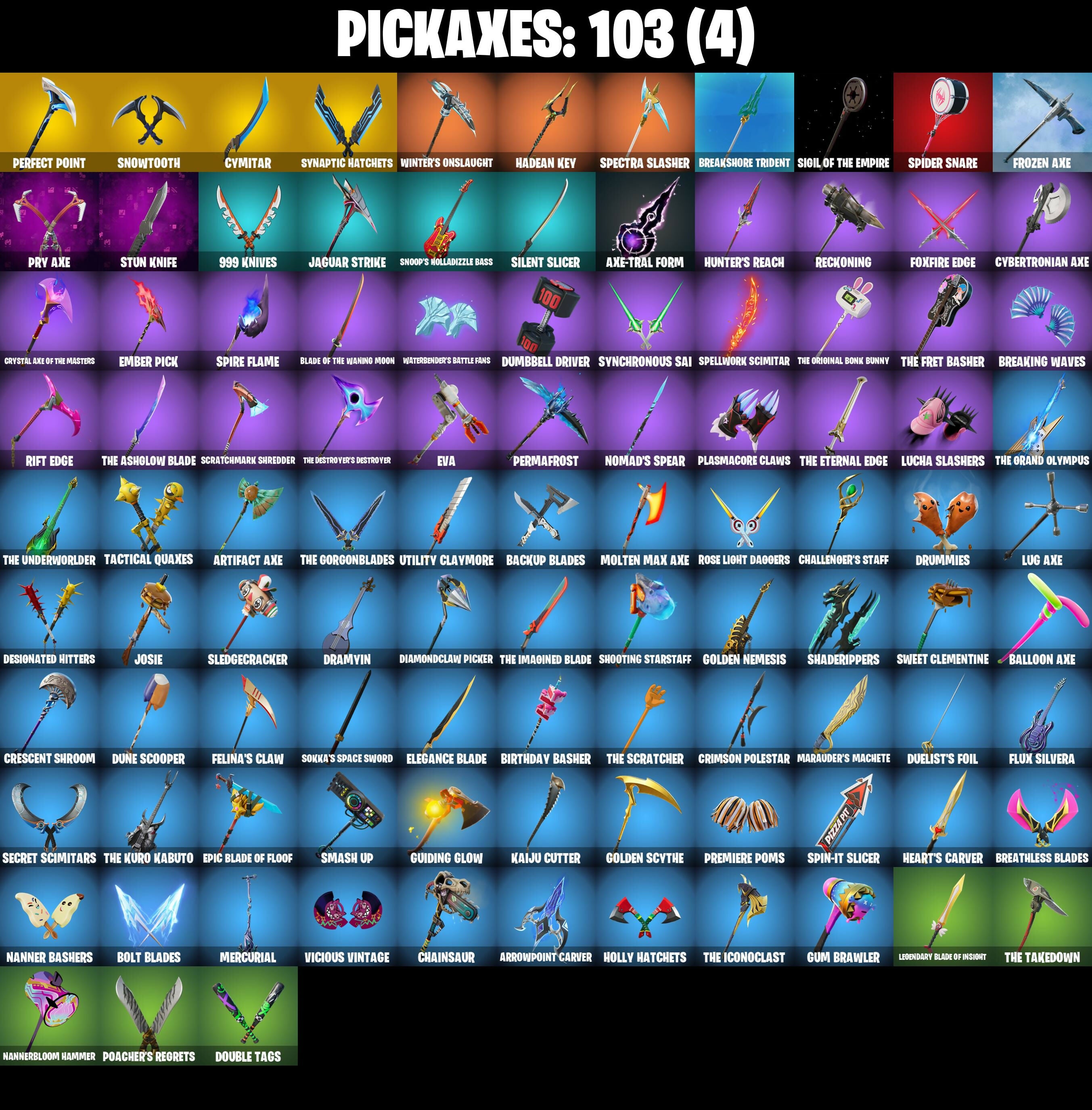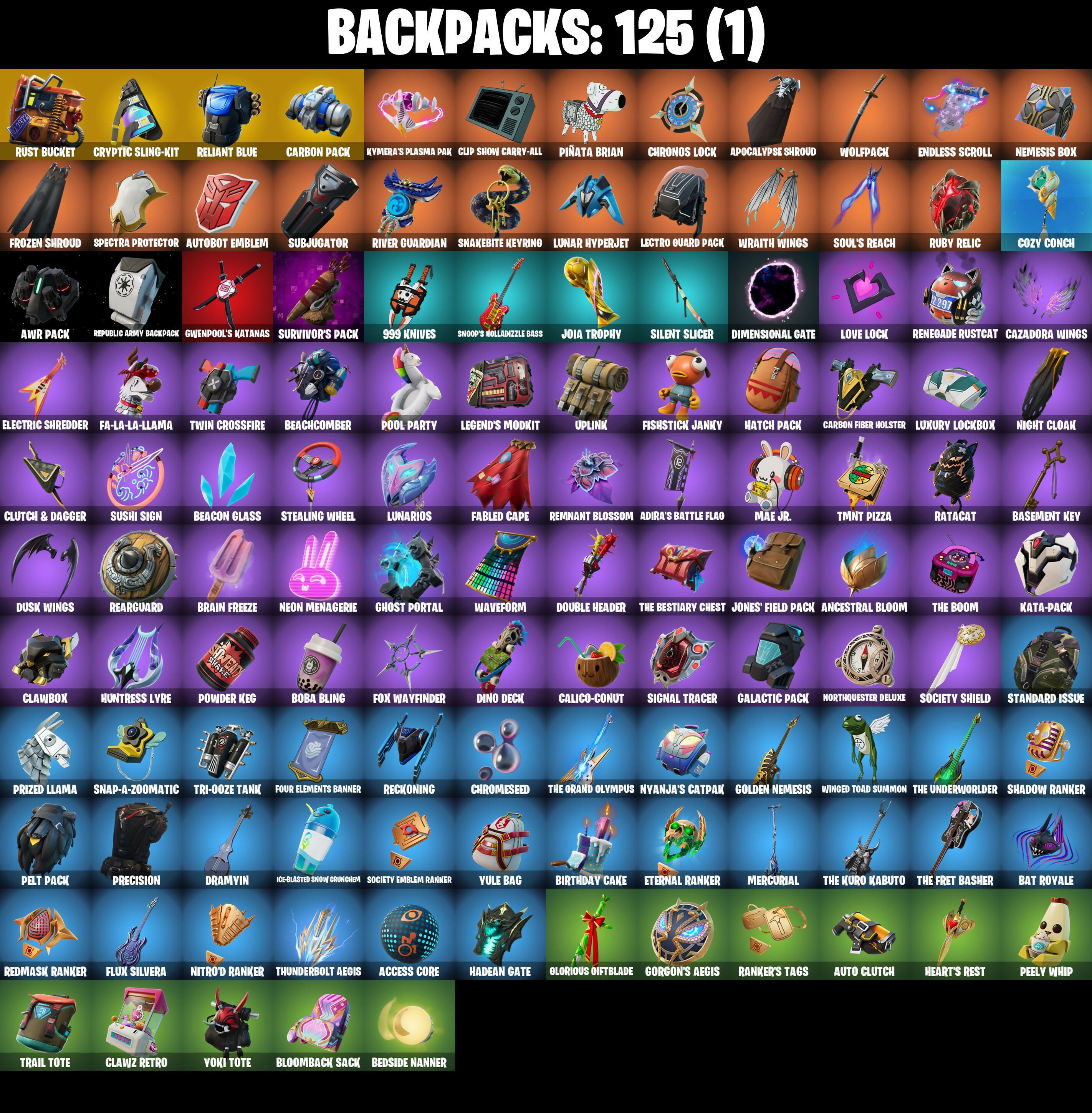 999 Knives, AWR Pack, Access Core, Adira's Battle Flag, Adventure Aerial, Agent Jones, Agent Jones (Jump 31), Ancestral Bloom, Antonia, Aphrodite, Apocalypse Shroud, Arctic Adeline, Arrowpoint Carver, Artemis, Artifact Axe, Astroworld Cyclone, Aura, Auto Clutch, Autobot Emblem, Avatar's Flourish, Axe-Tral Form, Azarath Metron Zinthos!, Backup Blades, Balanced, Balloon Axe, Basement Key, Bat Royale, Battle Bloom, Battle-Tested, Beach Breezer, Beach Umbrella, Beachcomber, Beacon Glass, Bean Bag, Beatzbunny, Bedside Nanner, Big Fan, Birthday Basher, Birthday Cake, Black Werewolf, Blade of the Waning Moon, Blazing Fire Cerberus, Bloomback Sack, Boba Bling, Bolt Blades, Bone Patrol, Boogie Down, Boots 'n' Cats, Bounty 'Brella, Brain Freeze, Breakdown, Breaking Waves, Breakshore Trident, Breathless Blades, Bubbloon, Burning Ambition Valeria, Buzzsaw Breacher, Cacodemon, Calamity, Calamity Stage 5, Calculated, Calico-Conut, Call Me, Carbon Commando, Carbon Fiber Holster, Carbon Pack, Card Drop, Cardistry, Cazadora, Cazadora Wings, Cerberus, Chainsaur, Challenger's Staff, Chef's Special, Chrome Punk, Chromebrella, Chromeseed, Chronos Lock, Classified, Clawbox, Clawz Retro, Clean Sweep, Cliffside Soarer, Clip Show Carry-All, Cluck, Cluck (Slurpy), Clutch & Dagger, Collector Kado Thorne, Comfy Cats, Competitor's Time Brella, Conch Call, Conquest, Count It!, Covered Crusader, Cozy Conch, Crack It, Crescent Shroom, Crimson Polestar, Crossfire, Crowning Achievement, Cruiser, Cryptic Coaster, Cryptic Sling-Kit, Crystal Axe of the Masters, Curling Iron, Cybertronian Axe, Cyclo Curl, Cymitar, Dagger Dance, Dawn Duelist Nisha, Delivery Diver, Designated Hitters, Diamond Throne, Diamondclaw Picker, Dice Roll, Dimensional Gate, Dino Deck, Dire, Dj Yonder, Do The Split, Double Header, Double Tags, Downpour, Downshift, Doze Dab, Dramatic Flares, Dramyin, Drift, Drift Stage 5, Drummies, Duelist's Foil, Dumbbell Driver, Dune Scooper, Dusk, Dusk Wings, EVA, Eclipse Brella, Eggar, Electric Shredder, Elegance Blade, Elite Servo, Ember Pick, Empress Fan Dance, Endless Scroll, Enforcer, Epic Blade of Floof, Equalizer, Era, Eternal Ranker, Evasive Maneuvers, Expressionism, Fa-La-La-Llama, Fable, Fabled Cape, Face Palm, Fancy Peter Griffin, Felina, Felina's Claw, Field Flyer, Finger Wag, Fish Thicc, Fishstick Janky, Fixer, Flaky Feast, Flamenco, Flapjack Flyer, Flashback Breakdown, Flight Risk, Flippin' Away, Flux Silvera, Focused, Foil Flex, Fortilla Flier, Foundational 'Brella, Four Elements Banner, Fox Wayfinder, Foxfire Edge, Frostburn, Frozen Axe, Frozen Shroud, Galactic Pack, Gentleman's Dab, Get Griddy, Get Out Of Your Mind, Ghost Portal, Giddy-Up, Glorious Giftblade, Golden Nemesis, Golden Scythe, Golf Clap, Good Game, Well Played, Gorgon's Aegis, Grand Glacier Glider, Guiding Glow, Gum Brawler, Gunn-Brella, Gwenpool's Katanas, Hadean Chariot, Hadean Gate, Hadean Key, Hades, Hang Loose, Har-Har-Har!, Harbinger Armor Omegarok, Hatch Pack, Heart Sign, Heart's Carver, Heart's Rest, Heartburst, Heartwinder, Heist Flier, Hello Friend, High Society Glider, Highwire, Holiday Boxy, Holly Hatchets, Holographic, Hope, Hot Marat, Hunter's Reach, Huntress, Huntress Lyre, Hypnot-Eyes, I'm A Mystery, Ice-Blasted Snow Crunch, Iconic Era, Imani, Immortal Form, Imperial March, Invasion, It Is Finished, It's Go Time!, It's... You?, Jaguar Strike, Joia Trophy, Jones' Field Pack, Josie, Jubilation, K.O. Cruiser, Kado Thorne, Kaiju Cutter, Kal-El's Cape, Kata-Pack, Khaby Lame, King Wings, Knife Sharpener, Korra, Korra's Air Glider, Kymera, Kymera's Plasma Pak, Lara Croft, Lectro Guard Pack, Legend's Modkit, Legendary Blade of Insight, Lil Split, Lil T-6 Shuttle, Lil' Longboat, Lil' Prancer, Lil' Saucer, Llama Bell, Lorenzo, Lorenzo The Reckless, Lost Meteor, Love It!, Love Lock, Lucha Slashers, Lug Axe, Lunar Hyperjet, Lunar Skyspan, Lunarios, Luxury Lockbox, Mae, Mae Jr., Magmatic Mizuki, Magmatic Poseidon, Make A Seat, Marauder's Machete, Mariposa, Medusa, Mega-Brella, Mercurial, Mizuki, Molten Max Axe, Montague, Moonbow Breezer, Moonlit Mystery, My Cabbages!, Mystica, Nana-Brella, Nanner Bashers, Nannerbloom Hammer, Needle Dropper, Nemesis Box, Neon Menagerie, Neymar Jr, Night Cloak, Nightshade, Ninja Stance: Donnie, Ninja Stance: Leo, Ninja Stance: Mikey, Ninja Stance: Raph, Nisha, Nitro'd Ranker, Nolan Chance, Nomad's Spear, Northquester Deluxe, Nue, Nyanja's Catpak, Omegarok, Oopsy Drones-V, Optimus Prime, Orange Justice, Oscar, Palm Leaf, Paper Parasol, Peely Whip, Pelt Pack, Perfect Pivot, Perfect Point, Permafrost, Peter Griffin, Petercopter, Phew!, Picnic, Piper Pace, Pit Faller, Pitycycle, Piñata Brian, Plasmacore Claws, Poacher's Regrets, Point & Shoot, Pony Up, Pool Party, Popular Vibe, Poseidon, Powder Keg, Precision, Premiere Poms, Prized Llama, Pry Axe, Psionic Surfer, Punched Up, Purradise Meowscles, Ragnarok, Raider's Wayfarer, Ranker's Tags, Raonarok (No Shoulder Pad), Ratacat, Ratacat Roamer, Raz, Rearguard, Rebel Brella, Rebirth Raven, Reckoning, Redline, Redmask Ranker, Reef Cake Fish Thicc, Regal Wave, Reliant Blue, Relik, Remnant Blossom, Renegade Lynx, Renegade Rustcat, Renzo The Destroyer, Republic Army Backpack, Respect The Peace, Revel, Revenant Rider, Rian, Ride The Pony, Rift Edge, River Guardian, Rocket Spinner, Rococo Cloak-O, Rook, Rose Light Daggers, Rough Cut Montague, Royale Air, Ruby Relic, Running Man, Runway Racer, Rust Bucket, Salute, Salvaged Chute, Scarlet Longboard, Scout Regiment Salute, Scratchmark Shredder, Sea Chariot, Secret Scimitars, Serpentine Summoning, Seven Signet, Shadebox, Shaderippers, Shadow Play: Toad, Shadow Ranker, Shadow's Bite, Shock Brawler Oscar, Shooting Starsstaff, Show 'Em Off, Sigil of the Empire, Signal Tracer, Silent Slicer, Ska-Stra-Terrestrial, Skelleshark, Skull Trooper, Skull-A-Tron, Sky Scout, Skycarver, Slayer Juice Wrld, Sled Ready Guff, Sledgecracker, Sledgehammer, Slider, Slitherin', Smash Up, Snakebite Keyring, Snap-A-Zoomatic, Snoop's Holladazzle B