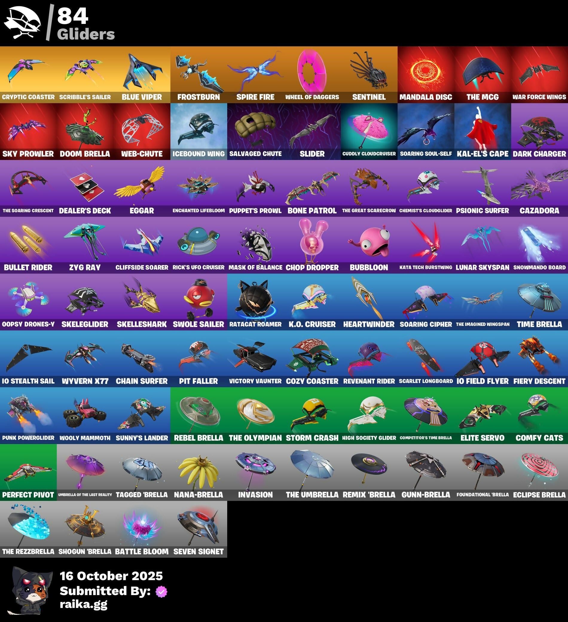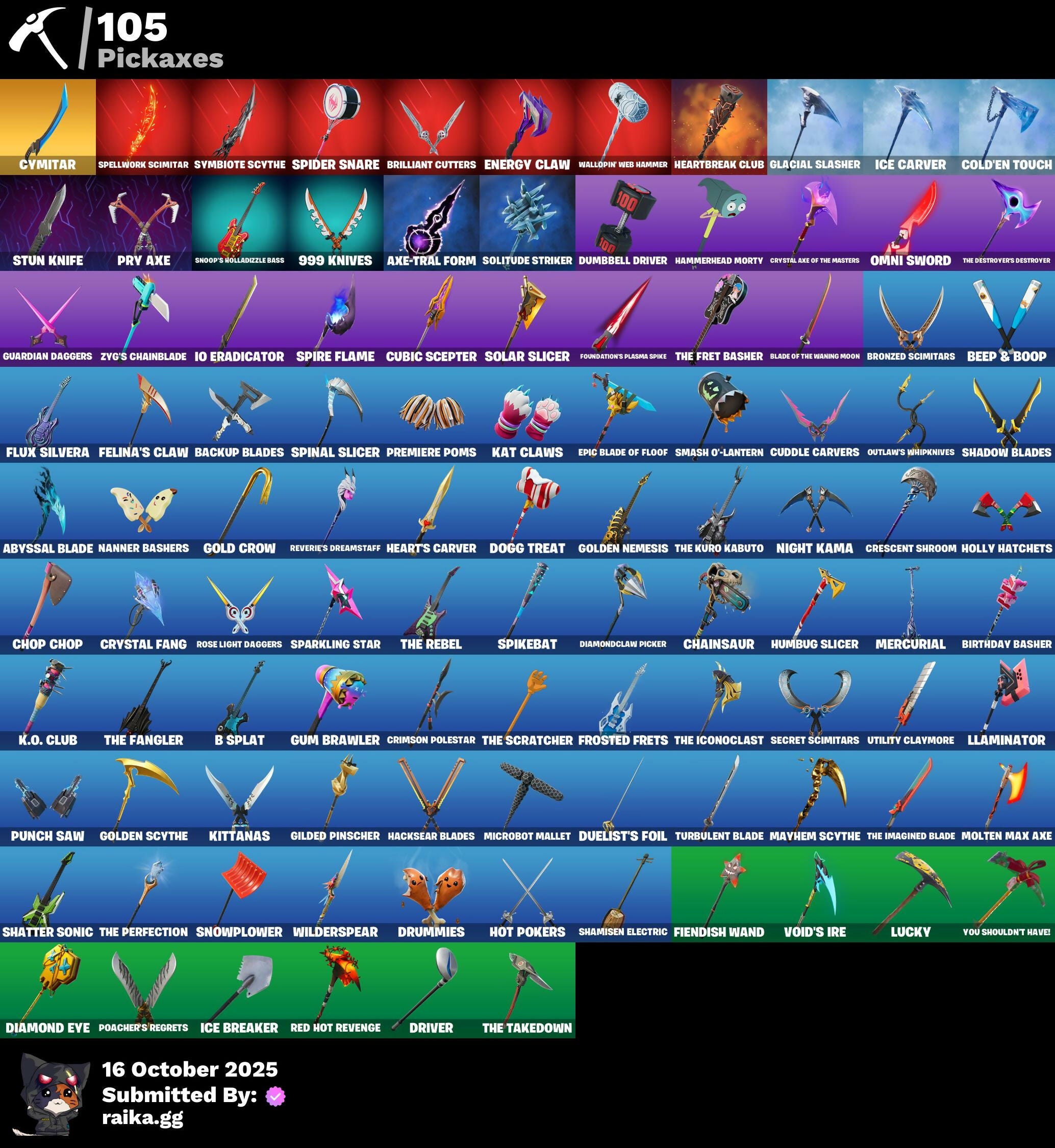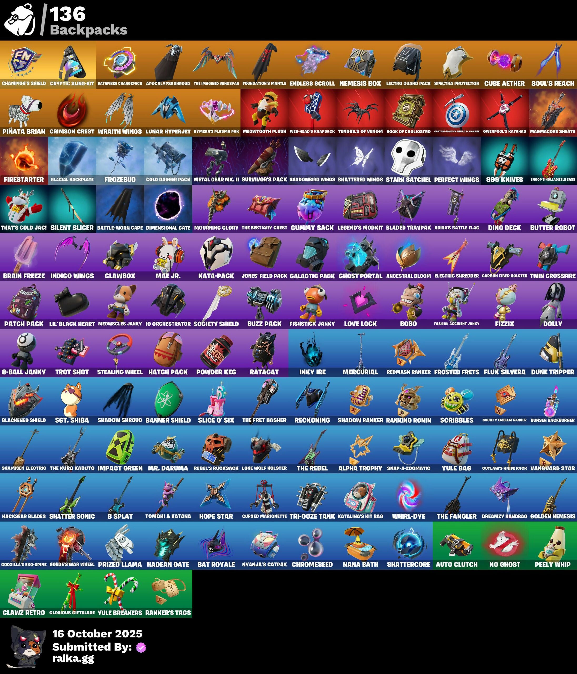 10 Orchestrator, 2.0's Revenge, 2022, 8-Ball Janky, 999 Knives, Abduction, Absenz, Abyssal Blade, Acolyte's Curse, Adira's Armor, Adira's Battle Flag, Aerial Classic, Aerial Swagger, Agent Jones, Agent Jones (Jump 31), Alpha Trophy, Ancestral Bloom, Apocalypse Shroud, Array, Aura, Auto Clutch, Axe-tral Form, Azarath Metrion Zinthos!, B Splat, B.R.U.T.E. Competitor, Backup Blades, Banner Shield, Bat Royale, Batman Zero, Battle Bloom, Battle Mode, Battle-Worn Cape, Bawk Off, Be The Mastermind, Beamers, Bean Bag, Bear Hug, Beef Blade, Beep & Boop, Big Fan, Big Guns, Birdie, Birthday Basher, Birthday Dash, Bitter Sweets, Blackened Shield, Blacklight, Blade Of The Waning Moon, Bladed Travpak, Blaze, Blocko, Blue Viper, Bobo, Bombastic Winterfest, Bone Patrol, Boogie Down, Book of Cagliostro, Boots N' Cats, Both Eyes Open, Brain Freeze, Brilliant Cutters, Bring It Around, Bronzed Scimitars, Bubbloon, Bullet Rider, Bunsen Backburner, Burpee, Bushie Bright, Butter Robot, Buttoned Up, Buzz Pack, By The Horns, Bytes' Sigil, C'Mere, Cap K.O., Captain Jones's Shield & Pickaxe, Captain Llamerica, Carbon Fiber Holster, Carbon Scarlet, Cardistry, Catrina, Cauldron Chill, Cazadora, Cerberus Bite, Chain Surfer, Chainsaur, Champion Stash'd, Champion's Shield, Chaos Directive, Charlotte's Logo, Chemist's Cloudglider, Chimpanski Wants You, Choice Knit, Chomp Cud!!, Choose Naughty, Chop Chop, Chop Dropper, Choppy, Chord Kahele, Chrome Marked, Chromeseed, Clawbox, Clawz Retro, Clean Sweep, Cliffside Soarer, Cluck, Cluck (Slurpy), Clucking Mad, Cold Dagger Pack, Cold'en Touch, Combat Elite, Combat Giller, Combat Tech Jules, Come Get Me!, Comfy Cats, Competitor's Time Brella, Conjure Weapon, Contour Camo, Controller Crew, Count It!, Courageous Mikasa, Cozy Coaster, Crashed Chiller, Crashed Shield, Crescent Shroom, Crimson Crest, Crimson Polestar, Crowning Achievement, Cryptic Coaster, Cryptic Sling-Kit, Crystal Axe Of The Masters, Crystal Fang, Cube Aether, Cube Marking, Cubed, Cubic Scepter, Cuddle Carvers, Cuddly Cloudcruiser, Cursed Marionette, Cyclo Curl, Cyimtar, Cymitar, D.C. 63, Dagger Dance, Daisies, Dark Charger, Datafiber Chargepack, Daughter Of Trigon, Dealer's Deck, Deep Future, Demons Beware, Diamond Eye, Diamond Throne, Diamondclaw Picker, Dimensional Gate, Dino Deck, Direct The Chaos, Diva's Grin, Doctor Slone, Doctor Slone (Prismatic), Doctor Strange, Dogg Treat, Dolly, Don't Start Now, Doom Brella, Doze Dab, Dragon Rune Lances, Dragon Spirit, Dreamzy Handbag, Driver, Drones-V View, Drooly, Droopy, Dropout, Drummies, Duelist's Foil, Dumbbell Driver, Dune Tripper, Dynamic Tntina, Easter Egg, Eclipse Brella, Eddie Brock, Eggar, Electric Shredder, Electro Swing, Elemental Cycle, Elite Servo, Emma's Influence, Enchanted Lifebloom, Endless Scroll, Energy Claw, Epic Blade Of Floof, Erisa, Erisa Alert, Erisa's Crest, Evasive Maneuvers, Eye Of Agamotto, Fashion Accident Janky, Felina, Felina's Claw, Fiendish Wand, Fiery Descent, Final Eclipse, Firestarter, Fishstick Janky, Fist Bump, Fixer, Fizzix, Flux Silvera, Focused, Foil Flex, Foundation's Mantle, Foundation's Plasma Spike, Foundational, Foundational 'Brella, Freshly Forged, Frostburn, Frosted Frets, Frozebud, Galactic Pack, Geared Up, Get Loose, Ghost Portal, Gilded Pinscher, Gilded Reality, Glacial Backplate, Glacial Slasher, Glorious Giftblade, Glyph Master, Godzilla's Exo-Spine, Gold Crow, Golden, Golden Nemesis, Golden Scythe, Golden Wolf, Good Guy, Grav-Fusion, Groovy!, Grriz, Guardian Daggers, Guggi Was Here, Guggimon, Guggimon (Prismatic), Gugmon, Gum Brawler, Gumbo, Gummy Sack, Gun Show, Gunn-Brella, Gunnar, Gunnar's Special, Gwenpool's Katanas, Gwettermann Jacket, Hacksear Blades, Hadean Gate, Hades Insignia, Hammerhead Morty, Hand of Trace, Hang Loose Celebration, Harbinger Of Victory, Harlowe, Hatch Pack, Haute Hustle, Haven, Headpiece, Heart Sign, Heart's Carver, Heart's Desire, Heart-Rizon, Heartbreak Club, Heartbreak Ranger, Heartburst, Heartwinder, Helmet, Here Comes Trubble, Hidden Haven, High Society Glider, Holiday Boxy, Holly Hatchets, Hop And A Wink, Hope, Hope Star, Hope You're Ready, Hope's Look, Horde's War Wheel, Hot Pokers, Hot Stuff, Humbug Slicer, Hunter's Crest, Hypno-Bat, I Believe, I'm A Mystery, I'm Ready!, IWD 2023 Banner, Ice Breaker, Ice Carver, Ice Crystal, Icebound Midas, Icebound Wing, If Looks Could..., Imagined, Imagined Edge, Imagined Order, Impact Green, In Her Sights, Indigo Wings, Infinite Swirl, Ink Wolf, Inky Ire, Inside Out, Interstellar Rick, Invasion, Io Eradicator, Io Field Flyer, Io Stealth Sail, It Is Finished, It's A Vibe, It's Like This, It's... You?, Je Suis Montague, Jet Signals, Job Well Done, Joey, Jones Underground, Jones' Field Pack, Jurassically Charged, K.O. Club, K.O. Cruiser, Ka-Cho0m!, Kablammo!, Kal-El's Cape, Kat Claws, Kata Tech Burstwing, Kata-Pack, Katalina, Katalina's Kit Bag, Kiara K.O., Kick Back, King's Seal, Kittanas, Knight's Honor, Krisabelle, Kymera, Kymera Swarm, Kymera's Plasma Pak, Kyra, LBC Signature, Lady In Gold, Lara Croft, Laser Blaze, Lectro Guard Pack, Legend's Modkit, Legend's Retribution, Lil' Black Heart, Lil' Monster, Lil' Saucer, Lithic, Llaminator, Llamistletoe, Lloose Cannon, Lone Wolf Holster, Lotus Touch, Love It!, Love Lock, Lt. John Llama, Lucky, Lunar Charge, Lunar Hyperjet, Lunar Skyspan, Lunarian Luxury, Mad Mask, Mae Jr., Magmacore Sheath, Make It Rain, Mandala Disc, Mask of Balance, Masked Victory, Master Plan, Mayhem Scythe, Menacing Trace, Meow Skulls, Meow-Wow-Wow!, Meowscles Janky, Meowtooth Plush, Mercurial, Metal Gear Mk. II, Microbot Mallet, Midas' Shadow, Midnight Rumble, Missing: Peely, Modern Rōnin, Molten Max Axe, Monarch, Monarch's Glow, Montague, Mourning Glory, Mr. Daruma, Mwahaha, My World, Nailed It, Nana Bath, Nana-Brella, Nanner Bashers, Nemesis Box, Never Yield, Neymar Jr., Night Kama, Ninja Stance: Donnie, Ninja Stance: Leo, Nisha, No Ghost, Nog Ops, Nolan Takes Aim, Nomad's Treasure, Nyanja's Catpak, Omni Sword, One To Beat,