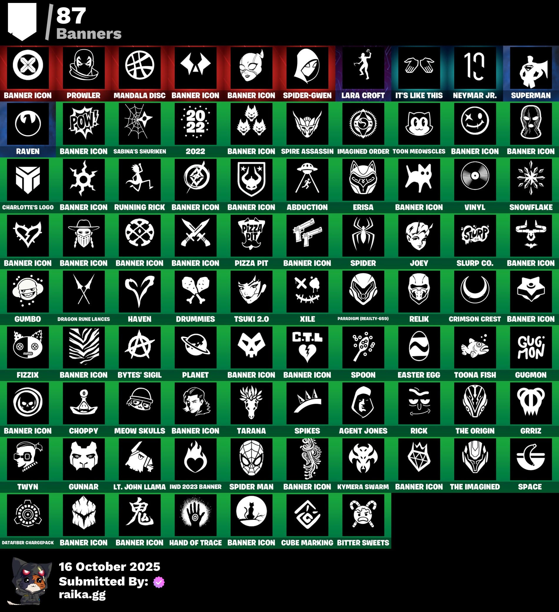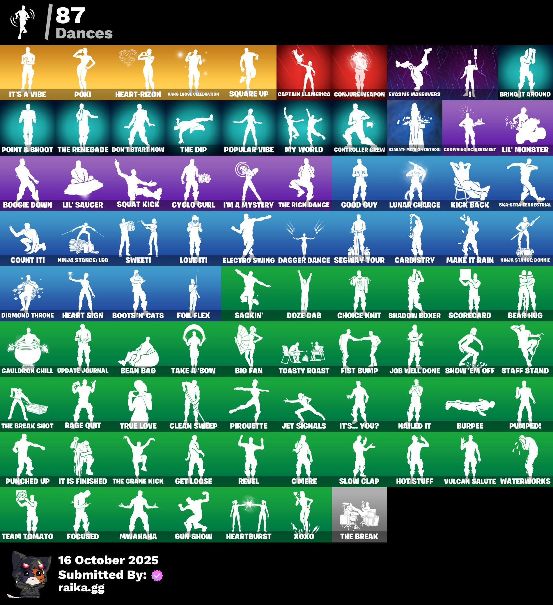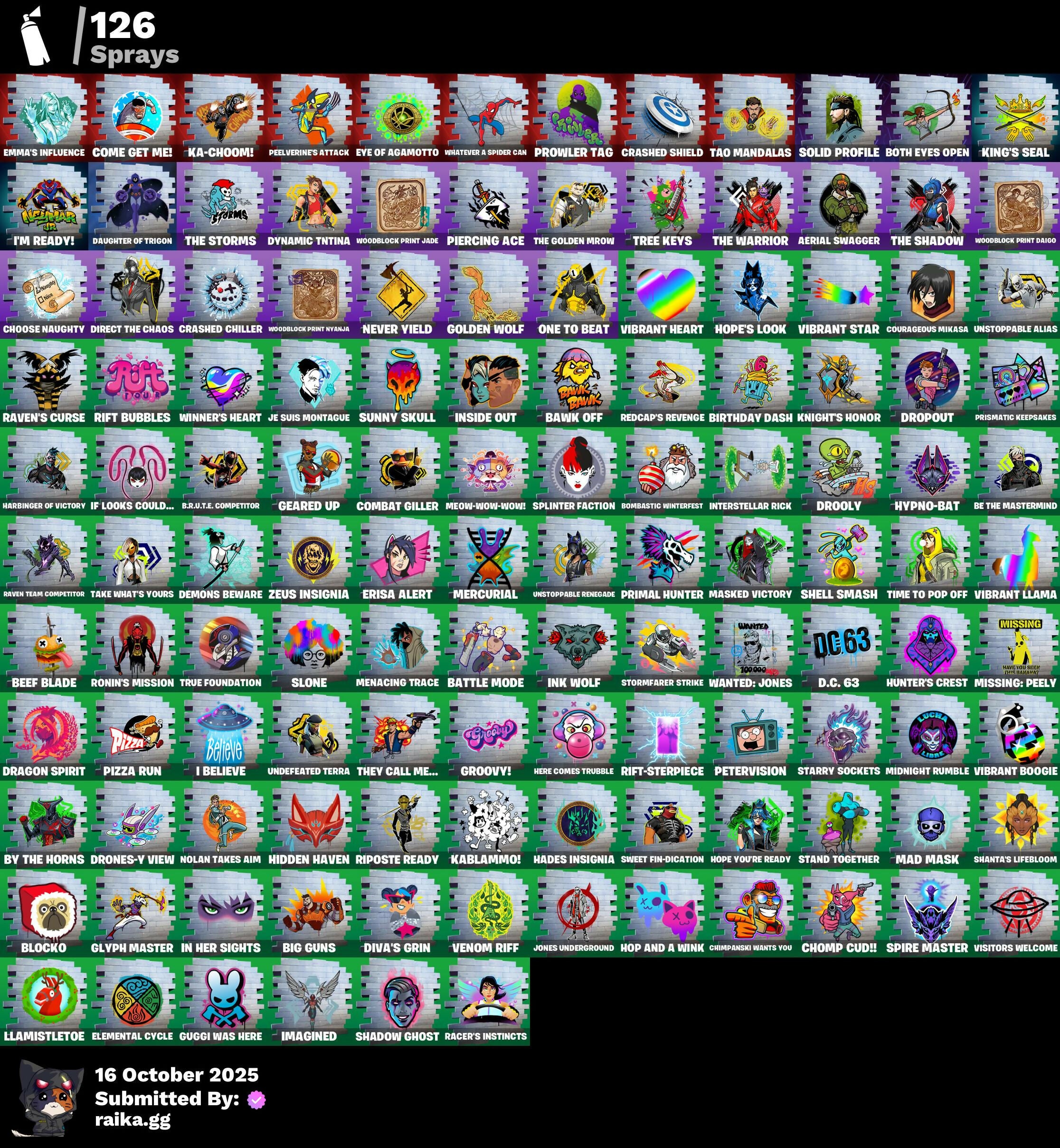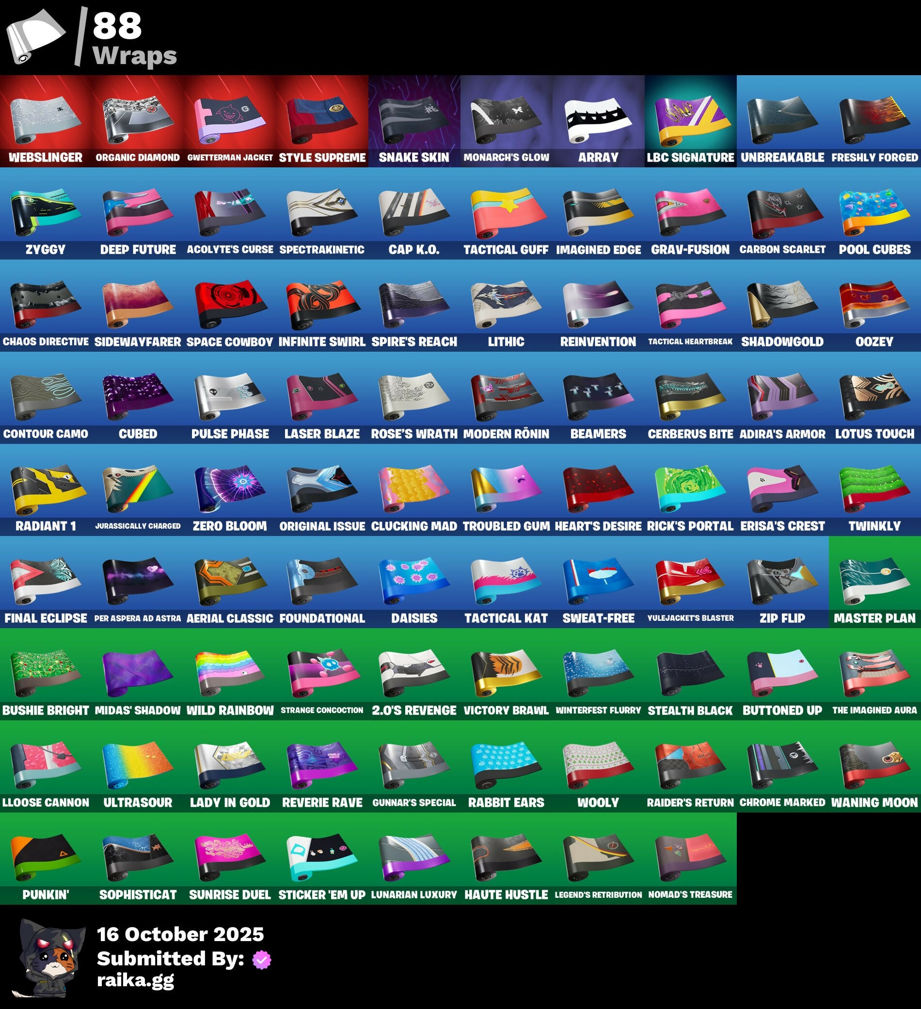 10 Orchestrator, 2.0's Revenge, 2022, 8-Ball Janky, 999 Knives, Abduction, Absenz, Abyssal Blade, Acolyte's Curse, Adira's Armor, Adira's Battle Flag, Aerial Classic, Aerial Swagger, Agent Jones, Agent Jones (Jump 31), Alpha Trophy, Ancestral Bloom, Apocalypse Shroud, Array, Aura, Auto Clutch, Axe-tral Form, Azarath Metrion Zinthos!, B Splat, B.R.U.T.E. Competitor, Backup Blades, Banner Shield, Bat Royale, Batman Zero, Battle Bloom, Battle Mode, Battle-Worn Cape, Bawk Off, Be The Mastermind, Beamers, Bean Bag, Bear Hug, Beef Blade, Beep & Boop, Big Fan, Big Guns, Birdie, Birthday Basher, Birthday Dash, Bitter Sweets, Blackened Shield, Blacklight, Blade Of The Waning Moon, Bladed Travpak, Blaze, Blocko, Blue Viper, Bobo, Bombastic Winterfest, Bone Patrol, Boogie Down, Book of Cagliostro, Boots N' Cats, Both Eyes Open, Brain Freeze, Brilliant Cutters, Bring It Around, Bronzed Scimitars, Bubbloon, Bullet Rider, Bunsen Backburner, Burpee, Bushie Bright, Butter Robot, Buttoned Up, Buzz Pack, By The Horns, Bytes' Sigil, C'Mere, Cap K.O., Captain Jones's Shield & Pickaxe, Captain Llamerica, Carbon Fiber Holster, Carbon Scarlet, Cardistry, Catrina, Cauldron Chill, Cazadora, Cerberus Bite, Chain Surfer, Chainsaur, Champion Stash'd, Champion's Shield, Chaos Directive, Charlotte's Logo, Chemist's Cloudglider, Chimpanski Wants You, Choice Knit, Chomp Cud!!, Choose Naughty, Chop Chop, Chop Dropper, Choppy, Chord Kahele, Chrome Marked, Chromeseed, Clawbox, Clawz Retro, Clean Sweep, Cliffside Soarer, Cluck, Cluck (Slurpy), Clucking Mad, Cold Dagger Pack, Cold'en Touch, Combat Elite, Combat Giller, Combat Tech Jules, Come Get Me!, Comfy Cats, Competitor's Time Brella, Conjure Weapon, Contour Camo, Controller Crew, Count It!, Courageous Mikasa, Cozy Coaster, Crashed Chiller, Crashed Shield, Crescent Shroom, Crimson Crest, Crimson Polestar, Crowning Achievement, Cryptic Coaster, Cryptic Sling-Kit, Crystal Axe Of The Masters, Crystal Fang, Cube Aether, Cube Marking, Cubed, Cubic Scepter, Cuddle Carvers, Cuddly Cloudcruiser, Cursed Marionette, Cyclo Curl, Cyimtar, Cymitar, D.C. 63, Dagger Dance, Daisies, Dark Charger, Datafiber Chargepack, Daughter Of Trigon, Dealer's Deck, Deep Future, Demons Beware, Diamond Eye, Diamond Throne, Diamondclaw Picker, Dimensional Gate, Dino Deck, Direct The Chaos, Diva's Grin, Doctor Slone, Doctor Slone (Prismatic), Doctor Strange, Dogg Treat, Dolly, Don't Start Now, Doom Brella, Doze Dab, Dragon Rune Lances, Dragon Spirit, Dreamzy Handbag, Driver, Drones-V View, Drooly, Droopy, Dropout, Drummies, Duelist's Foil, Dumbbell Driver, Dune Tripper, Dynamic Tntina, Easter Egg, Eclipse Brella, Eddie Brock, Eggar, Electric Shredder, Electro Swing, Elemental Cycle, Elite Servo, Emma's Influence, Enchanted Lifebloom, Endless Scroll, Energy Claw, Epic Blade Of Floof, Erisa, Erisa Alert, Erisa's Crest, Evasive Maneuvers, Eye Of Agamotto, Fashion Accident Janky, Felina, Felina's Claw, Fiendish Wand, Fiery Descent, Final Eclipse, Firestarter, Fishstick Janky, Fist Bump, Fixer, Fizzix, Flux Silvera, Focused, Foil Flex, Foundation's Mantle, Foundation's Plasma Spike, Foundational, Foundational 'Brella, Freshly Forged, Frostburn, Frosted Frets, Frozebud, Galactic Pack, Geared Up, Get Loose, Ghost Portal, Gilded Pinscher, Gilded Reality, Glacial Backplate, Glacial Slasher, Glorious Giftblade, Glyph Master, Godzilla's Exo-Spine, Gold Crow, Golden, Golden Nemesis, Golden Scythe, Golden Wolf, Good Guy, Grav-Fusion, Groovy!, Grriz, Guardian Daggers, Guggi Was Here, Guggimon, Guggimon (Prismatic), Gugmon, Gum Brawler, Gumbo, Gummy Sack, Gun Show, Gunn-Brella, Gunnar, Gunnar's Special, Gwenpool's Katanas, Gwettermann Jacket, Hacksear Blades, Hadean Gate, Hades Insignia, Hammerhead Morty, Hand of Trace, Hang Loose Celebration, Harbinger Of Victory, Harlowe, Hatch Pack, Haute Hustle, Haven, Headpiece, Heart Sign, Heart's Carver, Heart's Desire, Heart-Rizon, Heartbreak Club, Heartbreak Ranger, Heartburst, Heartwinder, Helmet, Here Comes Trubble, Hidden Haven, High Society Glider, Holiday Boxy, Holly Hatchets, Hop And A Wink, Hope, Hope Star, Hope You're Ready, Hope's Look, Horde's War Wheel, Hot Pokers, Hot Stuff, Humbug Slicer, Hunter's Crest, Hypno-Bat, I Believe, I'm A Mystery, I'm Ready!, IWD 2023 Banner, Ice Breaker, Ice Carver, Ice Crystal, Icebound Midas, Icebound Wing, If Looks Could..., Imagined, Imagined Edge, Imagined Order, Impact Green, In Her Sights, Indigo Wings, Infinite Swirl, Ink Wolf, Inky Ire, Inside Out, Interstellar Rick, Invasion, Io Eradicator, Io Field Flyer, Io Stealth Sail, It Is Finished, It's A Vibe, It's Like This, It's... You?, Je Suis Montague, Jet Signals, Job Well Done, Joey, Jones Underground, Jones' Field Pack, Jurassically Charged, K.O. Club, K.O. Cruiser, Ka-Cho0m!, Kablammo!, Kal-El's Cape, Kat Claws, Kata Tech Burstwing, Kata-Pack, Katalina, Katalina's Kit Bag, Kiara K.O., Kick Back, King's Seal, Kittanas, Knight's Honor, Krisabelle, Kymera, Kymera Swarm, Kymera's Plasma Pak, Kyra, LBC Signature, Lady In Gold, Lara Croft, Laser Blaze, Lectro Guard Pack, Legend's Modkit, Legend's Retribution, Lil' Black Heart, Lil' Monster, Lil' Saucer, Lithic, Llaminator, Llamistletoe, Lloose Cannon, Lone Wolf Holster, Lotus Touch, Love It!, Love Lock, Lt. John Llama, Lucky, Lunar Charge, Lunar Hyperjet, Lunar Skyspan, Lunarian Luxury, Mad Mask, Mae Jr., Magmacore Sheath, Make It Rain, Mandala Disc, Mask of Balance, Masked Victory, Master Plan, Mayhem Scythe, Menacing Trace, Meow Skulls, Meow-Wow-Wow!, Meowscles Janky, Meowtooth Plush, Mercurial, Metal Gear Mk. II, Microbot Mallet, Midas' Shadow, Midnight Rumble, Missing: Peely, Modern Rōnin, Molten Max Axe, Monarch, Monarch's Glow, Montague, Mourning Glory, Mr. Daruma, Mwahaha, My World, Nailed It, Nana Bath, Nana-Brella, Nanner Bashers, Nemesis Box, Never Yield, Neymar Jr., Night Kama, Ninja Stance: Donnie, Ninja Stance: Leo, Nisha, No Ghost, Nog Ops, Nolan Takes Aim, Nomad's Treasure, Nyanja's Catpak, Omni Sword, One To Beat,