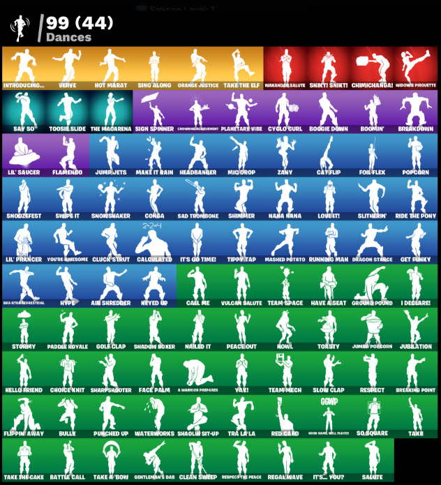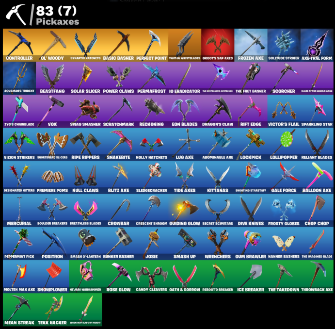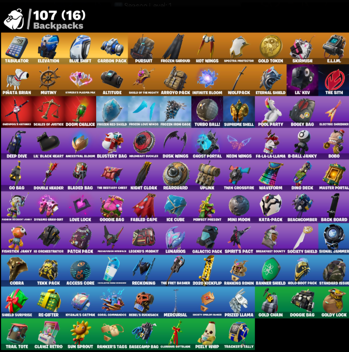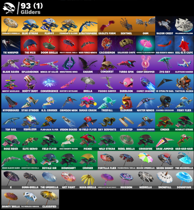 10 Field Flyer, 2020 Kickflip, 8-Ball Janky, A Warrior Prepares, A.I.M., Abominable Axe, Access Core, Air Shredder, Altitude, Ancestral Bloom, Aquaman, Aquaman's Trident, Arctic Adeline, Arroyo Pack, Axe-Tral Form, Back Board, Balloon Axe, Banner Shield, Base Jumper, Basecamp Bag, Basic Basher, Battle Call, Battlehawk, Beach Umbrella, Beachcomber, Beastfang, Blackheart, Blade Of The Waning Moon, Blade Raven, Bladed Bag, Blitz Axe, Blue Shift, Blue Streak, Blue Striker, Blue Team Leader, Blustery Bag, Bobo, Bogey Bag, Boogie Down, Boomin', Booty Buoy, Boulder Breakers, Bounty 'Brella, Bracer, Breakdown, Breakfast Bounty, Breaking Point, Breakpoint, Breathless Blades, Brella, Bubbloon, Bully, Bunker Basher, Bunker Jonesy, Cacodemon, Calamity, Calculated, Call Me, Candy Cleavers, Carbide, Carbon Commando, Carbon Pack, Cat Flip, Chill Count, Chimichanga!, Choice Knit, Chop Chop, Chop Dropper, Cinder, Classified, Clawz Retro, Clean Sweep, Cliffside Soarer, Cloud Striker, Cluck Strut, Cobra, Comet Crasher, Competitor's Thin Brella, Conga, Conquest, Controller, Convergence, Coral Commandos, Covered Crusader, Crescent Shroom, Crimson Scout, Crimson Wish, Crossfire, Crowbar, Cruiser, Cuddly Cloudcruiser, Cyclo Curl, DJ Yonder, Deadpool’s Katanas, Deep Dive, Desert Dominator, Designated Hitters, Dino Deck, Dire, Dive Knives, Doctor Slone, Doggie Bag, Doom Brella, Doom Chalice, Double Header, Downpour, Downshift, Dragon Stance, Dragon's Claw, Drift, Dusk, Dusk Wings, Dynamo Grav-Suit, E.L.I.M., Eagle's Form, Electric Shredder, Elevation, Elite Servo, Ember, Eon Blades, Equalizer, Eternal Knight, Eternal Shield, Fa-La-La-Llama, Fable, Fabled Cape, Face Palm, Fade, Fashion Accident Janey, Field Flyer, Fishstick Janky, Fishy Flier, Fixer, Flamenco, Flapjack Flyer, Flappy, Flippin' Away, Foil Flex, Fortilla Flier, Founder's Glider, Founder's Umbrella, Foundrathor Brella, Frosty Globes, Frozen Axe, Frozen Iron Cage, Frozen Love Ranger, Frozen Love Wings, Frozen Raven, Frozen Red Knight, Frozen Red Shield, Frozen Shroud, GGWP, Galactic Pack, Gale Force, Gentleman's Dab, Get Funky, Ghost Portal, Giddy-Up, Glidurr, Glitched Stone Chicken, Glorious Giftblade, Go Bag, Gold Chain, Gold Token, Goldy Lock, Golf Clap, Goodie Bag, Grand Glacier Glider, Groots Sap Axes, Ground Pound, Guggimon, Guiding Glow, Gum Brawler, Gunn-Brella, Har-Har-Har!, Have A Seat, Headbanger, Headhunter Prime, Hello Friend, High Society Glider, Holiday Boxy, Holly Hatchets, Holo-Boot Pack, Hot Marat, Hot Wings, Howl, Hunter's Skyblade, Huntress, Hybrid, Hype, Hyperboard, I Declare!, IO Eradicator, IO Orchestrator, Ice Breaker, Ice Cube, Infinite Bloom, Introducing..., Invasion, Io Stealth Sail, It's Go Time!, It's... You?, Joey, Josie, Jubilation, Jules, Jumbo Popcorn, Jump Jets, K.O. Cruiser, Kal-El's Cape, Kata-Pack, Keyed Up, Kit, Kittanas, Kondor, Krisabelle, Kymera, Kymera’s Plasma Pak, Legendary Blade Of Insight, Legend’s Modkit, Lexa, Lil' Prancer, Lil' Saucer, Lil’ Black Heart, Lil’ Kev, Lockpick, Lockstep, Lollipopper, Love It!, Love Lock, Lt. Evergreen, Lug Axe, Lunarios, Lynx, Make It Rain, Mancake, Mandalorian, Mashed Potato, Master Portal, Mave, Mean Streak, Menace, Mercurial, Mic Drop, Mighty Marvel Brella, Millennium Falcon, Mini Moon, Molten Max Axe, Mutiny, Nailed It, Nana Nana, Nana-Brella, Nanner Bashers, Nejari Warhammer, Neon Wings, Night Cloak, Nightshade, NiteLite, Null Claws, Nyanja’s Catpak, Oath & Sorrow, Ocean, Ohm, Ol' Woody, Orange Justice, Paddle Royale, Patch Pack, Peace Out, Peely, Peely Whip, Peppermint Pick, Perfect Point, Perfect Present, Permafrost, Picnic, Pinata Brian, Planetary Vibe, Polar Peely, Pool Party, Popcorn, Positron, Powder, Power Claws, Precarious Interface, Predator, Premiere Poms, Prized Llama, Prodigy, Psionic Surfer, Punched Up, Pursuit, Ragnarok, Ranker’s Tags, Ranking Ronin, Razor Crest, Re-Gifter, Rearguard, Rebel Brella, Rebel’s Rucksack, Reboot'd Breaker, Reckoning, Red Card, Red Robin's Wings, Red Strike, Redline, Reese, Regal Wave, Reliant Blades, Respect, Respect The Peace, Ride The Pony, Rift Edge, Ripe Rippers, Rook, Rose Glow, Rose Rider, Rose Team Leader, Rox, Royale Air, Running Man, Sad Trombone, Salute, Salvaged Chute, Say So, Scales of Justice, Scarlet Strike, Scorcher, Scratchmark, Scuba Jonesy, Secret Scimitars, Sentinel, Seven Signet, Sgt. Winter, Shadow Boxer, Shaolin Sit-Up, Sharpshooter, Shield Surprise, Shield of the Mighty, Shimmer, Shooting Starstaff, Shortbread Slicers, Sidewinder, Sign Spinner, Signal Jammer, Sing Along, Siona, Ska-Stralrrestrial, Skirmish, Skull Trooper, Sky Serpents, Sled Ready Guuf, Sledgecracker, Sledgehammer, Slitherin', Slow Clap, Smash O' Lantern, Smash Up, Snakebite, Snikt! Snikt!, Snoozefest, Snowfall, Snowplower, Snowshaker, So Square, Society Emblem Raiser, Society Shield, Solar Slicer, Solitude Striker, Sparkling Star, Spectra Protector, Spirit’s Pact, Splashdown, Standard Issue, Star Strider, Stormy, Stratosphere, Stratus, Sugar Crash, Sun Sprout, Sun Strider, Sunny, Sunny's Lander, Supreme Shell, Swag Smasher, Swarm, Swipe It, Synaptic Hatchets, Tabulator, Tactical Sleigh, Take A Bow, Take The Cake, Take The Elf, Taxi!, Team Mech, Team Space, Tek Pack, Teknique, Tekx Hacker, The Bestiary Chest, The Destroyer's Destroyer, The Fret Basher, The Imagined Blade, The Macarena, The McG, The Peerless Parasol, The Rezzbrella, The Sith, The Takedown, The Umbrella, Throwback Axe, Tide Axes, Tie Whisper, Tippy Tap, Toasty, Toosie Slide, Top Sail, Tra La La, Tracker’s Tally, Trail Tote, Treefall, Triggerfish, Turbo Ball!, Turbo Spin, Twin Crossfire, Umbrella of the Aspen Grove, Uplink, Vautja Wristblades, Vega, Verve, Victor's Flail, Vision Board, Vizion Strikers, Vox, Vulcan Salute, Wakandan Salute, War Force Wings, Warpaint, Water Wings, Water Works, Waveform, Webrella, Wet Paint, Whispering Wind, Widow's Pirouette, Wild Streak, Wildheart Buckler, Wingman, Wings of Valor, Wintry Whirligig, Wolfpack, Wooly Warrior, Wr