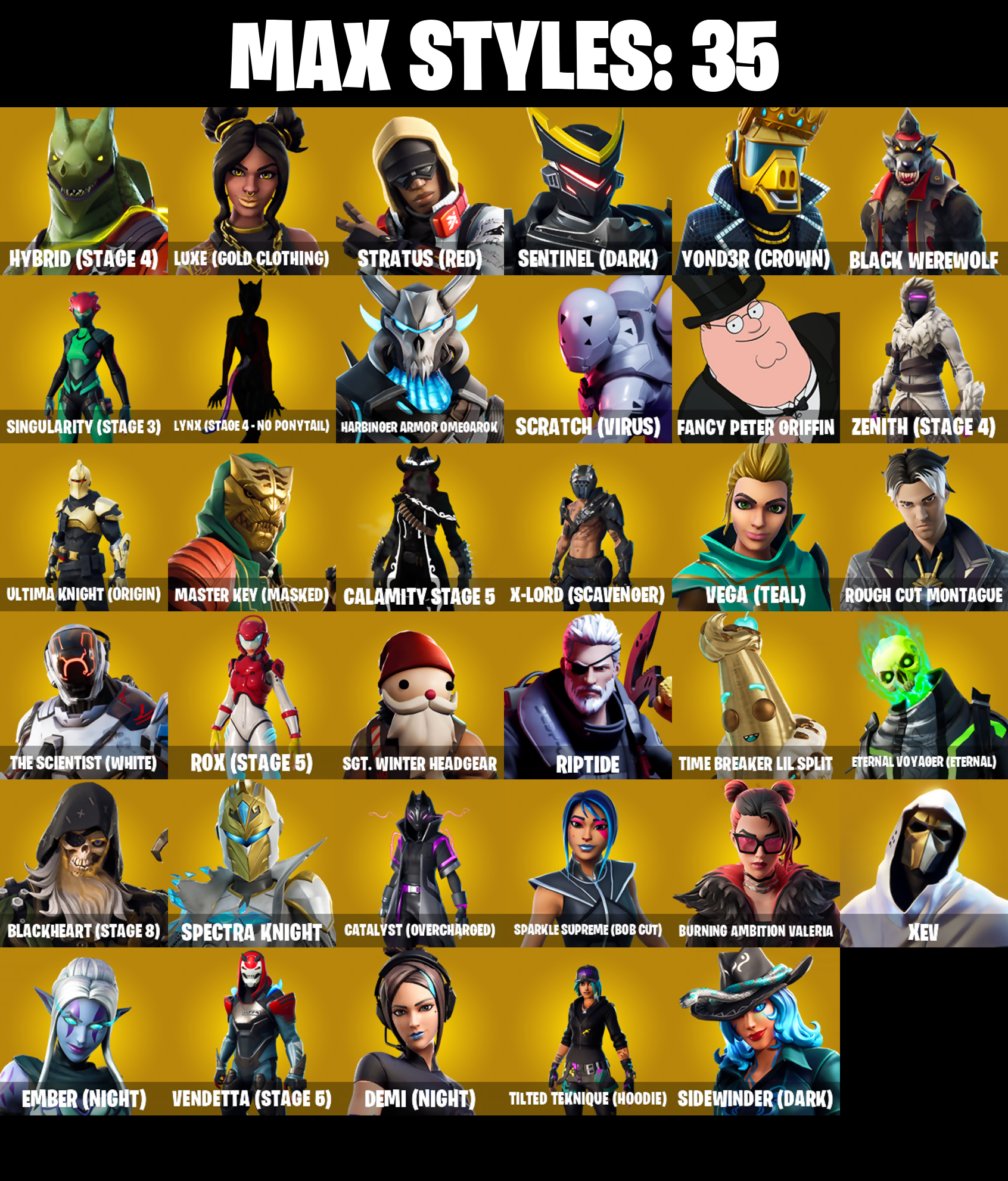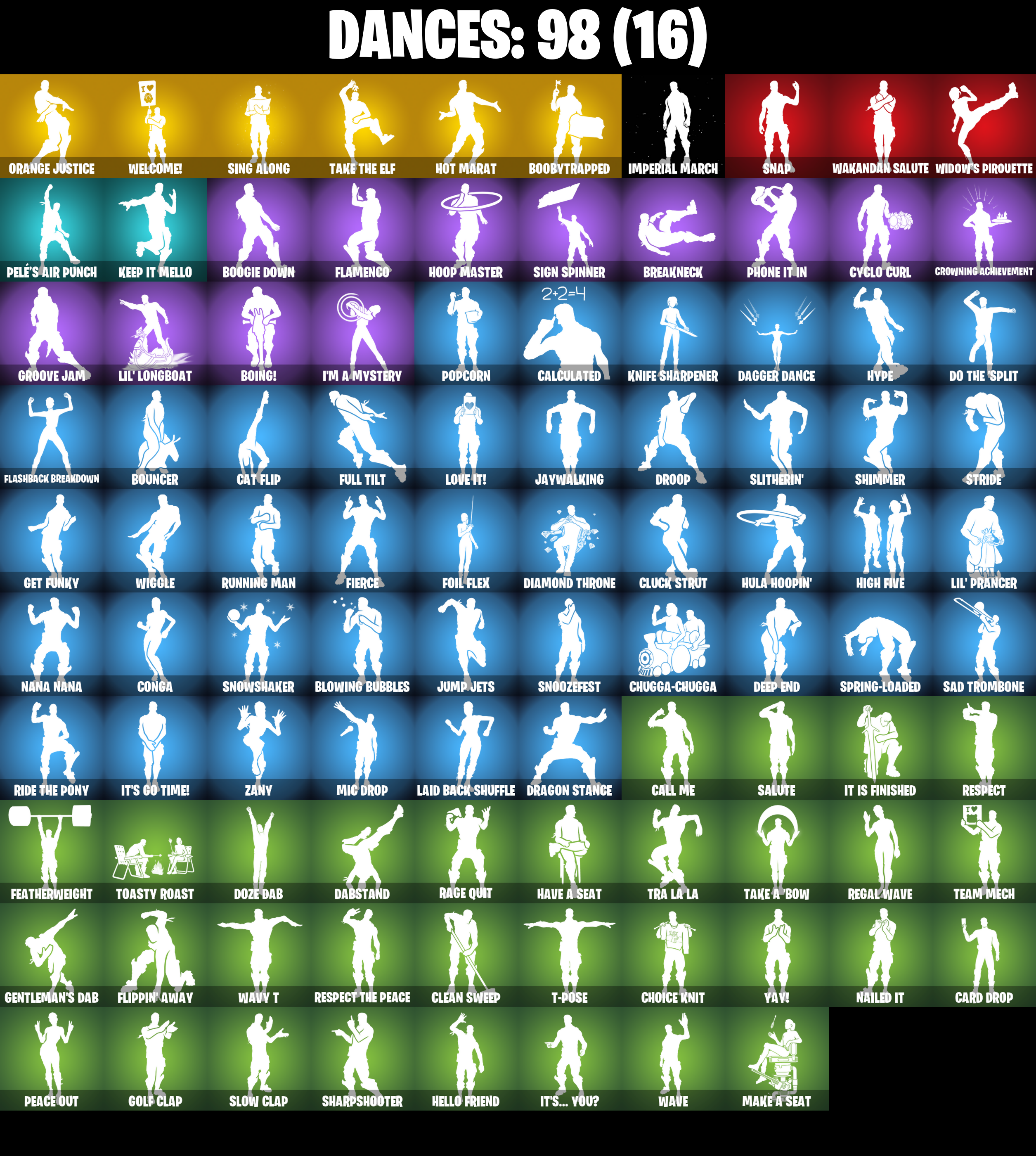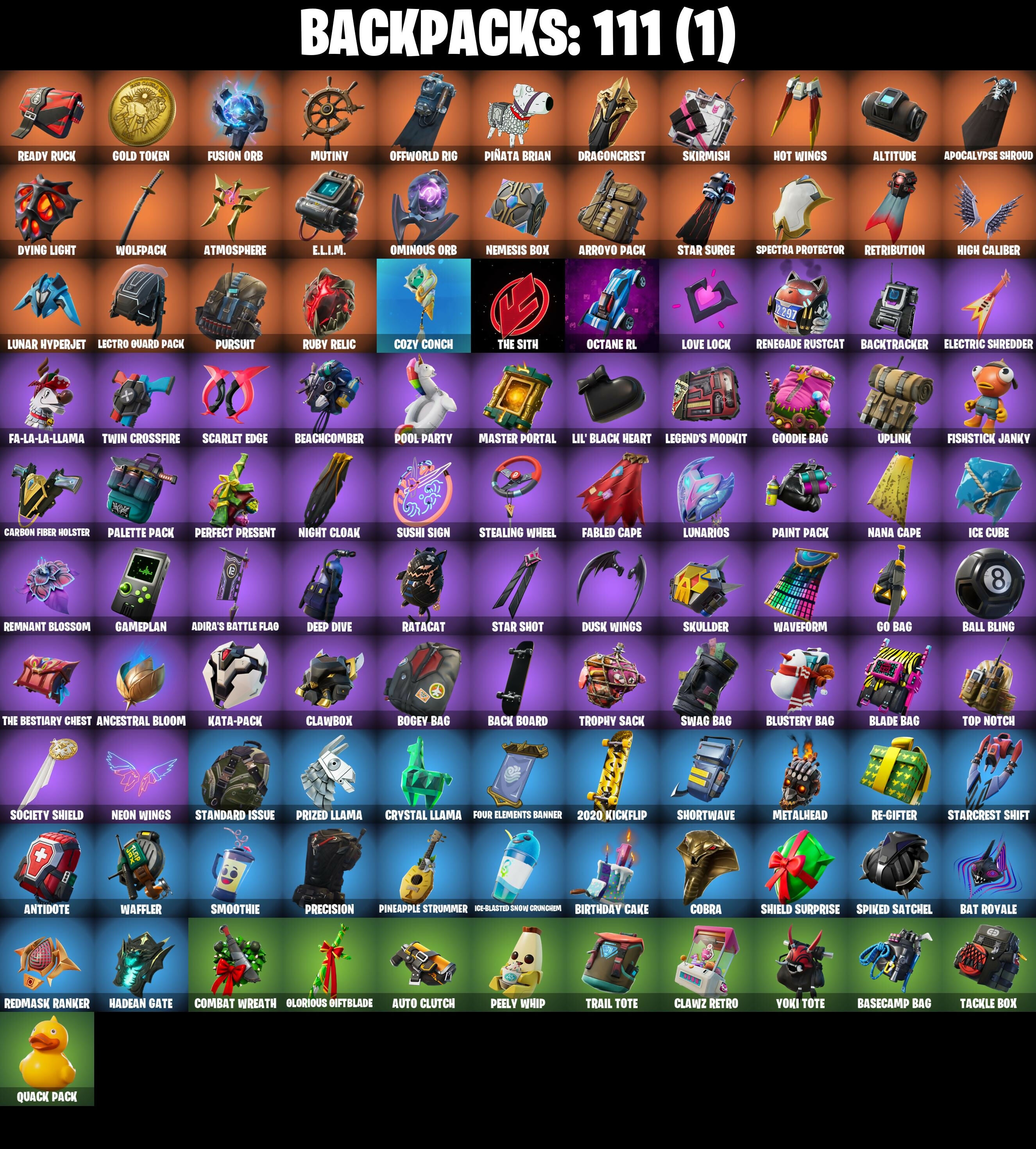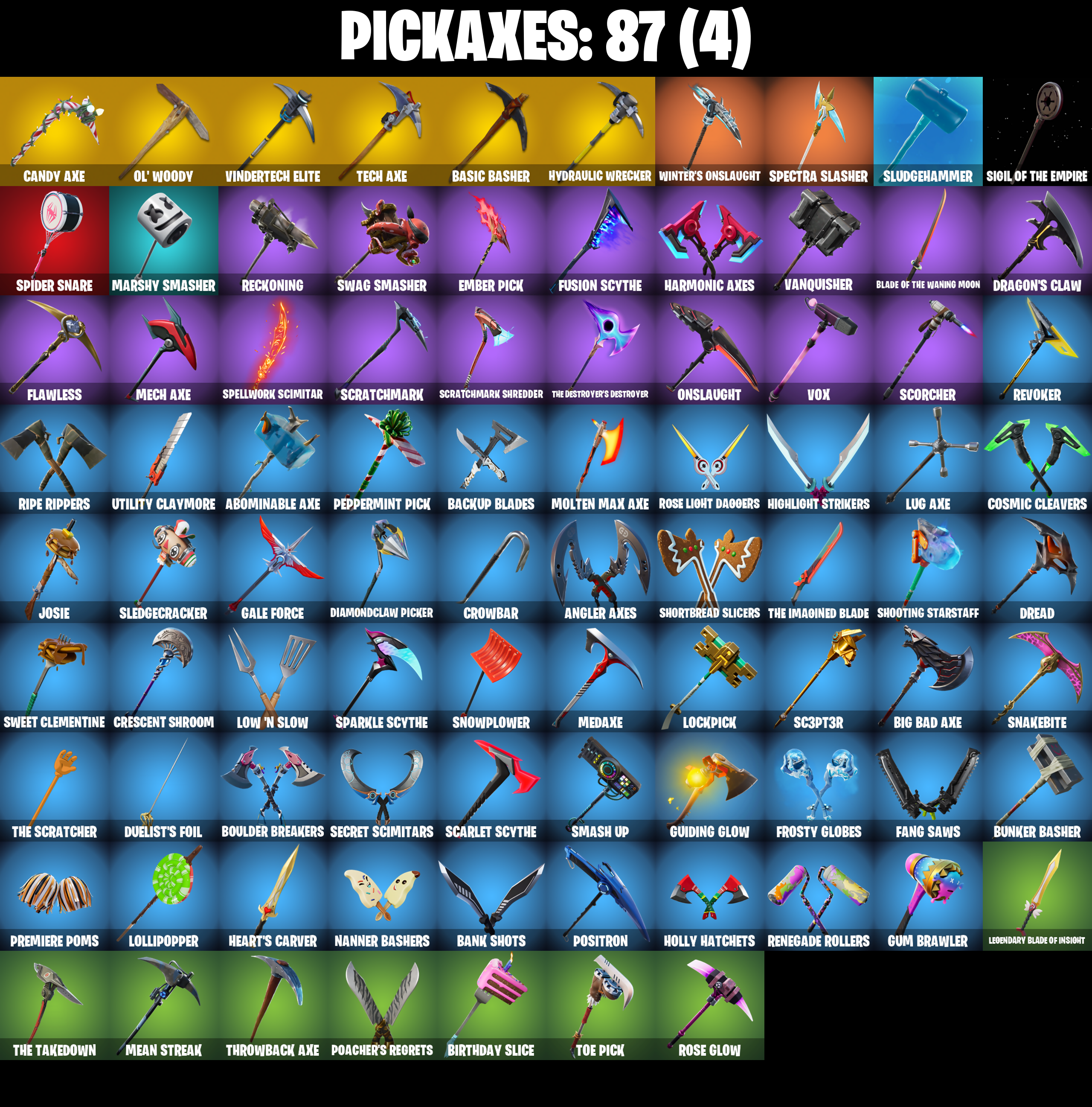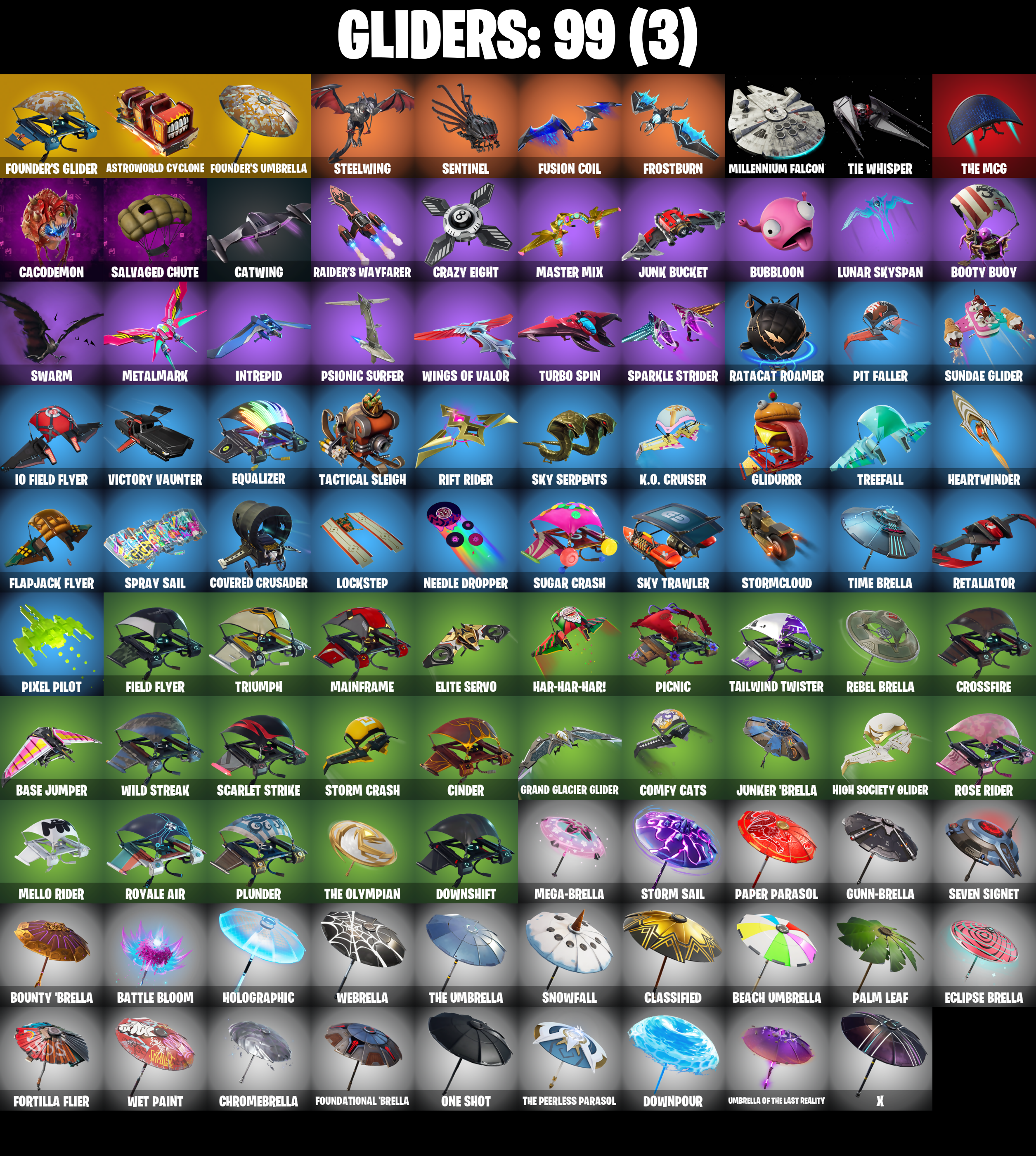 'Webrella, 2020 Kickflip, 8-Ball Vs Scratch, A.I.M., Abominable Axe, Adira's Battle Flag, Altitude, Ancestral Bloom, Angler Axes, Antidote, Apocalypse Shroud, Arroyo Pack, Astroworld Cyclone, Atmosphere, Auto Clutch, Back Board, Backtracker, Backup Blades, Ball Bling, Bank Shots, Base Jumper, Basecamp Bag, Basic Basher, Bat Royale, Battle Bloom, Battlehawk, Beach Umbrella, Beachcomber, Big Bad Axe, Birthday Cake, Birthday Slice, Black Werewolf, Blackheart, Blackheart (Stage 8), Blade Bag, Blade Of The Waning Moon, Blowing Bubbles, Blustery Bag, Bogey Bag, Boing!, Booby Trapped, Boogie Down, Booty Buoy, Boulder Breakers, Bouncer, Bounty 'Brella, Breakneck, Bubbloon, Bunker Basher, Bunker Jonesy, Burning Ambition Valeria, Cacodemon, Calamity, Calamity Stage 5, Calculated, Call Me, Cameo Vs Chic, Candy Axe, Carbide, Carbon Fiber Holster, Card Drop, Cat Flip, Catalyst, Catalyst (Overcharged), Catwing, Choice Knit, Chromebrella, Chugga-Chugga, Cinder, Classified, Clawbox, Clawz Retro, Clean Sweep, Cluck Strut, Cobra, Combat Wreath, Comfy Cats, Conga, Cosmic Cleavers, Covered Crusader, Cozy Conch, Crazy Eight, Crescent Shroom, Crossfire, Crowbar, Crowning Achievement, Crystal Llama, Cyclo Curl, DJ Yonder, Dabstand, Dagger Dance, Deep Dive, Deep End, Demi, Demi (Night), Diamond Throne, Diamondclaw Picker, Dire, Do The 'Split, Downpour, Downshift, Doze Dab, Dragon Stance, Dragon's Claw, Dragoncrest, Dread, Droop, Duelist's Foil, Dusk, Dusk Wings, Dying Light, E.L.I.M., Eclipse Brella, Electric Shredder, Elite Servo, Ember, Ember (Night), Ember Pick, Equalizer, Eternal Voyager, Eternal Voyager (Eternal), Fa-La-La-Llama, Fable, Fabled Cape, Fancy Peter Griffin, Fang Saws, Fate, Featherweight, Field Flyer, Fierce, Fishstick Janky, Flamenco, Flapjack Flyer, Flashback Breakdown, Flawless, Flippin' Away, Foil Flex, Fortilla Flier, Foundational 'Brella, Founder's Glider, Founder's Umbrella, Four Elements Banner, Frostburn, Frosty Globes, Full Tilt, Fusion, Fusion Coil, Fusion Orb, Fusion Scythe, Gale Force, Gameplan, Gentleman's Dab, Get Funky, Giddy-Up, Glidurrr, Glorious Giftblade, Go Bag, Gold Token, Golf Clap, Goodie Bag, Grand Glacier Glider, Groove Jam, Guiding Glow, Gum Brawler, Gunn-Brella, Hadean Gate, Har-Har-Har!, Harbinger Armor Omegadrok, Harmonic Axes, Have A Seat, Heart's Carver, Heartwinder, Hello Friend, High Caliber, High Five, High Society Glider, Highlight Strikers, Holiday Boxy, Holly Hatchets, Holographic, Hoop Master, Hope, Hot Marat, Hot Wings, Hula Hoopin', Hybrid, Hybrid (Stage 4), Hydraulic Wrecker, Hype, I'm A Mystery, Ice Cube, Ice-Blasted Snow Cruncherm, Imperial March, Intrepid, Io Field Flyer, It Is Finished, It's Go Time!, It's... You?, Jaywalking, Josie, Journey Vs Hazard, Jump Jets, Junk Bucket, Junker 'Brella, K.O. Cruiser, Kata-Pack, Keep It Mello, Knife Sharpener, Krisabelle, Laguna, Laid Back Shuffle, Lectro Guard Pack, Legend's Modkit, Legendary Blade Of Insight, Lil Split, Lil' Black Heart, Lil' Longboat, Lil' Prancer, Lockpick, Lockstep, Lollipopper, Love It!, Love Lock, Low 'n Slow, Lt. Evergreen, Lug Axe, Lunar Hyperjet, Lunar Skyspan, Lunarios, Luxe, Luxe (Gold Clothing), Lynx, Lynx (Stage 4 - No Ponytail), Mainframe, Major Mancake, Make A Seat, Marshy Smasher, Master Key, Master Key (Masked), Master Mix, Master Portal, Mean Streak, Mech Axe, Medaxe, Mega-Brella, Mello Rider, Metalhead, Metalmark, Mic Drop, Millennium Falcon, Molten Max Axe, Montague, Mutiny, Nailed It, Nana Cape, Nana Nana, Nanner Bashers, Needle Dropper, Nemesis Box, Neon Wings, Night Cloak, Nightshade, Nisha, Octane RL, Offworld Rig, Ol' Woody, Omega, Omegarok, Ominous Orb, One Shot, Onslaught, Orange Justice, Oscar, Paint Pack, Palette Pack, Palm Leaf, Paper Parasol, Peace Out, Peely, Peely Whip, Pele's Air Punch, Peppermint Pick, Perfect Present, Peter Griffin, Phone It In, Picnic, Pinata Brian, Pineapple Strummer, Pit Faller, Pixel Pilot, Plunder, Poacher's Regrets, Polar Peely, Pool Party, Popcorn, Positron, Powder, Precision, Premiere Poms, Prized Llama, Psionic Surfer, Pursuit, Quack Pack, Rage Quit, Raider's Wayfarer, Ratacat, Ratacat Roamer, Re-Gifter, Ready Ruck, Rebel Brella, Reckoning, Redmask Ranker, Regal Wave, Remedy Vs Toxin, Remnant Blossom, Renegade Lynx, Renegade Rollers, Renegade Rustcat, Respect, Respect The Peace, Retaliator, Retribution, Revoker, Ride The Pony, Rift Rider, Ripe Rippers, Rippley Vs Sludge, Riptide, Rose Glow, Rose Light Daggers, Rose Rider, Rose Team Leader, Rough Cut Montague, Rox, Rox (Stage 5), Royale Air, Ruby Relic, Ruin, Running Man, Runway Racer, Sad Trombone, Salute, Salvaged Chute, Sc3pt3r, Scarlet Defender, Scarlet Edge, Scarlet Scythe, Scarlet Strike, Scorcher, Scorpion, Scratch (Virus), Scratchmark, Scratchmark Shredder, Secret Scimitars, Sentinel, Sentinel (Dark), Seven Signet, Sgt. Winter, Sgt. Winter Headgear, Sharpshooter, Shield Surprise, Shimmer, Shooting Starstaff, Shortbread Slicers, Shortwave, Sidewinder, Sidewinder (Dark), Sigil Of The Empire, Sign Spinner, Sing Along, Singularity, Singularity (Stage 3), Skirmish, Skullder, Sky Serpents, Sky Trawler, Sledgecracker, Slitherin', Slow Clap, Sludgehammer, Smash Up, Smoothie, Snakebite, Snap, Snoozefest, Snowfall, Snowplower, Snowshaker, Society Shield, Sorana, Sparkle Scythe, Sparkle Strider, Sparkle Supreme, Sparkle Supreme (Bob Cut), Spectra Knight, Spectra Protector, Spectra Slasher, Spellwork Scimitar, Spider Snare, Spiked Satchel, Spray Sail, Spring-Loaded, Squad Leader, Standard Issue, Star Shot, Star Surge, Starcrest Shift, Stealing Wheel, Steelwing, Storm Crash, Storm Sail, Stormcloud, Stratus, Stratus (Red), Stride, Sugar Crash, Summit Striker, Sundae Glider, Surf Rider, Sushi Sign, Swag Bag, Swag Smasher, Swarm, Sweet Clementine, T-Pose, Tackle Box, Tactical Sleigh, Tailwind Twister, Take A 'Bow, Take The Elf, Team Mech, Tech Axe, Teknique, The Ace, The Bestiary Chest, The Destroyer's Destroyer, The Imagined Blade, The Mcg, The Olympian, The Peerless Parasol, The Scientist,