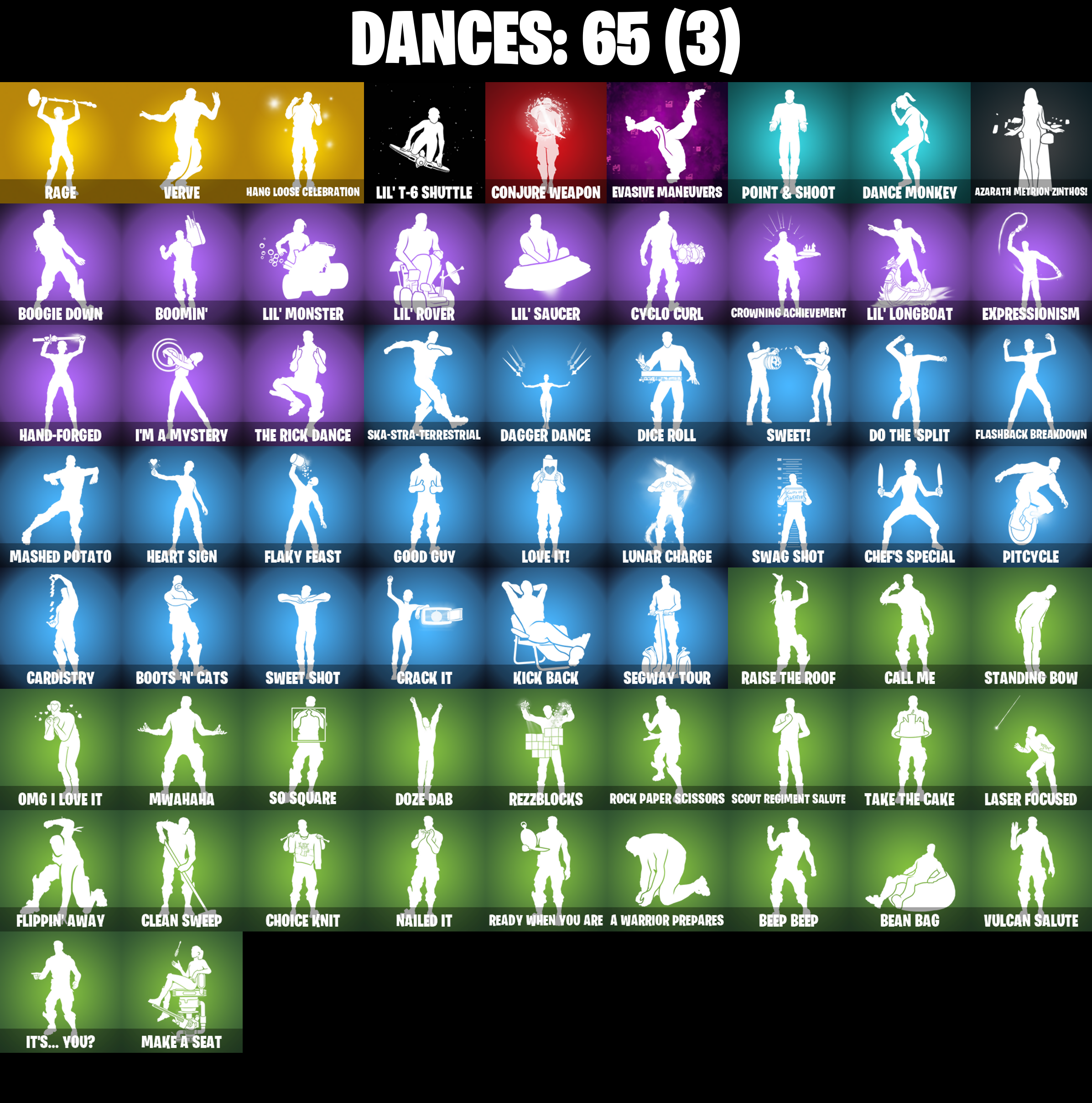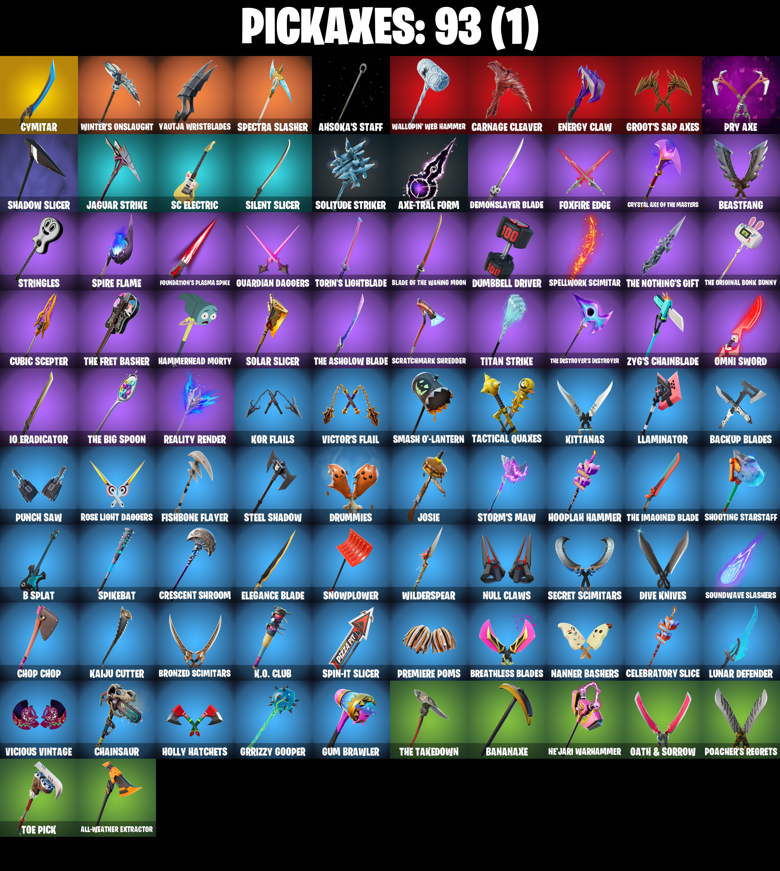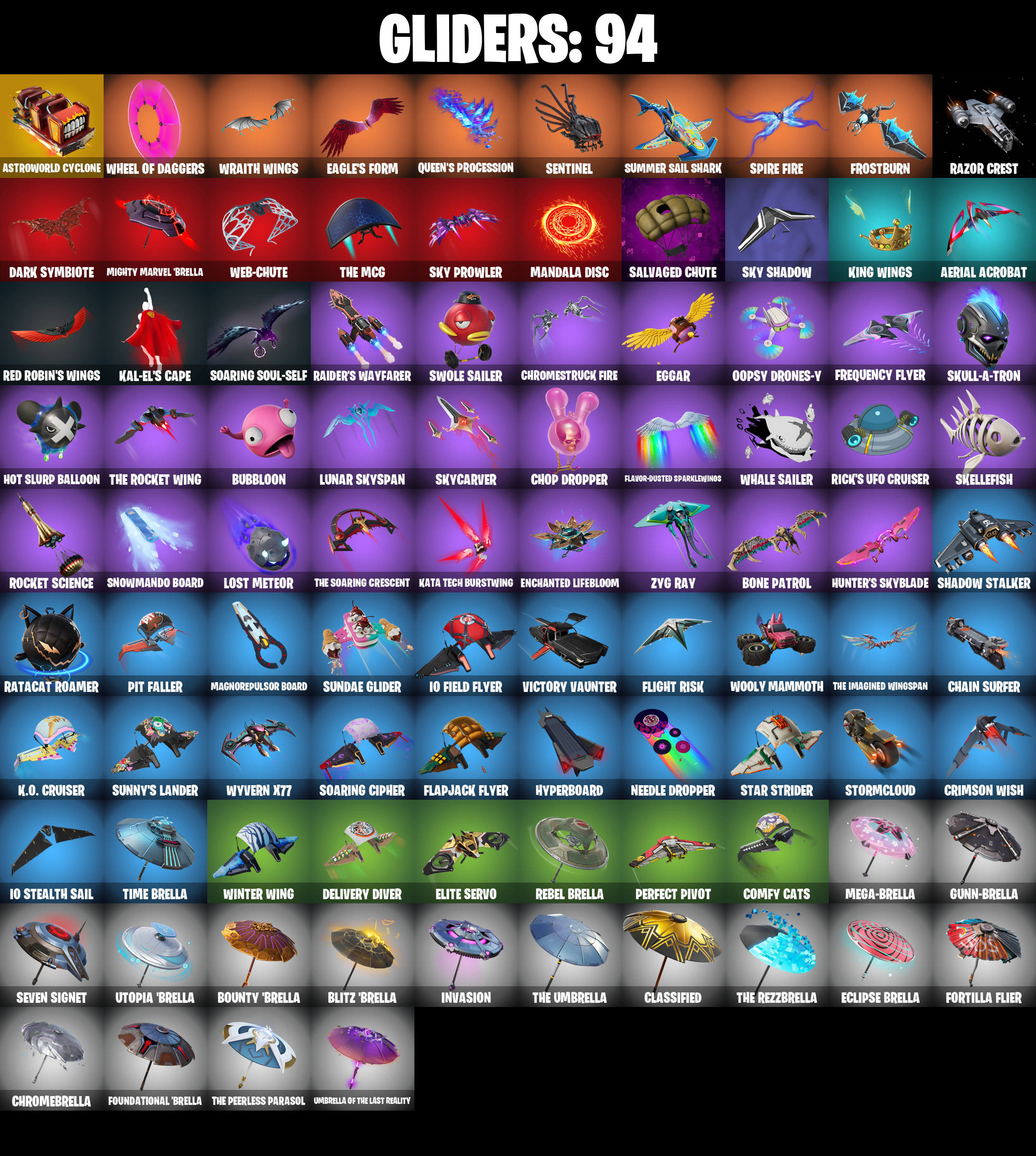 4 Me???, 8-Ball Janky, A Warrior Prepares, Aerial Acrobat, Agent Jones, Agent Jones (Jump 31), Ahsoka Tano, Ahsoka's Staff, All-Weather Extractor, Ancestral Bloom, Antonia, Apocalypse Shroud, Arroyo Pack, Astroworld Cyclone, Auto Clutch, Axe-tral Form, Azarath Metri'on Zinthos!, B Splat, Backup Blades, Bananaxe, Basement Key, Bat Royale, Beachcomber, Bean Bag, Beastfang, Bedside Nanner, Beep Beep, Blackout Bag, Blade of the Waning Moon, Bladed Travpak, Blitz 'Brella, Blizzabelle, Bloomback Sack, Blustery Bag, Bobo, Bone Patrol, Boogie Down, Book Of Caolostro, Boomin', Boots 'N' Cats, Bounty 'Brella, Brain Freeze, Breakfast Bounty, Breathless Blades, Bronzed Scimitars, Bubbloon, Bun Bun Banjo Banjo, Butter Robot, Buzz Pack, Bytes, Bytes (Lone Traveler), Call Me, Cardistry, Carnage, Carnage (Maximum), Carnage Cleaver, Celebratory Slice, Chain Surfer, Chainsaur, Charlotte, Charlotte (Golden Rune), Chef's Special, Choice Knit, Chop Chop, Chop Dropper, Chrombrella, Chromeseed, Chromestruck Fire, Clark Kent, Clark Kent (Superman), Classified, Clawbox, Clawz Retro, Clean Sweep, Cluck, Cluck (Slurpy), Clutch & Dagger, Comfy Cats, Conjure Weapon, Crack It, Crescent Shroom, Crimson Crest, Crimson Wish, Crowning Achievement, Crystal Axe of the Masters, Cube Aether, Cubic Scepter, Cubic Vortex, Cyclo Curl, Cymitar, Dagger Dance, Dance Monkey, Dark Symbiote, Datafiber Chargepack, Deep Dive, Delivery Diver, Demonslayer Blade, Dice Roll, Dimensional Gate, Dino Deck, Dive Knives, Do The 'Split, Doctor Slone, Doctor Strange, Doom Chalice, Doze Dab, Drummies, Dumbbell Driver, Dusk Knight, Dynamo Grav-Suit, Eagle's Form, Eclipse Brella, Eggar, Elegance Blade, Elite Servo, Enchanted Lifebloom, Endless Scroll, Energy Claw, Eren Jaeger, Erisa, Evasive Maneuvers, Expressionism, Fabio Sparklemane, Fabio Sparklemane (Golden Rune), Fashion Accident Janky, Ffrosty, Fish Thicc, Fishbone Flayer, Fishstick Janky, Fizzix, Flaky Feast, Flapjack Flyer, Flashback Breakdown, Flavor-Dusted Sparklewings, Flight Risk, Flippin' Away, Fortilla Flier, Foundation's Mantle, Foundation's Plasma Spike, Foundational 'Brella, Fox Wayfinder, Foxfire Edge, Frequency Flyer, Frostburn, Galactic Pack, Glorious Giftblade, Good Guy, Groot's Sap Axes, Grriz, Grrizzy Gooper, Guardian Daggers, Guggimon, Gum Brawler, Gumbo, Gumbo (Sour), Gummy Sack, Gunn-Brella, Gunnar, Hammerhead Morty, Hand-Forged, Hang Loose Celebration, Harbinger Armor OmegaRok, Harlowe, Harlowe (Helmet), Hatch Pack, Haven, Haven (Tropical Chirper), Head (Droopy), Heart Sign, Holiday Boxy, Holly Hatchets, Hooplah Hammer, Hope, Hot Slurp Balloon, Hunter's Skyblade, Hunter's Trophy, Hyperboard, I'm A Mystery, IO Eradicator, IO Orchestrator, Imani, Infinite Bloom, Inky, Invasion, Io Field Flyer, Io Stealth Sail, It's... You?, J.B. Chimpanski, J.B. Chimpanski (Helmet), Jaguar Strike, Joey, Joia Trophy, Jones' Field Pack, Josie, K.O. Club, K.O. Cruiser, Kado Thorne, Kaiju Cutter, Kal-El's Cape, Kata Tech Burstwing, Kata-Pack, Khaby Lame, Kiara K.O., Kiara K.O. (Captain's Bomber), Kick Back, Killswitch Drone, King Wings, Kittanas, Kondor, Kor, Kor (Trenchcoat), Kor Flails, Kor's Toolkit, Krisabelle, Kymera, Kymera's Plasma Pak, Lara Croft, Lara Croft (Gold Anniversary), Laser Focused, Legend's Modkit, Lennox Rose, Lexa, Lexa (Warstrike), Lil Split, Lil' Black Heart, Lil' Longboat, Lil' Monster, Lil' Rover, Lil' Saucer, Lil' T-6 Shuttle, Llaminator, Lost Meteor, Love It!, Love Lock, Lt. John Llama, Lunar Charge, Lunar Defender, Lunar Hyperjet, Lunar Skyspan, Lunarios, Luxury Lockbox, Mae, Mae Jr., Magnorepulsor Board, Make A Seat, Mancake, Mandala Disc, Mandalorian, Mandalorian (Clothing), Mashed Potato, Mave, Mave (Reactive Hair Off), Mechafusion Interface, Mega-Brella, Menace, Menace (Challenger Menace - Flame), Meow Skulls, Meowscles Janky, Metalhead, Mighty Marvel 'Brella, Morai, Mwahaha, Mystica, Nailed It, Nana Bath, Nanameter, Nanner Bashers, Ne'Jari Warhammer, Needle Dropper, Nemesis Box, Neon Wings, Neymar Jr, Neymar Jr (Exhibition), No Ghost, Nolan Chance, Null Claws, OMG I Love It, Oath & Sorrow, Omegarok, Omni Sword, Oopsy Drones-V, Oscar, Paradigm (Reality-659), Patch Pack, Peely Whip, Perfect Pivot, Piper Pace, Pit Faller, Pitcycle, Poacher's Regrets, Point & Shoot, Polar Peely, Powder Keg, Predator, Premiere Poms, Prized Llama, Prowler, Pry Axe, Punch Saw, Queen's Procession, Rachel Roth, Rage, Raider's Wayfarer, Raise The Roof, Ratacat, Ratacat Roamer, Raz, Razor Crest, Ready When You Are, Reality Render, Rebel Brella, Rebirth Raven, Red Robin's Wings, Redmask Ranker, Reese, Remnant Blossom, Renegade Lynx, Renegade Rustcat, Renzo The Destroyer, Rezzblocks, Rick Sanchez, Rick's Ufo Cruiser, Rock Paper Scissors, Rocket Science, Ronin, Ronin (Cape), Rose Light Daggers, Ruby Shadows, Runway Racer, SC Electric, Salvaged Chute, Sandstone Joey, Sardeenzi, Scales Of Justice, Scout Regiment Salute, Scratchmark Shredder, Secret Scimitars, Segway Tour, Sentinel, Seven Signet, Shadow Slicer, Shadow Stalker, Shanta, Shanta (Headpiece), Shield Of The Mighty, Shield Surprise, Shooting Starstaff, Silent Slicer, Ska-Stra-Terrestrial, Skellefish, Skull-A-Tron, Sky Prowler, Sky Shadow, Skycarver, Smash O'-Lantern, Snowmando, Snowmando Board, Snowplower, So Square, Soaring Cipher, Soaring Soul-Self, Society Shield, Solar Slicer, Solitude Striker, Soul's Reach, Soundwave Slashers, Spectra Knight, Spectra Protector, Spectra Slasher, Spellwork Scimitar, Spider-Man, Spikebat, Spin-It Slicer, Spire Assassin, Spire Fire, Spire Flame, Spirit's Pact, Standing Bow, Star Strider, Stealing Wheel, Steel Shadow, Stinger Pack, Storm's Maw, Stormcloud, Stray, Stringles, Sultura, Summer Sail Shark, Sundae Glider, Sunny, Sunny's Lander, Superman's Cape, Survivor's Pack, Sushi Sign, Swag Shot, Sweet Shot, Sweet!, Swole Sailer, Tactical Quaxes, Take The Cake, Tarana, Tarana (X-Tinction Armor), Tendrils Of Carnage, The Ashglow Blade, The Bestiary Chest, The Big Spoon, The Boom, The Cube Queen, The Cube Q