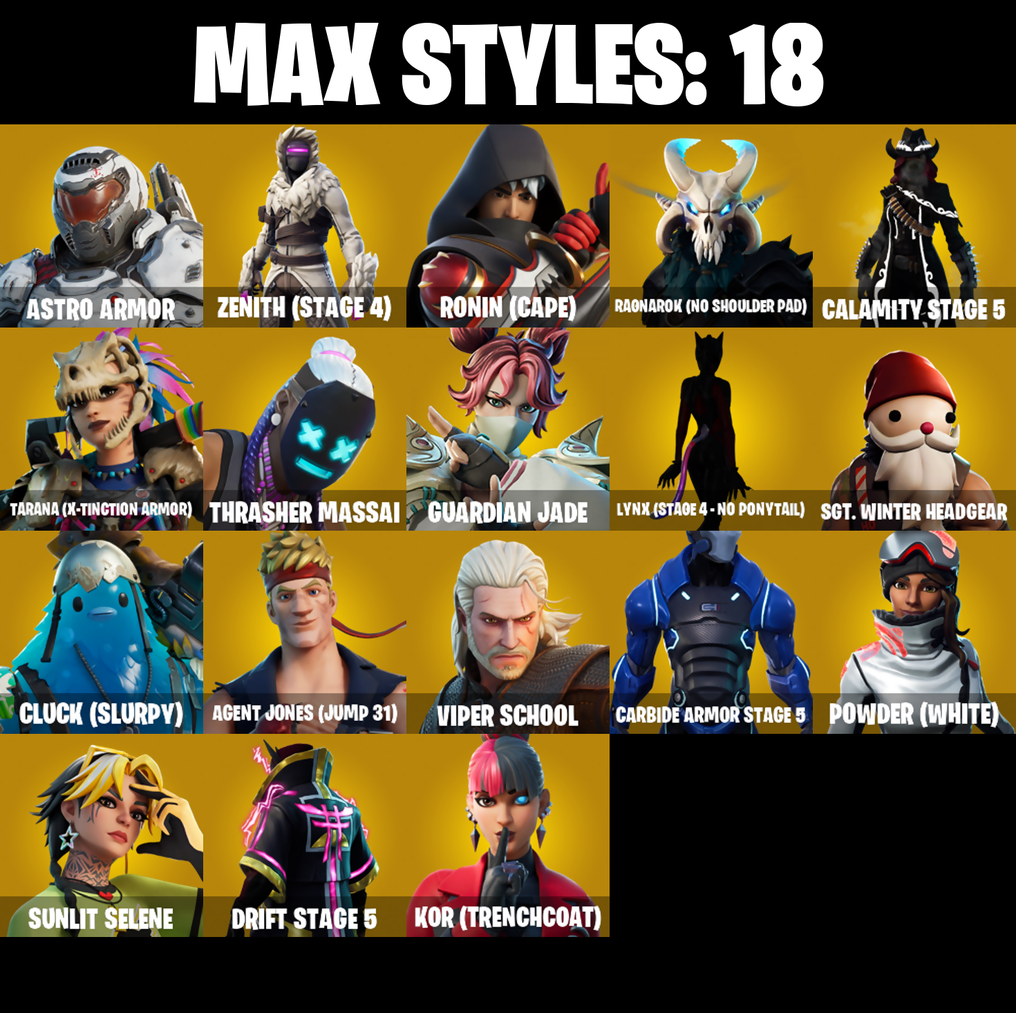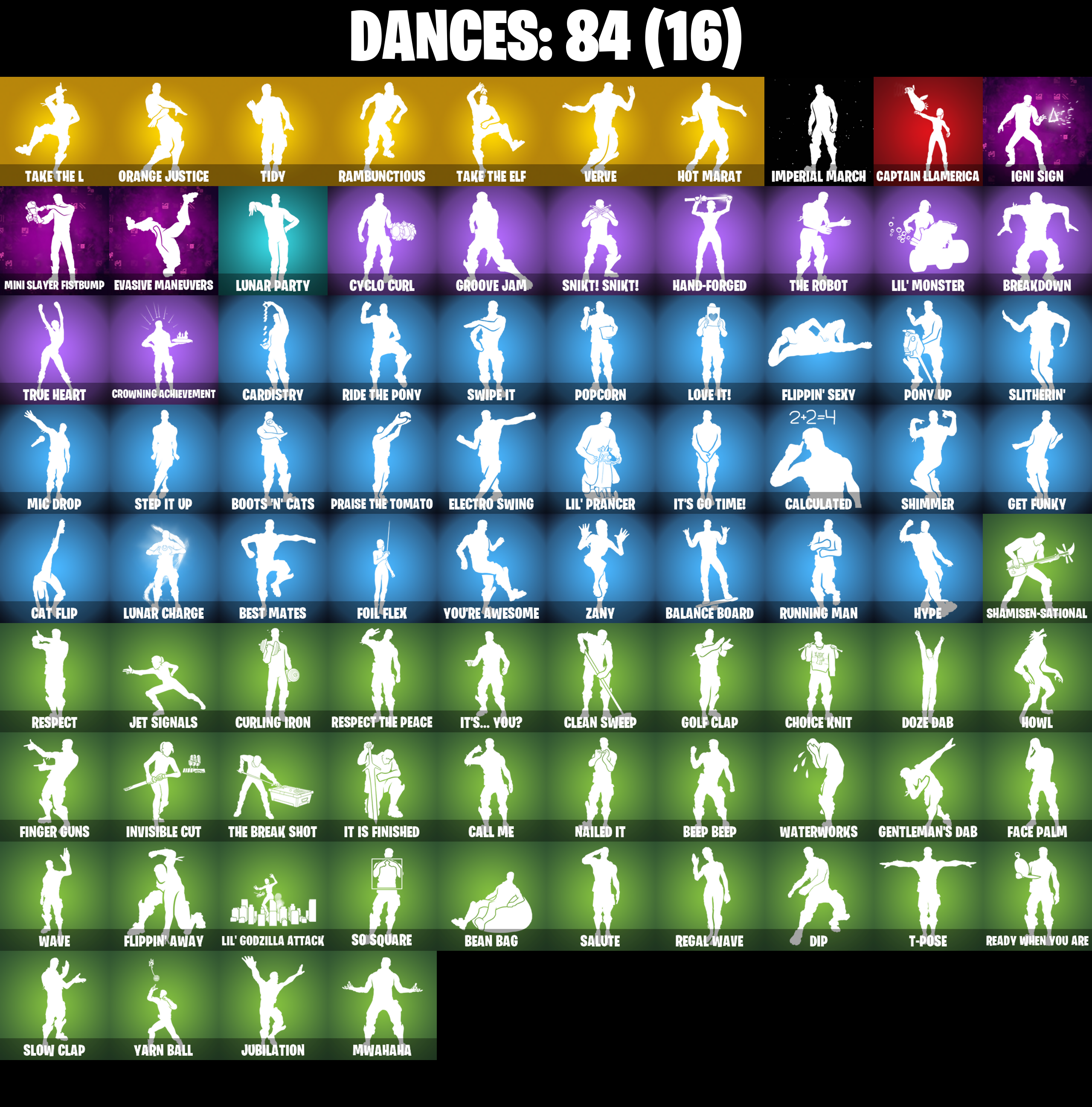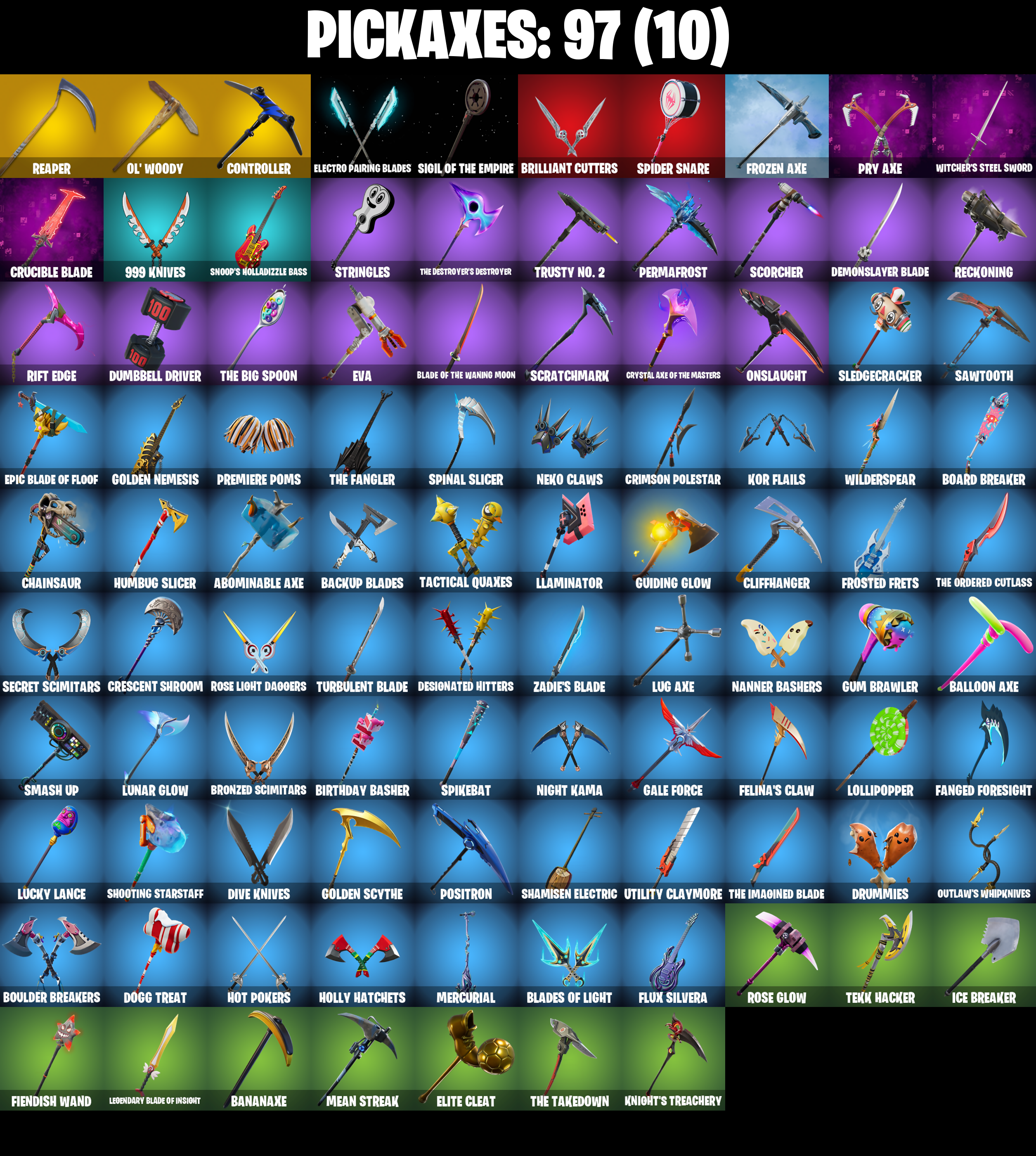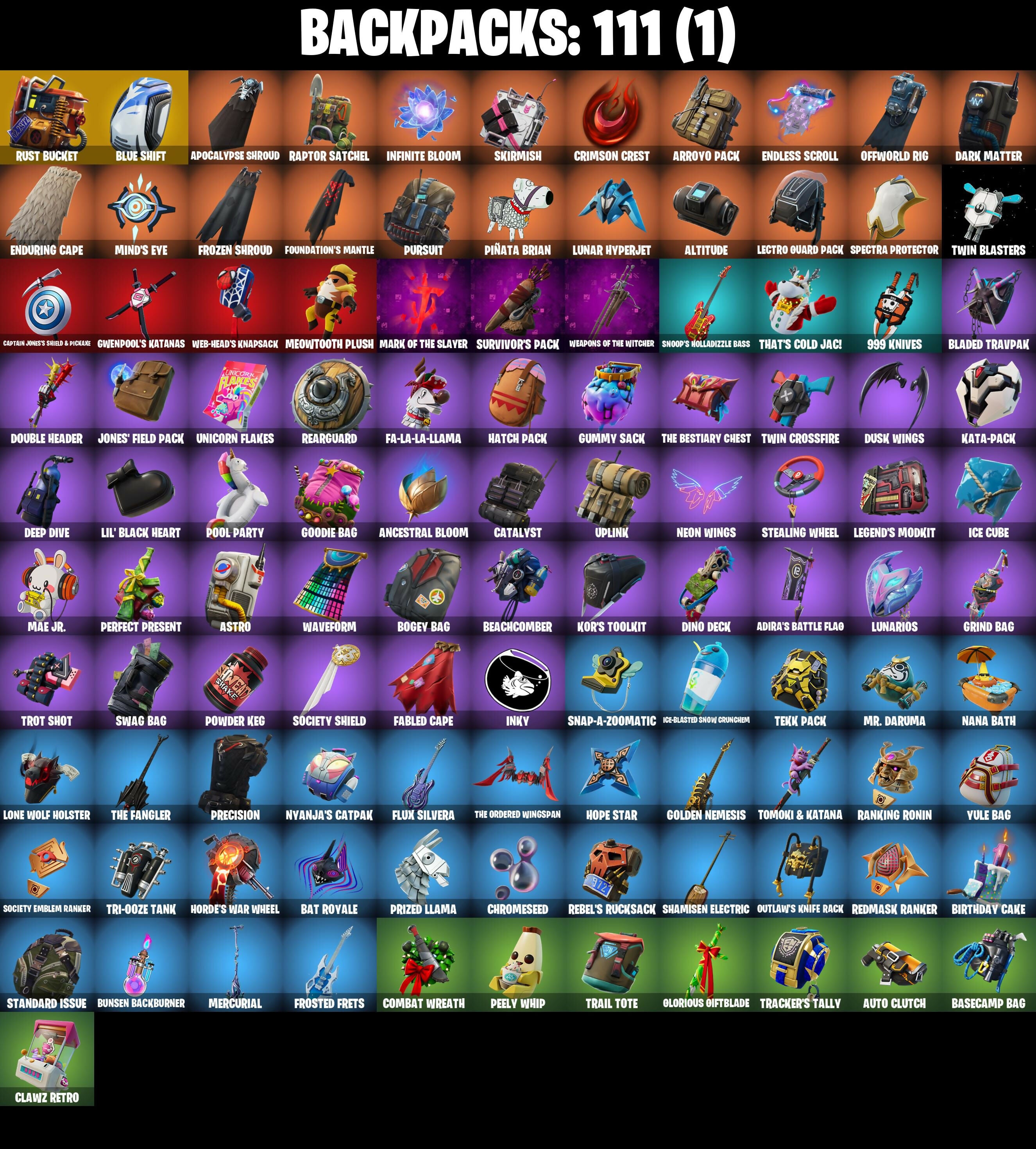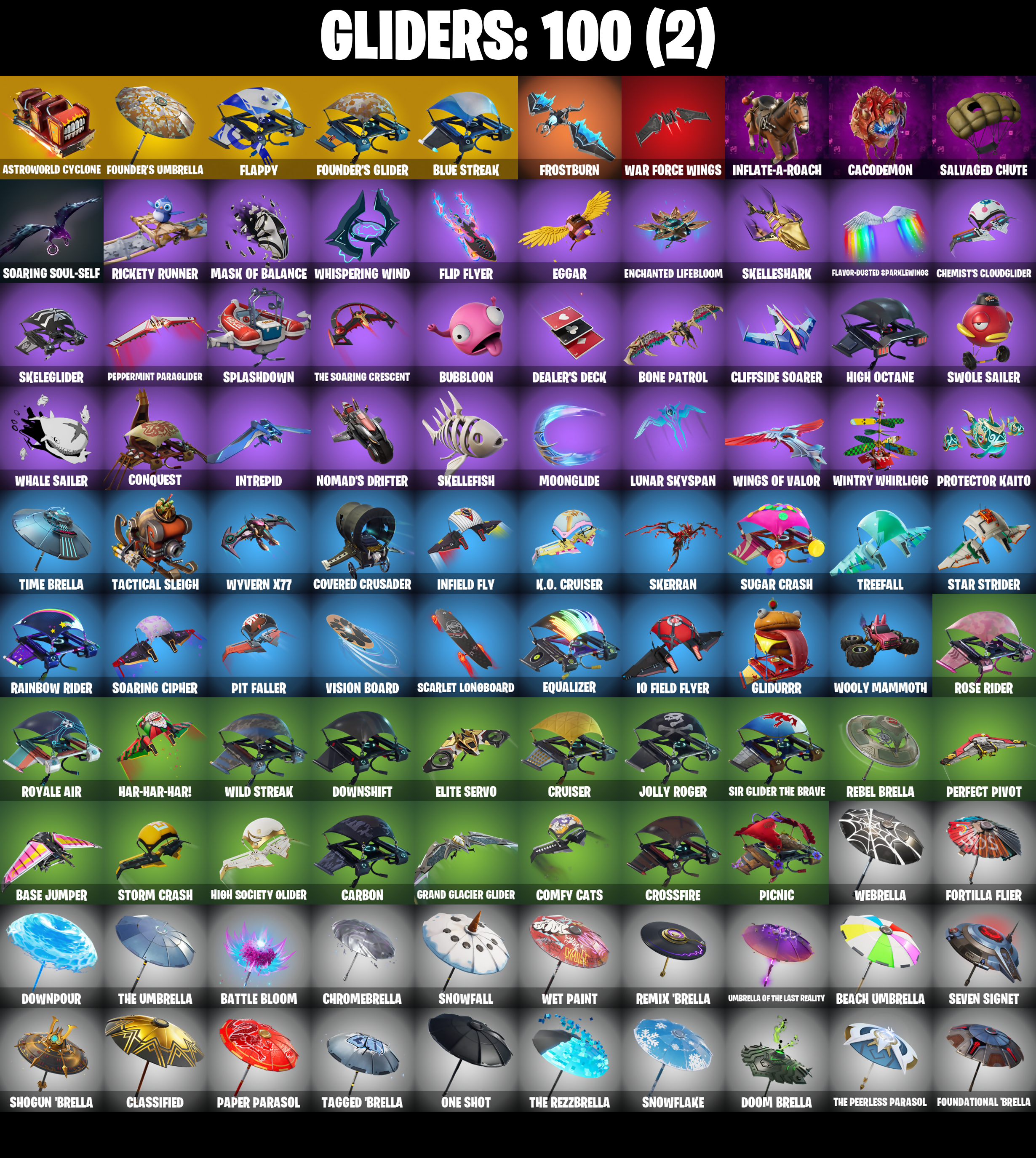 10 Field Flyer, 999 Knives, Abominable Axe, Adira's Battle Flag, Agent Jones, Agent Jones (Jump 31), Altitude, Ancestral Bloom, Apocalypse Shroud, Arctic Adeline, Arroyo Pack, Astro, Astro Armor, Astroworld Cyclone, Auto Clutch, Backup Blades, Balance Board, Balloon Axe, Bananaxe, Base Jumper, Basecamp Bag, Bat Royale, Battle Bloom, Battlehawk, Beach Umbrella, Beachcomber, Bean Bag, Beep Beep, Best Mates, Birthday Basher, Birthday Cake, Blade Of The Waning Moon, Bladed Travpak, Blades Of Light, Blue Shift, Blue Streak, Blue Striker, Blue Team Leader, Board Breaker, Bogey Bag, Bone Patrol, Boots 'N' Cats, Boulder Breakers, Breakdown, Brilliant Cutters, Brite Bomber, Bronzed Scimitars, Bubbloon, Bullseye, Bunsen Backburner, Cacodemon, Calamity, Calamity Stage 5, Calculated, Call Me, Captain Jones's Shield & Pickaxe, Captain Llamerica, Carbide, Carbide Armor Stage 5, Carbon, Cardistry, Cat Flip, Catalyst, Chainsaur, Charlotte, Chemist's Cloudglider, Choice Knit, Chrombrella, Chrome Punk, Chromeseed, Classified, Clawz Retro, Clean Sweep, Cliffhanger, Cliffside Soarer, Cluck, Cluck (Slurpy), Combat Wreath, Comfy Cats, Commando, Conquest, Controller, Covered Crusader, Crescent Shroom, Crimson Crest, Crimson Polestar, Crossfire, Crowning Achievement, Crucible Blade, Cruiser, Crystal Axe Of The Masters, Curling Iron, Cyclo Curl, DJ Yonder, Dark Matter, Dark Voyager, Dealer's Deck, Deep Dive, Demonslayer Blade, Designated Hitters, Dino Deck, Dip, Dive Knives, Dogg Treat, Doom Brella, Doom Slayer, Double Header, Downpour, Downshift, Doze Dab, Drift, Drift Stage 5, Drummies, Dumbbell Driver, Dusk, Dusk Wings, Dusty, Eggar, Electro Pairing Blades, Electro Swing, Elite Agent, Elite Cleat, Elite Servo, Enchanted Lifebloom, Endless Scroll, Enduring Cape, Epic Blade Of Floof, Equalizer, Eva, Evasive Maneuvers, Fa-La-La-Llama, Fabio Sparklemane, Fable, Fabled Cape, Face Palm, Fanged Foresight, Felina, Felina's Claw, Fiendish Wand, Finger Guns, Flappy, Flavor-Dusted Sparklewings, Flip Flyer, Flippin' Away, Flippin' Sexy, Flux Silvera, Foil Flex, Fortilla Flier, Foundational 'Brella, Foundation’s Mantle, Founder's Glider, Founder's Umbrella, Frostburn, Frosted Frets, Frozen Axe, Frozen Shroud, Gale Force, Gentleman's Dab, Geralt of Rivia, Get Funky, Giddy-Up, Glidurr, Golden Nemesis, Golden Scythe, Golf Clap, Goodie Bag, Grand Glacier Glider, Grind Bag, Groove Jam, Guardian Jade, Guiding Glow, Gum Brawler, Gumbo, Gummy Sack, Gwenpool’s Katanas, Hand-Forged, Har-Har-Har!, Harlowe, Hatch Pack, Haven, High Octane, High Society Glider, Holiday Boxy, Holly Hatchets, Hope Star, Horde’s War Wheel, Hot Marat, Hot Pokers, Howl, Humbug Slicer, Huntress, Hype, Ice Breaker, Ice Cube, Ice-Blasted Snow Crunch'em, Igni Sign, Imperial March, Infield Fly, Infinite Bloom, Inflate-A-Roach, Inky, Intrepid, Invisible Cut, It Is Finished, It's Go Time!, It's... You?, Jade, Jet Signals, Jolly Roger, Jones’ Field Pack, Jubilation, K.O. Cruiser, Kata-Pack, Kendo, Knight's Treachery, Kor, Kor (Trenchcoat), Kor Flails, Kor's Toolkit, Krisabelle, Lara Croft, Lectro Guard Pack, Legend's Modkit, Legendary Blade Of Insight, Lil' Black Heart, Lil' Godzilla Attack, Lil' Monster, Lil' Prancer, Llaminator, Lollipopper, Lone Wolf Holster, Love It!, Lt. John Llama, Lucky Lance, Lug Axe, Lunar Charge, Lunar Glow, Lunar Hyperjet, Lunar Party, Lunar Skyspan, Lunarios, Lynx, Lynx (Stage 4 - No Ponytail), Mae Jr., Magnus, Mark Of The Slayer, Mask Of Balance, Massai, Mean Streak, Meowtooth Plush, Mercurial, Mic Drop, Mind's Eye, Mini Slayer Fistbump, Mission Specialist, Moonglide, Moonwalker, Mr. Daruma, Mwahaha, Nailed It, Nana Bath, Nanner Bashers, Neko Claws, Neon Wings, Nezumi, Night Kama, Nitelite, Nog Ops, Nomad's Drifter, Nyanja, Nyanja’s Catpak, Offworld Rig, Ol' Woody, Olorious Giftblade, Omega, One Shot, Onslaught, Orange Justice, Outlaw's Whipknives, Outlaw’s Knife Rack, Paper Parasol, Peely Whip, Peppermint Paraglider, Perfect Pivot, Perfect Present, Permafrost, Picnic, Pit Faller, Piñata Brian, Pony Up, Pool Party, Popcorn, Positron, Powder, Powder (White), Powder Keg, Praise The Tomato, Precision, Premiere Poms, Prized Llama, Protector Kaito, Pry Axe, Pursuit, Ragnarok, Ragnarok (No Shoulder Pad), Rainbow Rider, Rambunctious, Ranking Ronin, Raptor, Raptor Satchel, Raz, Ready When You Are, Reaper, Rearguard, Rebel Brella, Rebel’s Rucksack, Reckoning, Redline, Redmask Ranker, Regal Wave, Remix 'Brella, Respect, Respect The Peace, Rickety Runner, Ride The Pony, Rift Edge, Rogue Agent, Ronin, Ronin (Cape), Rook, Rose Glow, Rose Light Daggers, Rose Rider, Rose Team Leader, Royale Air, Running Man, Runway Racer, Rust Bucket, Rust Lord, Salute, Salvaged Chute, Santa Dogg, Sawtooth, Scarlet Longboard, Scorcher, Scout, Scratchmark, Secret Scimitars, Selene, Seven Signet, Sgt. Green Clover, Sgt. Winter, Sgt. Winter Headgear, Shadow Blade Hope, Shamisen Electric, Shamisen-Sational, Shanta, Shimmer, Shogun 'Brella, Shooting Starstaff, Sigil Of The Empire, Sir Glider The Brave, Skeleglider, Skellefish, Skelleshark, Skerran, Skirmish, Slayer Juice Wrld, Sled Ready Guff, Sledgecracker, Sledgehammer, Slitherin', Slow Clap, Smash Up, Snap-A-Zoomatic, Snikt! Snikt!, Snoop's Holladizzle Bass, Snoop’s Holladizzle Bass, Snowfall, Snowflake, So Square, Soaring Cipher, Soaring Soul-Self, Society Emblem Ranker, Society Shield, Spectra Protector, Spider Snare, Spider-Man, Spikebat, Spinal Slicer, Splashdown, Squad Leader, Standard Issue, Star Strider, Stealing Wheel, Step It Up, Storm Crash, Stringles, Sugar Crash, Sun Strider, Sunlit Selene, Survivor’s Pack, Swag Bag, Swipe It, Swole Sailer, T-Pose, Tactical Quaxes, Tactical Sleigh, Tagged 'Brella, Take The Elf, Take The L, Tarana, Tarana (X-Tinction Armor), Tekk Hacker, Tekk Pack, Teknique, That's Cold Jac!, The Ace, The Bestiary Chest, The Big Spoon, The Break Shot, The Destroyer's Destroyer, The Fangler, The Imagined Blade, The Order, The Ordered Cutlass, The Ordered Wingspan, The Peerl