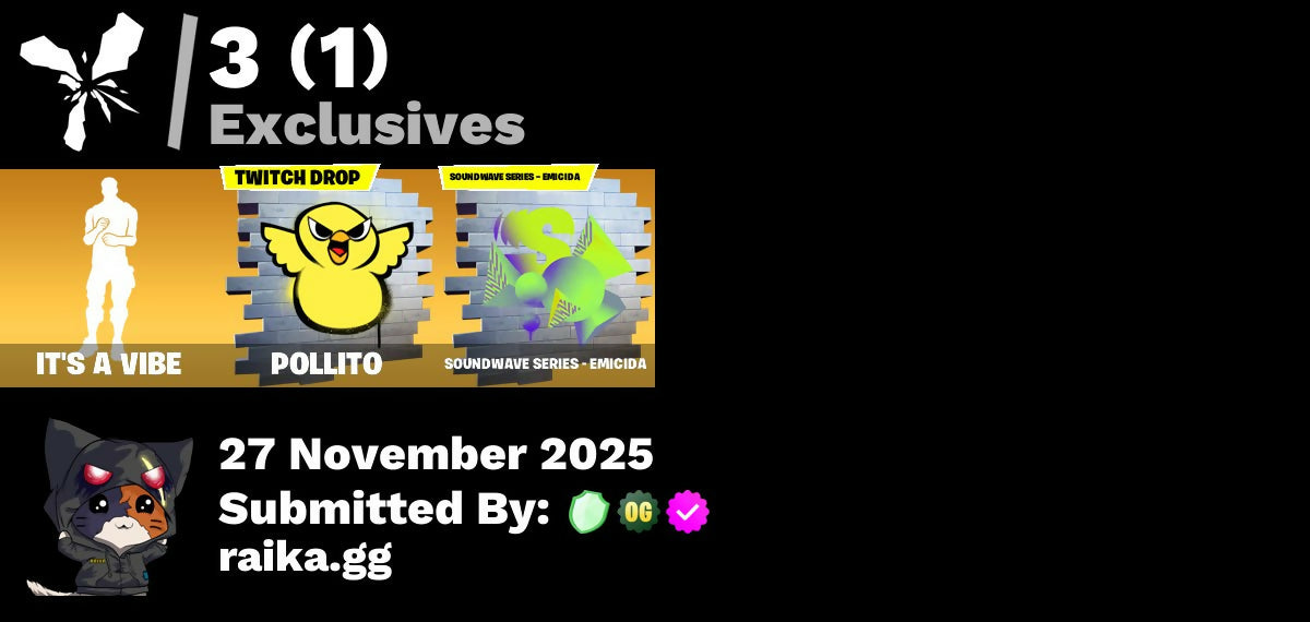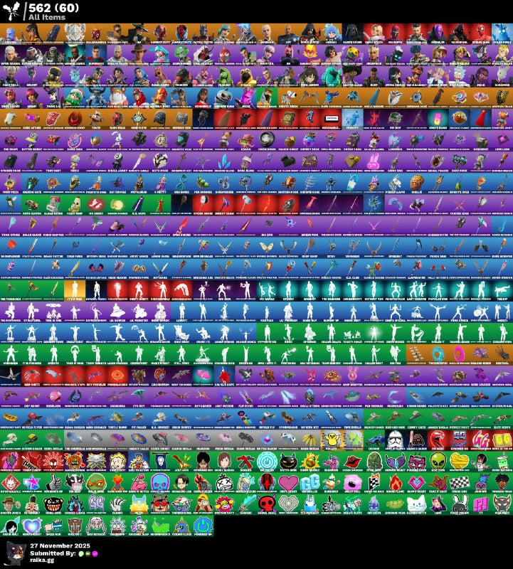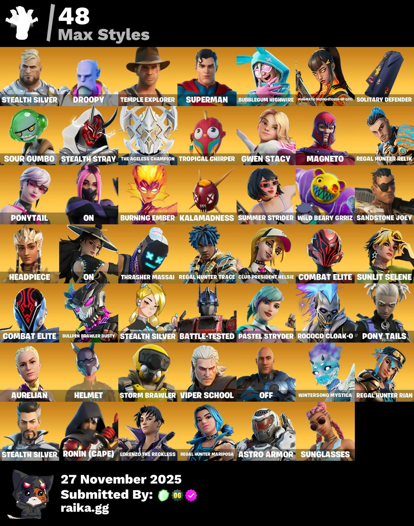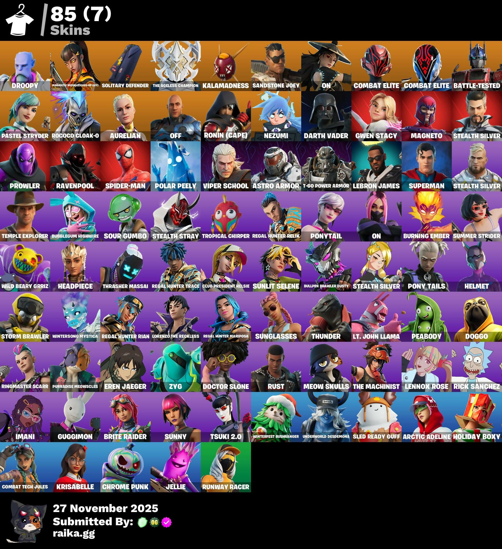 Arctic Adeline, Astro Armor, Aurelian, Battle Hound, Battle-Tested, Beef Boss, Blackheart, Bright Gunner, Brite Raider, Brutus, Bubblegum Highwire, Bullpen Brawler Dusty, Bunker Jonesy, Burning Ember, Burnout, Calamity, Carl "CJ" Johnson, Catalyst, Charlotte, Chomp Sr, Christine, Chrome Punk, Club President Helsie, Cluck, Codebreaker, Combat Elite, Combat Tech Jules, Crystal, DJ Yonder, Dark Bomber, Dark Voyager, Darth Vader, Deadpool, Doctor Doom, Doctor Slone, Doggo, Drift, Droopy, Elite Agent, Ember, Eren Jaeger, Eternal Knight, Eternal Voyager, Fable, Fuse, Galaxia, Groot, Guff, Guggimon, Gwen Stacy, Half Shell, Havoc, Headpiece, Helmet, Highland Warrior, Holiday Boxy, Hollowhead, Huntress, Hybrid, Imani, It's A Vibe, Jellie, Jonesy, Kalamadness, Kondor, Krisabelle, Lebron James, Lennox Rose, Lexa, Looking Glass, Lorenzo The Reckless, Lt. John Llama, Luxe, Lynx, Madmatic Mizu (Cover-Up Off), Magmatic Mizuki (Cover-Up Off), Magneto, Mancake, Master Key, Maverick, Meow Skulls, Midas, Midas Rex, Mogul Master, Molten Battle Hound, Moonwalker, Morty Smith, Munitions Major, Nezumi, Oblivion, Off, Omega, On, Pandora, Pastel Stryder, Peabody, Peely, Phase Shift, Polar Peely, Pollito, Pony Tails, Ponytail, Prowler, Purriadise Meowscles, Ragnarok, Raptor, Ravenpool, Raz, Recon Expert, Red Jade, Red Knight, Red Strike, Redline, Regal Hunter Mariposa, Regal Hunter Relik, Regal Hunter Relix, Regal Hunter Rian, Regal Hunter Trace, Rick Sanchez, Ringmaster Scarr, Rococo Cloak-O, Ronin (Cape), Rox, Ruined, Runway Racer, Rust, Rust Lord, Sandstone Joey, Scorpion, Scuba Jonesy, Shadowbird, Singularity, Siona, Siren, Skull Trooper, Skye, Sled Ready Guff, Sledgehammer, Slone, Solitary Defender, Soundwave Series - Emicida, Sour Gumbo, Sparkle Specialist, Sparkle Supreme, Spider-Man, Spiderweb, Squad Leader, Stealth Silver, Stealth Stray, Storm Brawler, Summer Strider, Summit Seeker, Sun Strider, Sunglasses, Sunlit Selene, Sunny, Superman, T-60 Power Armor, TNTina, Temple Explorer, The Ageless Champion, The Foundation, The Ice King, The Ice Queen, The Machinist, Thor, Thrasher Massai, Thunder, Tilted Teknique, Tony Stark, Trog, Tropical Chirper, Tsuki 2.0, Ultima Knight, Underworld Desdemona, Valor, Viper School, Warpaint, Wedding, Wild Beary Grriz, Winterfest Bushranger, Wintersong Mystica, Wolverine, Wukong, Yond3r, Zenith, Zyg