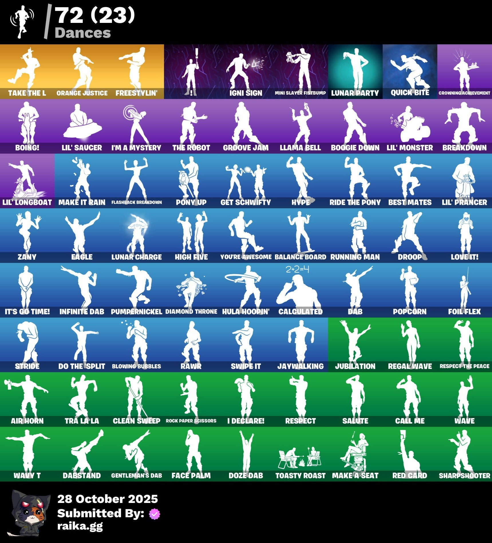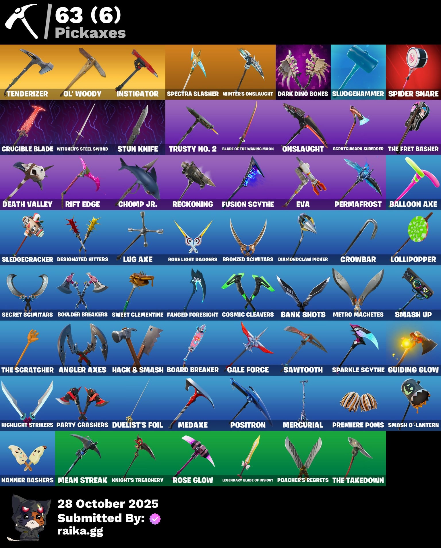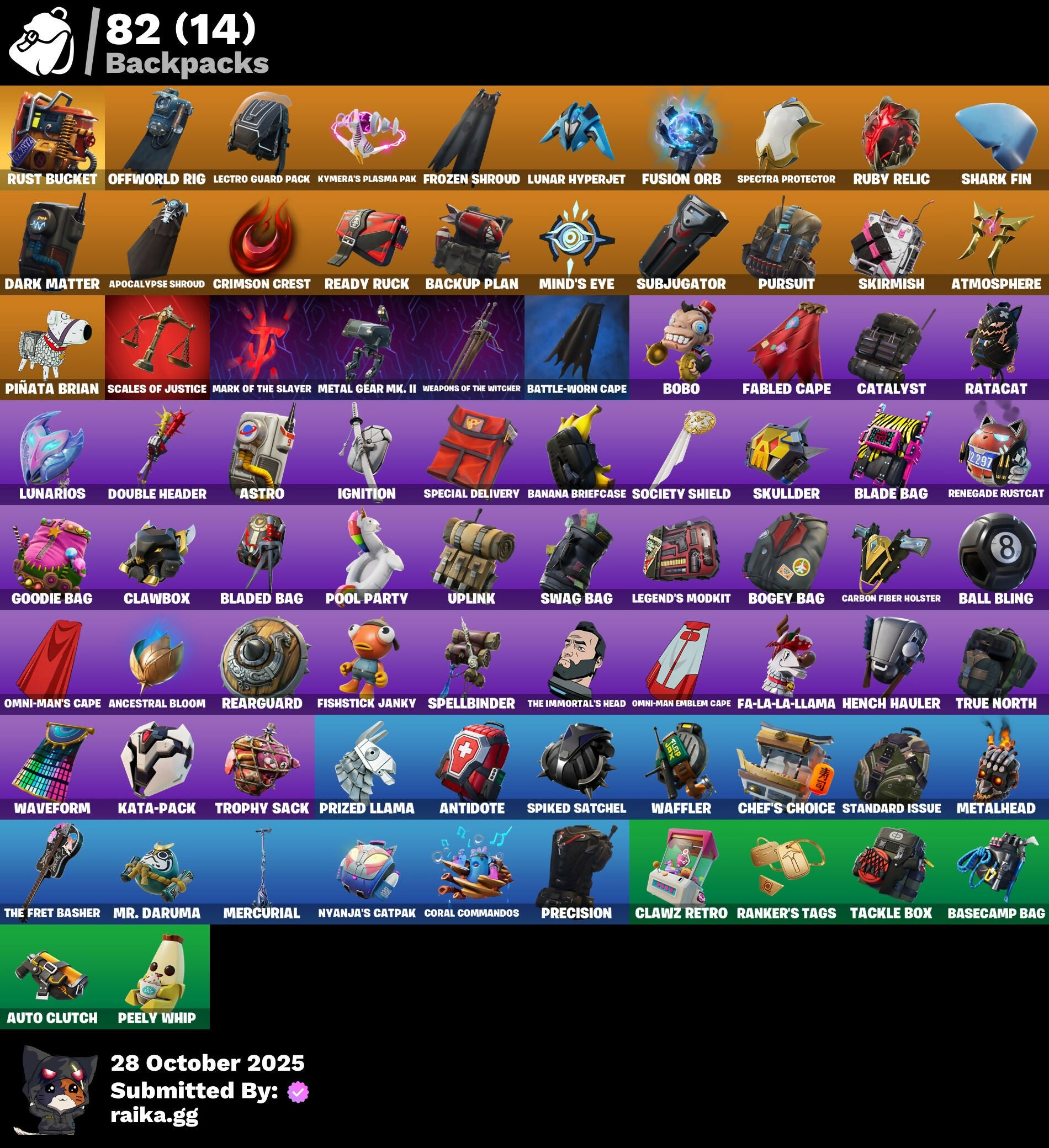 8-Ball vs Scratch, Agent Peely, Air Horn, Ancestral Bloom, Angler Axes, Antidote, Apocalypse Shroud, Arctic Adeline, Astro, Atmosphere, Auto Clutch, Backup Plan, Balance Board, Ball Bling, Balloon Axe, Banana Briefcase, Bank Shots, Base Jumper, Basecamp Bag, Batman Zero, Battle-Worn Cape, Battlehawk, Beach Umbrella, Best Mates, Big Haul, Blade Bag, Blade Of The Waning Moon, Bladed Bag, Blowing Bubbles, Board Breaker, Bobo, Bogey Bag, Boing!, Boogie Down, Boulder Breakers, Breakdown, Bronzed Scimitars, Brutus, Cacodemon, Calamity, Calculated, Call Me, Cameo vs Chic, Carbide, Carbon, Carbon Fiber Holster, Castor, Catalyst, Chef's Choice, Chomp Jr., Chomp Sr., Chromebrella, Clawbox, Clawz Retro, Clean Sweep, Cliffside Soarer, Comfy Cats, Competitor's Time Brella, Conquest, Coral Commandos, Cosmic Cleavers, Covered Crusader, Crazy Eight, Crimson Crest, Crossfire, Crowbar, Crowning Achievement, Crucible Blade, Cruiser, DJ Yonder, Dab, Dabstand, Dark Dino Bones, Dark Matter, Dark Voyager, Death Valley, Deep Space Lander, Designated Hitters, Diamond Throne, Diamondclaw Picker, Do The 'Split, Doom Slayer, Double Header, Downpour, Downshift, Doze Dab, Drift, Droop, Duelist's Foil, Dusty, Eagle, Elite Agent, Enchanted Lifebloom, Enforcer, Eva, Fa-La-La-Llama, Fable, Fabled Cape, Face Palm, Fanged Foresight, Fishstick Janky, Flashback Breakdown, Flip Flyer, Foil Flex, Foundational 'Brella, Founder's Glider, Founder's Umbrella, Freestylin', Frostburn, Frozen Shroud, Fusion, Fusion Coil, Fusion Orb, Fusion Scythe, Gale Force, Gear Specialist Maya, Gentleman's Dab, Geralt of Rivia, Get Schwifty, Giddy-Up, Goodie Bag, Grand Glacier Glider, Groove Jam, Guiding Glow, Hack & Smash, Har-Har-Har!, Havoc, Hench Hauler, High Five, High Octane, High Society Glider, Highlight Strikers, Hope, Hula Hoopin', Huntress, Hype, I Declare!, I'm A Mystery, Igni Sign, Ignition, Infield Fly, Infinite Dab, Inflate-A-Roach, Instigator, Intrepid, Invasion, It's Go Time!, Jaywalking, Journey vs Hazard, Jubilation, Jumpshot, Junk Bucket, Kata-Pack, Knight's Treachery, Kymera, Kymera's Plasma Pak, Lectro Guard Pack, Legend's Modkit, Legendary Blade Of Insight, Lil Split, Lil' Longboat, Lil' Monster, Lil' Prancer, Lil' Saucer, Llama Bell, Lollipopper, Love It!, Lug Axe, Lunar Charge, Lunar Hyperjet, Lunar Party, Lunar Skyspan, Lunarios, Make A Seat, Make It Rain, Mark of the Slayer, Massai, Master Mix, Mean Streak, Medaxe, Mercurial, Metal Gear Mk. II, Metalhead, Metalmark, Metro Machetes, Mighty Marvel 'Brella, Mind's Eye, Mini Slayer Fistbump, Mission Specialist, Montague, Moonglide, Moonwalker, Mr. Daruma, Nanner Bashers, Nezumi, Nisha, Nyanja's Catpak, Offworld Rig, Ol' Woody, Omega, Omegarok, Omni-Man, Omni-Man Emblem Cape, Omni-Man's Cape, Onslaught, Orange Justice, Oscar, Paper Parasol, Party Crashers, Peely Whip, Permafrost, Peter Griffin, Petercopter, Picnic, Pinata Brian, Poacher's Regrets, Pony Up, Pool Party, Popcorn, Positron, Precision, Premiere Poms, Prized Llama, Pumpernickel, Pursuit, Quick Bite, Ragnarok, Raider's Wayfarer, Rainbow Rider, Ranker's Tags, Ratacat, Ratacat Roamer, Rawr, Ready Ruck, Rearguard, Rebel Brella, Reckoning, Red Card, Red Strike, Redline, Regal Wave, Remedy vs Toxin, Renegade Lynx, Renegade Rustcat, Respect, Respect The Peace, Ride The Pony, Rift Edge, Rift Rider, Rippley vs Sludge, Rock Paper Scissors, Rogue Agent, Ronin, Rook, Rose Glow, Rose Light Daggers, Rose Rider, Rose Team Leader, Ruby Relic, Running Man, Runway Racer, Rust Bucket, Rust Lord, Salute, Salvaged Chute, Sawtooth, Scales of Justice, Scratchmark Shredder, Secret Scimitars, Selene, Seven Signet, Shanta, Shark Fin, Sharpshooter, Skerran, Skirmish, Skullder, Sky Trawler, Sled Ready Guff, Sledgecracker, Sledgehammer, Slider, Slipstream, Sludgehammer, Smash O'-Lantern, Smash Up, Snowflake, Society Shield, Solid Snake, Sorana, Sparkle Scythe, Sparkle Strider, Special Delivery, Spectra Knight, Spectra Protector, Spectra Slasher, Spellbinder, Spider Snare, Spiked Satchel, Splashdown, Spray Sail, Squad Leader, Standard Issue, Stride, Stun Knife, Sub Commander, Subjugator, Sugar Crash, Sun Strider, Sundae Glider, Sunny, Sushi Master, Swag Bag, Sweet Clementine, Swipe It, Tackle Box, Tagged 'Brella, Take The L, Teknique, Tenderizer, The Ace, The Fret Basher, The Immortal's Head, The McG, The Peerless Parasol, The Reaper, The Robot, The Scratcher, The Soaring Crescent, The Takedown, The Umbrella, The Visitor, Tilted Teknique, Time Brella, Toasty Roast, Tomatohead, Tra La La, Trailblazer, Triggerfish, Trophy Sack, True North, Trusty No. 2, Turk vs Riptide, Uplink, Valeria, Valor, Vengeance Jones, Victory Vaunter, Waffler, Warpaint, Wave, Waveform, Wavy T, Weapons of the Witcher, Webrella, Wet Paint, Whispering Wind, Whiteout, Wild Streak, Wingman, Wings of Valor, Winter's Onslaught, Wintry Whirligig, Witcher's Steel Sword, X, X-Lord, Yond3r, You're Awesome, Zany, Zoey