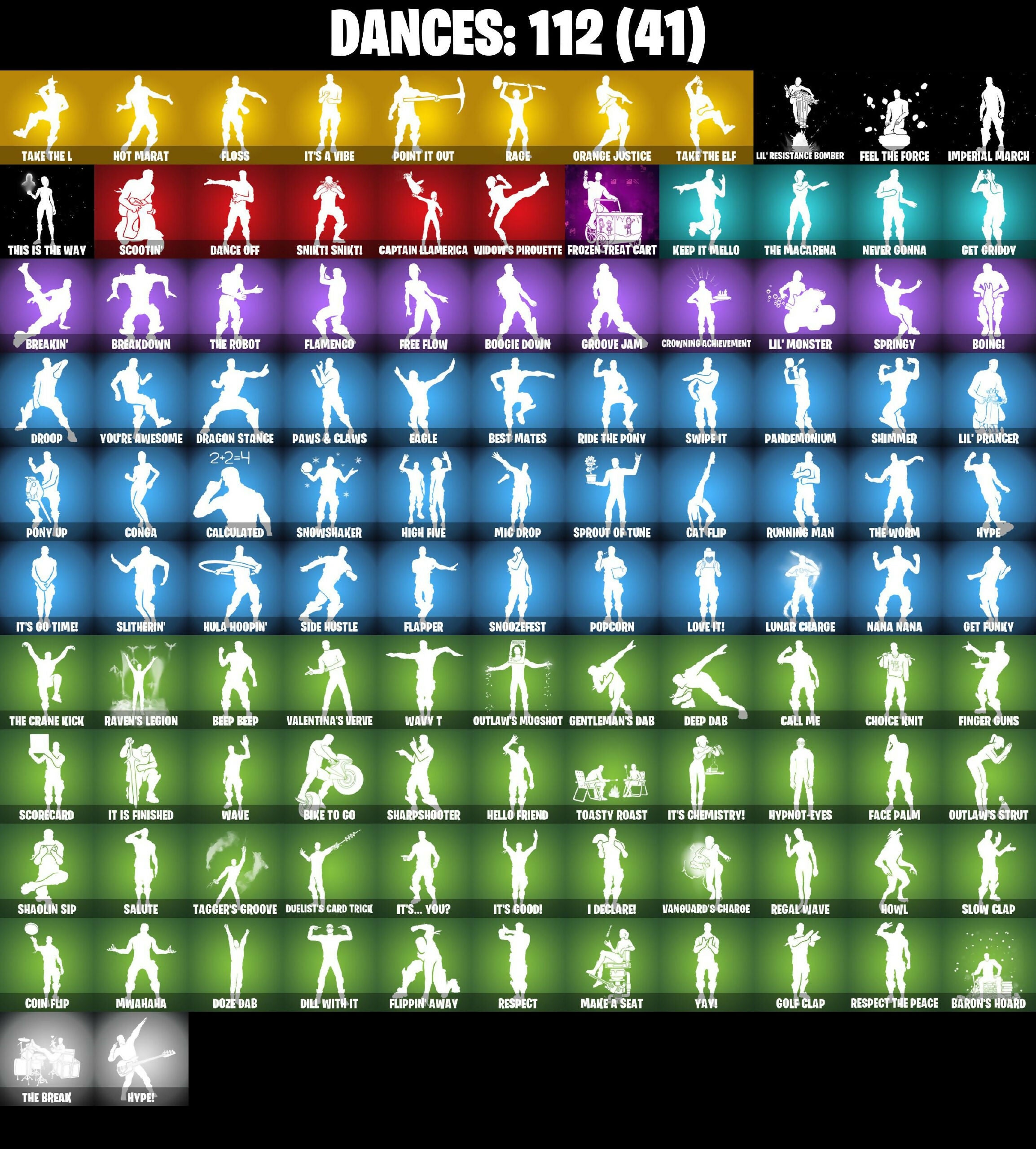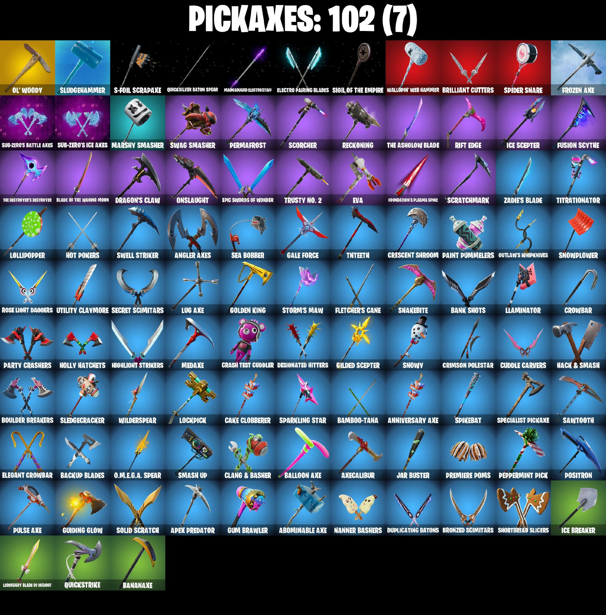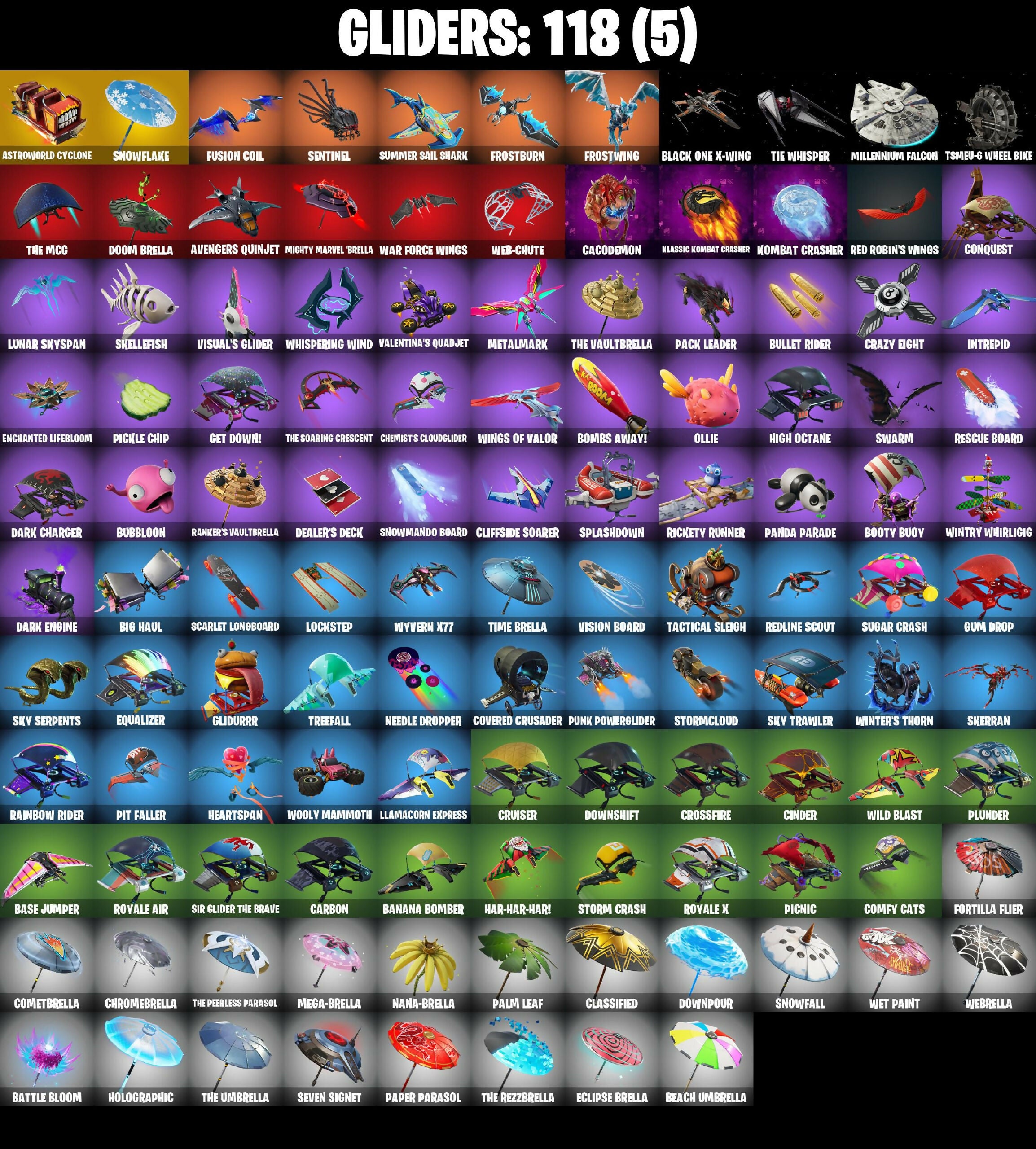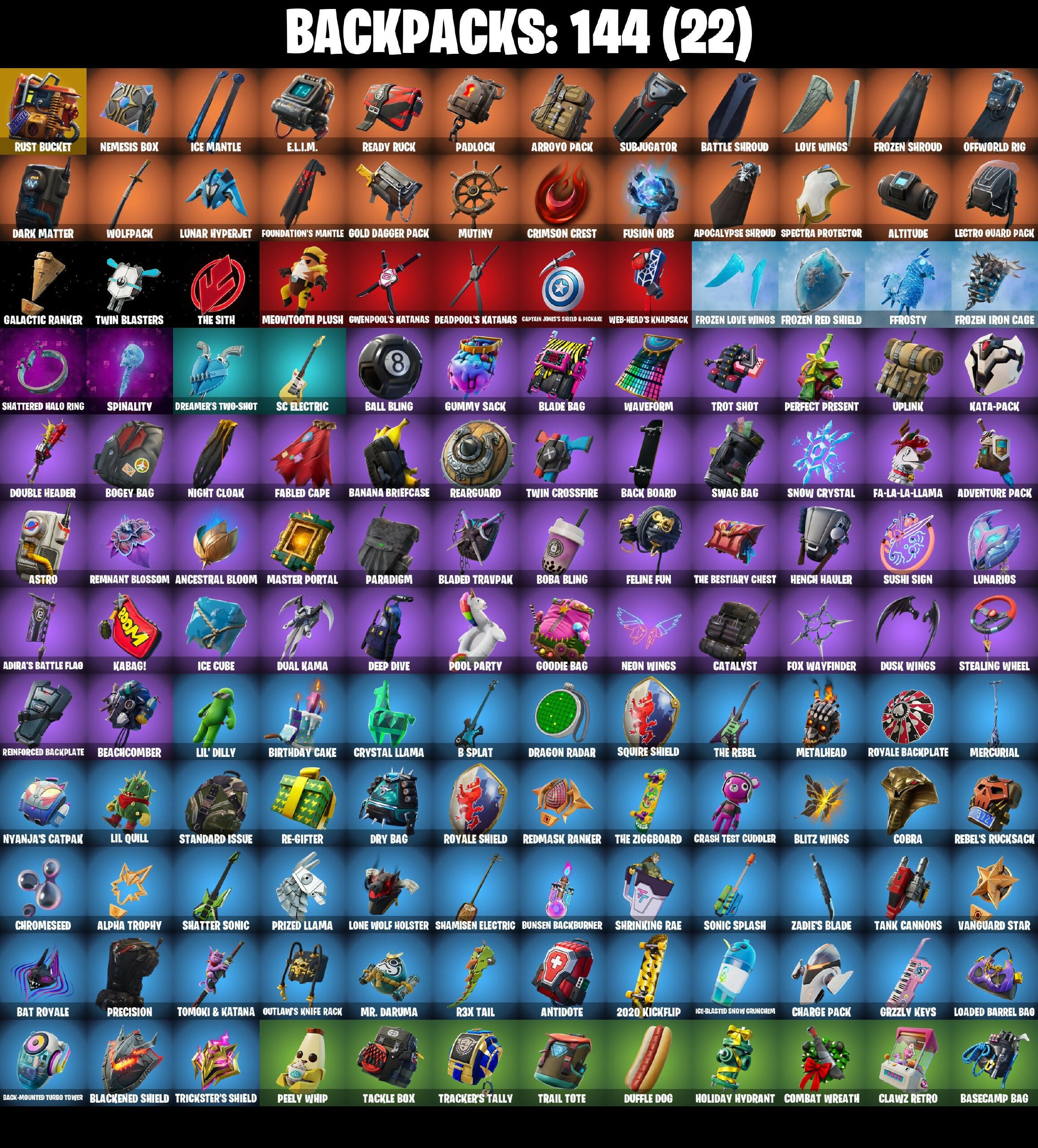 2020 Kickflip, 8-Ball VS Scratch, A.I.M., Abominable Axe, Adira's Battle Flag, Adventure Pack, Agent Peely, Alpha Trophy, Altitude, Ancestral Bloom, Angler Axes, Anniversary Axe, Antidote, Apex Predator, Apocalypse Shroud, Apprentice Evie, Archetype, Arctic Adeline, Arroyo Pack, Assault Trooper, Astro, Astroworld Cyclone, Avengers Quinjet, Axecalibur, B Splat, Back Board, Back-Mounted Turbo Tower, Backup Blades, Ball Bling, Balloon Axe, Bamboo-Tana, Banana Bomber, Banana Briefcase, Bananaxe, Bank Shots, Baron's Hoard, Base Jumper, Basecamp Bag, Bat Royale, Battle Bloom, Battle Bus Balloon, Battle Shroud, Battlehawk, Beach Umbrella, Beachcomber, Beep Beep, Best Mates, Bi-Han, Big Dill, Big Haul, Bike To Go, Birthday Cake, Black One X-Wing, Black Werewolf, Blackened Shield, Blackheart, Blade Bag, Blade of the Waning Moon, Bladed Travpak, Blitz Wings, Blue Squire, Boba Bling, Bogey Bag, Boing!, Bombs Away!, Boogie Down, Booty Buoy, Boulder Breakers, Breakdown, Breakin', Brilliant Cutters, Bronzed Scimitars, Bubbbloon, Bullet Rider, Bunsen Backburner, Cacodemon, Cake Clobberer, Calamity, Calculated, Call Me, Cameo VS Chic, Captain Jones's Shield & Pickaxe, Captain Llamerica, Carbide, Carbon, Cassidy Quinn, Cat Flip, Catalyst, Charge Pack, Chemist's Cloudglider, Choice Knit, Chrome Punk, Chromebrella, Chromeseed, Cinder, Clang & Basher, Classified, Clawz Retro, Cliffside Soarer, Cobalt, Cobra, Coin Flip, Combat Wreath, Cometbrella, Comfy Cats, Conga, Conquest, Corrupted, Covered Crusader, Crash Test Cuddler, Crazy Eight, Crescent Shroom, Crimson Crest, Crimson Polestar, Crossfire, Crowbar, Crowning Achievement, Cruiser, Crystal Llama, Cuddle Carvers, DJ Yonder, Dance Off, Dark Charger, Dark Engine, Dark Matter, Dark Voyager, Deadpool, Deadpool's Katanas, Deal'em Cassidy Quinn, Dealer's Deck, Deep Dab, Deep Dive, Designated Hitters, Devastator, Dill With It, Dillinoe The Oherk, Dire, Doom Brella, Double Header, Downpour, Downshift, Doze Dab, Dragon Radar, Dragon Stance, Dragon's Claw, Dreamer's Two-Shot, Drift, Droop, Dry Bag, Dual Kama, Duelist's Card Trick, Duffle Dog, Duplicating Batons, Dusk, Dusk Knight, Dusk Wings, E.L.I.M., EVA, Eagle, Eclipse Brella, Electro Pairing Blades, Elegant Crowbar, Elite Agent, Ember, Enchanted Lifebloom, Enforcer, Epic Swords of Wonder, Equalizer, Fa-La-La-Llama, Fable, Fabled Cape, Face Palm, Feel The Force, Feline Fun, Ffrosty, Finger Guns, Flamenco, Flapper, Fletcher Kane, Fletcher's Cane, Flippin' Away, Floss, Fortilla Flier, Foundation's Mantle, Foundation's Plasma Spike, Fox Wayfinder, Free Flow, Frostburn, Frostwing, Frozen Axe, Frozen Iron Cage, Frozen Love Ranger, Frozen Love Wings, Frozen Raven, Frozen Red Knight, Frozen Red Shield, Frozen Shroud, Frozen Treat Cart, Full Moon Fletcher Kane, Fusion, Fusion Coil, Fusion Orb, Fusion Scythe, Galactic Ranker, Gale Force, Gear Specialist Maya, Gentleman's Dab, Get Down!, Get Funky, Get Griddy, Giddy-Up, Gilded Scepter, Glidurrr, Gold, Gold Brutus, Gold Dagger Pack, Gold Midas, Golden King, Golf Clap, Goodie Bag, Grey, Grizzly Keys, Groove Jam, Guiding Glow, Gum Brawler, Gum Drop, Gumbo, Gummy Sack, Gwenpool's Katanas, Hack & Smash, Har-Har-Har!, Harlowe, Haven, Hazard, Headpiece, Heartspan, Hello Friend, Helmet, Hench Hauler, High Five, High Octane, Highlight Strikers, Holiday Hydrant, Holly Hatchets, Holographic, Hot Marat, Hot Pokers, Howl, Hula Hoopin', Huntress, Hybrid, Hype, Hype!, Hypnot-Eyes, I Declare!, Ice Breaker, Ice Cube, Ice Mantle, Ice Scepter, Ice-Blasted Snow Cruncher, Imperial March, Intrepid, It Is Finished, It's A Vibe, It's Chemistry!, It's Go Time!, It's Good!, It's... You?, Jar Buster, Joss, Journey VS Hazard, Kabag!, Kata-Pack, Keep It Mello, Keisha Cross, Kev, Klassic Kombat Crasher, Kombat Crasher, Krisabelle, Kuno, Lectro Guard Pack, Legendary Blade of Insight, Lil Quill, Lil' Dilly, Lil' Monster, Lil' Prancer, Lil' Resistance Bomber, Llamacorn Express, Llaminator, Loaded Barrel Bag, Lockpick, Lockstep, Lollipopper, Lone Wolf Holster, Love It!, Love Ranger, Love Wings, Lt. Evergreen, Lt. John Llama, Lug Axe, Lunar Charge, Lunar Hyperjet, Lunar Skyspan, Lunarios, Lynx, Magnaguard Electrostaff, Make A Seat, Marshy Smasher, Mask Off, Master Key, Master Portal, Medaxe, Mega-Brella, Meowscles, Meowtooth Plush, Mercurial, Metalhead, Metalmark, Mic Drop, Mighty Marvel Brella, Millennium Falcon, Mission Specialist, Moonwalker, Mr. Daruma, Mutiny, Mwahaha, Nana Nana, Nana-Brella, Nanner Bashers, Needle Dropper, Nemesis Box, Neon Wings, Never Gonna, Night Cloak, Nightshade, Nyanja's Catpak, O.M.E.G.A. Spear, Offworld Rig, Ol' Woody, Ollie, Omega, Omen, Onesie, Onslaught, Orange Justice, Outlaw Midas, Outlaw's Knife Rack, Outlaw's Mugshot, Outlaw's Strut, Outlaw's Whipknives, Pack Leader, Padlock, Paint Pummellers, Palm Leaf, Panda Parade, Pandemonium, Paper Parasol, Paradigm, Party Crashers, Paws & Claws, Peely, Peely Whip, Peppermint Pick, Perfect Present, Permafrost, Phthalo Blue Joss, Pickle Chip, Picnic, Pit Faller, Plunder, Poe Dameron, Point It Out, Poised Playmaker, Polar Peely, Pony Up, Pool Party, Popcorn, Positron, Powder, Precision, Premiere Poms, Prized Llama, Pulse Axe, Punk Powerglider, Purple, Quicksilver Baton Spear, Quickstrike, R3X Tail, Rage, Ragnarok, Rainbow Rider, Ranker's Vaultbrella, Raven's Legion, Re-Gifter, Ready Ruck, Rearguard, Rebel's Rucksack, Reckoning, Red Robin's Wings, Redline, Redline Scout, Redmask Ranker, Regal Wave, Reinforced Backplate, Remedy VS Toxin, Remnant Blossom, Rescue Board, Respect, Respect The Peace, Rickety Runner, Ride The Pony, Rift Edge, Rippley VS Sludge, Riptide, Rogue Agent, Ronin, Ronin (Cape), Rook, Rose Light Daggers, Royale Air, Royale Backplate, Royale Knight, Royale Shield, Royale X, Running Man, Rust Bucket, Rust Lord, S-Foil Scrapaxe, SC Electric, Salute, Sawtooth, Scarlet Longboard, Scootin', Scorcher, Scorecard, Scratchmark, Sea Bobber, Secret Scimitars, Sentinel, Seven Signet, Sgt. Winter, Shamisen Electric, Shanta, Shaol