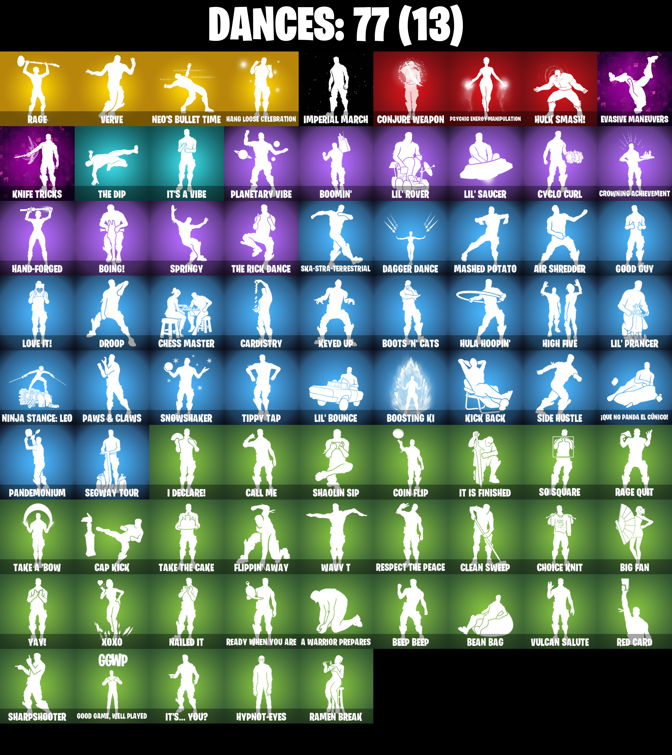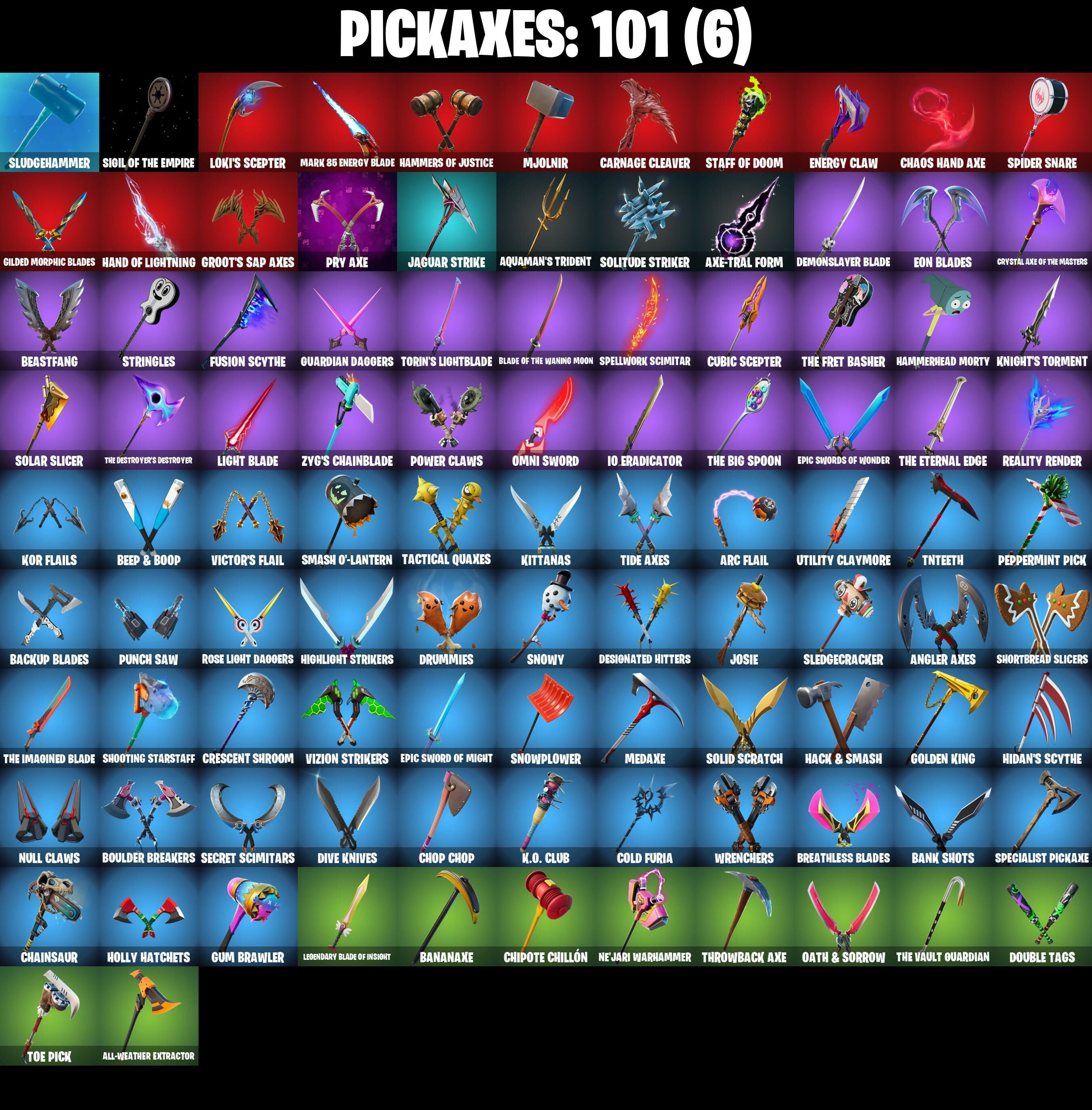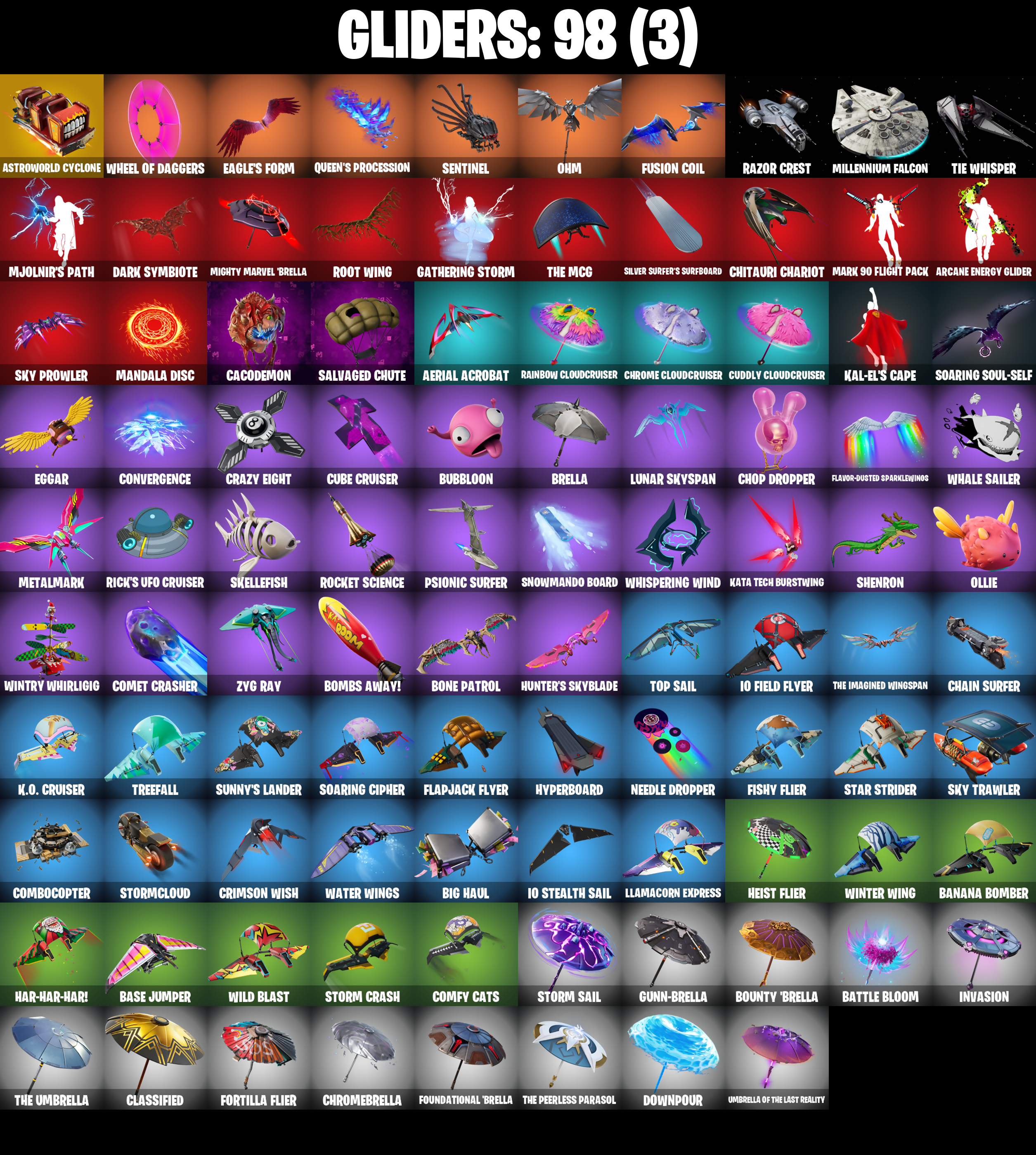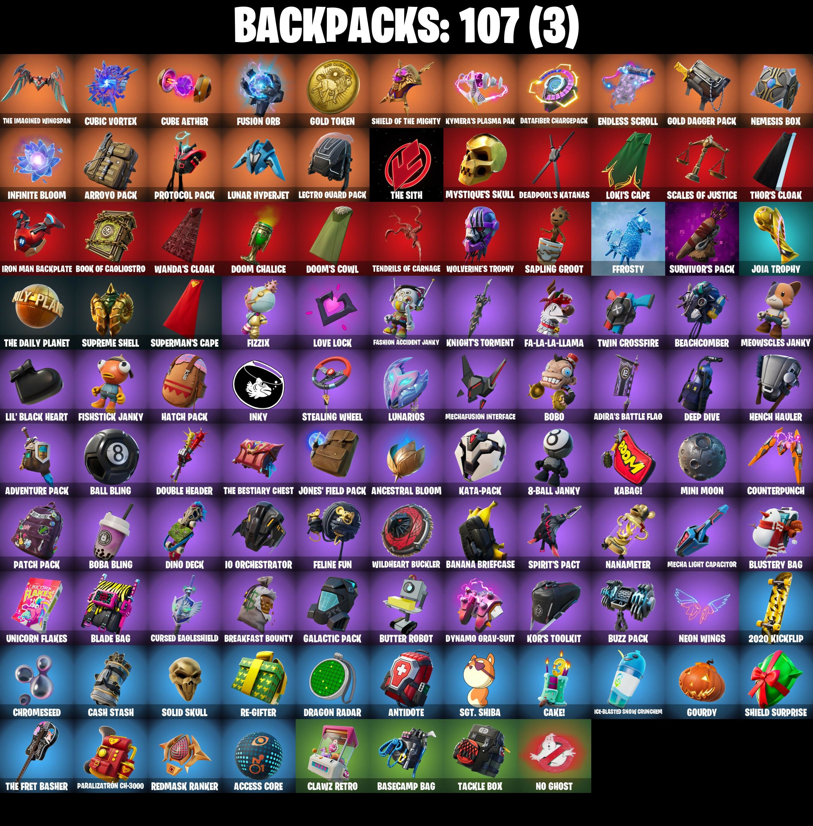 2020 Kickflip, 8-Ball Janky, 8-Ball vs Scratch, A Warrior Prepares, Access Core, Adira's Battle Flag, Adventure Pack, Aerial Acrobat, Agent Jones, Agent Jones (Jump 31), Agent Peely, Air Shredder, All-Weather Extractor, Ancestral Bloom, Angler Axes, Antidote, Aquaman, Aquaman's Trident, Arc Flail, Arcane Energy Glider, Arctic Adeline, Arroyo Pack, Astroworld Cyclone, Axe-Tral Form, Backup Blades, Ball Bling, Banana Bomber, Banana Briefcase, Bananaxe, Bank Shots, Base Jumper, Basecamp Bag, Battle Bloom, Beachcomber, Bean Bag, Beastfang, Beep & Boop, Beep Beep, Big Fan, Big Haul, Blade Bag, Blade Of The Waning Moon, Blustery Bag, Boba Bling, Bobo, Boing!, Bombs Away!, Bone Patrol, Book Of Caoliostro, Boomin', Boosting Ki, Boots 'N' Cats, Boulder Breakers, Bounty 'Brella, Breakfast Bounty, Breathless Blades, Brella, Brutus, Bubbloon, Butter Robot, Buzz Pack, Cacodemon, Cake!, Call Me, Cameo vs Chic, Cap Kick, Cardistry, Carnage, Carnage (Maximum), Carnage Cleaver, Cash Stash, Chain Surfer, Chainsaur, Chaos Hand Axe, Charlotte, Charlotte (Golden Rune), Chess Master, Chipote Chillón, Chitauri Chariot, Choice Knit, Chop Chop, Chop Dropper, Chrome Cloudcruiser, Chromebrella, Chromeseed, Clark Kent, Clark Kent (Superman), Classified, Clawz Retro, Clean Sweep, Cluck, Cluck (Slurpy), Coin Flip, Cold Furia, Combocopter, Comet Crasher, Comfy Cats, Conjure Weapon, Convergence, Counterpunch, Crazy Eight, Crescent Shroom, Crimson Wish, Crowning Achievement, Crystal Axe Of The Masters, Cube Aether, Cube Cruiser, Cubic Scepter, Cubic Vortex, Cuddly Cloudcruiser, Cursed Eagleshield, Cyclo Curl, Dagger Dance, Dark Symbiote, Datafiber Chargepack, Deadpool, Deadpool Unmasked, Deadpool's Katanas, Deep Dive, Demonslayer Blade, Designated Hitters, Dino Deck, Dive Knives, Doctor Doom, Doctor Doom (God Emperor), Doctor Slone, Doctor Strange, Doom Chalice, Doom's Cowl, Double Header, Double Tags, Downpour, Dragon Radar, Droop, Drummies, Dynamo Grav-Suit, Eagle's Form, Eggar, El Chapulín Colorado, Endless Scroll, Energy Claw, Eon Blades, Epic Sword Of Might, Epic Swords Of Wonder, Erisa, Erisa (Stealth Silver), Evasive Maneuvers, Fa-La-La-Llama, Fabio Sparklemane, Fabio Sparklemane (Golden Rune), Fade, Fashion Accident Janky, Feline Fun, Ffrosty, Fishstick Janky, Fishy Flier, Fizzix, Flapjack Flyer, Flavor-Dusted Sparklewings, Flippin' Away, Fortilla Flier, Foundational 'Brella, Fusion, Fusion Coil, Fusion Orb, Fusion Scythe, Galactic Pack, Gathering Storm, Gear Specialist Maya, Gilded Morphic Blades, Gold Blooded Ace, Gold Blooded Ace (Cold Blooded Ace), Gold Dagger Pack, Gold Token, Golden King, Good Game, Well Played, Good Guy, Gourdy, Groot, Groot (Silver Foil), Groot's Sap Axes, Guardian Daggers, Guggimon, Gum Brawler, Gunn-Brella, Gunnar, Hack & Smash, Hammerhead Morty, Hammers Of Justice, Hand Of Lightning, Hand-Forged, Hang Loose Celebration, Happy, Har-Har-Har!, Harley (Always Fantabulous), Harley Quinn, Hatch Pack, Head (Droopy), Heist Flier, Hench Hauler, Hidan's Scythe, High Five, Highlight Strikers, Holly Hatchets, Hula Hoopin', Hulk Smash!, Hunter's Skyblade, Hyperboard, Hypnot-Eyes, I Declare!, Ice-Blasted Snow Crunch'em, Imperial March, Infinite Bloom, Inky, Invasion, Io Eradicator, Io Field Flyer, Io Orchestrator, Io Stealth Sail, Iron Man Backplate, It Is Finished, It's A Vibe, It's... You?, J.B. Chimpanski, J.B. Chimpanski (Helmet), Jaguar Strike, Jennifer Walters, Joey, Joia Trophy, Jones' Field Pack, Josie, Journey vs Hazard, Jules, K.O. Club, K.O. Cruiser, Kabag!, Kal-El's Cape, Kata Tech Burstwing, Kata-Pack, Keyed Up, Kiara K.O., Kiara K.O. (Captain's Bomber), Kick Back, Kit, Kittanas, Knife Tricks, Knight's Torment, Kondor, Kor, Kor (Trenchcoat), Kor Flails, Kor's Toolkit, Krisabelle, Kymera, Kymera's Plasma Pak, Lara Croft, Lectro Guard Pack, Legendary Blade Of Insight, Lexa, Lexa (Warstrike), Light Blade, Lil' Black Heart, Lil' Bounce, Lil' Prancer, Lil' Rover, Lil' Saucer, Llamacorn Express, Loki Laufeyson, Loki's Cape, Loki's Scepter, Love It!, Love Lock, Lt. Evergreen, Lunar Hyperjet, Lunar Skyspan, Lunarios, Mancake, Mandala Disc, Mandalorian, Mark 86 Energy Blade, Mark 90 Flight Pack, Mashed Potato, Masked, Mave, Mave (Reactive Hair Off), Mecha Light Capacitor, Mecha Strike Commander, Mechafusion Interface, Medaxe, Menace, Menace (Challenger Menace - Flame), Meowscles, Meowscles Janky, Metalmark, Midas, Mighty Marvel 'Brella, Millennium Falcon, Mini Moon, Mjolnir, Mjolnir's Path, Mystique, Mystique (Tactical), Mystique's Skull, Nailed It, Nanameter, Ne'jari Warhammer, Needle Dropper, Nemesis Box, Neo's Bullet Time, Neon Wings, Neymar Jr, Neymar Jr (Exhibition), Ninja Stance: Leo, No Ghost, Null Claws, Oath & Sorrow, Ocean, Ohm, Ollie, Omega Knight, Omega Knight (Aurum Eques), Omni Sword, Pandemonium, Paralizatron CH-3000, Patch Pack, Paws & Claws, Peppermint Pick, Planetary Vibe, Polar Peely, Power Claws, Predator, Protocol Pack, Prowler, Pry Axe, Psionic Surfer, Psychic Energy Manipulation, Punch Saw, Queen's Procession, Rachel Roth, Rage, Rage Quit, Rainbow Cloudcruiser, Ramen Break, Raz, Razor Crest, Re-Gifter, Ready When You Are, Reality Render, Rebirth Raven, Red Card, Redmask Ranker, Reese, Remedy vs Toxin, Respect The Peace, Rick Sanchez, Rick's Ufo Cruiser, Rippley vs Sludge, Riptide, Rocket Science, Root Wing, Rose Light Daggers, Salvaged Chute, Sandstone Joey, Sapling Groot, Scales Of Justice, Scarlet Witch, Scratch (Virus), Scuba Jonesy, Secret Scimitars, Segway Tour, Sentinel, Sgt. Shiba, Shaolin Sip, Sharpshooter, Shenron, Shield Of The Mighty, Shield Surprise, Shooting Starstaff, Shortbread Slicers, Side Hustle, Sigil Of The Empire, Silver Surfer's Surfboard, Siona, Ska-Stra-Terrestrial, Skellefish, Sky Prowler, Sky Trawler, Skye, Sled Ready Guff, Sledgecracker, Sludgehammer, Smash O'-Lantern, Snowmando, Snowmando Board, Snowplower, Snowshaker, Snowy, So Square, Soaring Cipher, Soaring Soul-Self, Solar Slicer, Solid Scratch, Solid Skull, Solitude Striker, Southpaw, So