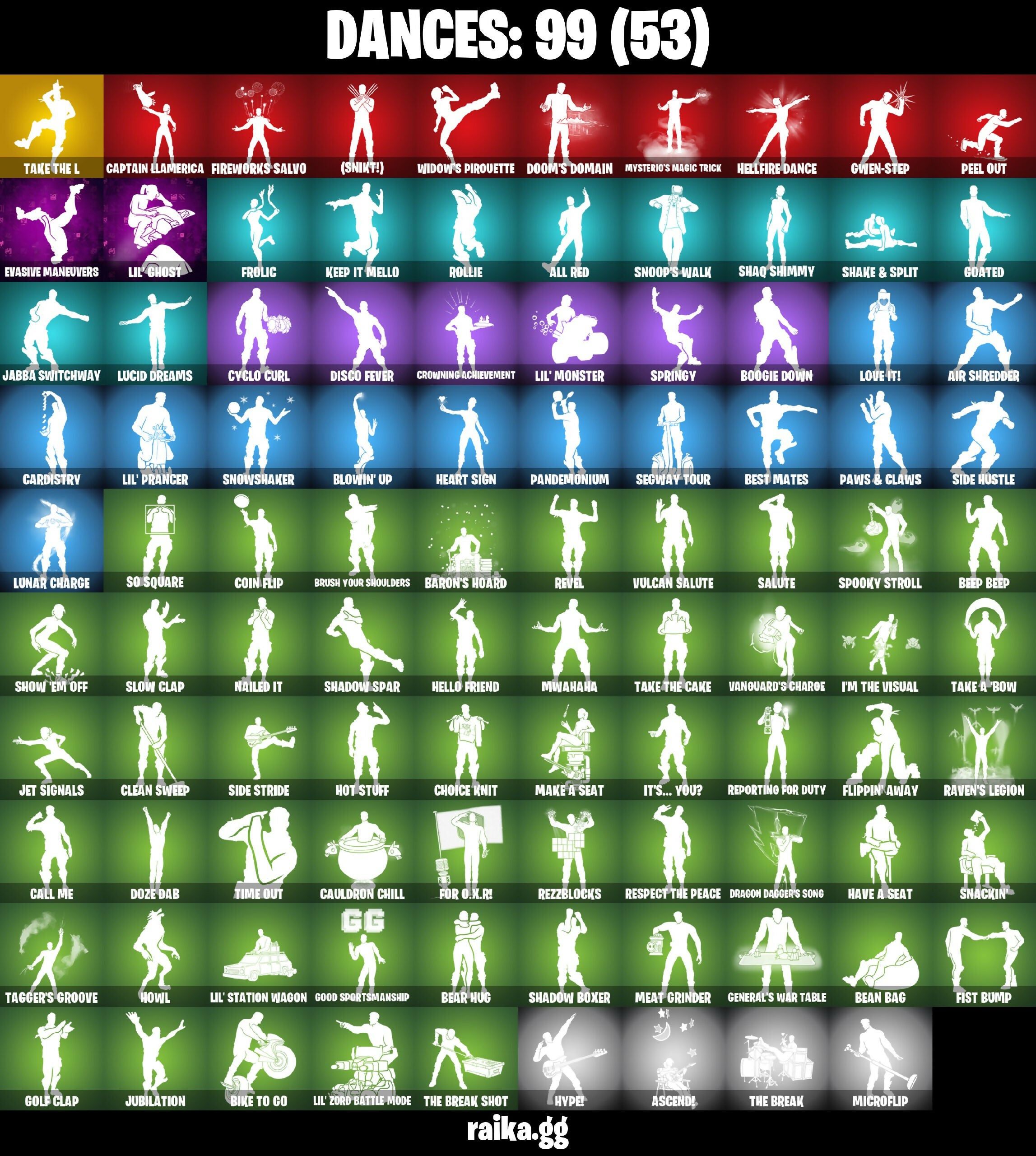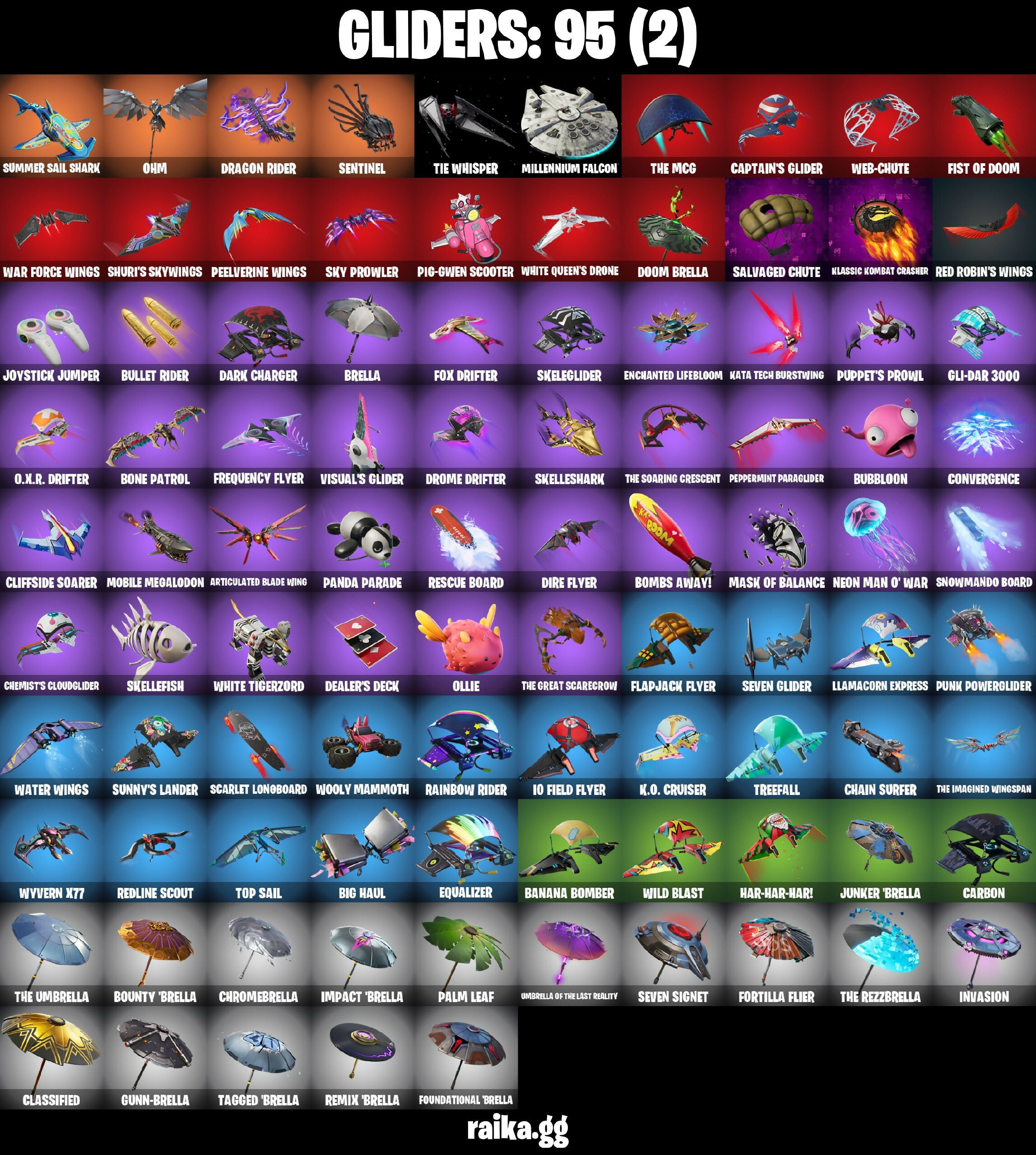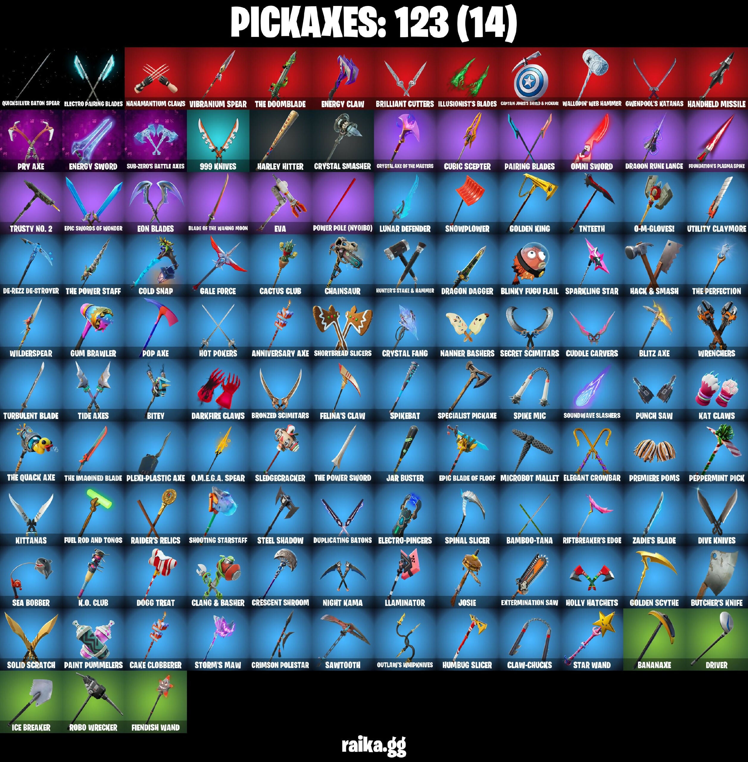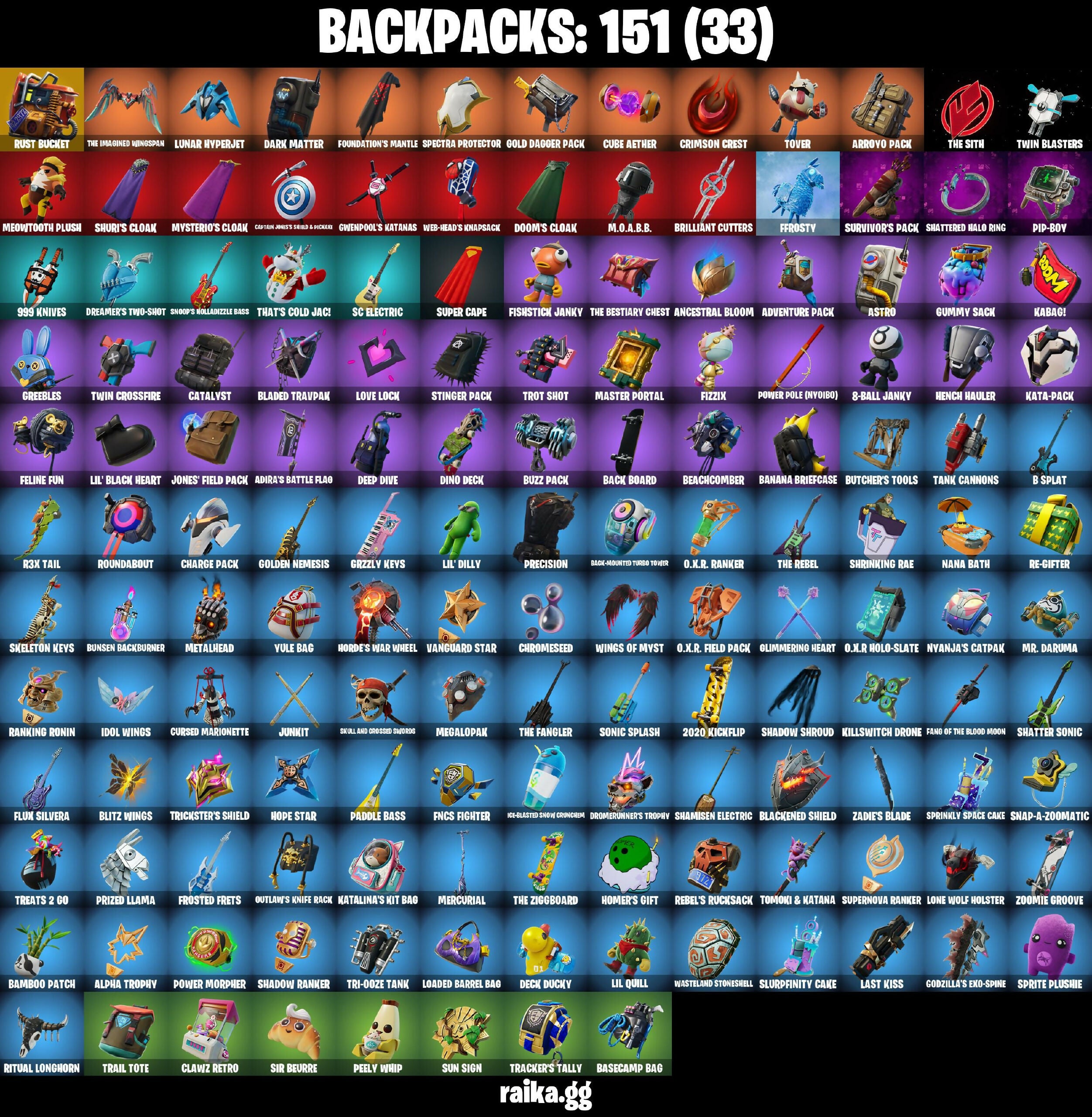 (Snikt!), 2020 Kickflip, 8-Ball Janky, 999 Knives, Adira, Adira's Battle Flag, Adventure Pack, Agent Jones, Agent Patch, Agent Peely, Air Shredder, All Red, Alpha Trophy, Ancestral Bloom, Anniversary Axe, Arctic Adeline, Arroyo Pack, Articulated Blade Wing, Ascend!, Astro, Aura, B Splat, B.R.U.T.E. Gunner, B.R.U.T.E. Navigator, Back Board, Back-Mounted Turbo Tower, Bamboo Patch, Bamboo-Tana, Banana Bomber, Banana Briefcase, Bananaxe, Baron's Hoard, Basecamp Bag, Battle Gamer Mae, Battlehawk, Beachcomber, Bean Bag, Bear Hug, Beep Beep, Best Mates, Big Haul, Bike To Go, Bitey, Black Panther (Shuri), Black Queen, Blackened Shield, Blade of the Waning Moon, Bladed Travpak, Blinky Fugu Flail, Blitz Axe, Blitz Wings, Blowin' Up, Bombs Away!, Bone Patrol, Boogie Down, Bounty 'Brella, Brella, Brilliant Cutters, Bronzed Scimitars, Brush Your Shoulders, Brutus, Bubbloon, Bullet Rider, Bunsen Backburner, Butcher's Knife, Butcher's Tools, Buzz Pack, Cactus Club, Cake Clobberer, Call Me, Camo War Machine, Captain Jones, Captain Jones's Shield & Pickaxe, Captain Llamerica, Captain's Glider, Carbide, Carbon, Cardistry, Catalyst, Cauldron Chill, Chain Surfer, Chainsaur, Champion Sparkplug, Champion Surf Witch, Charge Pack, Chemist's Cloudglider, Choice Knit, Chromebrella, Chromeseed, Clang & Basher, Classic Peleverine, Classified, Claw-Chucks, Clawz Retro, Clean Sweep, Cliffside Soarer, Coin Flip, Cold Snap, Combat Elite, Convergence, Crescent Shroom, Crimson Crest, Crimson Polestar, Crowning Achievement, Crystal Axe of the Masters, Crystal Fang, Crystal Smasher, Cube Aether, Cubic Scepter, Cuddle Carvers, Cursed Marionette, Cyclo Curl, Dark Charger, Dark Gwenpool, Dark Matter, Dark Voyager, Darkfire Claws, De-Rezz De-Stroyer, Deadpool, Dealer's Deck, Deck Ducky, Deep Dive, Dino Deck, Dino Megazord, Dire Flyer, Disco Fever, Dive Knives, Dogg Treat, Doom Brella, Doom's Cloak, Doom's Domain, Doze Dab, Dragon Dagger, Dragon Dagger's Song, Dragon Rider, Dragon Rune Lance, Dreamer's Two-Shot, Driver, Drome Drifter, Dromerunner's Trophy, Duplicating Batons, Dusk Knight, Dynamo Dancer, Electro Pairing Blades, Electro-Pincers, Elegant Crowbar, Elite Agent, Elite's Sigil, Enchanted Lifebloom, Energy Claw, Energy Sword, Eon Blades, Epic Blade of Floof, Epic Swords of Wonder, Equalizer, Eva, Evasive Maneuvers, Evie, Explorer Emilie, Extermination Saw, FNCS Fighter, Fade, Fang Of The Blood Moon, Felina, Felina's Claw, Feline Fun, Ffrosty, Fiendish Wand, Fireworks Salvo, Fishstick Janky, Fist Bump, Fist Of Doom, Fizzix, Flapjack Flyer, Flippin' Away, Flux Silvera, For O.X.R!, Fortilla Flier, Foundation's Mantle, Foundation's Plasma Spike, Foundational 'Brella, Fox Drifter, Frequency Flyer, Frolic, Frosted Frets, Fuel Rod and Tongs, Gale Force, Gear Specialist Maya, General's War Table, Gli-Dar 3000, Glimmering Heart, Goated, Godzilla's Exo-Spine, Gold Dagger Pack, Golden King, Golden Nemesis, Golden Scythe, Golf Clap, Good Sportsmanship, Greebles, Green Ranger, Grizzly Keys, Gum Brawler, Gummy Sack, Gunn-Brella, Gunnar, Gwen-Step, Gwenpool's Katanas, Hack & Smash, Handheld Missile, Har-Har-Har!, Harley Hitter, Have A Seat, Headpiece, Heart Sign, Hellfire Dance, Hello Friend, Helmet, Hench Hauler, Holly Hatchets, Homer's Gift, Hope Star, Horde's War Wheel, Hot Pokers, Hot Stuff, Howl, Humbug Slicer, Hunter's Stake & Hammer, Hype!, I'm The Visual, Ice Breaker, Ice-Blasted Snow Crunch'em, Idol Wings, Illusionist's Blades, Illusory Mysterio, Impact 'Brella, Invasion, Io Field Flyer, Iris, It's... You?, Jabba Switchway, Jar Buster, Jet Signals, Jones' Field Pack, Josie, Joystick Jumper, Jubilation, Jules, Junker 'Brella, Junkit, K.O. Club, K.O. Cruiser, Kabag!, Kat Claws, Kata Tech Burstwing, Kata-Pack, Katalina, Katalina's Kit Bag, Keep It Mello, Killswitch Drone, Kittanas, Klassic Kombat Crasher, Krisabelle, Lara Croft, Last Kiss, Lil Dilly, Lil Quill, Lil' Black Heart, Lil' Ghost, Lil' Monster, Lil' Prancer, Lil' Station Wagon, Lil' Zord Battle Mode, Llaminator, Lllamacorn Express, Loaded Barrel Bag, Lone Wolf Holster, Love It!, Love Lock, Lt. Evergreen, Lt. John Llama, Lt. Ripp Slade, Lucid Dreams, Lunar Charge, Lunar Defender, Lunar Hyperjet, M.O.A.B.B., Make A Seat, Mask Of Balance, Master Portal, Meat Grinder, MegalaPak, Meowscles, Meowtooth Plush, Mercurial, Metalhead, Microbot Mallet, Microflip, Midas, Millennium Falcon, Mission Specialist, Mobile Megalodon, Moonwalker, Mr. Dappermint, Mr. Daruma, Mwahaha, Mysterio's Cloak, Mysterio's Magic Trick, Nailed It, Nana Bath, Nanamantium Claws, Nanner Bashers, Neon Man O' War, Night Kama, Nyanja's Catpak, O-M-Gloves!, O.M.E.G.A. Spear, O.X.R Holo-Slate, O.X.R. Drifter, O.X.R. Field Pack, O.X.R. Ranker, Ocean, Off, Ohm, Ollie, Omni Sword, Onyx Winter, Outlaw's Knife Rack, Outlaw's Whipknives, Paddle Bass, Paint Pummellers, Pairing Blades, Palm Leaf, Panda Parade, Pandemonium, Pandora's Armor Doom, Paradigm (Reality-659), Pastel, Paws & Claws, Peel Out, Peelverine Wings, Peely Whip, Peppermint Paraglider, Peppermint Pick, Pig The Butcher, Pig-Gwen Scooter, Pip-Boy, Plexi-Plastic Axe, Polar Peely, Pony Tails, Pop Axe, Power Morpher, Power Pole (Nyoibo), Precision, Premiere Poms, Prized Llama, Prowler, Pry Axe, Punch Saw, Punk Powerglider, Puppet's Prowl, Quicksilver Baton Spear, R3X Tail, Raider's Relics, Rainbow Rider, Ranking Ronin, Raven's Legion, Re-Gifter, Rebel's Rucksack, Red Robin's Wings, Redline Scout, Remix 'Brella, Renegade Raider, Reporting For Duty, Rescue Board, Respect The Peace, Revel, Rezzblocks, Riftbreaker's Edge, Ritual Longhorn, Robo Wrecker, Rogue Agent, Rollie, Ronin (Cape), Roundabout, Rust Bucket, Rust Lord, SC Electric, Salute, Salvaged Chute, Santa Dogg, Sawtooth, Scarlet Commander, Scarlet Longboard, Scuba Jonesy, Sea Bobber, Secret Scimitars, Segway Tour, Sentinel, Seven Glider, Seven Signet, Shadow Boxer, Shadow Ranker, Shadow Shroud, Shadow Spar, Shake & Split, Shamisen Electric, Shaq Shimmy, Shatter Sonic, Shattered Halo Ring, Shooting Sta