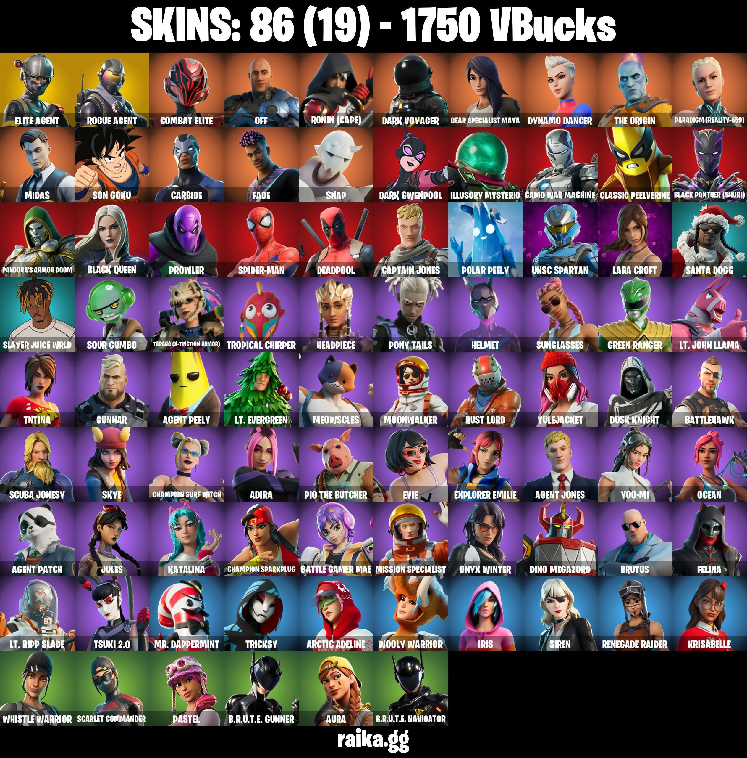 [PC/PSN/XBOX] 86 skins | Renegade Raider | Elite Agent | Rogue Agent | Take The L | Lara Croft| OG Spiderman | Midas | Gear Specialist Maya | 1750 VB