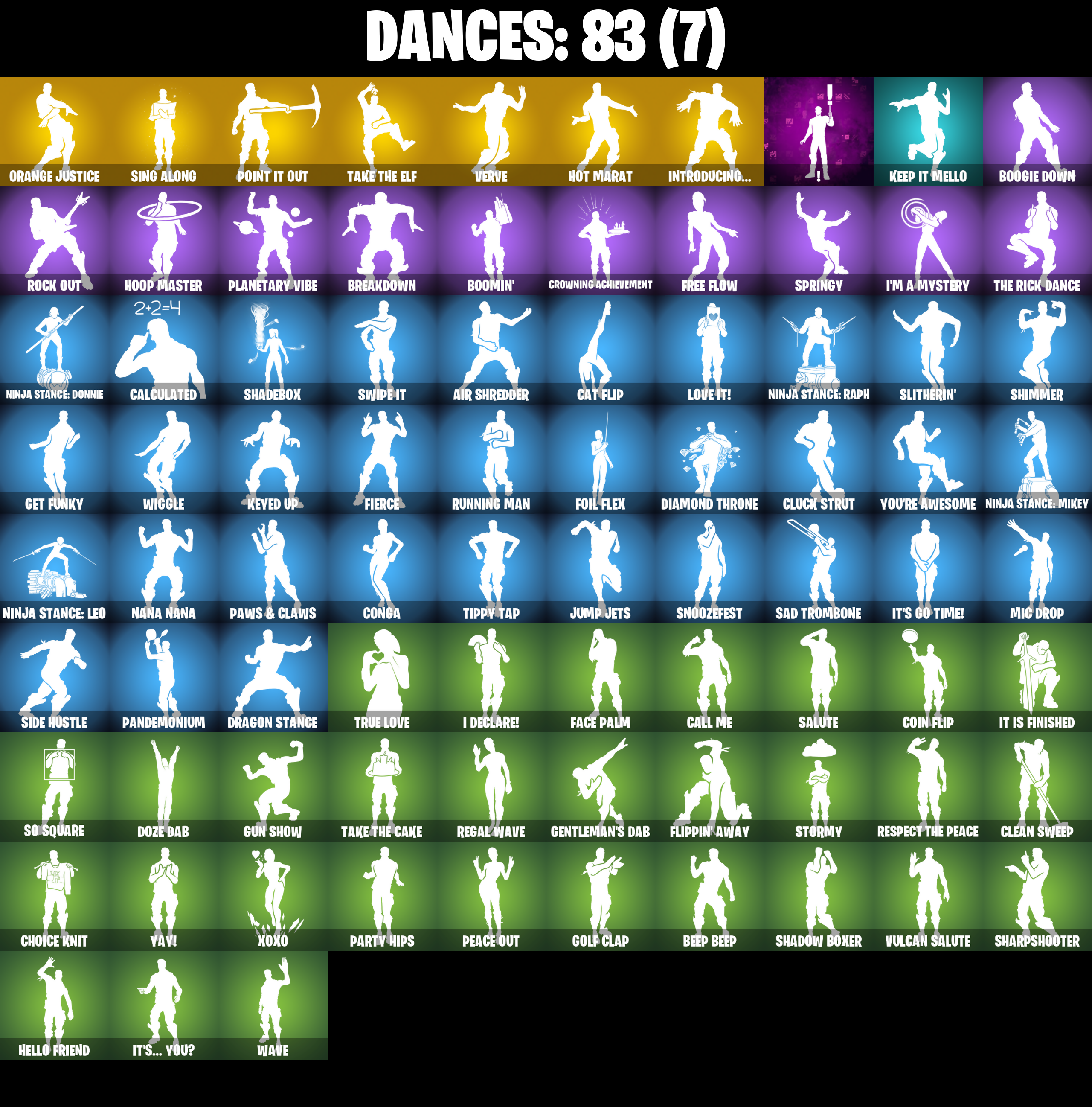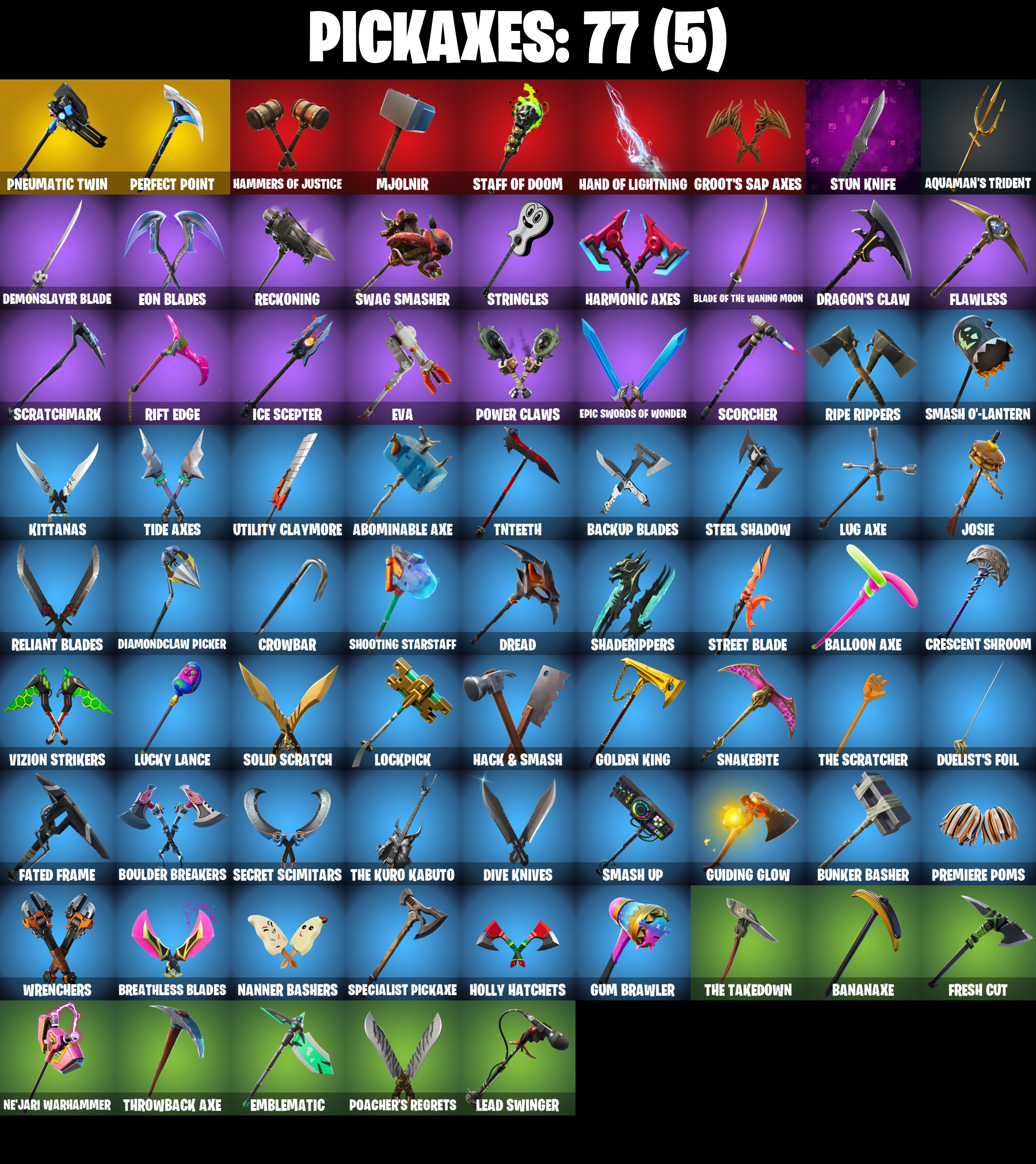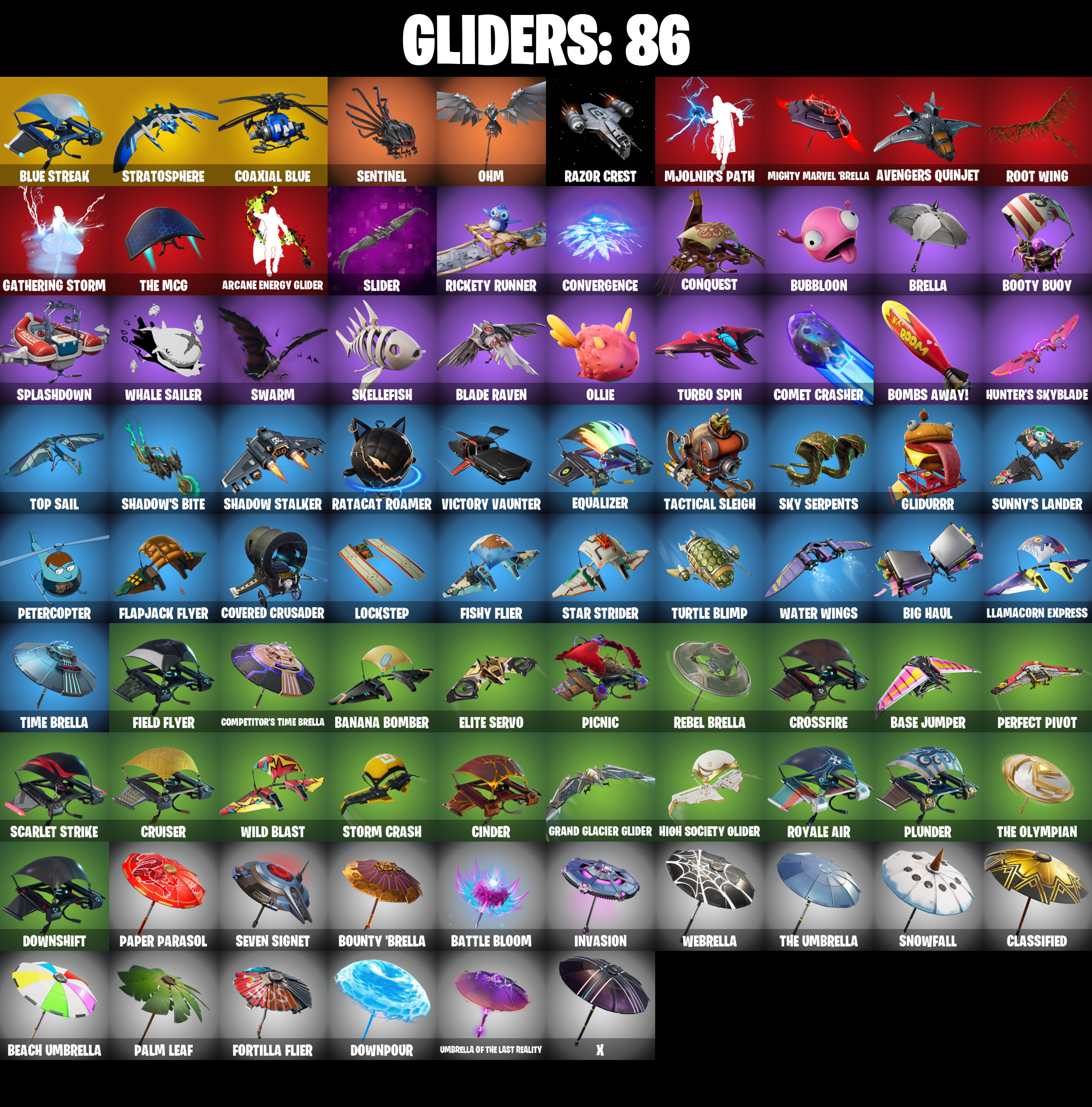 8-Ball Janky, A.I.M., Abominable Axe, Adira's Battle Flag, Adventure Pack, Agent Peely, Air Shredder, Altitude, Ancestral Bloom, Apocalypse Shroud, Aquaman, Aquaman's Trident, Arcane Energy Glider, Arroyo Pack, Arthur Curry, Avengers Quinjet, Backup Blades, Balloon Axe, Banana Bomber, Banana Briefcase, Bananaxe, Base Jumper, Basecamp Bag, Bat Royale, Battle Bloom, Beach Umbrella, Beachcomber, Beep Beep, Big Haul, Blackheart, Blackheart (Stage 8), Blade Of The Waning Moon, Blade Raven, Blue Streak, Blue Team Leader, Bobo, Bogey Bag, Bombs Away!, Boogie Down, Boomin', Booty Buoy, Boulder Breakers, Bounty 'Brella, Breakdown, Breakfast Bounty, Breathless Blades, Brella, Brutus, Bubbaloon, Bunker Basher, Bunker Jonesy, Calamity, Calamity Stage 5, Calculated, Call Me, Carbon Commando, Carbon Fiber Holster, Carbon Pack, Cat Flip, Catalyst, Cerberus, Chainstick Pack, Charlotte, Choice Knit, Cinder, Classified, Clawbox, Clawz Retro, Clean Sweep, Cloud Striker, Cluck Strut, Coaxial Blue, Cobra, Coin Flip, Combat Wreath, Comet Crasher, Competitor's Time Brella, Conga, Conquest, Contender, Convergence, Covered Crusader, Crescent Shroom, Crimson Elite, Crossfire, Crowbar, Crowning Achievement, Cruiser, Crystal, DJ Yonder, Deadpool, Deadpool Unmasked, Deadpool's Katanas, Deep Dive, Demonslayer Blade, Diamond Throne, Diamondclaw Picker, Dive Knives, Doctor Doom, Doom Chalice, Doom's Cowl, Downpour, Downshift, Doze Dab, Dragon Stance, Dragon's Claw, Dread, Drift, Drift Stage 5, Duelist's Foil, Dusk, Dusk Wings, Dying Light, Dynamo Grav-Suit, E.L.I.M., Elevation, Elite Servo, Ember, Ember (Night), Emblematic, Enforcer, Eon Blades, Epic Swords Of Wonder, Equalizer, Eternal Ranker, Eternal Shield, Eva, Fable, Fabled Cape, Face Palm, Fade, Fated Frame, Feline Fun, Field Flyer, Fierce, Fishstick Janky, Fishy Flier, Fixer, Flapjack Flyer, Flawless, Flippin' Away, Foil Flex, Fortilla Flier, Frankenstein's Monster, Free Flow, Fresh Cut, Gathering Storm, Gear Specialist Maya, Gentleman's Dab, Get Funky, Giddy-Up, Glidurr, Glorious Giftblade, Go Bag, Gold Dagger Pack, Gold Midas, Golden King, Golf Clap, Grand Glacier Glider, Groot, Groot's Sap Axes, Guiding Glow, Gum Brawler, Gun Show, Hack & Smash, Hadean Gate, Hammers Of Justice, Hand Of Lightning, Happy, Hard Boiled, Harmonic Axes, Hello Friend, Hench Hauler, High Caliber, High Society Glider, Holiday Boxy, Holly Hatchets, Hoop Master, Hope, Hot Marat, Hot Wings, Hunter's Skyblade, Huntress, Hybrid, Hybrid (Stage 4), I Declare!, I'm A Mystery, Ice Cube, Ice King (Gold), Ice Mantle, Ice Scepter, Ice-Blasted Snow Crunch'em, Infinite Bloom, Inky, Introducing..., Invasion, It Is Finished, It's Go Time!, It's... You?, Jennifer Walters, Josie, Jules, Jump Jets, Kabag!, Keep It Mello, Keyed Up, Kit, Kittanas, Laguna, Lead Swinger, Legend's Modkit, Lil' Black Heart, Llamacorn Express, Lockpick, Lockstep, Love It!, Lucky Lance, Lug Axe, Luxe, Luxe (Gold Clothing), Lynx, Lynx (Stage 4 - No Ponytail), Mancake, Mandalorian, Masked, Master Key, Master Key (Masked), Master Portal, Meowscles, Metal Gear Mk. II, Mic Drop, Mighty Marvel 'Brella, Mini Moon, Mjolnir, Mjolnir's Path, Monster Mind, Montague, Mutiny, Nana Cape, Nana Nana, Nanner Bashers, Ne'Jari Warhammer, Neon Wings, Night Cloak, Nightshade, Ninja Stance: Donnie, Ninja Stance: Leo, Ninja Stance: Mikey, Ninja Stance: Raph, Nisha, Ocean, Ohm, Old Snake, Ollie, Onesie, Onesie (Winter), Orange Justice, Oscar, Padlock, Palm Leaf, Pandemonium, Paper Parasol, Party Hips, Paws & Claws, Peace Out, Peely, Peely Whip, Perfect Pivot, Perfect Point, Perfect Present, Peter Griffin, Petercopter, Picnic, Pineapple Strummer, Piñata Brian, Planetary Vibe, Plunder, Pneumatic Twin, Poacher's Regrets, Point It Out, Point Patroller, Pool Party, Powder, Powder (White), Power Claws, Precision, Premiere Poms, Prized Llama, Rabbit Raider, Ranker's Tags, Ratacat, Ratcat Roamer, Razor Crest, Rearguard, Rebel Brella, Reckoning, Recon Strike, Redline, Redmask Ranker, Reese, Regal Wave, Reliant Blades, Reliant Blue, Respect The Peace, Rickety Runner, Rift Edge, Ripe Rippers, Riptide, Rock Out, Rogue Agent, Rook, Root Wing, Rox, Rox (Stage 5), Royale Air, Ruby Relic, Ruin, Running Man, Rust Bucket, Sad Trombone, Salute, Sapling Groot, Scales Of Justice, Scarlet Strike, Scorcher, Scratchmark, Scuba Jonesy, Secret Scimitars, Seeker, Sentinel, Seven Signet, Sgt. Winter, Sgt. Winter Headgear, Shadebox, Shaderippers, Shadow Boxer, Shadow Stalker, Shadow's Bite, Sharpshooter, Shimmer, Shock Brawler Oscar, Shooting Starstaff, Side Hustle, Sidewinder, Sidewinder (Dark), Sing Along, Siona, Skellefish, Sky Serpents, Skye, Sledgehammer, Slider, Slitherin', Smash O'-Lantern, Smash Up, Snakebite, Snoozefest, Snowfall, So Square, Society Emblem Ranker, Society Shield, Solid Scratch, Solid Snake, Specialist Pickaxe, Spectra Protector, Splashdown, Springy, Staff Of Doom, Stage 4, Standard Issue, Star Strider, Stealing Wheel, Steel Shadow, Storm, Storm (Punk), Storm Crash, Stormy, Stratosphere, Street Blade, Stringles, Striped Soldier, Stun Knife, Subjugator, Summit Striker, Sun Strider, Sunny's Lander, Supreme Shell, Swag Smasher, Swarm, Swipe It, TMNT Pizza, Tactical Sleigh, Take The Cake, Take The Elf, The Bestiary Chest, The Ice King, The Kuro Kabuto, The McG, The Olympian, The Prisoner, The Rick Dance, The Scratcher, The Takedown, The Umbrella, Thor, Thor's Cloak, Throwback Axe, Tide Axes, Time Brella, Tippy Tap, Tnteeth, Tntina, Toona Fish, Top Notch, Top Sail, Trail Tote, Trilogy, Trog, Trog (Tribal), True Love, Turbo Spin, Turtle Blimp, Twin Crossfire, Umbrella of the Last Reality, Underground Jones, Uplink, Utility Claymore, Valeria, Vega, Vengeance Jones, Verve, Victory Vaunter, Vizion Strikers, Vulcan Salute, Water Wings, Wave, Waveform, Webrella, Welder, Whale Sailer, Wiggle, Wild Blast, Wingman, Winterfest Bushranger, Wolverine, Wolverine's Trophy, Wrenchers, X, Xoxo, Yay!, You're Awesome, Zenith, Zenith (Stage 4)