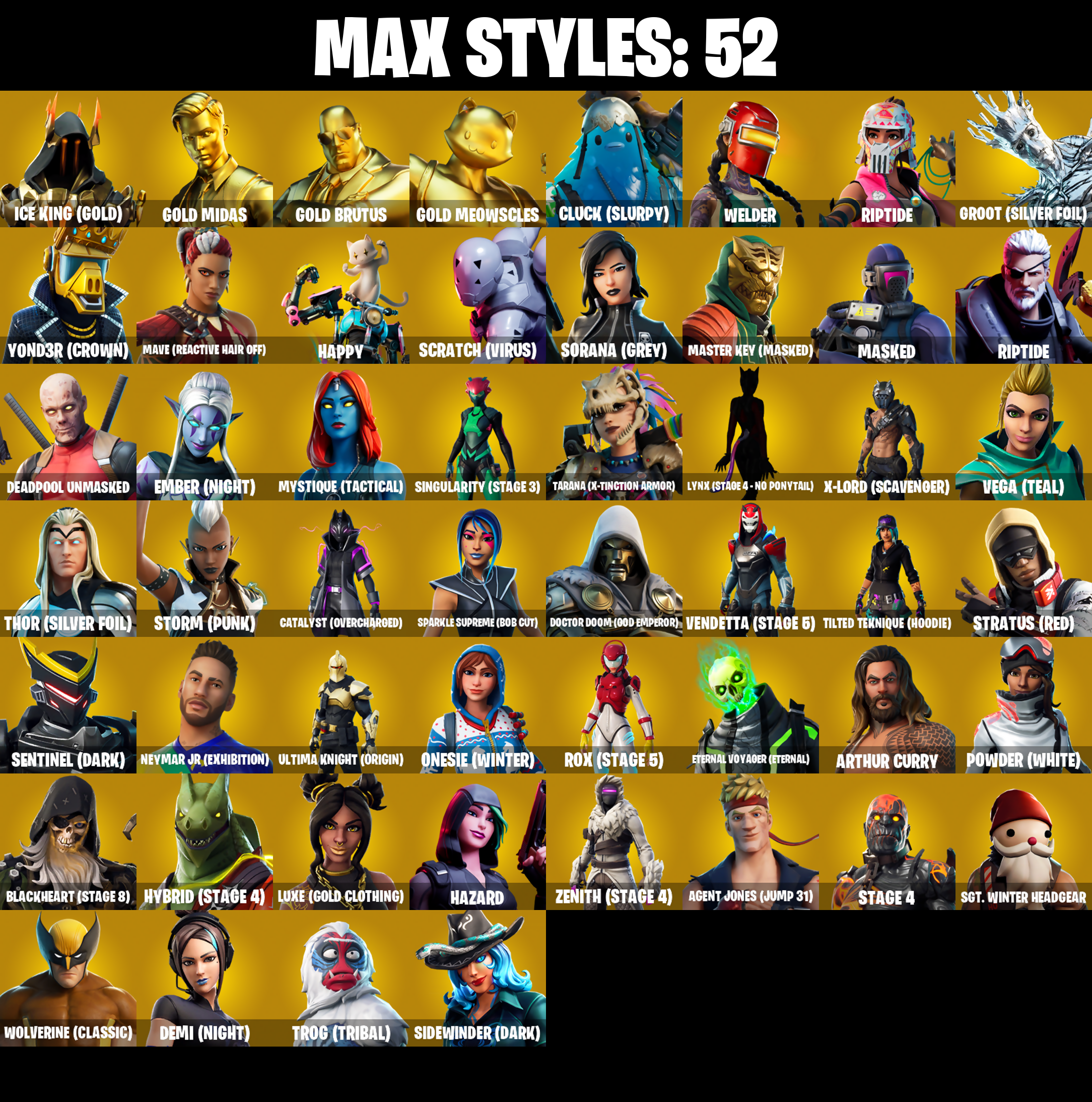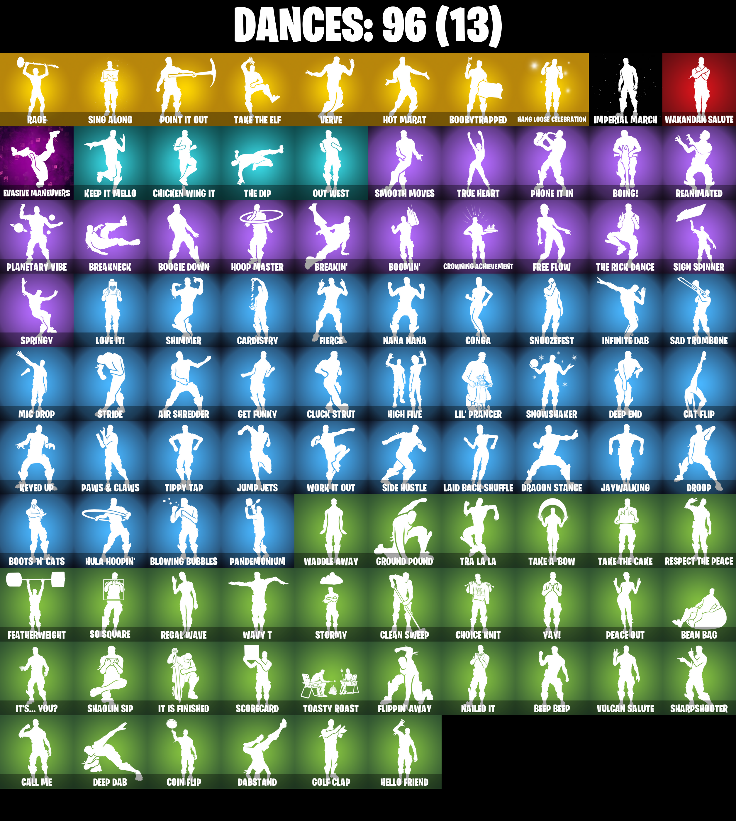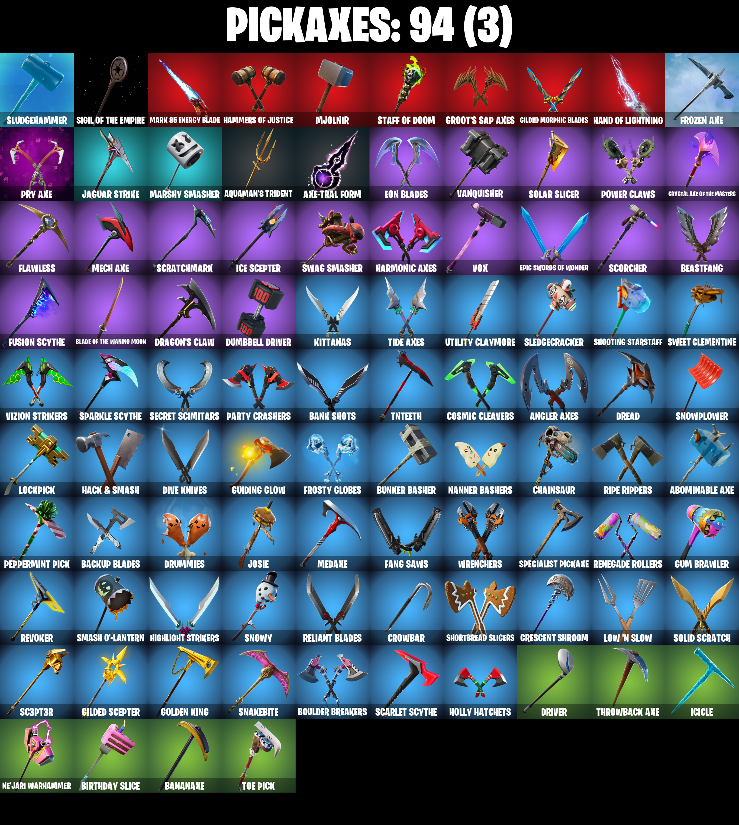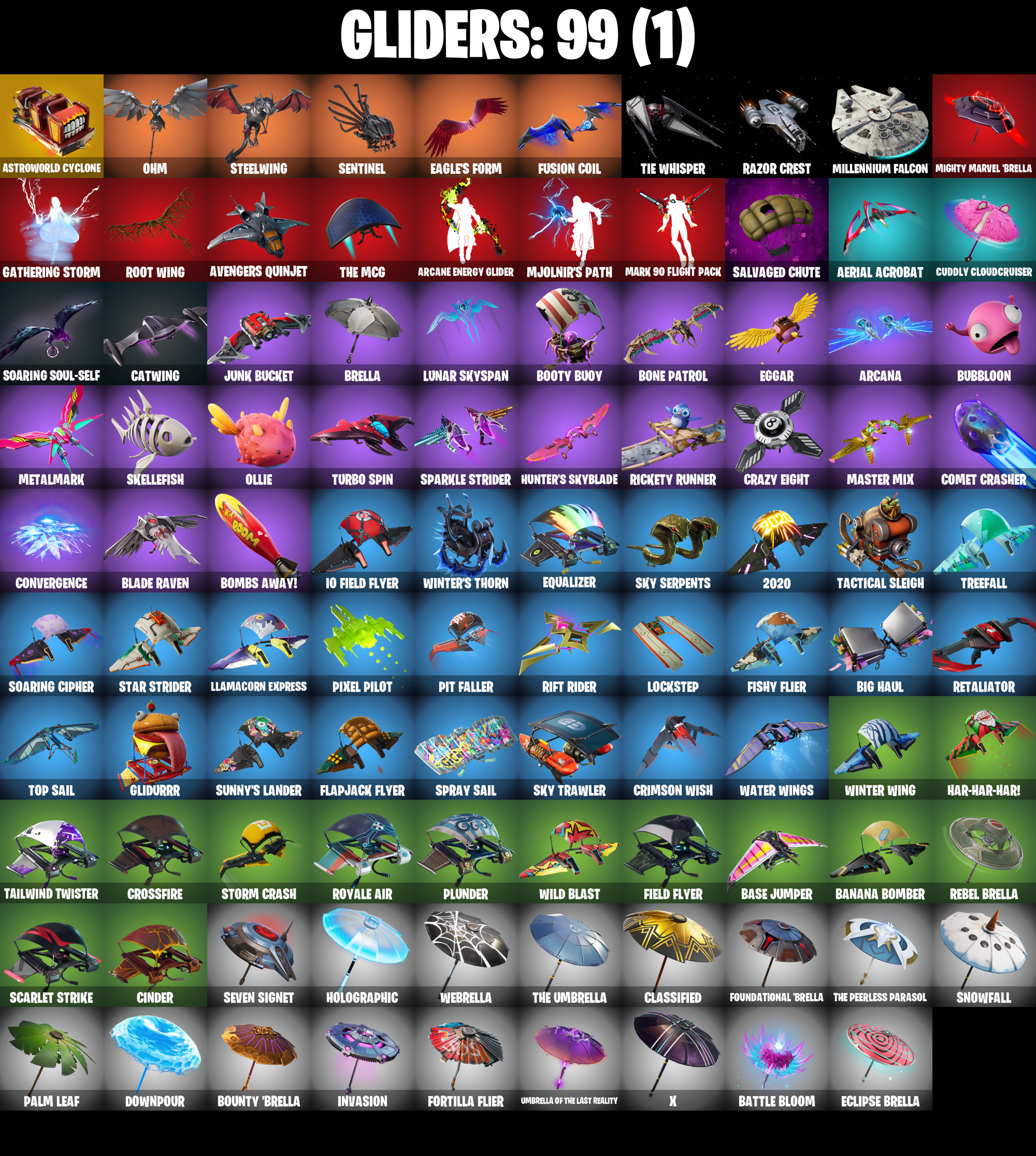 2020, 2020 Kickflip, 8-Ball Janky, 8-Ball Vs Scratch, Abominable Axe, Adira's Battle Flag, Adventure Pack, Aerial Acrobat, Agent Jones, Agent Jones (Jump 31), Agent Peely, Air Shredder, Altitude, Ancestral Bloom, Angler Axes, Antidote, Aquaman, Aquaman's Trident, Arcana, Arcane Energy Glider, Arroyo Pack, Arthur Curry, Astroworld Cyclone, Atmosphere, Avengers Quinjet, Axe-tral Form, Back Board, Backtracker, Backup Blades, Ball Bling, Banana Bomber, Banana Briefcase, Bananaxe, Bank Shots, Base Jumper, Basecamp Bag, Bat Royale, Battle Bloom, Beachcomber, Bean Bag, Beastfang, Beep Beep, Big Haul, Birthday Slice, Blackheart, Blackheart (Stage 8), Blade Bag, Blade Of The Waning Moon, Blade Raven, Blowing Bubbles, Blustery Bag, Bobo, Boing!, Bombs Away!, Bone Patrol, Boobytrapped, Boogie Down, Boomin', Boots 'N' Cats, Booty Buoy, Boulder Breakers, Bounty 'Brella, Breakfast Bounty, Breakin', Breakneck, Brella, Bubbloon, Bunker Basher, Bunker Jonesy, Bunny Bag, Cake!, Call Me, Cameo Vs Chic, Cardistry, Cat Flip, Catalyst, Catalyst (Overcharged), Catwing, Chainsaur, Chance, Chicken Wing It, Choice Knit, Chromeseed, Cinder, Classified, Clawz Retro, Clean Sweep, Cluck, Cluck (Slurpy), Cluck Strut, Cobra, Coin Flip, Combat Wreath, Comet Crasher, Conga, Convergence, Cosmic Cleavers, Crazy Eight, Crescent Shroom, Crimson Wish, Crossfire, Crowbar, Crowning Achievement, Crystal Axe Of The Masters, Crystal Llama, Cuddly Cloudcruiser, Dabstand, Datafiber Chargepack, Deadpool, Deadpool Unmasked, Deadpool's Katanas, Deep Dab, Deep Dive, Deep End, Demi, Demi (Night), Dino Deck, Dive Knives, Doctor Doom, Doctor Doom (God Emperor), Doom Chalice, Doom's Cowl, Downpour, Dragon Stance, Dragon's Claw, Dragoncrest, Dread, Driver, Droop, Drummies, Dumbbell Driver, Dying Light, Dynamo Grav-Suit, Eagle's Form, Eclipse Brella, Eggar, Ember, Ember (Night), Endless Scroll, Eon Blades, Epic Swords Of Wonder, Equalizer, Eternal Knight, Eternal Shield, Eternal Voyager, Eternal Voyager (Eternal), Evasive Maneuvers, Fabled Cape, Fade, Fang Saws, Featherweight, Feline Fun, Field Flyer, Fierce, Fishstick Janky, Fishy Flier, Flapjack Flyer, Flawless, Flippin' Away, Fortilla Flier, Foundational 'Brella, Free Flow, Frost Squad, Frosty Globes, Frozen Axe, Fusion, Fusion Coil, Fusion Orb, Fusion Scythe, Gameplan, Gathering Storm, Gear Specialist Maya, Get Funky, Gilded Morphic Blades, Gilded Scepter, Glidurr, Go Bag, Gold Brutus, Gold Dagger Pack, Gold Meowscles, Gold Midas, Gold Token, Golden King, Golf Clap, Groot, Groot (Silver Foil), Groot's Sap Axes, Ground Pound, Guiding Glow, Gum Brawler, Hack & Smash, Hammers Of Justice, Hand Of Lightning, Hang Loose Celebration, Happy, Har-Har-Har!, Harmonic Axes, Hatch Pack, Hazard, Hello Friend, Hench Hauler, High Caliber, High Five, Highlight Strikers, Holly Hatchets, Holographic, Hoop Master, Hopper, Hot Marat, Hot Wings, Hula Hoopin', Hunter's Skyblade, Hybrid, Hybrid (Stage 4), Ice Cube, Ice King (Gold), Ice Mantle, Ice Scepter, Icicle, Imperial March, Infinite Bloom, Infinite Dab, Invasion, Io Field Flyer, Iron Man Backplate, It Is Finished, It's... You?, Jaguar Strike, Jaywalking, Jennifer Walters, Joia Trophy, Jones' Field Pack, Josie, Journey Vs Hazard, Jules, Jump Jets, Junk Bucket, Kabag!, Kata-Pack, Keep It Mello, Keyed Up, Kit, Kittanas, Kondor, Krisabelle, Laguna, Laid Back Shuffle, Lara Croft, Lil' Black Heart, Lil' Kev, Lil' Prancer, Llamacorn Express, Lockpick, Lockstep, Love It!, Low 'N Slow, Lt. Evergreen, Lunar Hyperjet, Lunar Skyspan, Lunarios, Lush Edge, Luxe, Luxe (Gold Clothing), Lynx, Lynx (Stage 4 - No Ponytail), Major Mancake, Mancake, Mandalorian, Mark 85 Energy Blade, Mark 90 Flight Pack, Marshy Smasher, Masked, Master Key, Master Key (Masked), Master Mix, Master Portal, Mave, Mave (Reactive Hair Off), Mech Axe, Medaxe, Metalmark, Mic Drop, Mighty Marvel 'Brella, Millennium Falcon, Mini Moon, Mjolnir, Mjolnir's Path, Mutiny, Mystique, Mystique (Tactical), Mystique's Skull, Nailed It, Nana Cape, Nana Nana, Nanner Bashers, Ne'jari Warhammer, Neon Wings, Neymar Jr, Neymar Jr (Exhibition), No Ghost, Ocean, Ohm, Ollie, Onesie, Onesie (Winter), Out West, Padlock, Paint Pack, Palm Leaf, Pandemonium, Party Crashers, Paws & Claws, Peace Out, Peely, Peely Whip, Peppermint Pick, Perfect Present, Phone It In, Pineapple Strummer, Pit Faller, Pixel Pilot, Planetary Vibe, Plunder, Point It Out, Polar Peely, Powder, Powder (White), Power Claws, Pry Axe, Quack Pack, Rage, Raz, Razor Crest, Re-Gifter, Ready Ruck, Reanimated, Rebel Brella, Rebirth Raven, Redmask Ranker, Reese, Regal Wave, Reliant Blades, Remedy Vs Toxin, Renegade Rollers, Respect The Peace, Retaliator, Retribution, Revoker, Rickety Runner, Rift Rider, Ripe Rippers, Rippley Vs Sludge, Riptide, Root Wing, Rox, Rox (Stage 5), Royale Air, Ruin, Sad Trombone, Salvaged Chute, Sapling Groot, Sc3pt3r, Scales of Justice, Scarlet Commander, Scarlet Edge, Scarlet Scythe, Scarlet Strike, Scorcher, Scorecard, Scratch (Virus), Scratchmark, Scuba Jonesy, Secret Scimitars, Sentinel, Sentinel (Dark), Seven Signet, Sgt. Winter, Sgt. Winter Headgear, Shaolin Sip, Sharpshooter, Shield Surprise, Shimmer, Shooting Starstaff, Shortbread Slicers, Side Hustle, Sidewinder, Sidewinder (Dark), Sigil Of The Empire, Sign Spinner, Sing Along, Singularity, Singularity (Stage 3), Siona, Skellefish, Sky Serpents, Sky Trawler, Skye, Sledgecracker, Sludgehammer, Smash O'-lantern, Smooth Moves, Smoothie, Snakebite, Snoozefest, Snow Crystal, Snowfall, Snowmando, Snowplower, Snowshaker, Snowy, So Square, Soaring Cipher, Soaring Soul-Self, Solar Slicer, Solid Scratch, Sorana, Sorana (Grey), Sparkle Scythe, Sparkle Strider, Sparkle Supreme, Sparkle Supreme (Bob Cut), Specialist Pickaxe, Spectra Protector, Spiked Satchel, Spray Sail, Springy, Staff Of Doom, Stage 4, Star Shot, Star Strider, Star Surge, Starcrest Shift, Stealing Wheel, Steelwing, Storm, Storm (Punk), Storm Crash, Stormy, Stratus, Stratus (Red), Stride, Sunny's Lander, Supreme Shell, Survi