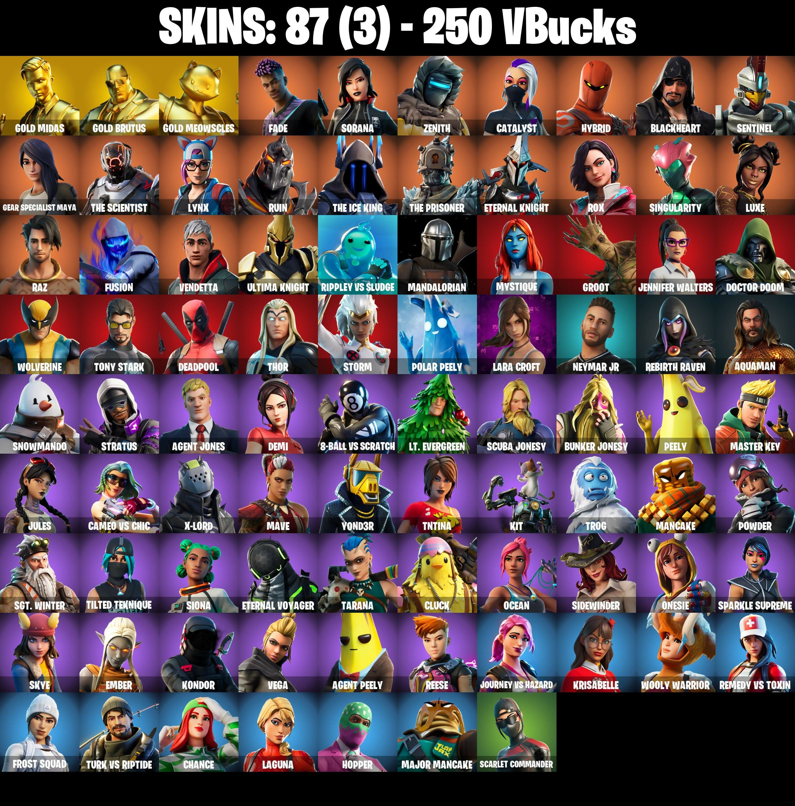 PC/PSN/XBOX |87 skins | Lara Croft | Deadpool | Gold Midas | Gold Brutus | Gold Meowscles | Rage | The Ice King | Luxe | Peely | Vendetta | #B1008