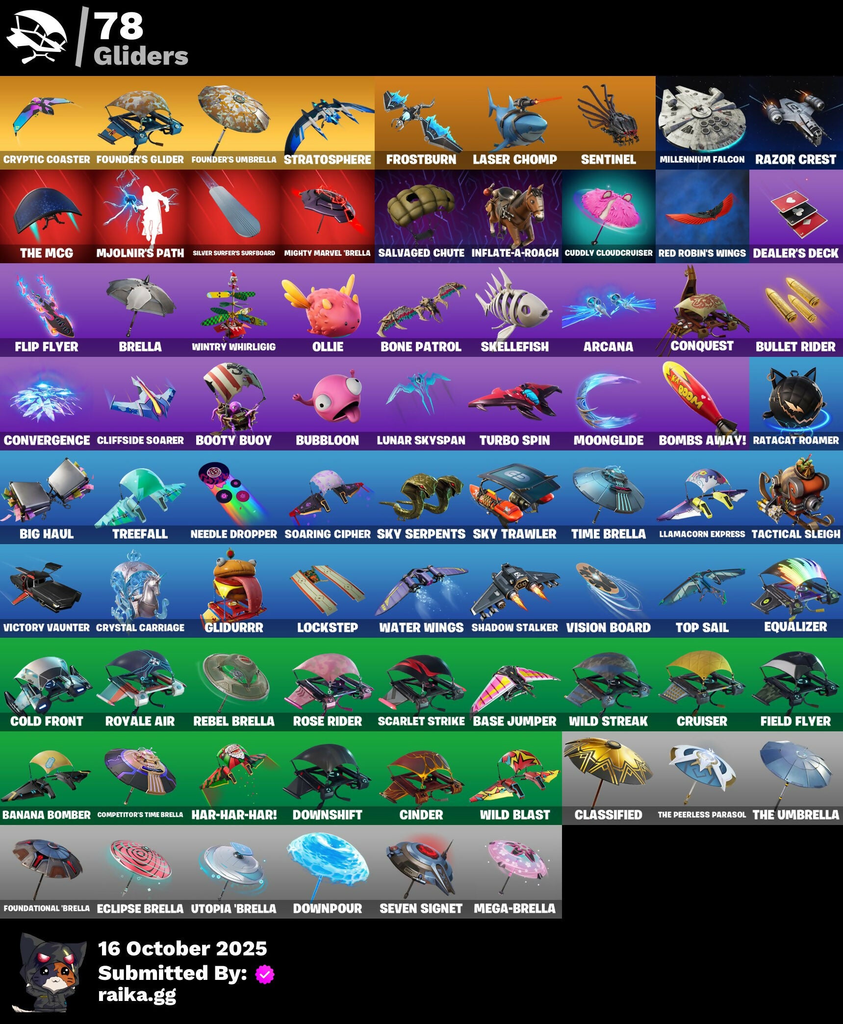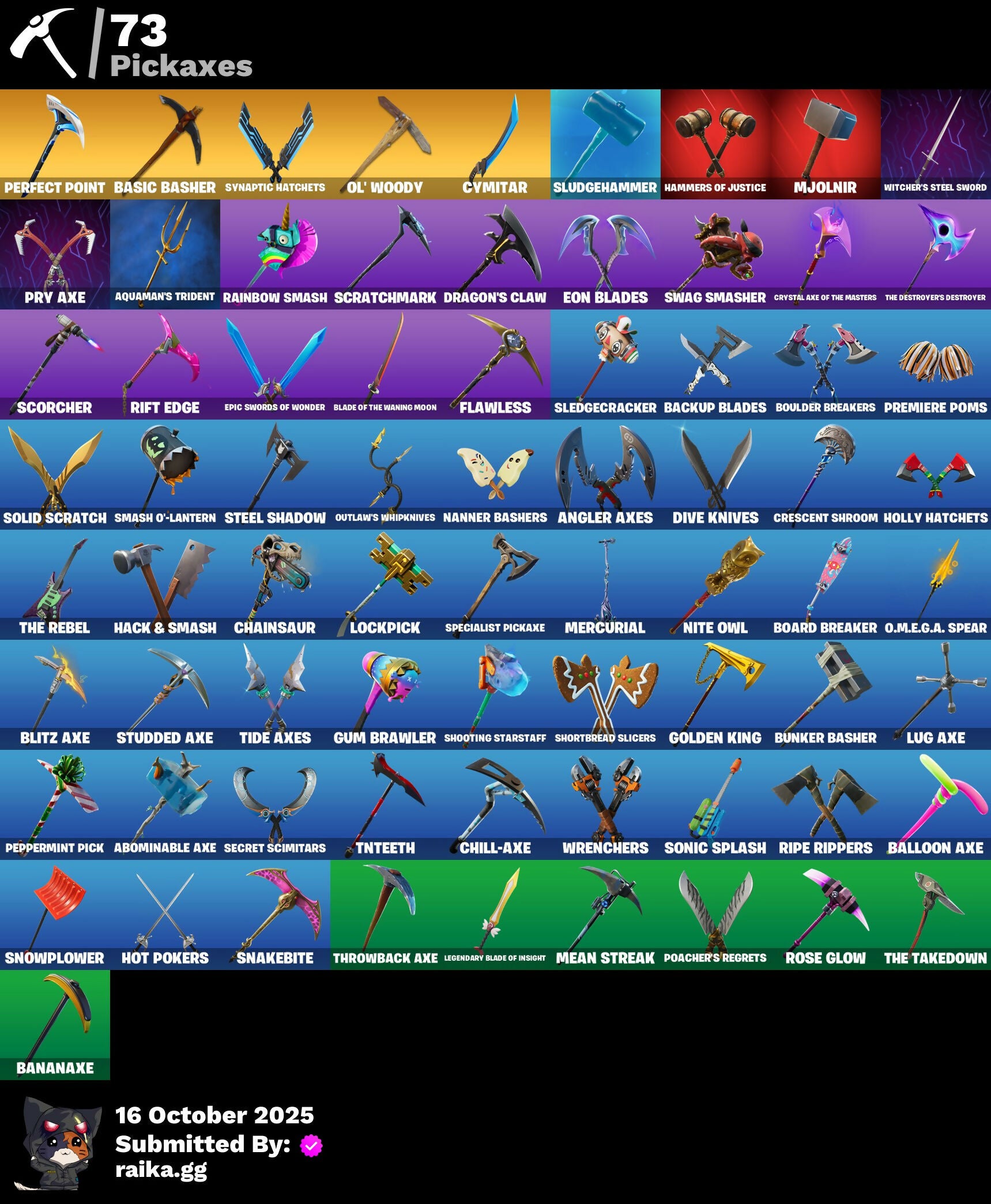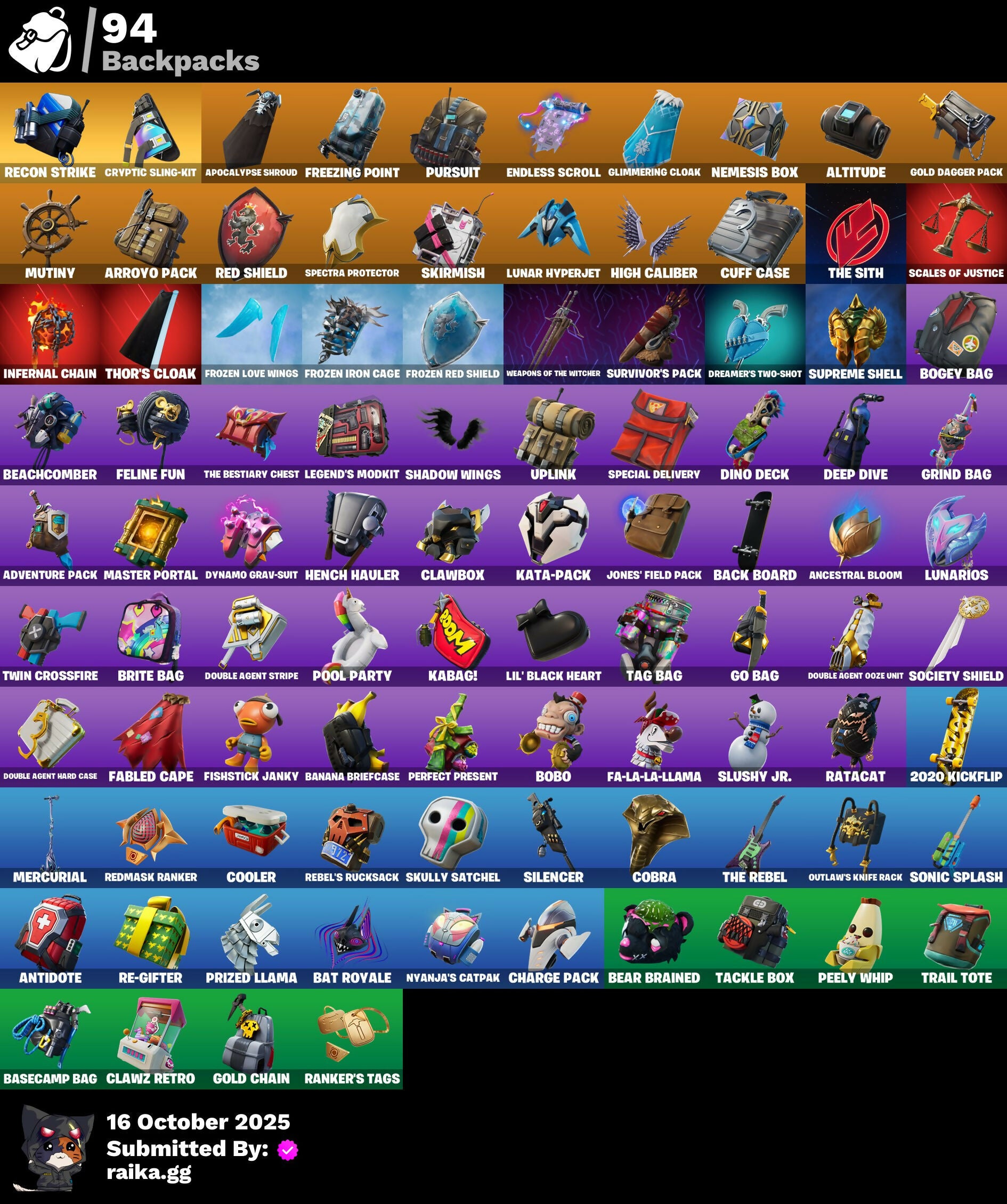 2020 Kickflip, Abominable Axe, Abstrakt, Acolyte's Curse, Adventure Pack, Aerial, Agent Jones, Agent Jones (Jump 31), Agent Nana, Agent Peely, Air Shredder, Altitude, Ancestral Bloom, Angler Axes, Antidote, Apocalypse Shroud, Aquaman, Aquaman's Trident, Arcana, Arctic Adeline, Arctic Camo, Arroyo Pack, Arthur Curry, Aura, B.R.U.T.E. Gunner, Back Board, Backup Blades, Bacon, Bag Of Coal, Balloon Axe, Banana Bomber, Banana Briefcase, Bananaxe, Banner, Banner Icon, Base Jumper, Basecamp Bag, Basic Basher, Bat Royale, Batman, Battle Bus Balloon, Beach Chair, Beachcomber, Bear Brained, Bear Hug, Beep Beep, Bees!, Berserker Barrage!, Big Haul, Bigfoot, Billy Bounce, Blackheart, Blade Of The Waning Moon, Blasted, Blitz Axe, Board Breaker, Bobo, Bogey Bag, Bombastic Winterfest, Bombs Away!, Bone, Bone Patrol, Boogie, Boogie Down, Booty Buoy, Both Eyes Open, Boulder Breakers, Breakin', Brella, Brite Bag, Brite Bomber, Brite Gunner, Brutus, Bubbloon, Bullet Rider, Bullseye, Bunker Basher, Bunker Jonesy, Busy, Bytes' Sigil, C'mere, Calico, Call Me, Cardistry, Cash Grab, Cat Flip, Chainsaur, Chaos Double Agent, Charge Pack, Charlotte's Logo, Chill-Axe, Choice Knit, Chomp Cud!!, Chrome Marked, Cinder, Classified, Clawbox, Clawz Retro, Clean Sweep, Cliffside Soarer, Cloaked Shadow, Cluck Strut, Cobalt Overdrive, Cobra, Cobra Kai, Coconuts, Coin Flip, Comet, Competitor's Time Brella, Conga, Conquest, Constructor, Controlled Focus, Convergence, Cooler, Courageous Mikasa, Cowboy Chat, Crabby, Crabby King, Crazy Castle, Crescent Shroom, Crown, Crowning Achievement, Cruiser, Cryptic Coaster, Cryptic Sling-Kit, Crystal Axe Of The Masters, Crystal Carriage, Crystal Llama, Cube Marking, Cuddle Hearts, Cuddly Cloudcruiser, Cuff Case, Curling Iron, Cursed, Cymitar, D.C. 63, DJ Patroller, Dance Mat, Daywalker's Kata, Deadpool, Dealer's Deck, Deep Dive, Denim Destiny, Diamond Shapes, Dino Deck, Disco, Dive Knives, Dolphin, Double Agent Hard Case, Double Agent Hush, Double Agent Ooze Unit, Double Agent Stripe, Double Agent Wildcard, Downpour, Downshift, Doze Dab, Dragon Scales, Dragon Stance, Dragon's Claw, Dreamer's Two-Shot, Drift, Driftwood, Droop, Drum Major, Durrr Burger, Dynamite, Dynamo Grav-Suit, E.G.O., Eagle, Eclipse Brella, Electro Swing, Ember, Endless Scroll, Eon Blades, Epic Swords Of Wonder, Equalizer, Evasive Maneuvers, Everything's Fine, Eye Of Agamotto, Fa-La-La-Llama, Fabled Cape, Face Palm, Fade, Fallen Love Ranger, Fate, Feline Fun, Festive Paper, Field Flyer, Fierce, Finger Guns, Fish Hook, Fishbone, Fishstick Janky, Fist, Fixer, Flawless, Flip Flyer, Flippin' Away, Floating Island, Flowy Hat, Foundational 'Brella, Founder's Glider, Founder's Umbrella, Fox, Fox Clan Mask, Freezing Point, Fright Funk, Frostbite, Frostburn, Frozen Iron Cage, Frozen Love Ranger, Frozen Love Wings, Frozen Raven, Frozen Red Knight, Frozen Red Shield, Fryangles, GG Ornament, GG Snakes, GG Snowman, Gear Specialist Maya, Gemstone, Gentleman's Dab, Geralt, Geralt of Rivia, Ghost Rider, Ghoul Trooper, Glidurrr, Glimmer, Glimmering Cloak, Glowsticks, Glyph Master, Go Bag, Gold, Gold Chain, Gold Dagger Pack, Gold Front, Gold Touch, Golden Agent, Golden King, Golden Shine, Golf Clap, Good Vibes, Grav-Fusion, Grind Bag, Gringle Gift, Groot Glow, Ground Pound, Grumpy Tree, Gum Brawler, Gumbo, Hack & Smash, Hammerhead, Hammers Of Justice, Har-Har-Har!, Haute Hustle, Haven, Heart, Heart Sign, Heavy Metal Omega, Hello Friend, Hench, Hench Hauler, High Caliber, High Five, Holly Hatchets, Hoop Master, Hop And A Wink, Hope, Hope's Look, Hot Dog, Hot Pokers, Hot Stuff, Huntress, Hybrid, I'm A Mystery, Igni Sign, In Her Sights, Industrious, Infernal Chain, Infinite Swirl, Inflate-A-Roach, Introducing..., It's... You?, Jellyfish, Jennifer Walters, Jolly Roger, Jones Underground, Jones' Field Pack, Journey, Journey vs Hazard, Jubilation, Jules, Jurassically Charged, Kabag!, Kaboom!, Kata-Pack, Kenshi Yonezu, Knight's Honor, Krisabelle, Kymera Swarm, L, Lara Croft, Lara Croft (Gold Anniversary), Laser Chomp, Laugh It Up, Legend's Modkit, Legend's Retribution, Legendary Blade Of Insight, Lil' Black Heart, Lil' Prancer, Liteshow, Llamacorn Express, Lockpick, Lockstep, Love It!, Love Ranger, Lt. Evergreen, Lucha GG, Lug Axe, Lunar Hyperjet, Lunar Skyspan, Lunarios, Lunch Break, Luxe, Lynx, Mad Mask, Mandalorian, Mask, Mask Off, Massai, Massai Fire, Master Engineer, Master Key, Master Plan, Master Portal, Mean Streak, Mega-Brella, Meowabunga!, Meowscles, Mercurial, Mermaid, Merry Marauder, Midas Memory, Midas' Shadow, Mighty Marvel 'Brella, Mighty Tree, Millennium Falcon, Missing: Peely, Mjolnir, Mjolnir Strike, Mjolnir's Path, Monks, Moonglide, Moonglow, Alight, Muscle Memory, Mutiny, Nana Nana, Nanner Bashers, Needle Dropper, Nemesis Box, Neon Cat, Ninja, Nite Owl, Nolan Takes Aim, Nyanja's Catpak, O.M.E.G.A. Spear, Ocean, Ocean Wave, Ol' Woody, Ollie, Oni Mask, Oscar, Outlander, Outlaw's Knife Rack, Outlaw's Whipknives, Paint Brush, Paintbrush, Pandemonium, Paper Plane, Paradigm (Reality-659), Paws & Claws, Peace Out, Peeled, Peely, Peely Whip, Peppermint Pick, Per Aspera Ad Astra, Perfect Point, Perfect Present, Piercing Ace, Pineapple, Pink, Pixel Jonesy, Pixels Royale, Pizza, Pizza Party, Poacher's Regrets, Point Patrol, Point Patroller, Polar Peely, Pool Party, Premiere Poms, Primal Hunter, Prized Llama, Protector, Pry Axe, Pursuit, Radioactive, Raider's Return, Rainbow Smash, Raise The Roof, Ranker's Tags, Ratacat, Ratacat Roamer, Raz, Razor Crest, Re-Gifter, Rebel Brella, Rebel's Rucksack, Reboot'd, Recon Expert, Recon Strike, Red Card, Red Knight, Red Robin's Wings, Red Shield, Red-Nosed Raider, Redline, Redmask Ranker, Regal Wave, Remedy vs Toxin, Respect The Peace, Ride The Corn!, Ride The Pony, Rift Edge, Ripe, Ripe Rippers, Rippley, Rippley vs Sludge, Riptide, Roach, Rock Love, Rose Glow, Rose Rider, Rose Team Leader, Roses, Rox, Royale Air, Sad Trombone, Salty, Salvaged Chute, Sap, Scales Of Justice, Scarlet Strike, Scorche