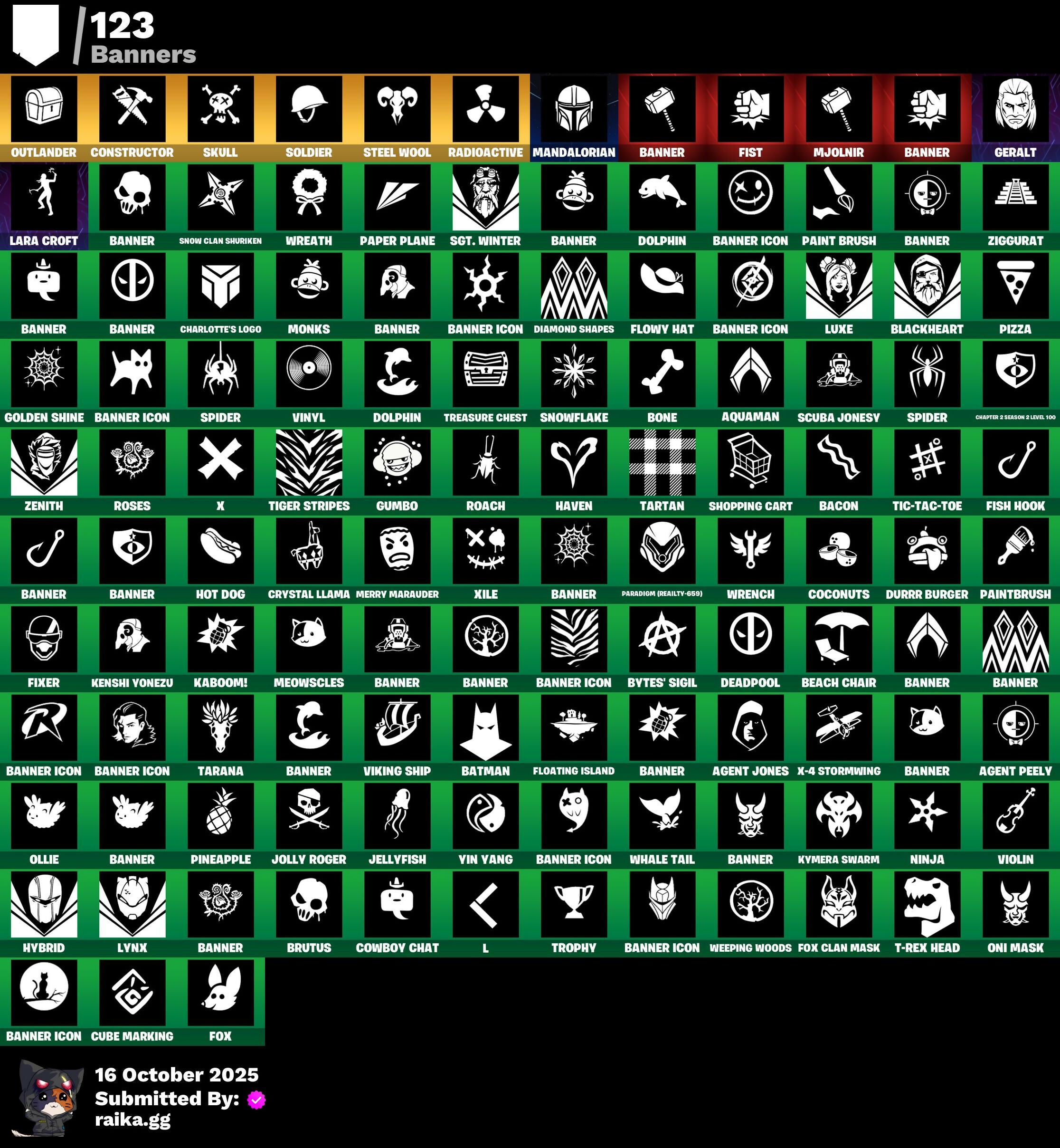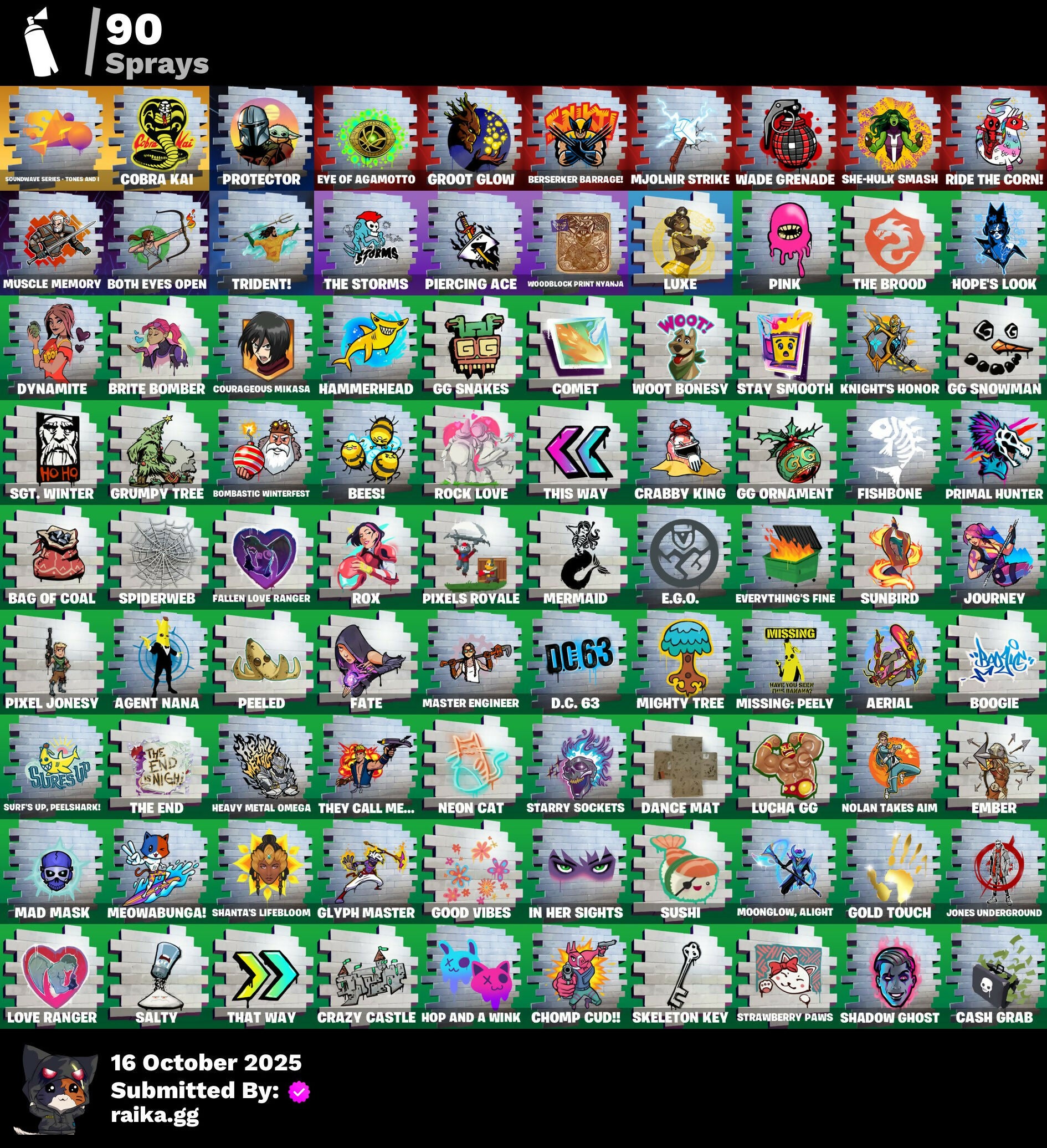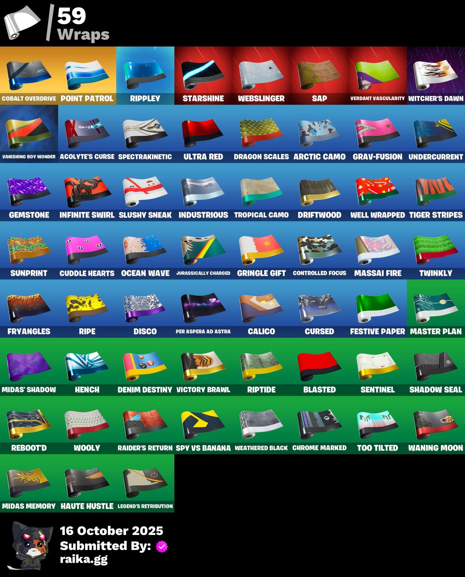2020 Kickflip, Abominable Axe, Abstrakt, Acolyte's Curse, Adventure Pack, Aerial, Agent Jones, Agent Jones (Jump 31), Agent Nana, Agent Peely, Air Shredder, Altitude, Ancestral Bloom, Angler Axes, Antidote, Apocalypse Shroud, Aquaman, Aquaman's Trident, Arcana, Arctic Adeline, Arctic Camo, Arroyo Pack, Arthur Curry, Aura, B.R.U.T.E. Gunner, Back Board, Backup Blades, Bacon, Bag Of Coal, Balloon Axe, Banana Bomber, Banana Briefcase, Bananaxe, Banner, Banner Icon, Base Jumper, Basecamp Bag, Basic Basher, Bat Royale, Batman, Battle Bus Balloon, Beach Chair, Beachcomber, Bear Brained, Bear Hug, Beep Beep, Bees!, Berserker Barrage!, Big Haul, Bigfoot, Billy Bounce, Blackheart, Blade Of The Waning Moon, Blasted, Blitz Axe, Board Breaker, Bobo, Bogey Bag, Bombastic Winterfest, Bombs Away!, Bone, Bone Patrol, Boogie, Boogie Down, Booty Buoy, Both Eyes Open, Boulder Breakers, Breakin', Brella, Brite Bag, Brite Bomber, Brite Gunner, Brutus, Bubbloon, Bullet Rider, Bullseye, Bunker Basher, Bunker Jonesy, Busy, Bytes' Sigil, C'mere, Calico, Call Me, Cardistry, Cash Grab, Cat Flip, Chainsaur, Chaos Double Agent, Charge Pack, Charlotte's Logo, Chill-Axe, Choice Knit, Chomp Cud!!, Chrome Marked, Cinder, Classified, Clawbox, Clawz Retro, Clean Sweep, Cliffside Soarer, Cloaked Shadow, Cluck Strut, Cobalt Overdrive, Cobra, Cobra Kai, Coconuts, Coin Flip, Comet, Competitor's Time Brella, Conga, Conquest, Constructor, Controlled Focus, Convergence, Cooler, Courageous Mikasa, Cowboy Chat, Crabby, Crabby King, Crazy Castle, Crescent Shroom, Crown, Crowning Achievement, Cruiser, Cryptic Coaster, Cryptic Sling-Kit, Crystal Axe Of The Masters, Crystal Carriage, Crystal Llama, Cube Marking, Cuddle Hearts, Cuddly Cloudcruiser, Cuff Case, Curling Iron, Cursed, Cymitar, D.C. 63, DJ Patroller, Dance Mat, Daywalker's Kata, Deadpool, Dealer's Deck, Deep Dive, Denim Destiny, Diamond Shapes, Dino Deck, Disco, Dive Knives, Dolphin, Double Agent Hard Case, Double Agent Hush, Double Agent Ooze Unit, Double Agent Stripe, Double Agent Wildcard, Downpour, Downshift, Doze Dab, Dragon Scales, Dragon Stance, Dragon's Claw, Dreamer's Two-Shot, Drift, Driftwood, Droop, Drum Major, Durrr Burger, Dynamite, Dynamo Grav-Suit, E.G.O., Eagle, Eclipse Brella, Electro Swing, Ember, Endless Scroll, Eon Blades, Epic Swords Of Wonder, Equalizer, Evasive Maneuvers, Everything's Fine, Eye Of Agamotto, Fa-La-La-Llama, Fabled Cape, Face Palm, Fade, Fallen Love Ranger, Fate, Feline Fun, Festive Paper, Field Flyer, Fierce, Finger Guns, Fish Hook, Fishbone, Fishstick Janky, Fist, Fixer, Flawless, Flip Flyer, Flippin' Away, Floating Island, Flowy Hat, Foundational 'Brella, Founder's Glider, Founder's Umbrella, Fox, Fox Clan Mask, Freezing Point, Fright Funk, Frostbite, Frostburn, Frozen Iron Cage, Frozen Love Ranger, Frozen Love Wings, Frozen Raven, Frozen Red Knight, Frozen Red Shield, Fryangles, GG Ornament, GG Snakes, GG Snowman, Gear Specialist Maya, Gemstone, Gentleman's Dab, Geralt, Geralt of Rivia, Ghost Rider, Ghoul Trooper, Glidurrr, Glimmer, Glimmering Cloak, Glowsticks, Glyph Master, Go Bag, Gold, Gold Chain, Gold Dagger Pack, Gold Front, Gold Touch, Golden Agent, Golden King, Golden Shine, Golf Clap, Good Vibes, Grav-Fusion, Grind Bag, Gringle Gift, Groot Glow, Ground Pound, Grumpy Tree, Gum Brawler, Gumbo, Hack & Smash, Hammerhead, Hammers Of Justice, Har-Har-Har!, Haute Hustle, Haven, Heart, Heart Sign, Heavy Metal Omega, Hello Friend, Hench, Hench Hauler, High Caliber, High Five, Holly Hatchets, Hoop Master, Hop And A Wink, Hope, Hope's Look, Hot Dog, Hot Pokers, Hot Stuff, Huntress, Hybrid, I'm A Mystery, Igni Sign, In Her Sights, Industrious, Infernal Chain, Infinite Swirl, Inflate-A-Roach, Introducing..., It's... You?, Jellyfish, Jennifer Walters, Jolly Roger, Jones Underground, Jones' Field Pack, Journey, Journey vs Hazard, Jubilation, Jules, Jurassically Charged, Kabag!, Kaboom!, Kata-Pack, Kenshi Yonezu, Knight's Honor, Krisabelle, Kymera Swarm, L, Lara Croft, Lara Croft (Gold Anniversary), Laser Chomp, Laugh It Up, Legend's Modkit, Legend's Retribution, Legendary Blade Of Insight, Lil' Black Heart, Lil' Prancer, Liteshow, Llamacorn Express, Lockpick, Lockstep, Love It!, Love Ranger, Lt. Evergreen, Lucha GG, Lug Axe, Lunar Hyperjet, Lunar Skyspan, Lunarios, Lunch Break, Luxe, Lynx, Mad Mask, Mandalorian, Mask, Mask Off, Massai, Massai Fire, Master Engineer, Master Key, Master Plan, Master Portal, Mean Streak, Mega-Brella, Meowabunga!, Meowscles, Mercurial, Mermaid, Merry Marauder, Midas Memory, Midas' Shadow, Mighty Marvel 'Brella, Mighty Tree, Millennium Falcon, Missing: Peely, Mjolnir, Mjolnir Strike, Mjolnir's Path, Monks, Moonglide, Moonglow, Alight, Muscle Memory, Mutiny, Nana Nana, Nanner Bashers, Needle Dropper, Nemesis Box, Neon Cat, Ninja, Nite Owl, Nolan Takes Aim, Nyanja's Catpak, O.M.E.G.A. Spear, Ocean, Ocean Wave, Ol' Woody, Ollie, Oni Mask, Oscar, Outlander, Outlaw's Knife Rack, Outlaw's Whipknives, Paint Brush, Paintbrush, Pandemonium, Paper Plane, Paradigm (Reality-659), Paws & Claws, Peace Out, Peeled, Peely, Peely Whip, Peppermint Pick, Per Aspera Ad Astra, Perfect Point, Perfect Present, Piercing Ace, Pineapple, Pink, Pixel Jonesy, Pixels Royale, Pizza, Pizza Party, Poacher's Regrets, Point Patrol, Point Patroller, Polar Peely, Pool Party, Premiere Poms, Primal Hunter, Prized Llama, Protector, Pry Axe, Pursuit, Radioactive, Raider's Return, Rainbow Smash, Raise The Roof, Ranker's Tags, Ratacat, Ratacat Roamer, Raz, Razor Crest, Re-Gifter, Rebel Brella, Rebel's Rucksack, Reboot'd, Recon Expert, Recon Strike, Red Card, Red Knight, Red Robin's Wings, Red Shield, Red-Nosed Raider, Redline, Redmask Ranker, Regal Wave, Remedy vs Toxin, Respect The Peace, Ride The Corn!, Ride The Pony, Rift Edge, Ripe, Ripe Rippers, Rippley, Rippley vs Sludge, Riptide, Roach, Rock Love, Rose Glow, Rose Rider, Rose Team Leader, Roses, Rox, Royale Air, Sad Trombone, Salty, Salvaged Chute, Sap, Scales Of Justice, Scarlet Strike, Scorche