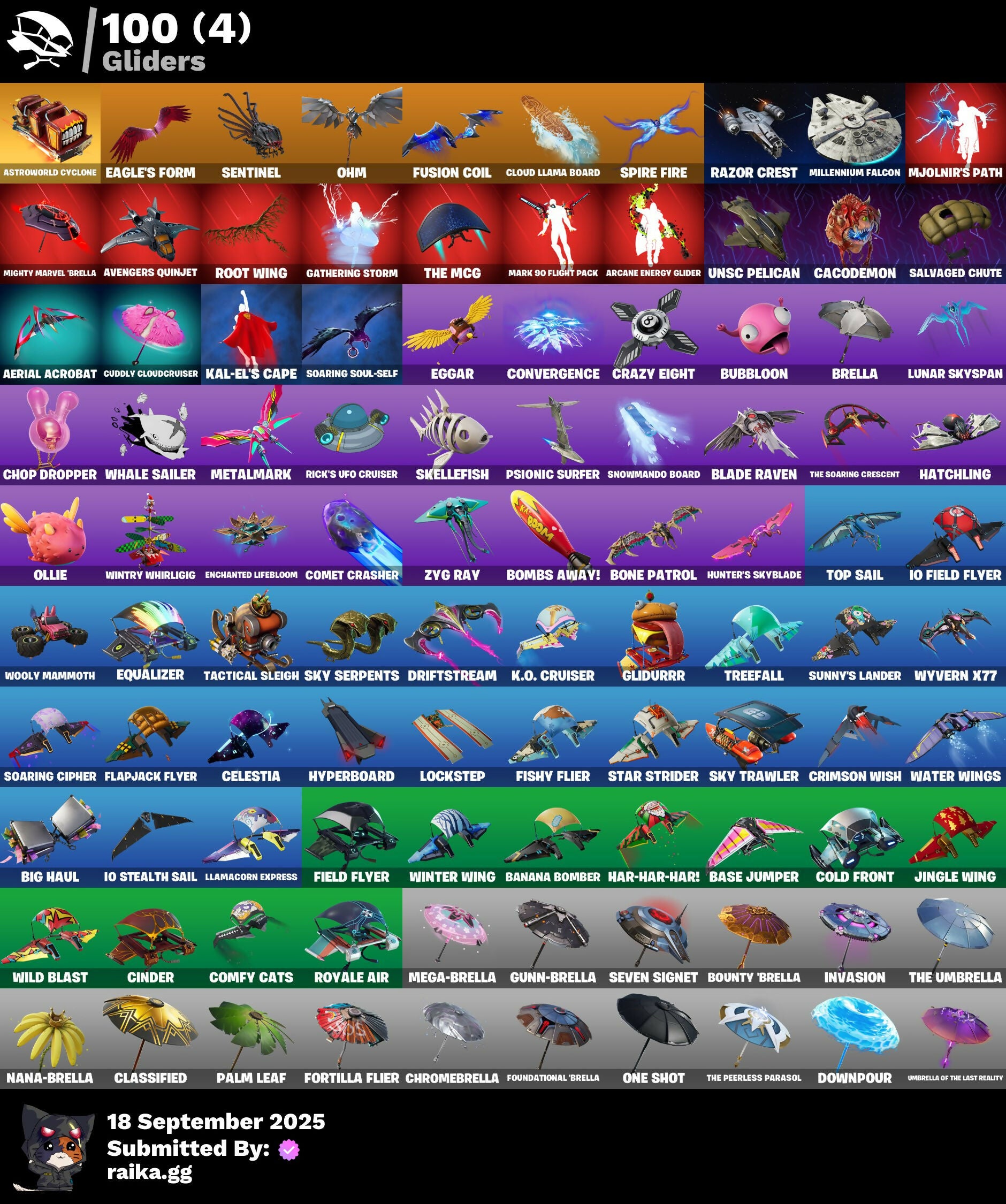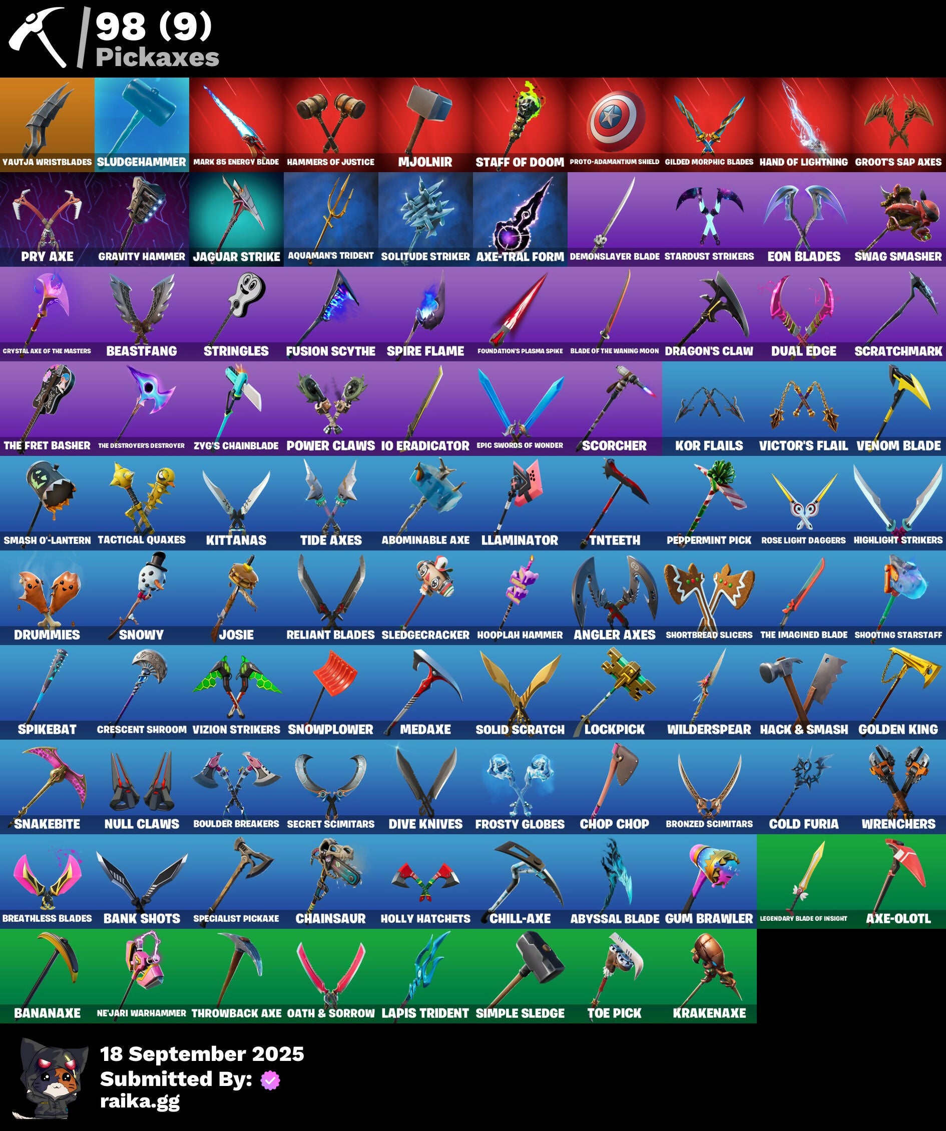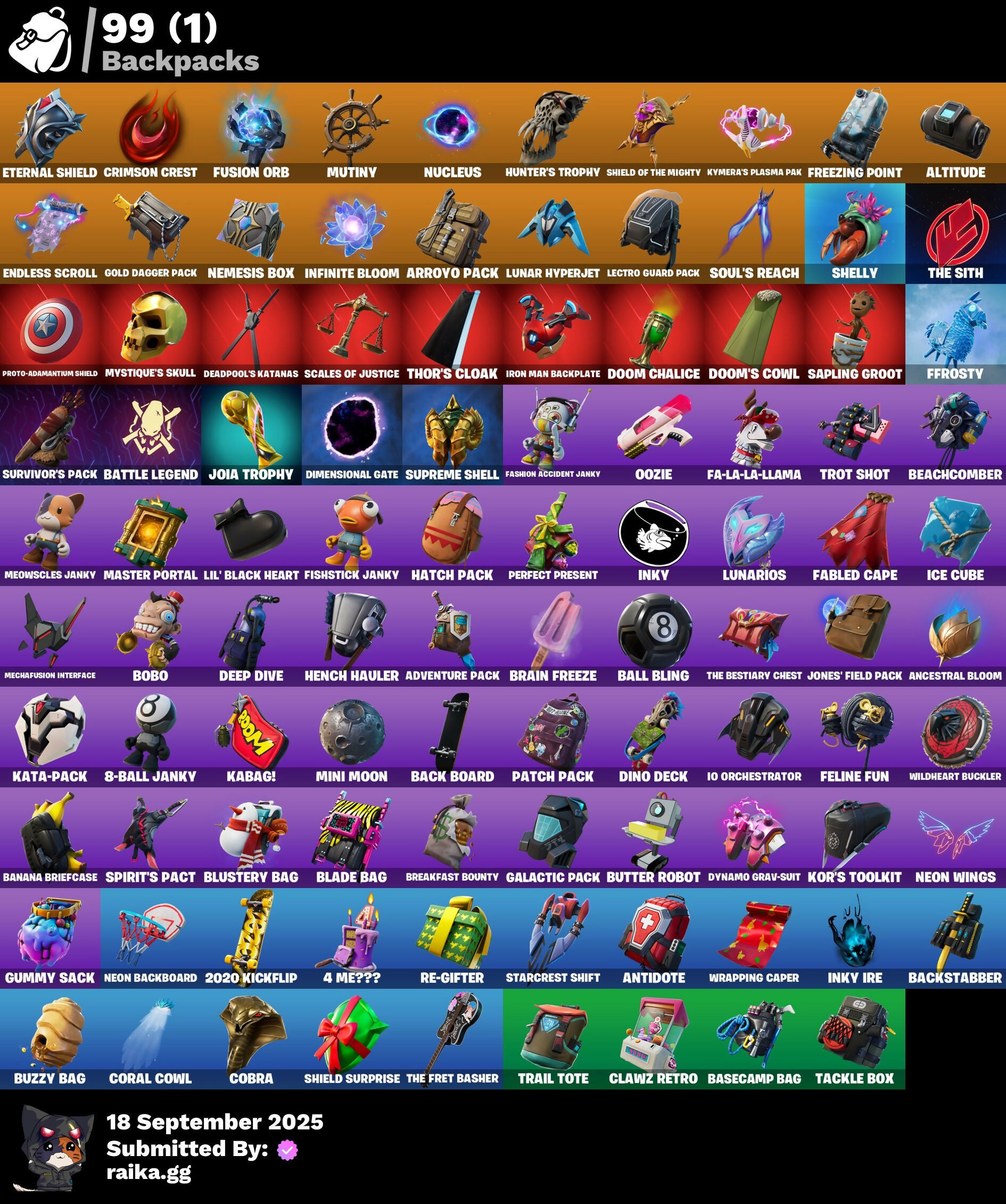 2020 Kickflip, 2022, 4 Me???, 8-Ball, 8-Ball Janky, 8-Ball Vs Scratch, A Warrior Prepares, A.L.T.E.R., Abduction, Abominable Axe, Absenz, Abyssal Blade, Acolyte's Curse, Adventure Pack, Aerial, Aerial Acrobat, Afterparty, Agent Jones, Agent Jones (Jump 31), Agent Nana, Agent Peely, Air Shredder, Altitude, Amazing Cube, Ancestral Bloom, Angelfish, Angler Axes, Antidote, Aquaman, Aquaman's Trident, Arcane Energy Glider, Arcane Steel, Arctic Adeline, Arctic Camo, Arroyo Pack, Arthur Curry, Astro Antidote, Astro Jack, Astroworld Cyclone, Avengers Logo, Avengers Quinjet, Axe-Olootl, Axe-Tral Form, Axo, Azzarath Metrion Zinthos!, Back Board, Backstabber, Bag Of Coal, Ball Bling, Banana Bomber, Banana Briefcase, Bananas, Bananaxe, Bank Shots, Banner, Banner Icon, Base Jumper, Basecamp Bag, Basketball Hoop, Batman, Battle Legend, Bawk Off, Beachcomber, Beamers, Bean Bag, Beastfang, Beef Blade, Beep Beep, Bees!, Berserker Barrage!, Big Guns, Big Haul, Bitter Sweets, Blackheart, Blackheart (Stage 8), Blade Bag, Blade Raven, Blade of the Waning Moon, Blasted, Blustery Bag, Bobo, Boing!, Bombastic Winterfest, Bombs Away!, Bone Patrol, Boogeyman, Boomin', Boots 'N' Cats, Both Eyes Open, Boulder Breakers, Bounty 'Brella, Brain Freeze, Breakfast Bounty, Breathless Blades, Brella, Bronzed Scimitars, Brutus, Bryne, Bubbloon, Bulletproof, Burpee, Bushranger, Butter Robot, Buttoned Up, Buzzy Bag, Bytes' Sigil, Cacodemon, Calico, Call Me, Callsign Skull, Cameo, Cameo Vs Chic, Captain America, Captain America's Shield, Cardistry, Cash Grab, Cat Flip, Celestia, Chainsaur, Charlotte, Charlotte's Logo, Chess Master, Chibi, Chic, Chill-Axe, Chillshot, Choice Knit, Chomp Cudi!, Chop Chop, Chop Dropper, Choppy, Chrome Marked, Chromebrella, Cinder, Classified, Clawz Retro, Clean Sweep, Cloud Llama Board, Cloudburst, Cluck, Cluck (Slurpy), Clucking Mad, Cobra, Coconuts, Coin Flip, Cold Front, Cold Furia, Comet, Comet Crasher, Comfy Cats, Confetti, Conga, Convergence, Coral Cowl, Cosmic Sun, Cowboy Chat, Crabby King, Crazy Castle, Crazy Eight, Crescent Shroom, Crimson Crest, Crimson Wish, Crowning Achievement, Crystal Axe of the Masters, Cube Marking, Cuddle Hearts, Cuddle Team Hula, Cuddly Cloudcruiser, Curling Iron, Cyclo Curl, D.C. 63, Dance Mat, Daughter Of Trigon, Deadpool, Deadpool Unmasked, Deadpool's Katanas, Deep Dive, Demons Beware, Demonslayer Blade, Denim Destiny, Diamond Shapes, Dimensional Gate, Dino Deck, Dive Knives, Doctor Doom, Doctor Slone, Doggo, Dolphin, Doom Chalice, Doom's Cowl, Downpour, Dragon Stance, Dragon's Claw, Driftstream, Driftwood, Droop, Dropout, Drummies, Dual Edge, Durrr Burger, Dynamite, Dynamo Grav-Suit, E.G.O., Eagle's Form, Eggar, Enchanted Lifebloom, Endless Scroll, Eon Blades, Epic Swords of Wonder, Equalizer, Eternal Emblem, Eternal Knight, Eternal Shield, Evasive Maneuvers, Everything's Fine, Eye Of Agomotto, Fa-La-La-Llama, Fabled Cape, Fade, Fade Out, Fallen Love Ranger, Falling Snow, Fashion Accident Janky, Feline Fun, Festive Paper, Ffrosty, Field Flyer, Fish Hook, Fishbone, Fishtick Janky, Fishy Flier, Fist, Fizzix, Flapjack Flyer, Flippin' Away, Floating Island, Fortilla Flier, Foundation's Plasma Spike, Foundational 'Brella, Fox, Freezing Point, Frost Squad, Frostbite, Frosted, Frosty Globes, Fryangles, Full Tilt, Fusion, Fusion Coil, Fusion Orb, Fusion Scythe, GG Ornament, GG Snakes, GG Snowman, Galactic Pack, Galaxy Scout, Gathering Storm, Gear Specialist Maya, Gentleman's Dab, Get Funky, Gilded Morphic Blades, Glidurrr, Glyph Master, Gold Dagger Pack, Gold Midas, Gold Touch, Golden King, Golden Shine, Golf Clap, Good Guy, Grand Salute, Grav-Fusion, Gravity Hammer, Greed, Gringle Gift, Groot, Groot Glow, Groot's Sap Axes, Ground Pound, Grriz, Grumpy Tree, Guggi Was Here, Guggimon, Gugmon, Gum Brawler, Gumbo, Gummy Sack, Gunn-Brella, Gunnar's Special, Hack & Smash, Ham, Hammerhead, Hammers of Justice, Hand of Lightning, Hand-Forged, Hang Loose Celebration, Happy, Har-Har-Har!, Hatch Pack, Hatchling, Haven, Head Banger, Heat Vision Hunter, Hello Friend, Hench, Hench Hauler, Here Comes Trubble, Hidden Haven, High Five, Highlight Strikers, Holly Hatchets, Hooplah Hammer, Hope's Look, Hot Marat, Hula Hoopin', Hunter's Skyblade, Hunter's Trophy, Hybrid, Hybrid (Stage 4) Head (Droopy), Hyperboard, I Declare!, I'm Ready!, IDK, IO Eradicator, Ice Cube, Icy Pop, Imagined Edge, Imagined Order, In Her Sights, Indigo Ice, Industrious, Infinite Bloom, Infinity Blade, Infinity Gauntlet, Ink Wolf, Inky, Inky Ire, Inside Out, Invasion, Inventor's Choice, Io Field Flyer, Io Orchestrator, Io Stealth Sail, Iron Man, Iron Man Backplate, Jaguar Strike, Jellyfish, Jennifer Walters, Jingle Wing, Joey, Joia Trophy, Jolly Roger, Jones' Field Pack, Josie, Journey, Journey Vs Hazard, Jubilation, Jules, Jules' Mask, Jurassically Charged, K.O. Cruiser, Ka-Bang!, Kabag!, Kablammo!, Kaboom!, Kal-El's Cape, Kata-Pack, Keep It Mello, Kenshi Yonezu, Keyed Up, Kick Back, King's Wrath, Kit, Kitsune, Kittanas, Knight's Helm, Kondor, Kor, Kor Flails, Kor's Toolkit, Krakenaxe, Krisabelle, Kymera, Kymera Swarm, Kymera's Plasma Pak, Lapis Trident, Lara Croft, Lara Croft (Gold Anniversary), Laser Blaze, Lectro Guard Pack, Legendary Blade of Insight, Lexa, Lil' Black Heart, Lil' Monster, Lil' Prancer, Lil' Saucer, Lil' Warthog, Lion's Roar, Llamacorn Express, Llaminator, Llamistletoe, Lloose Cannon, Lobby Classic, Lockpick, Lockstep, Lotus Touch, Love It!, Love Ranger, Lt. Evergreen, Lt. John Llama, Lunar Charge, Lunar Hyperjet, Lunar Skyspan, Lunarian Luxury, Lunarios, Lynx, Lynx (Stage 4 - No Ponytail), Mad Mask, Mancake, Mandalorian, Mandalorian (Clothing), Mark 85 Energy Blade, Mark 90 Flight Pack, Mashed Potato, Masked, Masq Mark, Master Chief, Master Engineer, Master Portal, Mave, Mave (Reactive Hair Off), Mecha Fish, Mechafusion Interface, Medaxe, Mega-Brella, Mello Made It Right, Melting Snowman, Menace, Menace (Challenger Menace - Flame), Menacing, Menacing Trace, Meow Skulls, Meow-Wow-Wow!, Meowabu