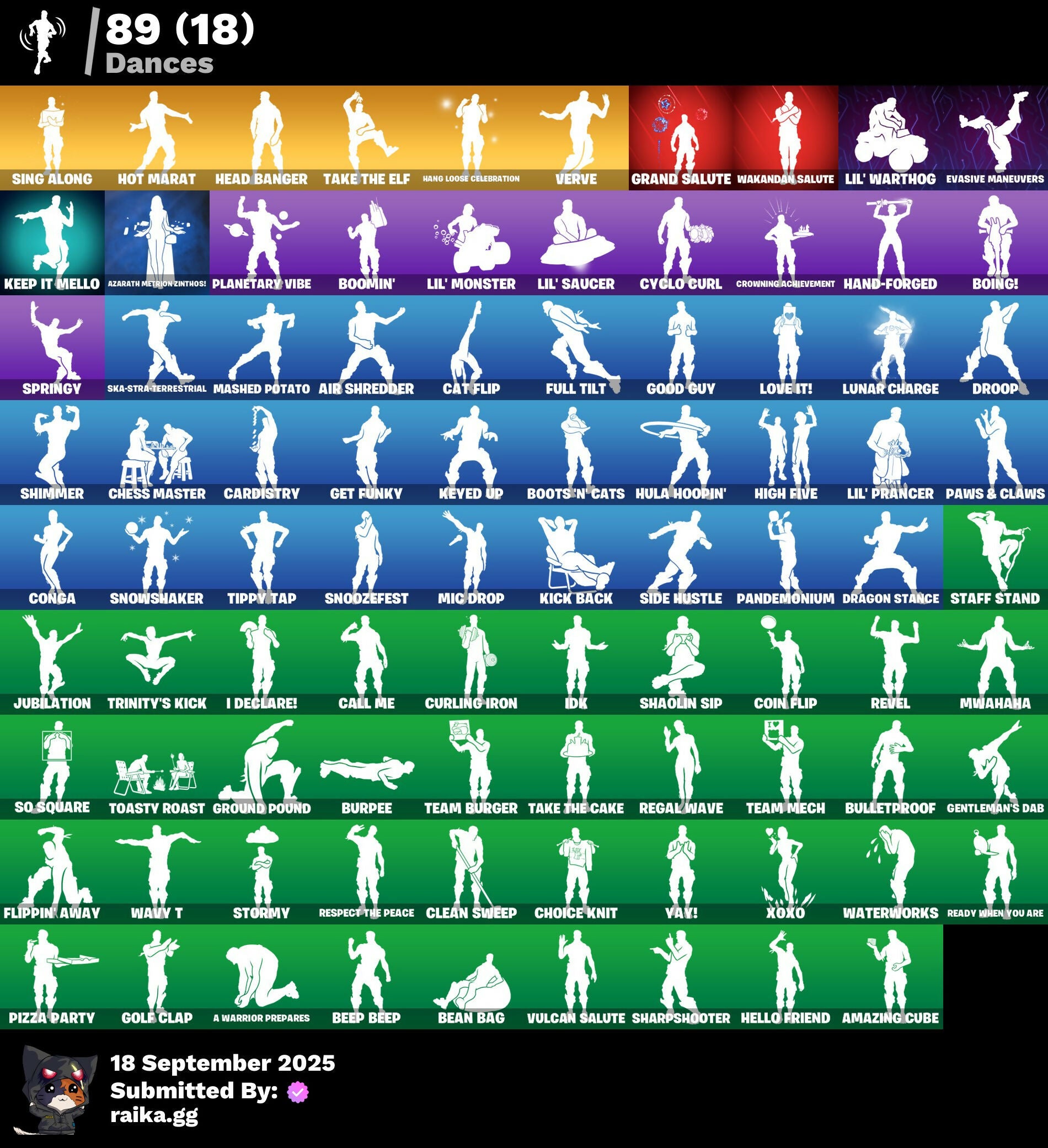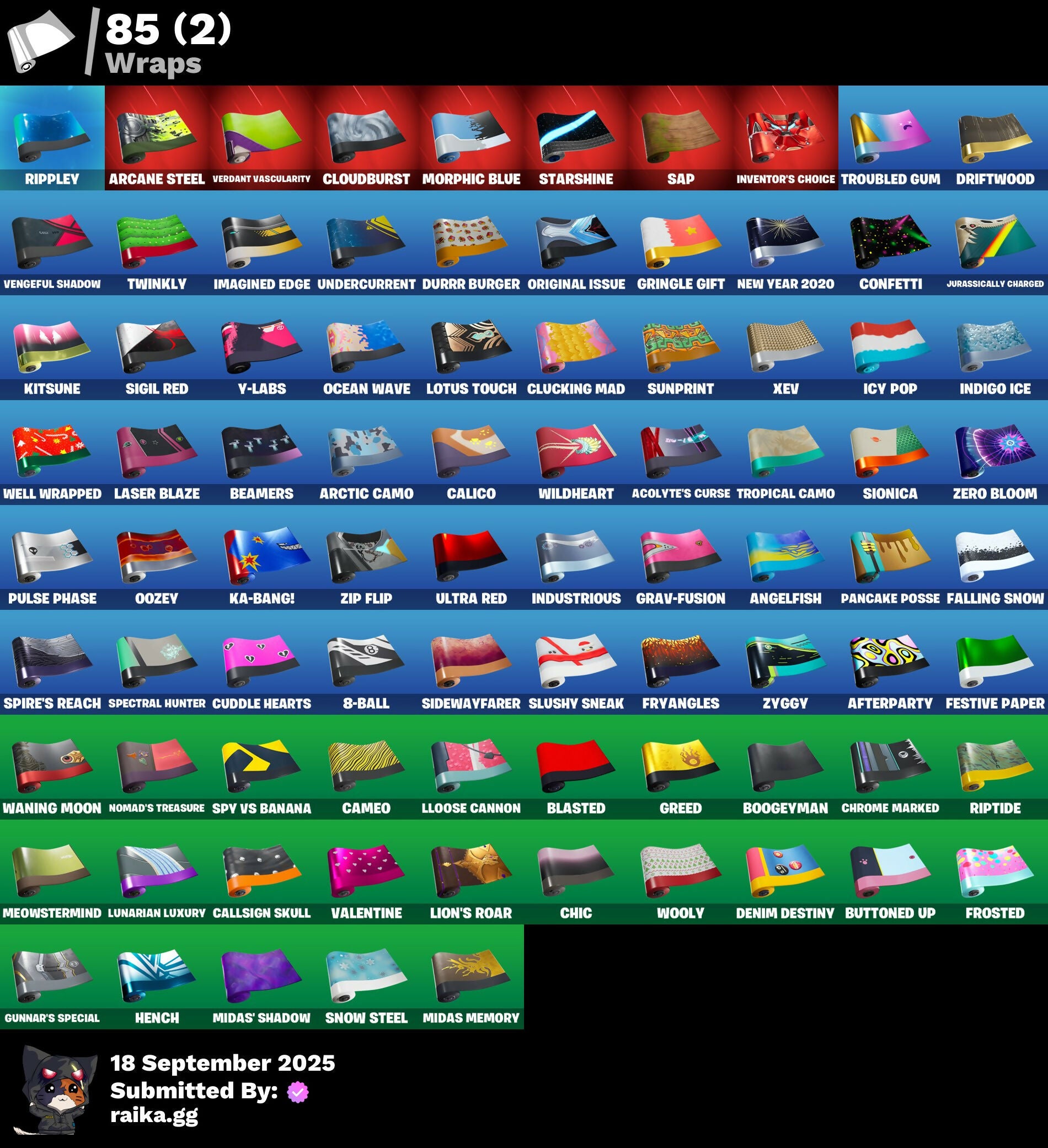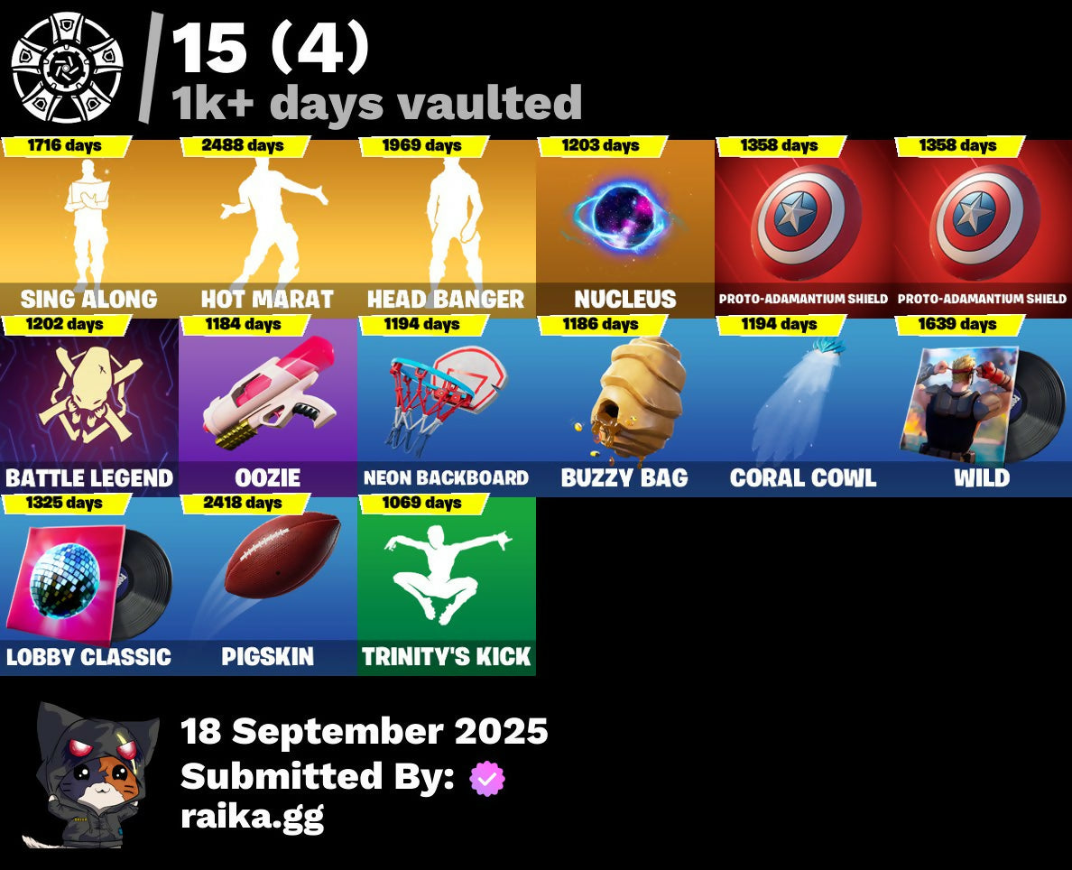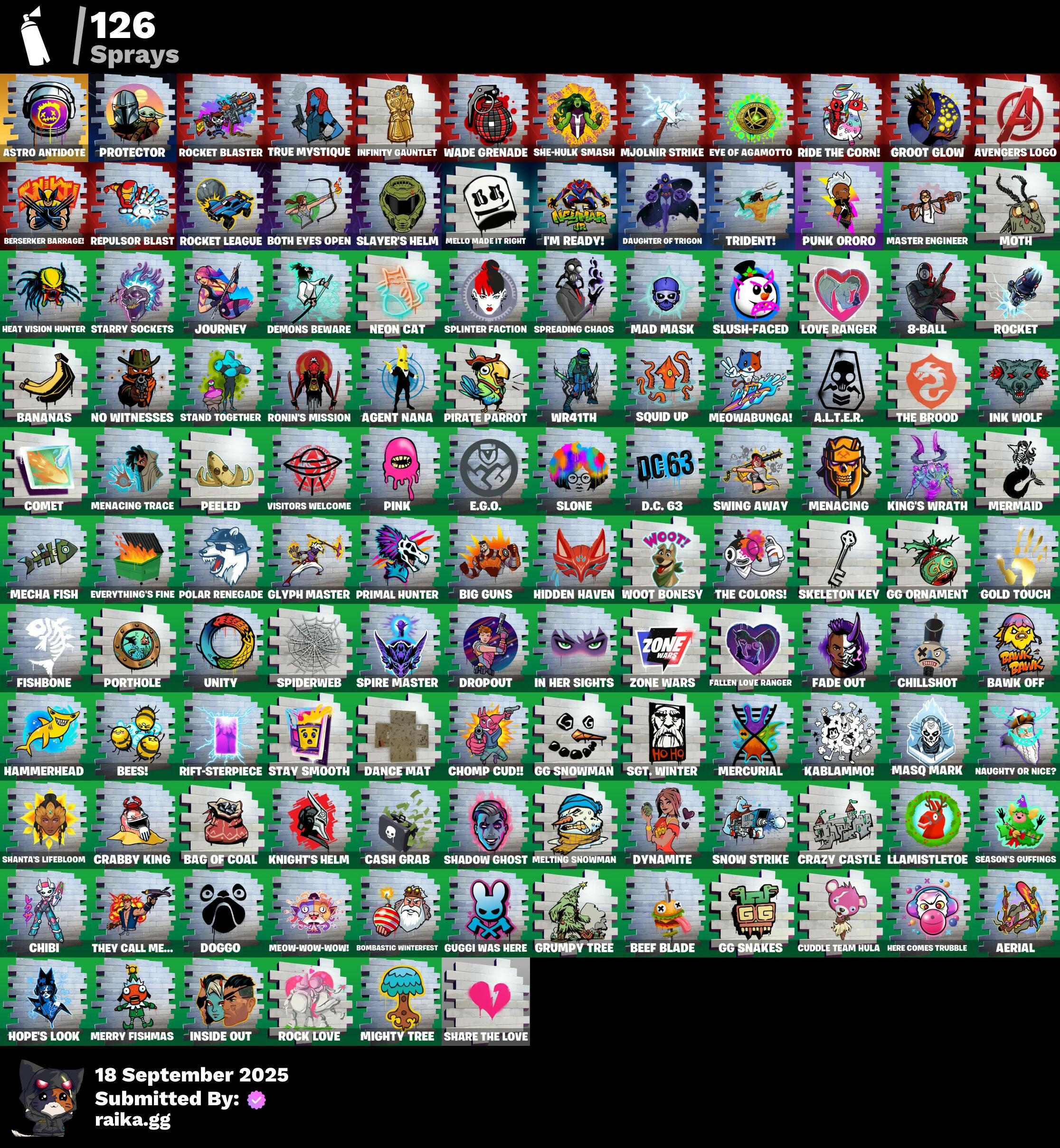 2020 Kickflip, 2022, 4 Me???, 8-Ball, 8-Ball Janky, 8-Ball Vs Scratch, A Warrior Prepares, A.L.T.E.R., Abduction, Abominable Axe, Absenz, Abyssal Blade, Acolyte's Curse, Adventure Pack, Aerial, Aerial Acrobat, Afterparty, Agent Jones, Agent Jones (Jump 31), Agent Nana, Agent Peely, Air Shredder, Altitude, Amazing Cube, Ancestral Bloom, Angelfish, Angler Axes, Antidote, Aquaman, Aquaman's Trident, Arcane Energy Glider, Arcane Steel, Arctic Adeline, Arctic Camo, Arroyo Pack, Arthur Curry, Astro Antidote, Astro Jack, Astroworld Cyclone, Avengers Logo, Avengers Quinjet, Axe-Olootl, Axe-Tral Form, Axo, Azzarath Metrion Zinthos!, Back Board, Backstabber, Bag Of Coal, Ball Bling, Banana Bomber, Banana Briefcase, Bananas, Bananaxe, Bank Shots, Banner, Banner Icon, Base Jumper, Basecamp Bag, Basketball Hoop, Batman, Battle Legend, Bawk Off, Beachcomber, Beamers, Bean Bag, Beastfang, Beef Blade, Beep Beep, Bees!, Berserker Barrage!, Big Guns, Big Haul, Bitter Sweets, Blackheart, Blackheart (Stage 8), Blade Bag, Blade Raven, Blade of the Waning Moon, Blasted, Blustery Bag, Bobo, Boing!, Bombastic Winterfest, Bombs Away!, Bone Patrol, Boogeyman, Boomin', Boots 'N' Cats, Both Eyes Open, Boulder Breakers, Bounty 'Brella, Brain Freeze, Breakfast Bounty, Breathless Blades, Brella, Bronzed Scimitars, Brutus, Bryne, Bubbloon, Bulletproof, Burpee, Bushranger, Butter Robot, Buttoned Up, Buzzy Bag, Bytes' Sigil, Cacodemon, Calico, Call Me, Callsign Skull, Cameo, Cameo Vs Chic, Captain America, Captain America's Shield, Cardistry, Cash Grab, Cat Flip, Celestia, Chainsaur, Charlotte, Charlotte's Logo, Chess Master, Chibi, Chic, Chill-Axe, Chillshot, Choice Knit, Chomp Cudi!, Chop Chop, Chop Dropper, Choppy, Chrome Marked, Chromebrella, Cinder, Classified, Clawz Retro, Clean Sweep, Cloud Llama Board, Cloudburst, Cluck, Cluck (Slurpy), Clucking Mad, Cobra, Coconuts, Coin Flip, Cold Front, Cold Furia, Comet, Comet Crasher, Comfy Cats, Confetti, Conga, Convergence, Coral Cowl, Cosmic Sun, Cowboy Chat, Crabby King, Crazy Castle, Crazy Eight, Crescent Shroom, Crimson Crest, Crimson Wish, Crowning Achievement, Crystal Axe of the Masters, Cube Marking, Cuddle Hearts, Cuddle Team Hula, Cuddly Cloudcruiser, Curling Iron, Cyclo Curl, D.C. 63, Dance Mat, Daughter Of Trigon, Deadpool, Deadpool Unmasked, Deadpool's Katanas, Deep Dive, Demons Beware, Demonslayer Blade, Denim Destiny, Diamond Shapes, Dimensional Gate, Dino Deck, Dive Knives, Doctor Doom, Doctor Slone, Doggo, Dolphin, Doom Chalice, Doom's Cowl, Downpour, Dragon Stance, Dragon's Claw, Driftstream, Driftwood, Droop, Dropout, Drummies, Dual Edge, Durrr Burger, Dynamite, Dynamo Grav-Suit, E.G.O., Eagle's Form, Eggar, Enchanted Lifebloom, Endless Scroll, Eon Blades, Epic Swords of Wonder, Equalizer, Eternal Emblem, Eternal Knight, Eternal Shield, Evasive Maneuvers, Everything's Fine, Eye Of Agomotto, Fa-La-La-Llama, Fabled Cape, Fade, Fade Out, Fallen Love Ranger, Falling Snow, Fashion Accident Janky, Feline Fun, Festive Paper, Ffrosty, Field Flyer, Fish Hook, Fishbone, Fishtick Janky, Fishy Flier, Fist, Fizzix, Flapjack Flyer, Flippin' Away, Floating Island, Fortilla Flier, Foundation's Plasma Spike, Foundational 'Brella, Fox, Freezing Point, Frost Squad, Frostbite, Frosted, Frosty Globes, Fryangles, Full Tilt, Fusion, Fusion Coil, Fusion Orb, Fusion Scythe, GG Ornament, GG Snakes, GG Snowman, Galactic Pack, Galaxy Scout, Gathering Storm, Gear Specialist Maya, Gentleman's Dab, Get Funky, Gilded Morphic Blades, Glidurrr, Glyph Master, Gold Dagger Pack, Gold Midas, Gold Touch, Golden King, Golden Shine, Golf Clap, Good Guy, Grand Salute, Grav-Fusion, Gravity Hammer, Greed, Gringle Gift, Groot, Groot Glow, Groot's Sap Axes, Ground Pound, Grriz, Grumpy Tree, Guggi Was Here, Guggimon, Gugmon, Gum Brawler, Gumbo, Gummy Sack, Gunn-Brella, Gunnar's Special, Hack & Smash, Ham, Hammerhead, Hammers of Justice, Hand of Lightning, Hand-Forged, Hang Loose Celebration, Happy, Har-Har-Har!, Hatch Pack, Hatchling, Haven, Head Banger, Heat Vision Hunter, Hello Friend, Hench, Hench Hauler, Here Comes Trubble, Hidden Haven, High Five, Highlight Strikers, Holly Hatchets, Hooplah Hammer, Hope's Look, Hot Marat, Hula Hoopin', Hunter's Skyblade, Hunter's Trophy, Hybrid, Hybrid (Stage 4) Head (Droopy), Hyperboard, I Declare!, I'm Ready!, IDK, IO Eradicator, Ice Cube, Icy Pop, Imagined Edge, Imagined Order, In Her Sights, Indigo Ice, Industrious, Infinite Bloom, Infinity Blade, Infinity Gauntlet, Ink Wolf, Inky, Inky Ire, Inside Out, Invasion, Inventor's Choice, Io Field Flyer, Io Orchestrator, Io Stealth Sail, Iron Man, Iron Man Backplate, Jaguar Strike, Jellyfish, Jennifer Walters, Jingle Wing, Joey, Joia Trophy, Jolly Roger, Jones' Field Pack, Josie, Journey, Journey Vs Hazard, Jubilation, Jules, Jules' Mask, Jurassically Charged, K.O. Cruiser, Ka-Bang!, Kabag!, Kablammo!, Kaboom!, Kal-El's Cape, Kata-Pack, Keep It Mello, Kenshi Yonezu, Keyed Up, Kick Back, King's Wrath, Kit, Kitsune, Kittanas, Knight's Helm, Kondor, Kor, Kor Flails, Kor's Toolkit, Krakenaxe, Krisabelle, Kymera, Kymera Swarm, Kymera's Plasma Pak, Lapis Trident, Lara Croft, Lara Croft (Gold Anniversary), Laser Blaze, Lectro Guard Pack, Legendary Blade of Insight, Lexa, Lil' Black Heart, Lil' Monster, Lil' Prancer, Lil' Saucer, Lil' Warthog, Lion's Roar, Llamacorn Express, Llaminator, Llamistletoe, Lloose Cannon, Lobby Classic, Lockpick, Lockstep, Lotus Touch, Love It!, Love Ranger, Lt. Evergreen, Lt. John Llama, Lunar Charge, Lunar Hyperjet, Lunar Skyspan, Lunarian Luxury, Lunarios, Lynx, Lynx (Stage 4 - No Ponytail), Mad Mask, Mancake, Mandalorian, Mandalorian (Clothing), Mark 85 Energy Blade, Mark 90 Flight Pack, Mashed Potato, Masked, Masq Mark, Master Chief, Master Engineer, Master Portal, Mave, Mave (Reactive Hair Off), Mecha Fish, Mechafusion Interface, Medaxe, Mega-Brella, Mello Made It Right, Melting Snowman, Menace, Menace (Challenger Menace - Flame), Menacing, Menacing Trace, Meow Skulls, Meow-Wow-Wow!, Meowabu
