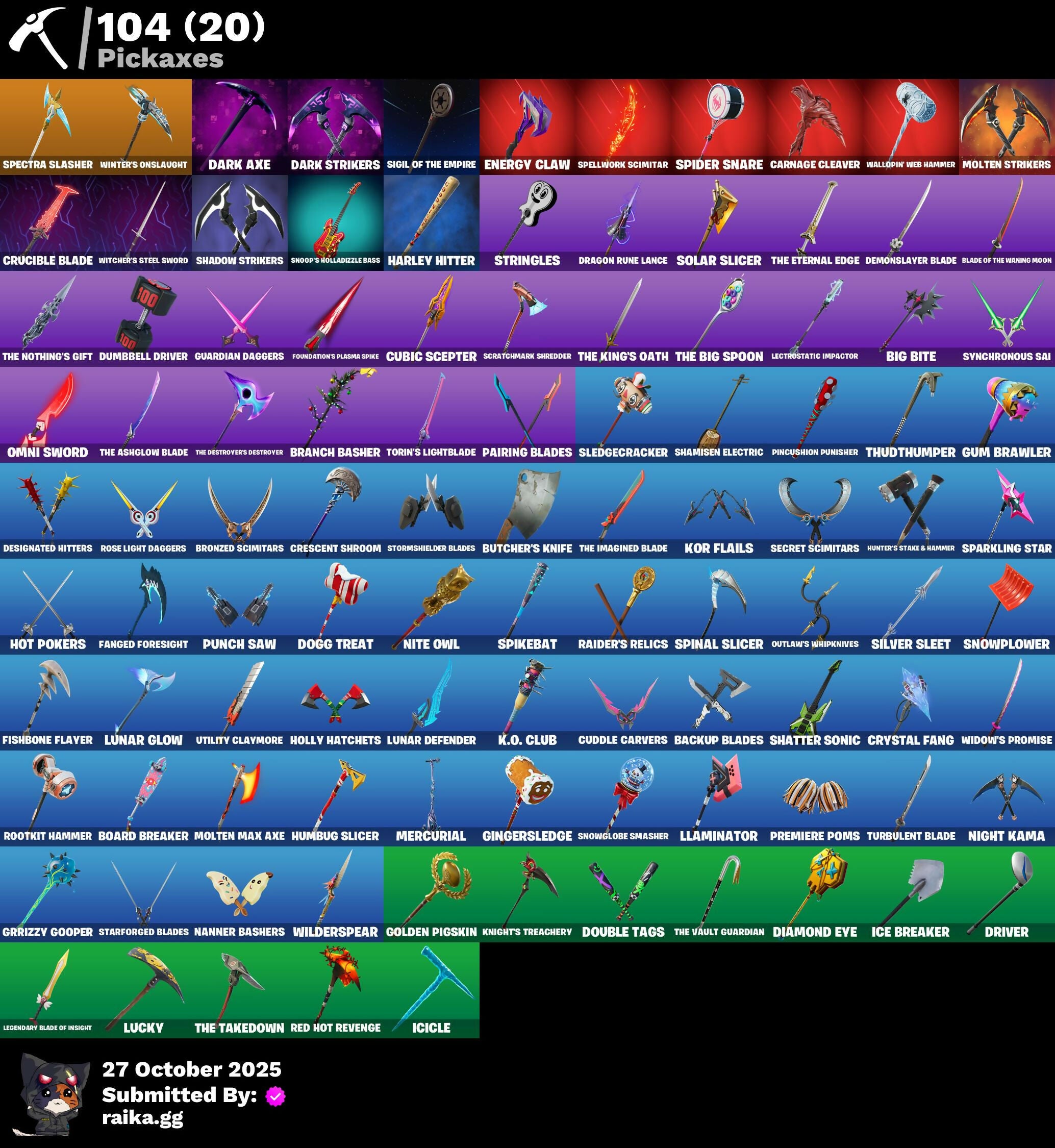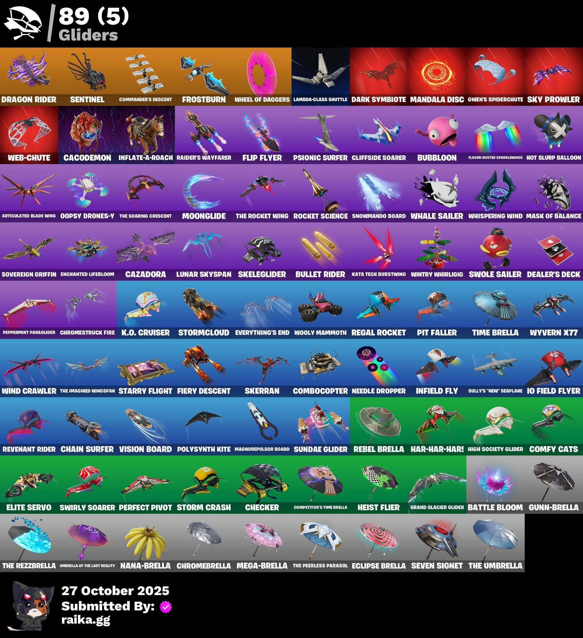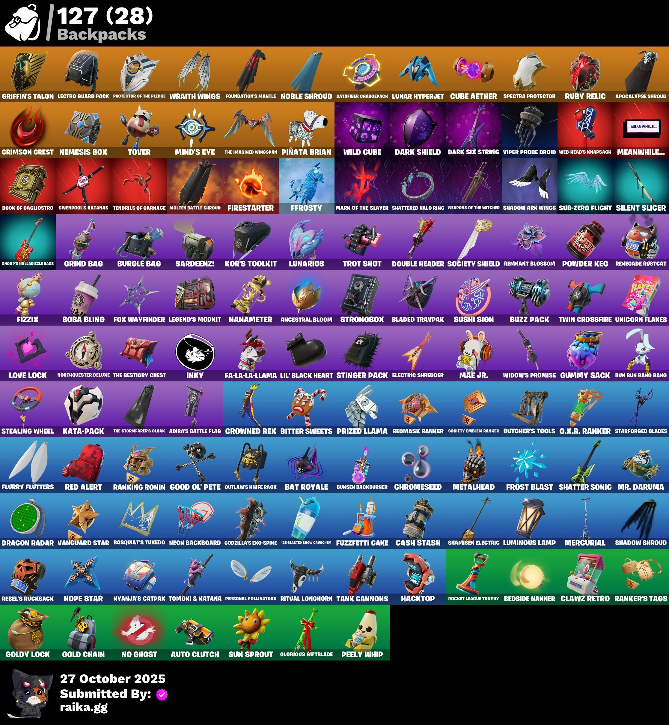 10 Field Flyer, 2.0's Revenge, 2022, Acrhobatics, Adira, Adira's Armor, Adira's Battle Flag, Aerial, Aerial Classic, Aerial Swagger, Ancestral Bloom, Andromeda, Apocalypse Shroud, Arctic Adeline, Art The Hack, Articulated Blade Wing, Ascension Nezumi, Astro Armor, Auntie Dot, Aura, Aurelian, Auto Clutch, Axo, B.R.U.T.E. Competitor, Backup Blades, Balance Board, Banner Icon, Baseball, Basquiat's Tuxedo, Bat Royale, Battle Bloom, Battle Mode, Be The Mastermind, Bear Hug, Bedside Nanner, Big Bite, Big Fan, Big Guns, Bitter Sweets, Black Hole, Blade of the Waning Moon, Bladed Travpak, Blaze, Blocko, Bloomin' Bouquet, Blowin' Up, Board Breaker, Board Flair, Boba Bling, Boba Snack, Bombastic Winterfest, Boneyard Brand, Boogie Down, Book of Cagliostro, Boosting Ki, Branch Basher, Bronzed Scimitars, Bruteball, Bubbloon, Bullet Rider, Bullpen Brawler Dusty, Bun Bun Bang Bang, Bun Bun Blast, Bunsen Backburner, Burgle Bag, Burning Dragon, Bushie Bright, Butcher's Knife, Butcher's Tools, Buttoned Up, Buzz Pack, Bytes, Bytes' Sigil, Cacodemon, Called Shot, Cap K.O., Carnage, Carnage Cleaver, Cash Stash, Cazadora, Chain Surfer, Charlotte, Charlotte's Logo, Checker, Checks And Scratches, Chicken Wing It, Chimichanga!, Chimpanski Wants You, Chloe Kim, Choice Knit, Chomp Cud!!, Chrome Marked, Chrome Punk, Chromebrella, Chromeseed, Chromestruck Fire, Chronos Lock, Clawz Retro, Cliffside Soarer, Club President Helsie, Cold Blooded, Color Crush, Combat Elite, Combat Giller, Combocopter, Comfy Cats, Commander's Descent, Competitor's Time Brella, Conjure Weapon, Contour Camo, Controlled Focus, Controller Crew, Copines, Corrosive Stripe, Count It!, Courageous Mikasa, Crescent Shroom, Crimson Crest, Crowned Rex, Crowning Achievement, Crucible Blade, Crystal, Crystal Fang, Cube Aether, Cubed, Cubic Scepter, Cuddle Carvers, Curling Iron, Cyclo Curl, D.C. 63, Dagger Dance, Daisies, Dance Monkey, Dark Angular Shift, Dark Axe, Dark Jonesy, Dark Power Chord, Dark Red Knight, Dark Shield, Dark Side Rising, Dark Six String, Dark Strikers, Dark Symbiote, Dark Wild Card, Darth Shader, Darth Vader, Datafiber Chargepack, Dealer's Deck, Deep Future, Deku, Demons Beware, Demonslayer Blade, Designated Hitters, Determined Renegade, Diamond Eye, Dimensional Camo, Dirtbike Challenge, Diva's Grin, Division, Do The Split, Doctor Strange, Dogg Treat, Doom Slayer, Double Header, Double Tags, Doze Dab, Dragon Radar, Dragon Rider, Dragon Rune Lance, Dragon Rune Lances, Dragon Spirit, Drippy Drift, Driver, Drones-Y View, Dumbbell Driver, Dusty, Eclipse Brella, Electric Shredder, Elite Servo, Enchanted Lifebloom, Energy Claw, Ensnared, Erisa, Erisa Alert, Erisa's Crest, Escapees, Everything's End, Evie, Exile's Emblem, Eye Of Agamoto, Fa-La-La-Llama, Fabio Sparklemane, Fanged Foresight, Ffrosty, Fiery Descent, Final Eclipse, Final Harbinger, Firestarter, Fishbone Flayer, Fizzix, Flashback Breakdown, Flavor-Dusted Sparklewings, Flip Flyer, Flurry Flutters, Fncs 3:1 Champion, Foil Flex, Foundation's Mantle, Foundation's Plasma Spike, Foundational, Fox Wayfinder, Freshly Forged, Frost Blast, Frostburn, Fusion!, Fuzzfetti Cake, Galactic Turquoise, Geared Up, Geralt, Geralt of Rivia, Gila Classic, Gilded Reality, Gingerbread Raider, Gingersledge, Glorious Giftblade, Godzilla's Exo-Spine, Gohan Beast, Gold Blooded Ace, Gold Blooded Style, Gold Chain, Golden Goal, Golden Pigskin, Goldy Lock, Good Ol' Pete, Grand Glacier Glider, Grand Salute, Griffin's Talon, Grimbles, Grind Bag, Gringle Gift, Grizzly Gooper, Grizzly Gunz, Groovy!, Ground Pound, Grriz, Guardian Daggers, Guild, Gum Brawler, Gumbo, Gummy Sack, Gun Show, Gunn-Brella, Gunnar, Gunnar's Special, Gwen Stacy, Gwen's Spiderchute, Gwenpool's Katanas, Gwetterman Jacket, Hacktop, Hand of Trace, Hand-Forged, Har-Har-Har!, Harbinger Armor Omegarok, Harbinger Of Victory, Harley Hitter, Harlowe, Haute Hustle, Haven, Hax Saur, Headpiece, Heart Sign, Heart's Desire, Heist Flier, Helmet, Helsie, Here Comes Trubble, Hexture, Hidden Haven, High Society Glider, High Stakes Club, Holiday Boxy, Holly Hatchets, Hop And A Wink, Hope Star, Hope's Look, Hot Pokers, Hot Slurp Balloon, Humbug Slicer, Hummingboard, Hunter Purple, Hunter's Crest, Hunter's Stake & Hammer, Huntress Calamity, Hypno-Bat, Hypnot-Eyes, I Am Fearless, I Need You to Concentrate, IO Elite Spec, Ice Breaker, Ice-Blasted Snow Crunch, Icicle, If Looks Could..., Igni Sign, Imagined, Imperial March, In Btwn, In Her Sights, Indiana Jones' Hat, Infield Fly, Infinite Swirl, Inflate-A-Roach, Inky, Investigate, It Is Finished, It's A Vibe, It's All Gonna Be Red Soon, It's Like This, It's... You?, J.B. Chimpanski, Je Suis Montague, Jet Signals, Jubilation, Jujutsu Kaisen Emblem, Jungle Scout, Just Desserts, K.O. Club, K.O. Cruiser, Kata Tech Burstwing, Kata-Pack, Kiara K.O., King's Seal, Knight's Helm, Knight's Honor, Knight's Treachery, Kon's Bark, Kor, Kor Flails, Kor's Toolkit, Krisabelle, LBC Signature, Lady In Gold, Lambda-Class Shuttle, Laser Focused, Lectro Guard Pack, Lectro Tech, Lectrostatic Impactor, Legend's Modkit, Legendary Blade of Insight, Lennox Rose, Lil Split, Lil' Black Heart, Lil' Longboat, Lil' Monster, Lil' Prancer, Lil' Rover, Lithic, Llaminator, Llamistletoe, Lloose Cannon, Lobby Classic, Lord Vader, Lotus Touch, Love It!, Love Lock, Lt. John Llama, Lucky, Luminous Lamp, Lunar Charge, Lunar Defender, Lunar Glow, Lunar Hyperjet, Lunar Party, Lunar Skyspan, Lunarian Luxury, Lunarios, Machinist In Control, Mad Mask, Mae Jr., Magnorepulsor Board, Make A Seat, Malik, Malik's Honor, Malik's Sigil, Mandala Disc, Mane Event, Manic, Mark Of The Champion, Mark of the Slayer, Mask of Balance, Masked Victory, Massai, Massai Fire, Master Plan, Maximum Carnage, Meanwhile..., Meat Grinder, Mega-Brella, Menacing Trace, Meow Skulls, Meow-Wow-Wow!, Mercurial, Merry Stripe, Metalhead, Mid-Swing, Midnight Rumble, Mind's Eye, Mini Slayer Fistbump, Modern Rónin, Molten Angular Shift, Molten Battle Shroud, Molten Max Axe, Molten Omen, Molten 