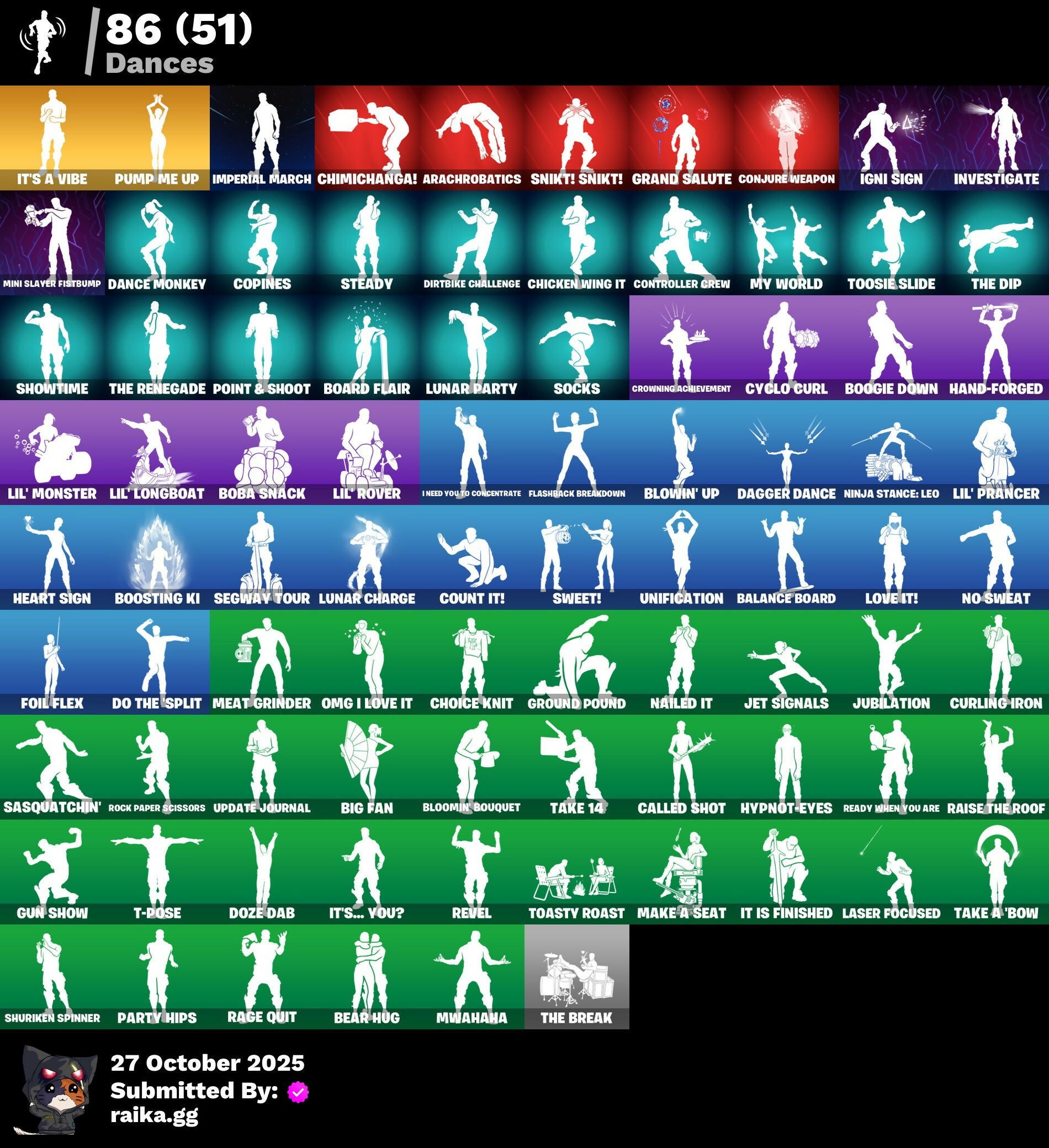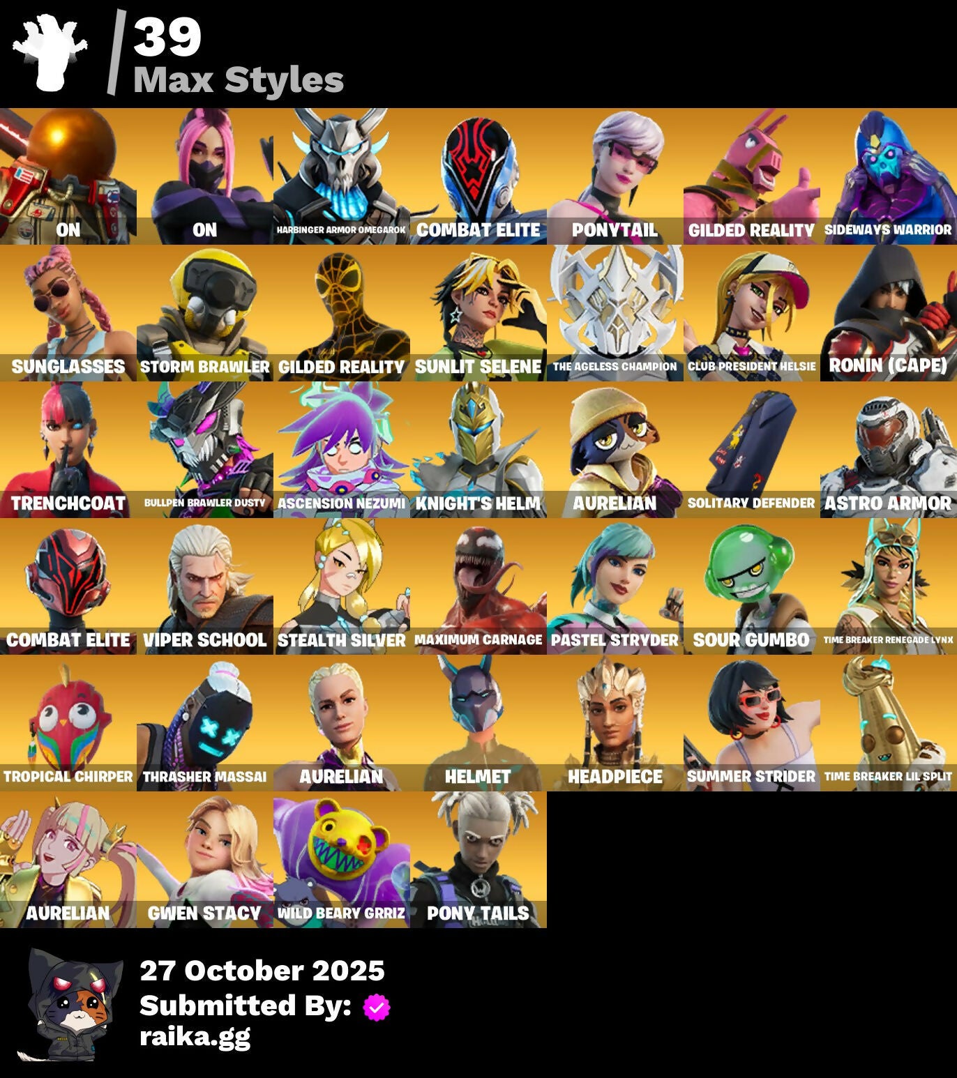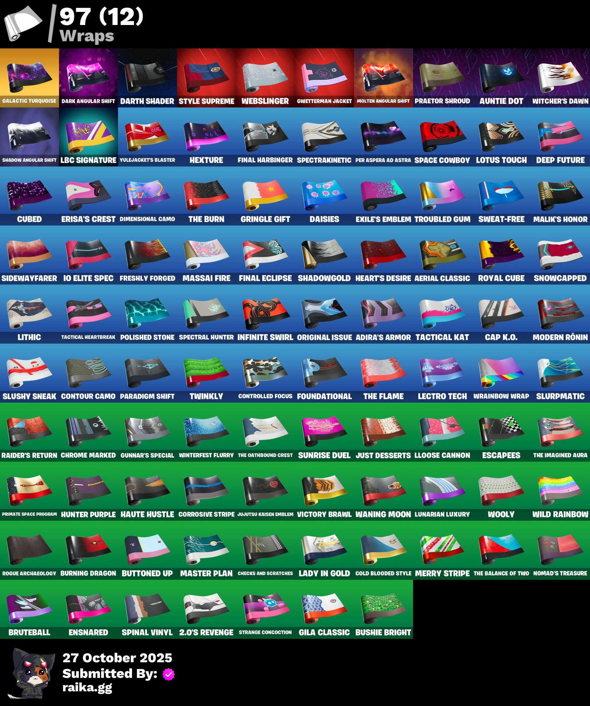 10 Field Flyer, 2.0's Revenge, 2022, Acrhobatics, Adira, Adira's Armor, Adira's Battle Flag, Aerial, Aerial Classic, Aerial Swagger, Ancestral Bloom, Andromeda, Apocalypse Shroud, Arctic Adeline, Art The Hack, Articulated Blade Wing, Ascension Nezumi, Astro Armor, Auntie Dot, Aura, Aurelian, Auto Clutch, Axo, B.R.U.T.E. Competitor, Backup Blades, Balance Board, Banner Icon, Baseball, Basquiat's Tuxedo, Bat Royale, Battle Bloom, Battle Mode, Be The Mastermind, Bear Hug, Bedside Nanner, Big Bite, Big Fan, Big Guns, Bitter Sweets, Black Hole, Blade of the Waning Moon, Bladed Travpak, Blaze, Blocko, Bloomin' Bouquet, Blowin' Up, Board Breaker, Board Flair, Boba Bling, Boba Snack, Bombastic Winterfest, Boneyard Brand, Boogie Down, Book of Cagliostro, Boosting Ki, Branch Basher, Bronzed Scimitars, Bruteball, Bubbloon, Bullet Rider, Bullpen Brawler Dusty, Bun Bun Bang Bang, Bun Bun Blast, Bunsen Backburner, Burgle Bag, Burning Dragon, Bushie Bright, Butcher's Knife, Butcher's Tools, Buttoned Up, Buzz Pack, Bytes, Bytes' Sigil, Cacodemon, Called Shot, Cap K.O., Carnage, Carnage Cleaver, Cash Stash, Cazadora, Chain Surfer, Charlotte, Charlotte's Logo, Checker, Checks And Scratches, Chicken Wing It, Chimichanga!, Chimpanski Wants You, Chloe Kim, Choice Knit, Chomp Cud!!, Chrome Marked, Chrome Punk, Chromebrella, Chromeseed, Chromestruck Fire, Chronos Lock, Clawz Retro, Cliffside Soarer, Club President Helsie, Cold Blooded, Color Crush, Combat Elite, Combat Giller, Combocopter, Comfy Cats, Commander's Descent, Competitor's Time Brella, Conjure Weapon, Contour Camo, Controlled Focus, Controller Crew, Copines, Corrosive Stripe, Count It!, Courageous Mikasa, Crescent Shroom, Crimson Crest, Crowned Rex, Crowning Achievement, Crucible Blade, Crystal, Crystal Fang, Cube Aether, Cubed, Cubic Scepter, Cuddle Carvers, Curling Iron, Cyclo Curl, D.C. 63, Dagger Dance, Daisies, Dance Monkey, Dark Angular Shift, Dark Axe, Dark Jonesy, Dark Power Chord, Dark Red Knight, Dark Shield, Dark Side Rising, Dark Six String, Dark Strikers, Dark Symbiote, Dark Wild Card, Darth Shader, Darth Vader, Datafiber Chargepack, Dealer's Deck, Deep Future, Deku, Demons Beware, Demonslayer Blade, Designated Hitters, Determined Renegade, Diamond Eye, Dimensional Camo, Dirtbike Challenge, Diva's Grin, Division, Do The Split, Doctor Strange, Dogg Treat, Doom Slayer, Double Header, Double Tags, Doze Dab, Dragon Radar, Dragon Rider, Dragon Rune Lance, Dragon Rune Lances, Dragon Spirit, Drippy Drift, Driver, Drones-Y View, Dumbbell Driver, Dusty, Eclipse Brella, Electric Shredder, Elite Servo, Enchanted Lifebloom, Energy Claw, Ensnared, Erisa, Erisa Alert, Erisa's Crest, Escapees, Everything's End, Evie, Exile's Emblem, Eye Of Agamoto, Fa-La-La-Llama, Fabio Sparklemane, Fanged Foresight, Ffrosty, Fiery Descent, Final Eclipse, Final Harbinger, Firestarter, Fishbone Flayer, Fizzix, Flashback Breakdown, Flavor-Dusted Sparklewings, Flip Flyer, Flurry Flutters, Fncs 3:1 Champion, Foil Flex, Foundation's Mantle, Foundation's Plasma Spike, Foundational, Fox Wayfinder, Freshly Forged, Frost Blast, Frostburn, Fusion!, Fuzzfetti Cake, Galactic Turquoise, Geared Up, Geralt, Geralt of Rivia, Gila Classic, Gilded Reality, Gingerbread Raider, Gingersledge, Glorious Giftblade, Godzilla's Exo-Spine, Gohan Beast, Gold Blooded Ace, Gold Blooded Style, Gold Chain, Golden Goal, Golden Pigskin, Goldy Lock, Good Ol' Pete, Grand Glacier Glider, Grand Salute, Griffin's Talon, Grimbles, Grind Bag, Gringle Gift, Grizzly Gooper, Grizzly Gunz, Groovy!, Ground Pound, Grriz, Guardian Daggers, Guild, Gum Brawler, Gumbo, Gummy Sack, Gun Show, Gunn-Brella, Gunnar, Gunnar's Special, Gwen Stacy, Gwen's Spiderchute, Gwenpool's Katanas, Gwetterman Jacket, Hacktop, Hand of Trace, Hand-Forged, Har-Har-Har!, Harbinger Armor Omegarok, Harbinger Of Victory, Harley Hitter, Harlowe, Haute Hustle, Haven, Hax Saur, Headpiece, Heart Sign, Heart's Desire, Heist Flier, Helmet, Helsie, Here Comes Trubble, Hexture, Hidden Haven, High Society Glider, High Stakes Club, Holiday Boxy, Holly Hatchets, Hop And A Wink, Hope Star, Hope's Look, Hot Pokers, Hot Slurp Balloon, Humbug Slicer, Hummingboard, Hunter Purple, Hunter's Crest, Hunter's Stake & Hammer, Huntress Calamity, Hypno-Bat, Hypnot-Eyes, I Am Fearless, I Need You to Concentrate, IO Elite Spec, Ice Breaker, Ice-Blasted Snow Crunch, Icicle, If Looks Could..., Igni Sign, Imagined, Imperial March, In Btwn, In Her Sights, Indiana Jones' Hat, Infield Fly, Infinite Swirl, Inflate-A-Roach, Inky, Investigate, It Is Finished, It's A Vibe, It's All Gonna Be Red Soon, It's Like This, It's... You?, J.B. Chimpanski, Je Suis Montague, Jet Signals, Jubilation, Jujutsu Kaisen Emblem, Jungle Scout, Just Desserts, K.O. Club, K.O. Cruiser, Kata Tech Burstwing, Kata-Pack, Kiara K.O., King's Seal, Knight's Helm, Knight's Honor, Knight's Treachery, Kon's Bark, Kor, Kor Flails, Kor's Toolkit, Krisabelle, LBC Signature, Lady In Gold, Lambda-Class Shuttle, Laser Focused, Lectro Guard Pack, Lectro Tech, Lectrostatic Impactor, Legend's Modkit, Legendary Blade of Insight, Lennox Rose, Lil Split, Lil' Black Heart, Lil' Longboat, Lil' Monster, Lil' Prancer, Lil' Rover, Lithic, Llaminator, Llamistletoe, Lloose Cannon, Lobby Classic, Lord Vader, Lotus Touch, Love It!, Love Lock, Lt. John Llama, Lucky, Luminous Lamp, Lunar Charge, Lunar Defender, Lunar Glow, Lunar Hyperjet, Lunar Party, Lunar Skyspan, Lunarian Luxury, Lunarios, Machinist In Control, Mad Mask, Mae Jr., Magnorepulsor Board, Make A Seat, Malik, Malik's Honor, Malik's Sigil, Mandala Disc, Mane Event, Manic, Mark Of The Champion, Mark of the Slayer, Mask of Balance, Masked Victory, Massai, Massai Fire, Master Plan, Maximum Carnage, Meanwhile..., Meat Grinder, Mega-Brella, Menacing Trace, Meow Skulls, Meow-Wow-Wow!, Mercurial, Merry Stripe, Metalhead, Mid-Swing, Midnight Rumble, Mind's Eye, Mini Slayer Fistbump, Modern Rónin, Molten Angular Shift, Molten Battle Shroud, Molten Max Axe, Molten Omen, Molten 