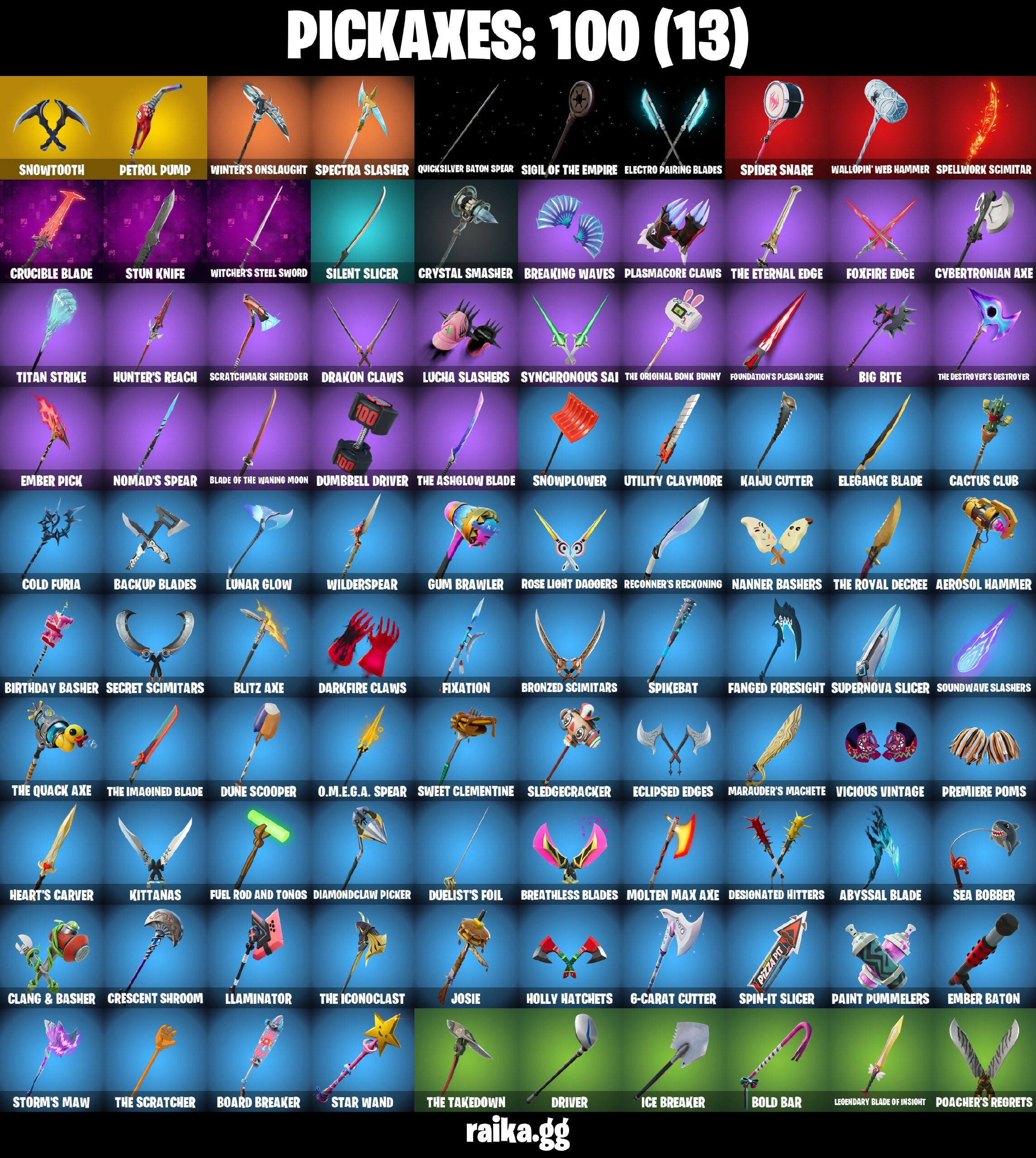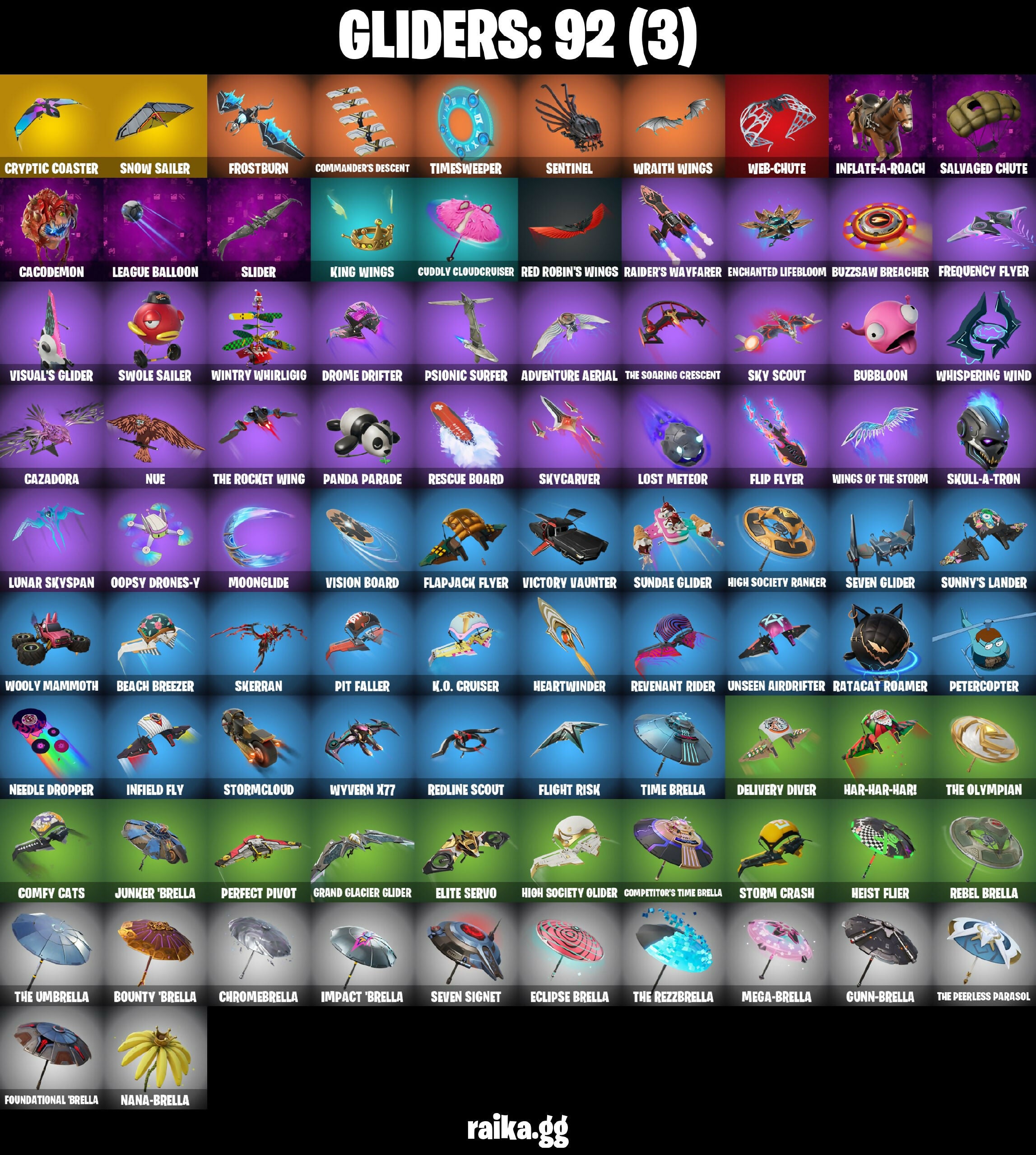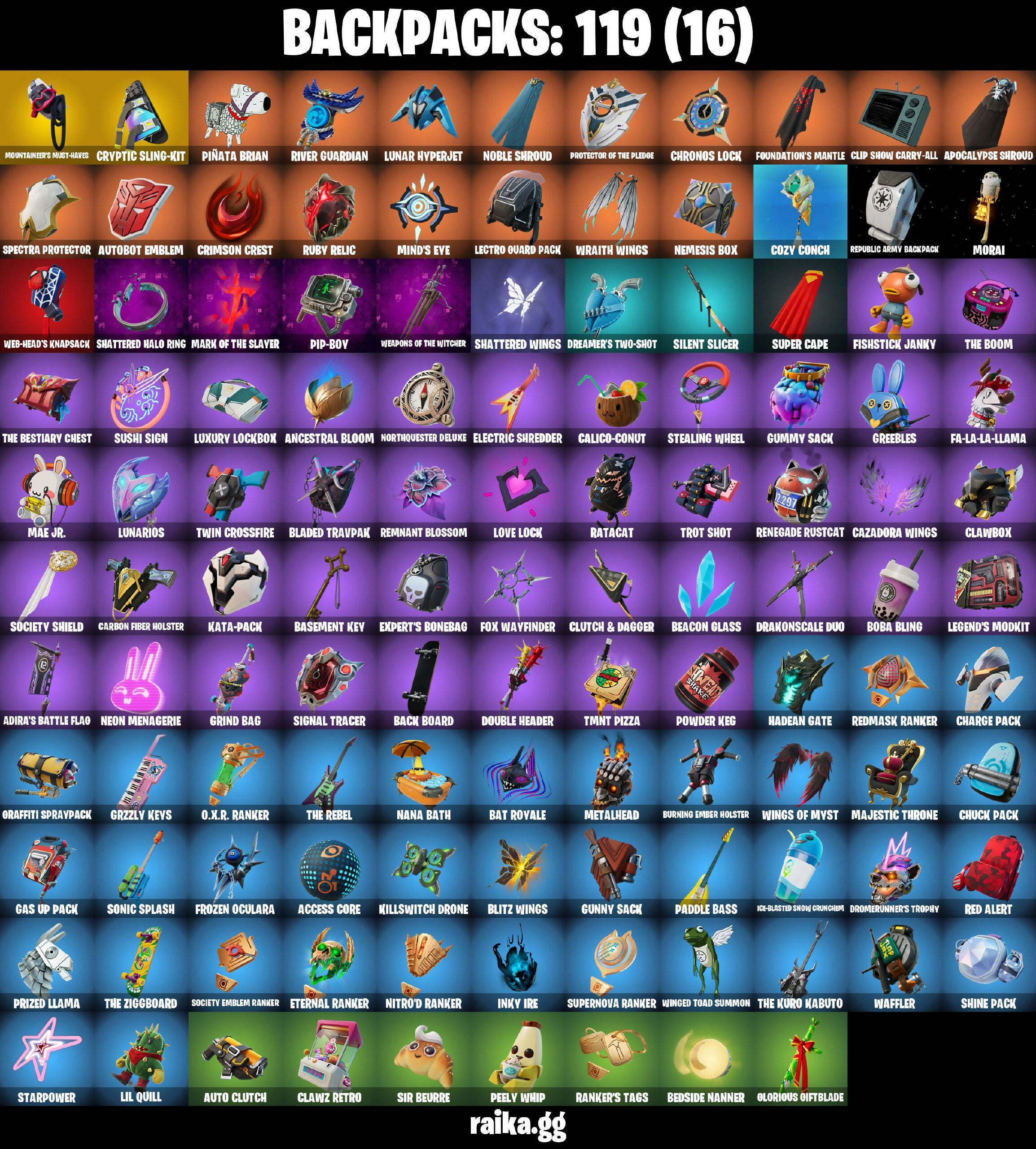6-Carat Cutter, Absenz, Abyssal Blade, Access Core, Adira's Battle Flag, Adventure Aerial, Aerosol Hammer, Ahsoka Tano, Ancestral Bloom, Antonia, Apocalypse Shroud, Arctic Adeline, Ascension Nezumi, Astro Armor, Aura, Auto Clutch, Autobot Emblem, Back Board, Backup Blades, Balance Board, Banner Icon, Basement Key, Bat Royale, Battle-Tested, Beach Breezer, Beacon Glass, Beatzbunny, Bedside Nanner, Big Bite, Big Fan, Bike To Go, Birthday Basher, Blade Of The Waning Moon, Bladed Travpak, Blitz Axe, Blitz Wings, Blizzard Bomber, Board Breaker, Boba Bling, Boba Snack, Bold Bar, Boogie Down, Bounty 'Brella, Breaking Waves, Breathless Blades, Bronzed Scimitars, Bubblegum Highwire, Bubloon, Bullpen Brawler Dusty, Burning Ambition Valeria, Burning Ember Holster, Burnoff, Buzzsaw Breacher, Cacodemon, Cactus Club, Calico-Conut, Called Shot, Carbon Fiber Holster, Card Drop, Cazadora, Cazadora Wings, Championship Aura, Charge Pack, Chef's Special, Choice Knit, Chromebrella, Chronos Lock, Chuck Pack, Clang & Basher, Clawbox, Clawz Retro, Clean Sweep, Clinical Crosser, Clip Show Carry-All, Club President Helsie, Clutch & Dagger, Cold Furia, Collector Kado Thorne, Color Crush, Comfy Cats, Commander's Descent, Competitor's Time Brella, Count It!, Cozy Conch, Crack It, Crescent Shroom, Crimson Crest, Crowning Achievement, Crucible Blade, Cryptic Coaster, Cryptic Sling-Kit, Crystal, Crystal Smasher, Cuddly Cloudcruiser, Cupid's Arrow, Curling Iron, Cybertronian Axe, Cyclo Curl, Dagger Dance, Darkfire Claws, Delivery Diver, Designated Hitters, Diamond Diva, Diamond Throne, Diamondclaw Picker, Dice Roll, Do The Split, Double Header, Doze Dab, Drakon Claws, Drakon Steel Hybrid, Drakonscale Duo, Dramatic Flares, Dreamer's Two-Shot, Driver, Drome Drifter, Dromerunner's Trophy, Duelist's Foil, Dumbbell Driver, Dune Scooper, Dusk Knight, Eclipse Brella, Eclipsed Edges, Electric Shredder, Electro Pairing Blades, Electro Swing, Elegance Blade, Elite Servo, Ember Baton, Ember Pick, Empress Fan Dance, Enchanted Lifebloom, Eren Jaeger, Eternal Ranker, Expert's Bonebag, Explorer Emilie, Expressionism, Fa-La-La-Llama, Fancy Peter Griffin, Fang Dance, Fanged Foresight, Fishstick Janky, Fixation, Flaky Feast, Flapjack Flyer, Flashback Breakdown, Flight Risk, Flip Flyer, Focus, Foil Flex, Follow The Butterfly, Foundation's Mantle, Foundation's Plasma Spike, Foundational 'Brella, Fox Wayfinder, Foxfire Edge, Frequency Flyer, Frostburn, Frozen Oculara, Fuel Rod And Tonos, Gas Up Pack, Get Griddy, Get Out Of Your Mind, Gilded Reality, Glorious Giftblade, Golden, Good Game, Well Played, Graffiti Spraypack, Grand Glacier Glider, Greebles, Grind Bag, Grizzly Keys, Gum Brawler, Gummy Sack, Gunn-Brella, Gunny Sack, Hadean Gate, Har-Har-Har!, Harbinger Armor OmegaFox, Have A Seat, Haven, Headhunter Prime, Headpiece, Heart Sign, Heart's Carver, Heartburst, Heartwinder, Heist Flier, Helmet, Hex Code, High Society Glider, High Society Ranker, Holiday Boxy, Holly Hatchets, Hope, Hunter's Reach, Hype!, Hypnot-Eyes, I Need You To Concentrate, I'm A Mystery, Ice Breaker, Ice-Blasted Snow Cruncher, Igni Sign, Imani, Impact 'Brella, Imperial March, Infield Fly, Inflate-A-Roach, Inky Ire, It Is Finished, It's... You?, Jiggle Jiggle, Josie, Jun-Hwan, Junker 'Brella, K.O. Cruiser, Kaiju Cutter, Kata-Pack, Killswitch Drone, King Wings, Kingsley, Kittanas, Knife Sharpener, Knight's Helm, Krisabelle, Last Forever, League Balloon, Lectro Guard Pack, Legend's Modkit, Legendary Blade Of Insight, Light Burst, Lil Quill, Lil' Longboat, Lil' Monster, Lil' Prancer, Lil' T-6 Shuttle, Lina Scorch, Llaminator, Lorenzo The Reckless, Lost Meteor, Love It!, Love Lock, Lucha Slashers, Lunar Charge, Lunar Glow, Lunar Hyperjet, Lunar Party, Lunar Skyspan, Lunarios, Luxury Lockbox, Mae, Mae Jr., Magmatic Mizone (Cover-Up Off), Majestic Throne, Make A Seat, Marauder's Machete, Marika, Mark Of The Slayer, Marshmello, Maximum Bounce, Mega-Brella, Metalhead, Mind's Eye, Mini Slayer Fistbump, Molten Max Axe, Moonglide, Morai, Mountaineer's Must-Haves, Mr. Dappermint, Mwahaha, Nana Bath, Nana-Brella, Nanner Bashers, Nanner Ringer, Needle Dropper, Nemesis Box, Neon Menagerie, Ninja Stance: Donnie, Ninja Stance: Leo, Ninja Stance: Mikey, Ninja Stance: Raph, Nisha, Nitro'd Ranker, No Sweat, Noble Shroud, Nolan Chance, Nomad's Spear, Northquester Deluxe, Nue, O.M.E.G.A. Spear, O.X.R. Ranker, Off, On, Oopsy Drones-Y, Otherworld, Paddle Bass, Paint Pummellers, Panda Parade, Peely Whip, Perfect Pivot, Petercopter, Petrol Pump, Pinata Brian, Pip-Boy, Piper Pace, Pit Faller, Pitcycle, Plasmacore Claws, Poacher's Regrets, Point & Shoot, Polar Peely, Popular Vibe, Powder Keg, Premiere Poms, Prized Llama, Protector Of The Pledge, Psionic Surfer, Pump Me Up, Purradise Meowscles, Quicksilver Baton Spear, Raider's Wayfarer, Ranker's Tags, Ratacat, Ratacat Roamer, Rebel Brella, Recon Expert, Reconner's Reckoning, Red Alert, Red Robin's Wings, Redline Scout, Redmask Ranker, Reef Cake Fish Thicc, Regal Hunter Mariposa, Regal Hunter Relik, Regal Hunter Rian, Regal Hunter Trace, Remnant Blossom, Renegade Rustcat, Republic Army Backpack, Rescue Board, Revenant Rider, Rezzblocks, River Guardian, Rococo Cloak-O, Rolling Glyphs, Ronin (Cape), Rose Light Daggers, Rough Cut Montague, Ruby, Ruby Relic, Runway Racer, Safari, Salvaged Chute, Say So, Scout Regiment Salute, Scratchmark Shredder, Scuba Crystal, Sea Bobber, Secret Scimitars, Self Reflexing, Sentinel, Seven Glider, Seven Signet, Shadow Play: Toad, Shattered Halo Ring, Shattered Wings, Shine Pack, Shock Brawler Oscar, Sigil Of The Empire, Signal Tracer, Silent Slicer, Sir Beurre, Skerran, Skull Scout, Skull-A-Tron, Sky Scout, Skycarver, Sled Ready Guff, Sledgecracker, Slider, Snikit! Snikit!, Snow Sailer, Snowplower, Snowsuited, Snowtooth, Society Emblem Ranker, Society Shield, Solid Snake, Sonic Splash, Soundwave Slashers, Sour Gumbo, Spectra Protector, Spectra Slasher, Spellwork Scimitar, Spider Snare, Spikebat, Spin-It Slicer, Standi