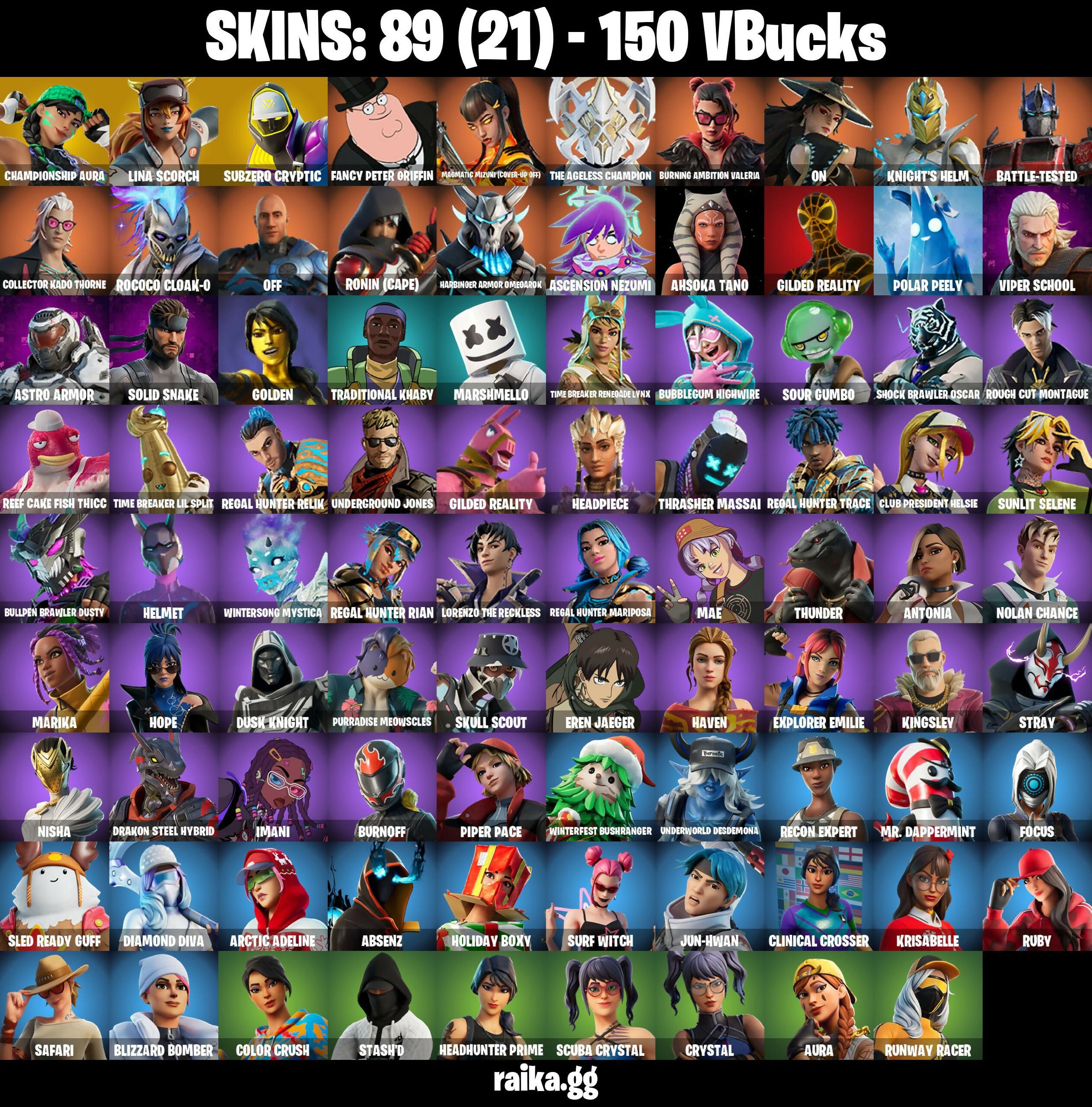 [PC/PSN/XBOX] 89 skins | Championship Aura | Lina Scorch | Monarch (Golden) | Fancy Peter Griffin | Doom Slayer | Renegade Lynx | Eren Jaeger | Stray | Recon Expert