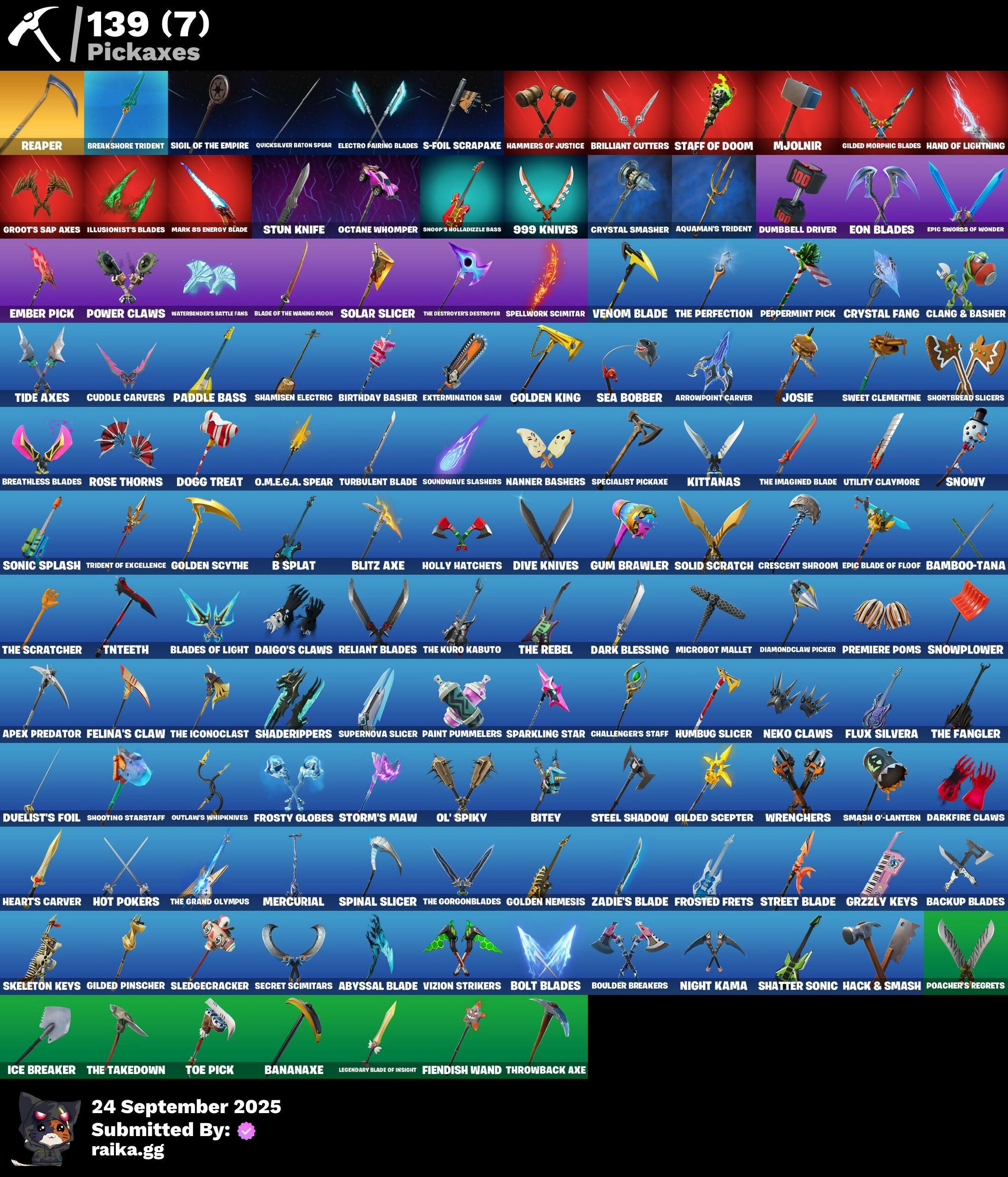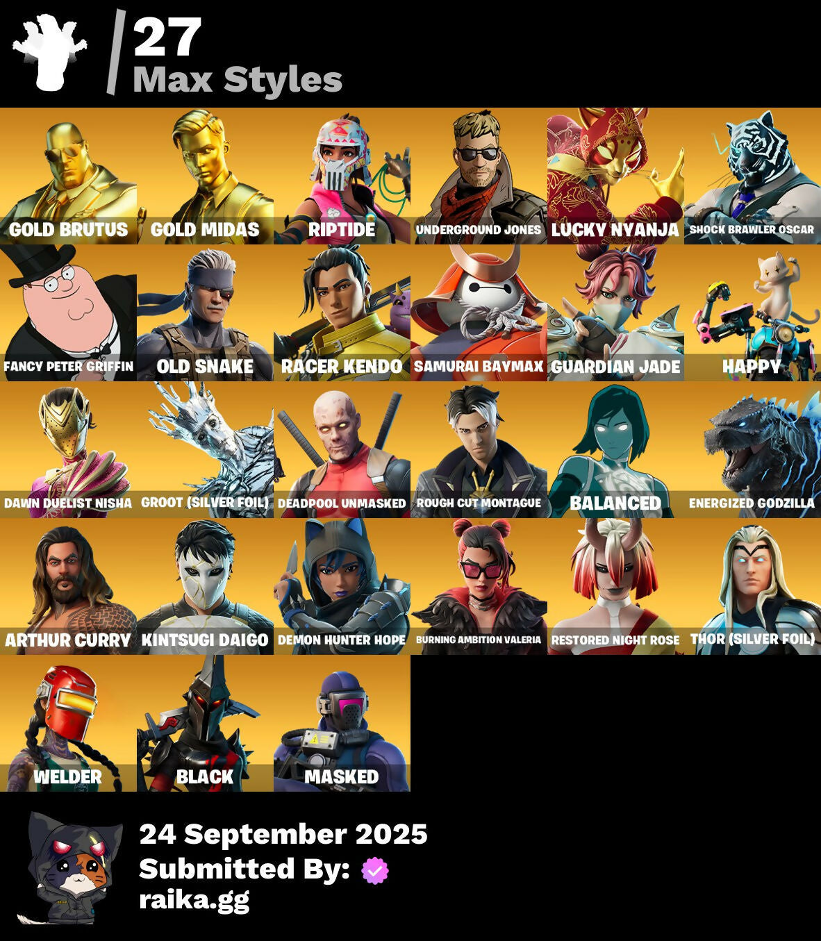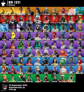 [PC/PSN/XBOX] 89 skins | Gold Brutus | Gold Midas | Pitch Patroller | Fade | Gear Specialist Maya | Eternal Knight | Zeus | Valeria | Peter Griffin | 600 VB / FN
