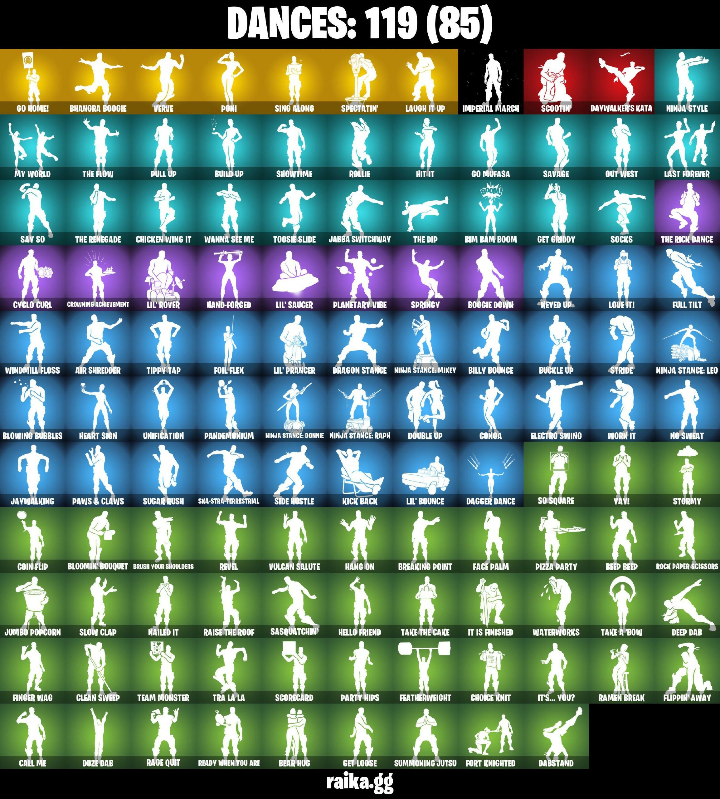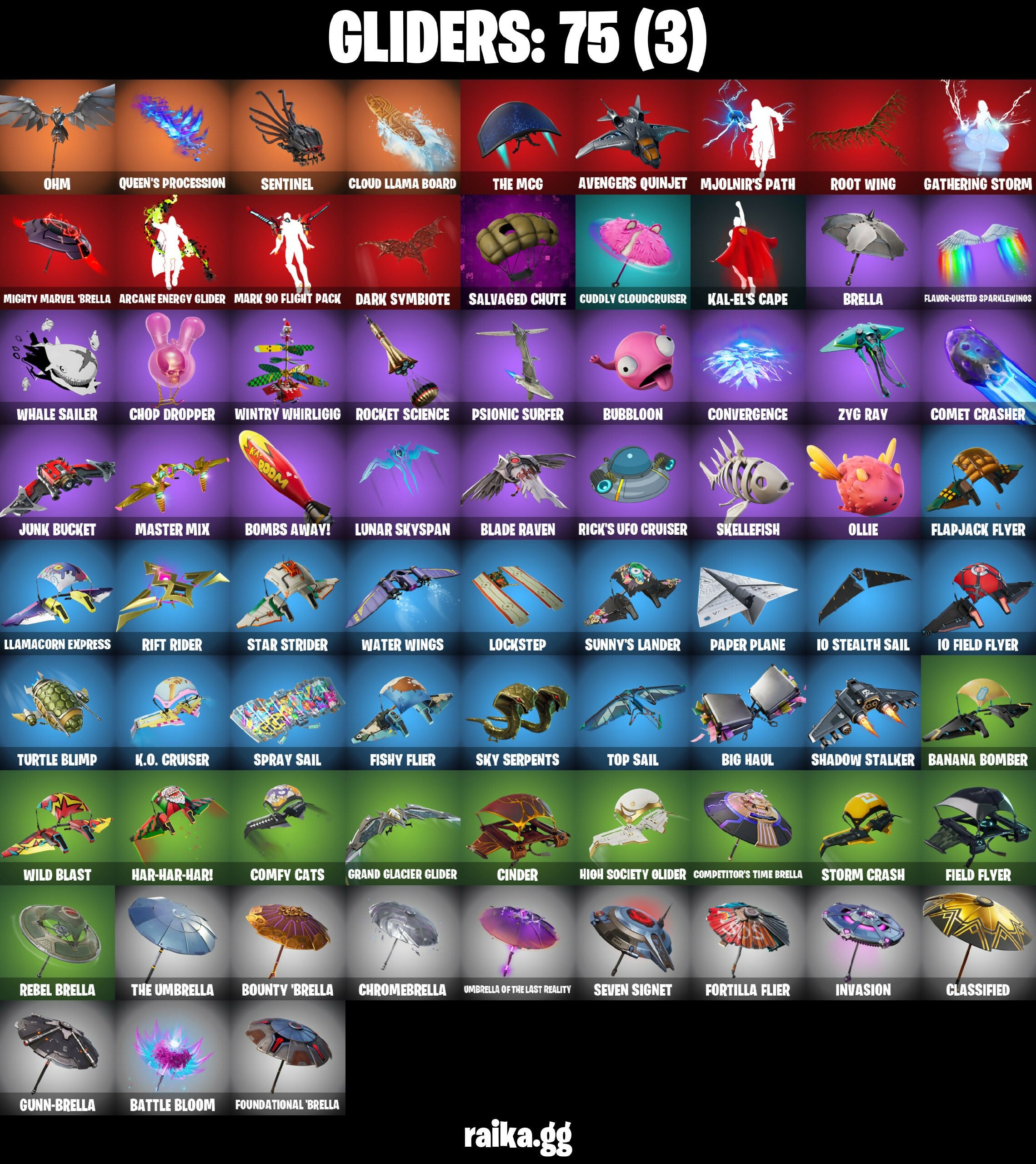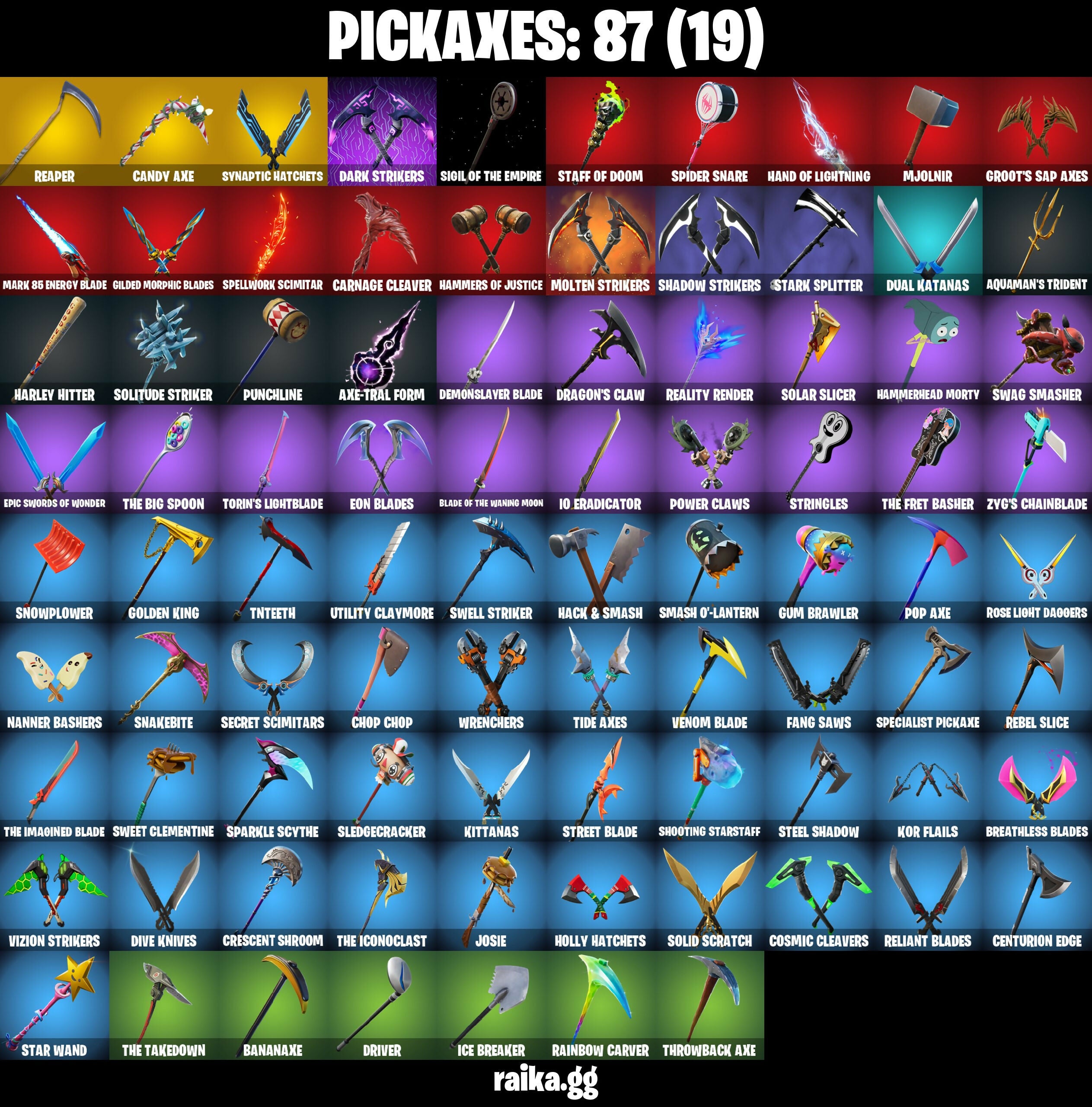 8-Ball Janky, Adira's Battle Flag, Adventure Pack, Agent Peely, Air Shredder, Ancestral Bloom, Apocalypse Shroud, Aquaman, Aquaman's Trident, Arcane Energy Glider, Arctic Adeline, Arroyo Pack, Athleisure Assassin, Aura, Avengers Quinjet, Axe-Tral Form, Backlash, Backstabber, Banana Bomber, Banana Briefcase, Bananaxe, Banner Cape, Battle Bloom, Beach Jules, Beachcomber, Bear Brained, Bear Hug, Beep Beep, Bhangra Boogie, Big Haul, Billy Bounce, Bim Bam Boom, Birthstone Backplate, Blackheart, Blade Of The Waning Moon, Blade Raven, Blaze, Blizzabelle, Bloomin' Bouquet, Blowing Bubbles, Boardwalk Ruby, Bobo, Bombs Away!, Boogie Down, Bounty 'Brella, Brain Freeze, Breaking Point, Breathless Blades, Brella, Brush Your Shoulders, Brutus, Bubloon, Buckle Up, Build Up, Butter Robot, Call Me, Candy Axe, Carnage, Carnage Cleaver, Castaway Jonesy, Catalyst, Centurion, Centurion Edge, Chainstick Pack, Charlotte, Chicken Wing It, Choice Knit, Chop Chop, Chop Dropper, Chromebrella, Cinder, Classified, Clawz Retro, Clean Sweep, Cloud Llama Board, Cobalt Overdrive, Cobra, Coin Flip, Comet Crasher, Comfy Cats, Competitor's Time Brella, Conga, Convergence, Cosmic Cleavers, Crescent Shroom, Crowning Achievement, Cubic Vortex, Cuddly Cloudcruiser, Cyclo Curl, Dabstand, Dagger Dance, Dark Bag, Dark Bomber, Dark Power Chord, Dark Six String, Dark Strikers, Dark Symbiote, Datafiber Chargepack, Daywalkers' Kata, Deadpool, Deadpool's Katanas, Deep Dab, Deep Dive, Demonslayer Blade, Dino Deck, Dive Knives, Dizzie, Doctor Doom, Doctor Slone, Doom Chalice, Doom's Cowl, Double Up, Doze Dab, Dragon Stance, Dragon's Claw, Dream, Driver, Dry Bag, Dual Katanas, Dynamo, Electric Shredder, Electro Swing, Eon Blades, Epic Swords Of Wonder, Eternal Knight, Eternal Shield, Extra Round, Fa-La-La-Llama, Fabio Sparklemane, Face Palm, Fade, Fang Saws, Fashion Accident Janky, Featherweight, Feline Fun, Field Flyer, Finger Wag, Firestarter, Fishstica Janky, Fishy Flier, Fixer, Flapjack Flyer, Flavor-Dusted Sparkwings, Flippin' Away, Foil Flex, Fort Knighted, Fortilla Flier, Foundational 'Brella, Full Tilt, Galactic Pack, Gallant Gear, Gathering Storm, Gear Specialist Maya, Get Griddy, Get Loose, Ghoul Trooper, Gilded Morphic Blades, Go Home!, Go Mufasa, Gold Chain, Gold Dagger Pack, Gold Midas, Golden King, Grand Glacier Glider, Groot, Groot's Sap Axes, Guggimon, Gum Brawler, Gunn-Brella, Hack & Smash, Hammerhead Morty, Hammers Of Justice, Hand Of Lightning, Hand-Forged, Hang On, Har-Har-Har!, Harley Hitter, Harley Quinn, Haute Holster, Haze, Heart Sign, Hello Friend, Hench Hauler, High Society Glider, Hit It, Holly Hatchets, Hurricane, Hybrid, IO Eradicator, IO Field Flyer, IO Orchestrator, IO Stealth Sail, Ice Breaker, Ice-Blasted Snow Cruncher, Imperial March, Infinite Bloom, Inky, Invasion, Iris, Iron Man Backplate, It Is Finished, It's... You?, J.B. Chimpanski, Jabba Switchway, Jaywalking, Jennifer Walters, Joey, Josie, Jules, Jumbo Popcorn, Junk Bucket, K.O. Cruiser, Kabag!, Kal-El's Cape, Kata-Pack, Keyed Up, Kick Back, Kit, Kittanas, Kor, Kor Flails, Kor's Toolkit, Krisabelle, Kymera, Kymera's Plasma Pak, Lace, Last Forever, Last Kiss, Laugh It Up, Lectro Guard Pack, Legend's Modkit, Lil' Black Heart, Lil' Bounce, Lil' Prancer, Lil' Rover, Lil' Saucer, Llamacorn Express, Lockstep, Love It!, Love Lock, Lunar Hyperjet, Lunar Skyspan, Lunarios, Major Mancake, Manic, Mark 85 Energy Blade, Mark 90 Flight Pack, Master Mix, Master Portal, Meowscles, Meowscles Janky, Midas (Fully Golden), Mighty Marvel 'Brella, Mini Moon, Mjolnir, Mjolnir's Path, Molten Battle Shroud, Molten Omen, Molten Strikers, Mutiny, My World, Mystify, Mystique, Mystique's Skull, Nailed It, Nanameter, Nanner Bashers, Neon Wings, Ninja, Ninja Stance: Donnie, Ninja Stance: Leo, Ninja Stance: Mikey, Ninja Stance: Raph, Ninja Style, Ninja's Edge, No Ghost, No Sweat, Nog Ops, Ocean, Ohm, Ollie, Out West, Pandemonium, Paper Plane, Party Hips, Patch Pack, Paws & Claws, Peely Whip, Perfect Shadow, Perfect Wings, Pizza Party, Piñata Brian, Planetary Vibe, Plasmatic Gear, Poised Playmaker, Poki, Polar Peely, Pop Axe, Power Claws, Prized Llama, Psionic Surfer, Pull Up, Punchline, Queen's Procession, Rage Quit, Rainbow Carver, Raise The Roof, Ramen Break, Ranker's Tags, Ready When You Are, Reality Render, Reaper, Rebel Brella, Rebel Slice, Reckoning, Red Alert, Reliant Blades, Revel, Rick Sanchez, Rick's UFO Cruiser, Ridgeback, Rift Rider, Rock Paper Scissors, Rocket Science, Rollie, Root Wing, Rose Light Daggers, Roundabout, Ruby, Ruby Relic, Salvaged Chute, Sapling Groot, Sasquatchin', Savage, Say So, Scales Of Justice, Scootin', Scorecard, Scrappy, Scuba Crystal, Scuba Jonesy, Secret Scimitars, Seeker, Sentinel, Seven Signet, Shadow Ark, Shadow Ark Wings, Shadow Skully, Shadow Stalker, Shadow Strikers, Shadowbird, Shadowbird Wings, Shattered Wing, Shooting Starstaff, Showtime, Side Hustle, Sidewinder, Sigil Of The Empire, Sing Along, Siona, Siren, Ska-Stra-Terrestrial, Skeletal Wings, Skellefish, Sky Serpents, Skye, Sled Ready Guff, Sledgecracker, Slow Clap, Smash O'-Lantern, Snakebite, Snowplower, So Square, Society Emblem Ranker, Society Shield, Socks, Solar Slicer, Solid Scratch, Solitude Striker, Sparkle Scythe, Sparkplug, Specialist Pickaxe, Spectatin', Spectra Protector, Spellwork Scimitar, Spider Snare, Spiked Satchel, Spray Sail, Springy, Staff Of Doom, Star Strider, Star Surge, Star Wand, Stark Satchel, Stark Splitter, Starpower, Steel Shadow, Stitches, Storm, Storm Crash, Stormy, Street Blade, Stride, Stringles, Sugar Rush, Summoning Jutsu, Sunny, Sunny's Lander, Supreme Shell, Surf Witch, Swag Smasher, Sweet Clementine, Swell Striker, Synaptic Hatchets, TMNT Pizza, Take A' Bow, Take The Cake, Team Monster, Tendrils Of Carnage, The Bestiary Chest, The Big Spoon, The Cube Queen, The Dip, The Flow, The Fret Basher, The Iconoclast, The Imagined Blade, The Kuro Kabuto, The Mcg, The Renegade, The Rick Dance, The Takedown, The Umbrella, Thor, Thor's Cloak, Throwbac
