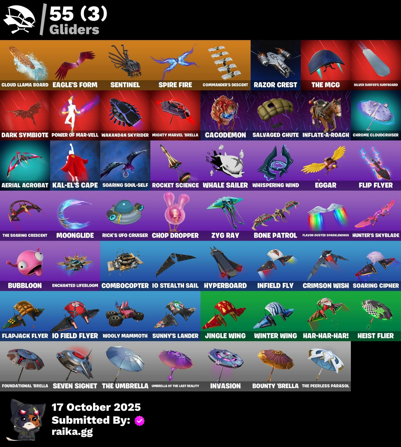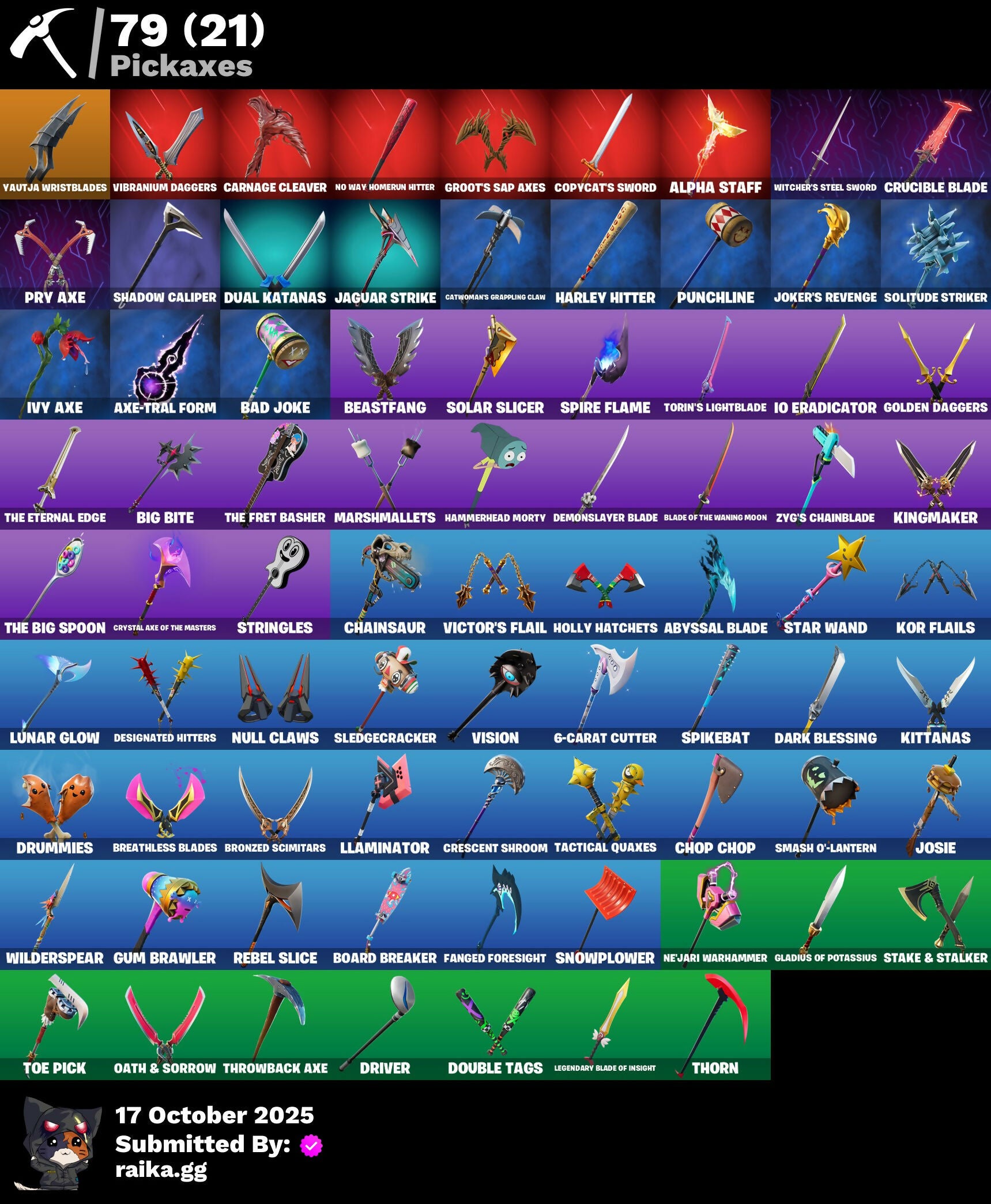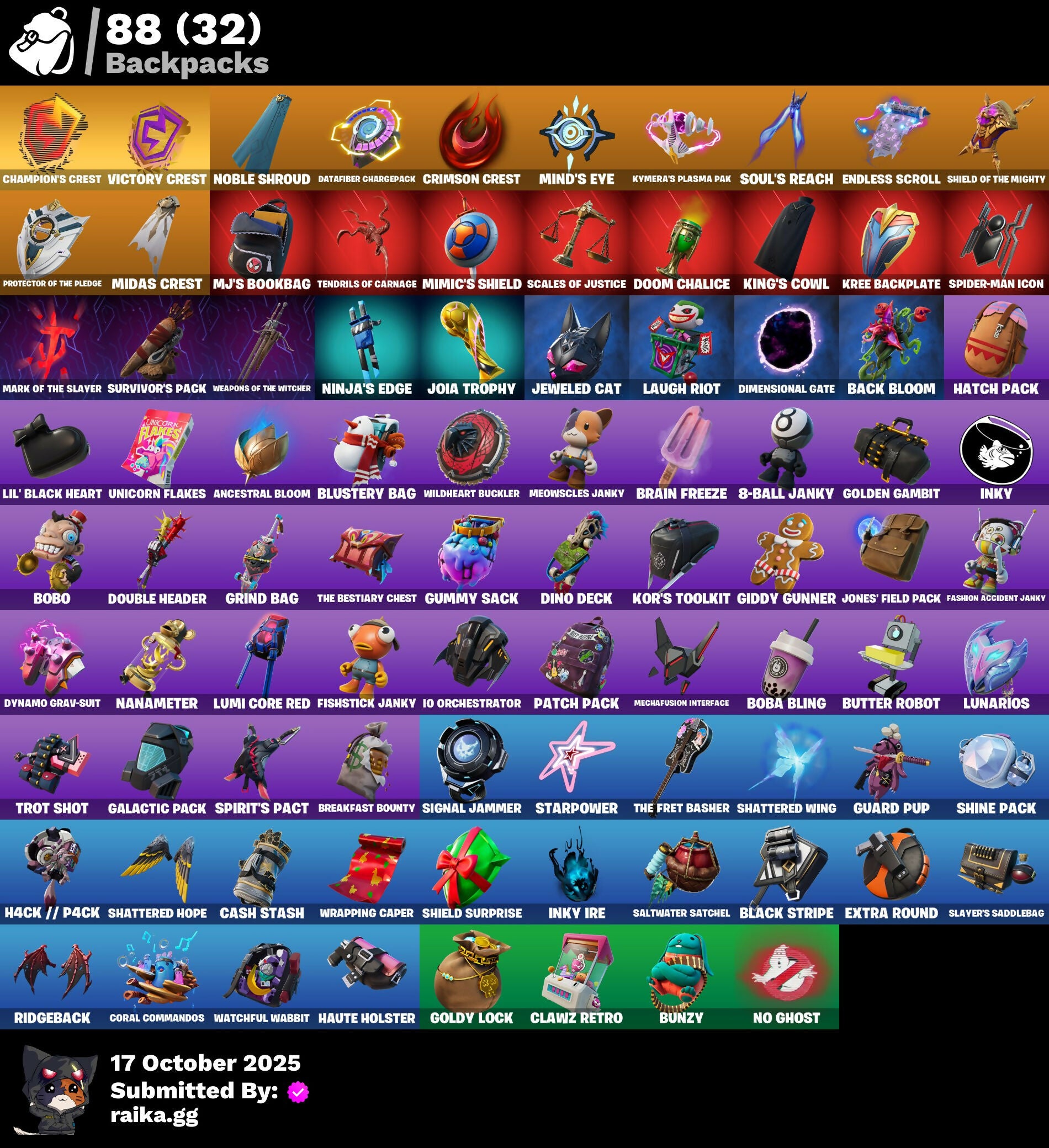 10 Field Flyer, 10 Stealth Sail, 2022, 6-Carat Cutter, 8-Ball Janky, A Warrior Prepares, Abduction, AbseNz, Abyssal Blade, Acolyte's Curse, Aerial, Aerial Acrobat, Agent Jones, Agent Jones (Jump 31), Alpha Staff, Always Fantabulous, Ancestral Bloom, Ascension Nezumi, Astro Armor, Athleisure Assassin, Aura, Axe-tral Form, Azarath Metrion Zinthos!, Back Bloom, Bad Joke, Balance Board, Banner, Baseball, Basketball Hoop, Battle Call, Bawk Off, Beamers, Bean Bag, Bear Hug, Beastfang, Beef Blade, Beskar, Big Bite, Bitter Sweets, Black Hole, Black Panther, Black Stripe, Blade of the Waning Moon, Blustery Bag, Board Breaker, Boba Bling, Boba Snack, Bobo, Bombastic Winterfest, Bone Patrol, Boneyard Brand, Boogie Down, Boomin', Boots 'N' Cats, Both Eyes Open, Bounty 'Brella, Brain Freeze, Breakfast Bounty, Breakpoint, Breathless Blades, Bronzed Scimitars, Bruteball, Bubbloon, Bullpen Brawler Dusty, Bunzy, Burst Case Scenario, Butter Robot, Cacodemon, Called Shot, Cap Kick, Captain Marvel, Cardistry, Carnage, Carnage Cleaver, Cash Stash, Catwoman Comic Book Outfit, Catwoman's Grappling Claw, Chainsaur, Challenger Menace - Flame, Champion's Crest, Charlotte, Charlotte's Logo, Chibi, Chigusa, Chimpanski Wants You, Choice Knit, Chomp Cud!!, Chop Chop, Chop Dropper, Choppy, Chrome Cloudcruiser, Clawz Retro, Clean Sweep, Cloud Llama Board, Cloudburst, Club President Helsie, Cluck, Cluck (Slurpy), Clucking Mad, Cold Blooded Style, Combocopter, Commander's Descent, Confetti, Copycat's Sword, Coral Commandos, Cosmic Sun, Crescent Shroom, Crimson Crest, Crimson Wish, Crowning Achievement, Crucible Blade, Crystal Axe of the Masters, Cube Marking, Cubed, D'Ark, D.C. 63, Dark Blessing, Dark Symbiote, Datafiber Chargepack, Daughter of Trigon, Demons Beware, Demonslayer Blade, Designated Hitters, Diamond Diva, Dimensional Camo, Dimensional Gate, Dino Deck, Division, Dizzie, Doctor Doom, Doctor Slone, Doctor Slone (Prismatic), Don't Start Now, Doom Chalice, Doom Slayer, Double Header, Double Tags, Dream, Driver, Droopy, Dropout, Drummies, Dual Katanas, Dusty, Dynamo Grav-Suit, Eagle's Form, Eggar, Enchanted Lifebloom, Endless Scroll, Escapees, Evasive Maneuvers, Exile's Emblem, Extra Round, Fabio Sparklemane, Fancy Footwork, Fanged Foresight, Fashion Accident Janky, Fish Face, Fishstick, Fishstick Janky, Fistbump, Flapjack Flyer, Flavor-Dusted Sparklewings, Flip Flyer, Focused, Foundational 'Brella, Galactic Pack, Gangnam Style, Geralt, Geralt Of Rivia, Get Loose, Giddy Gunner, Ginger Gunner, Gladius of Potassius, Glyph Master, Go Mufasa, Golden Daggers, Golden Gambit, Goldy Lock, Good Guy, Grav-Fusion, Green Toy, Grey Toy, Grind Bag, Groot's Sap Axes, Guard Pup, Guggi Was Here, Guggimon, Guggimon (Prismatic), Gugmon, Gum Brawler, Gumbo, Gummy Sack, H4ck // P4ck, Hammerhead Morty, Hand-Forged, Hang Loose Celebration, Har-Har-Har!, Harley Hitter, Harley Quinn, Hatch Pack, Haute Holster, Have A Seat, Haven, Haze, Heat Vision Hunter, Heist Flier, Helsie, Here Comes Trubble, Hidden Haven, High Stakes Club, Holly Hatchets, Hummingboard, Hunter Purple, Hunter's Crest, Hunter's Skyblade, Hush, Hyperboard, Hypnot-Eyes, I Believe, I Need You To Concentrate, I'm Ready!, IO Orchestrator, Icy Pop, Idk, Igni Sign, Imagined Edge, Imagined Order, In Her Sights, Infield Fly, Inflate-A-Roach, Ink Wolf, Inky, Inky Ire, Inside Out, Interstellar Rick, Invasion, Inventor's Choice, Io Elite Spec, Io Eradicator, It's All Gonna Be Red Soon, Ivy Axe, J.B. Chimpanski, Jaguar Strike, Jeweled Cat, Jingle Wing, Joey, Joia Trophy, Joker's Revenge, Joltara, Jones' Field Pack, Josie, Jumbo Popcorn, Jungle, Jurassically Charged, Ka-Bang!, Kablammo!, Kal-El's Cape, Kick Back, King's Cowl, Kingmaker, Kittanas, Kondor, Kor, Kor Flails, Kor's Toolkit, Kree Backplate, Krisabelle, Kymera, Kymera Swarm, Kymera's Plasma Pak, Lara Croft, Laser Blaze, Last Forever, Laugh Riot, Legendary Blade of Insight, Lexa, Lil' Black Heart, Lil' Monster, Lil' Rover, Lil' Saucer, Lil' Treat, Lion's Roar, Llaminator, Llamistletoe, Lloose Cannon, Lobby Classic, Lotus Touch, Love It!, Lt. John Llama, Lumi Core Red, Lunar Charge, Lunar Glow, Lunar Party, Lunarian Luxury, Lunarios, MJ (No Way Home), MJ's Bookbag, Make It Rain, Mancake, Mandalorian, Mane Event, Marigold, Mark Of The Slayer, Mark of the Champion, Marshmallets, Mashed Potato, Massai, Massai Fire, Mave, Maximum Carnage, Mechafusion Interface, Megumi, Menace, Menacing, Meowscles Janky, Mercurial, Merry Fishmas, Midas Crest, Midas Rex, Midas' Shadow, Mighty Marvel 'Brella, Mimic's Shield, Mind's Eye, Mini Slayer, Modena Icon, Moonglide, Moonglow, Alight, Most Wanted, Mudhorn, Muscle Memory, Mwahaha, My Idol!, My World, Mystique, Nailed It, Nanameter, Ne'Jari Warhammer, Neymar Jr, Neymar Jr (Exhibition), Neymar Jr., Nezumi, Ninja, Ninja Style, Ninja's Edge, Nitebeam, No Ghost, No Way Homerun Hitter, No Witnesses, Noble Shroud, Nomad's Treasure, Null Claws, Oath & Sorrow, Off, On, Ooh Yum!, Oozey, Pancake Posse, Patch Pack, Pele's Air Punch, Pelé's Air Punch, Pitch Patroller, Pizza Party, Planet, Poison Ivy, Polar Peely, Power of Mar-Vell, Praetor Shroud, Predator, Primal Hunter, Primate Space Program, Protector, Protector Of The Pledge, Pry Axe, Pull Up, Pulse Phase, Punchline, Punk Ororo, Quick Bite, Rachel Roth, Rage Quit, Raven, Raven's Curse, Raz, Razor Crest, Ready When You Are, Rebel Slice, Rebirth Raven, Red Card, Red Jade, Red Plastic, Reese, Renzo The Destroyer, Rick, Rick Sanchez, Rick Sanchez (Prismatic), Rick's Portal, Rick's Ufo Cruiser, Ridgeback, Rift Bubbles, Rift-sterpiece, Rocket Blaster, Rocket Science, Ronin, Ronin's Mission, Royal Cube, Running Rick, Saltwater Satchel, Salvaged Chute, Sandstone Joey, Sap, Savage, Say So, Scales Of Justice, Scarlet Commander, Scootin', Scuba Crystal, Selene, Sentinel, Seven Signet, Sgt. Snooze, Shadow Caliper, Shadow Ghost, Shanta, Shanta's Lifebloom, Shattered Hope, Shattered Wing, Shield Of The Mighty, Shield Surprise, Shine Pack, Sidewayfarer, Sideways Warr