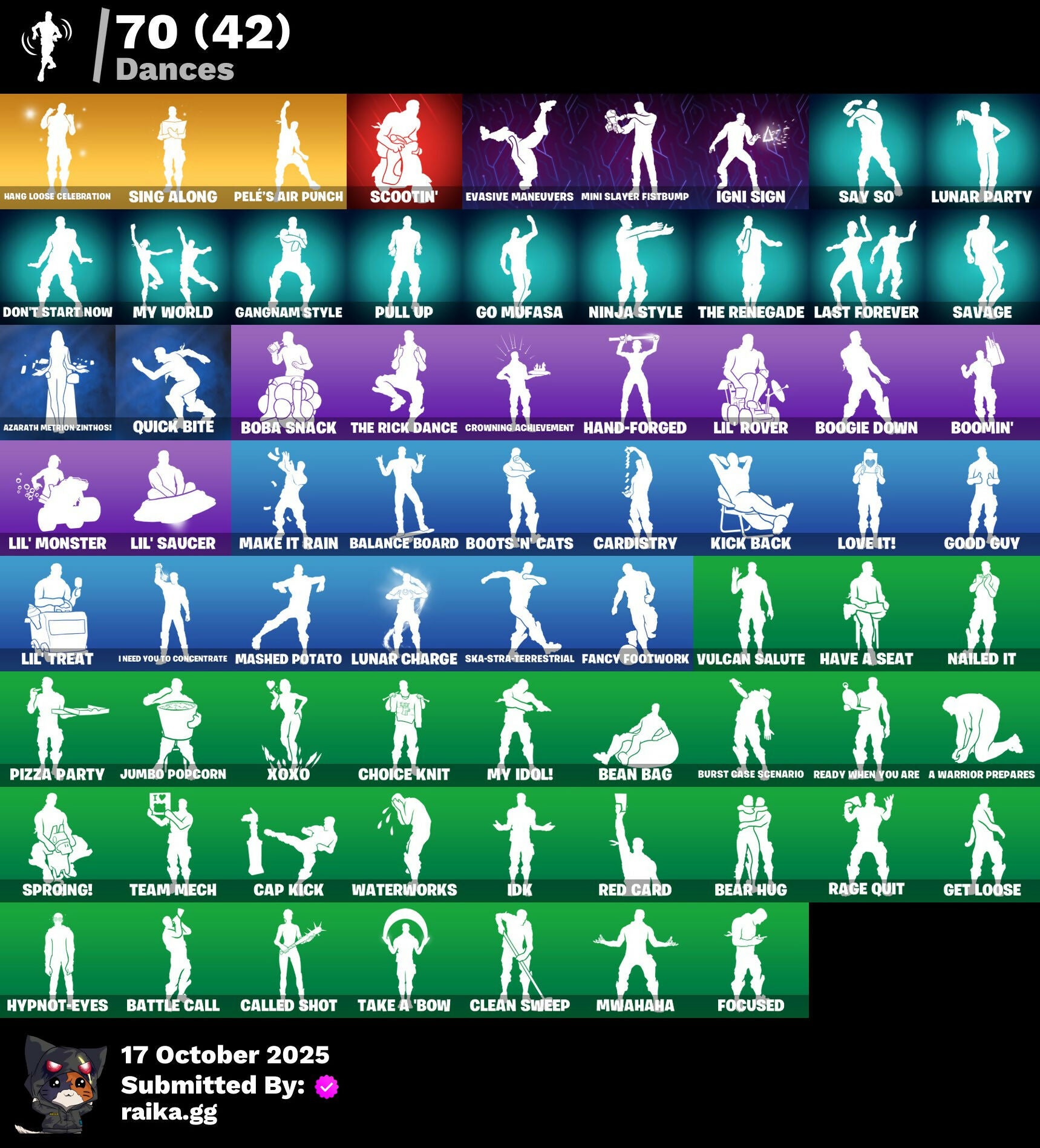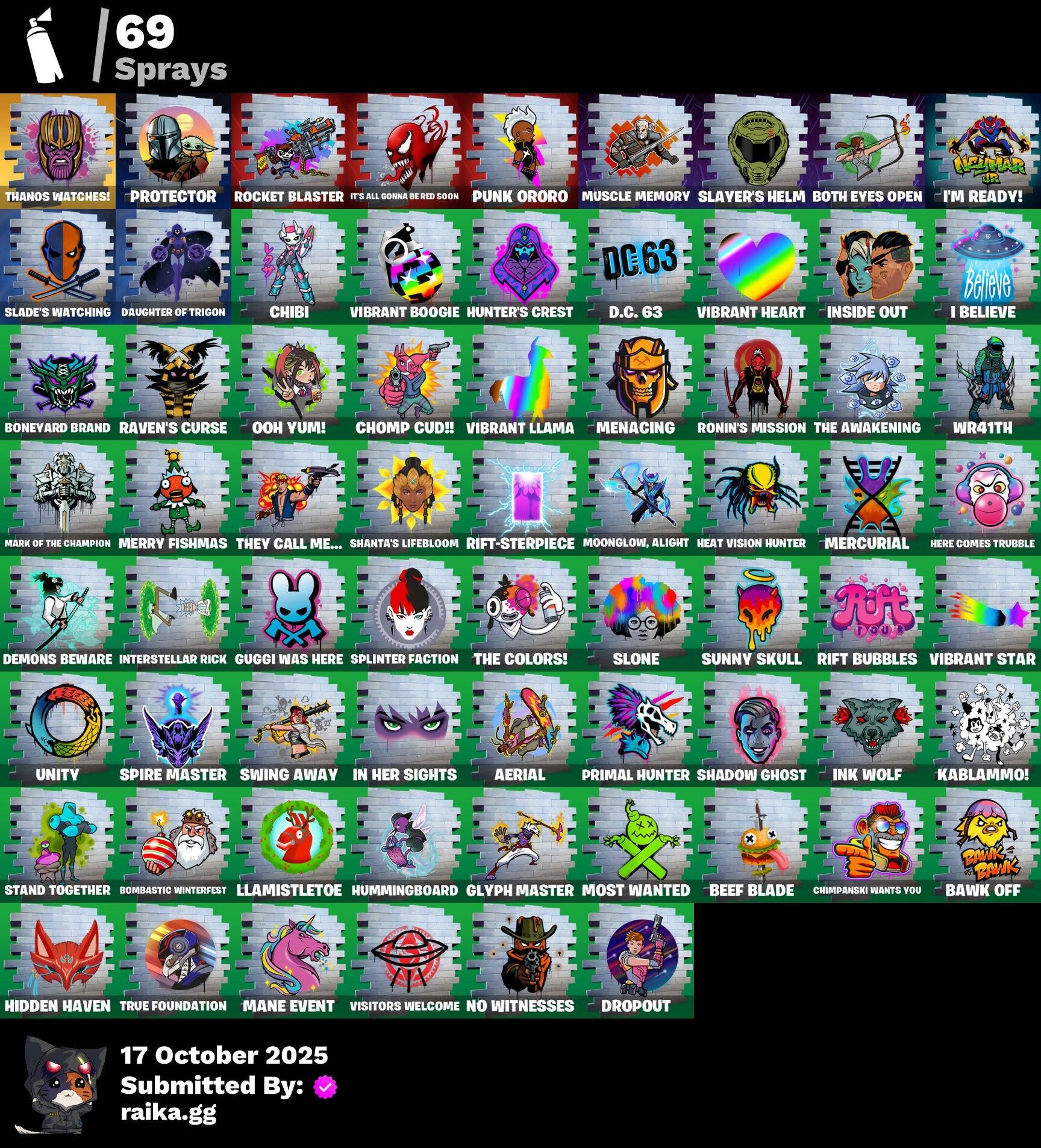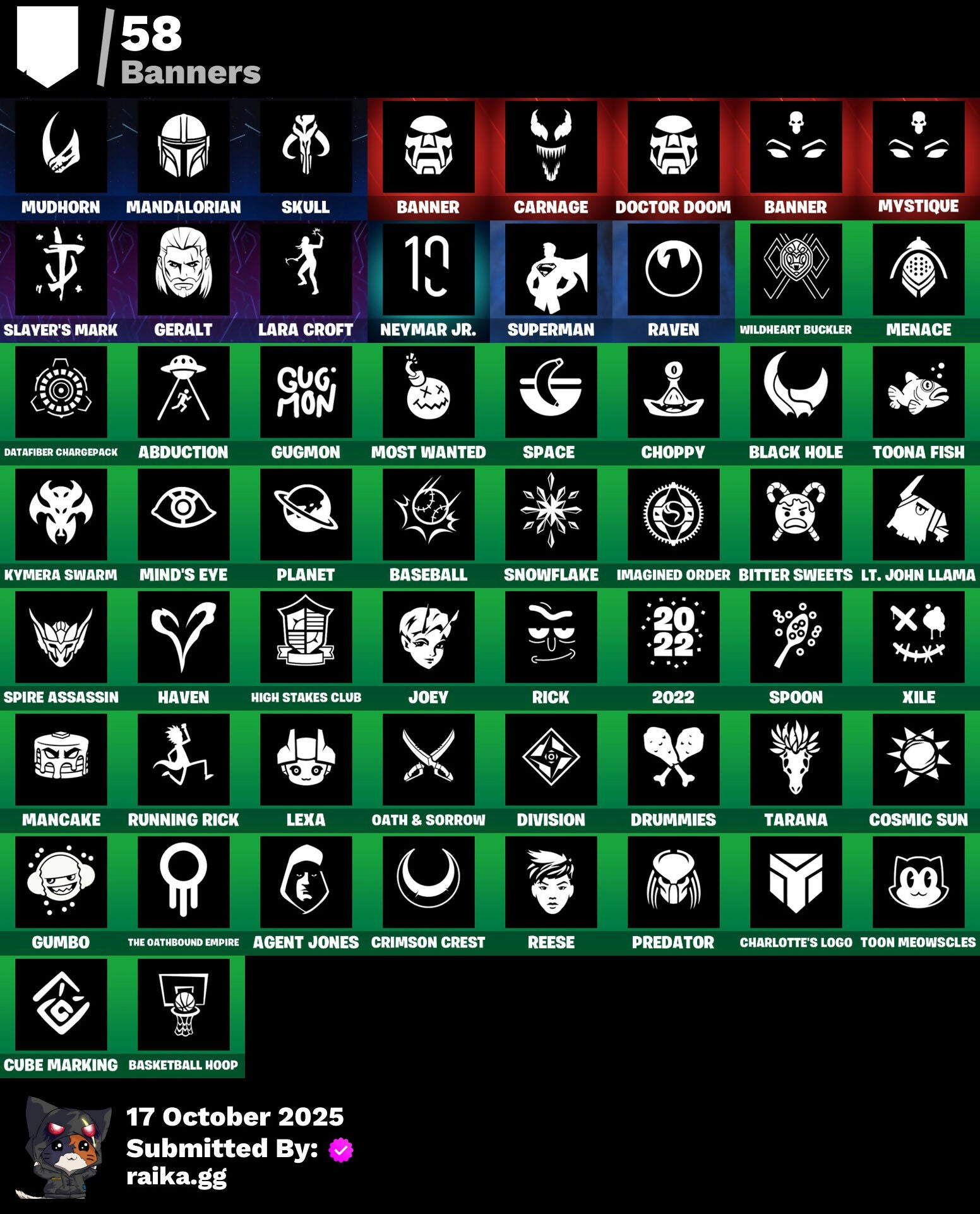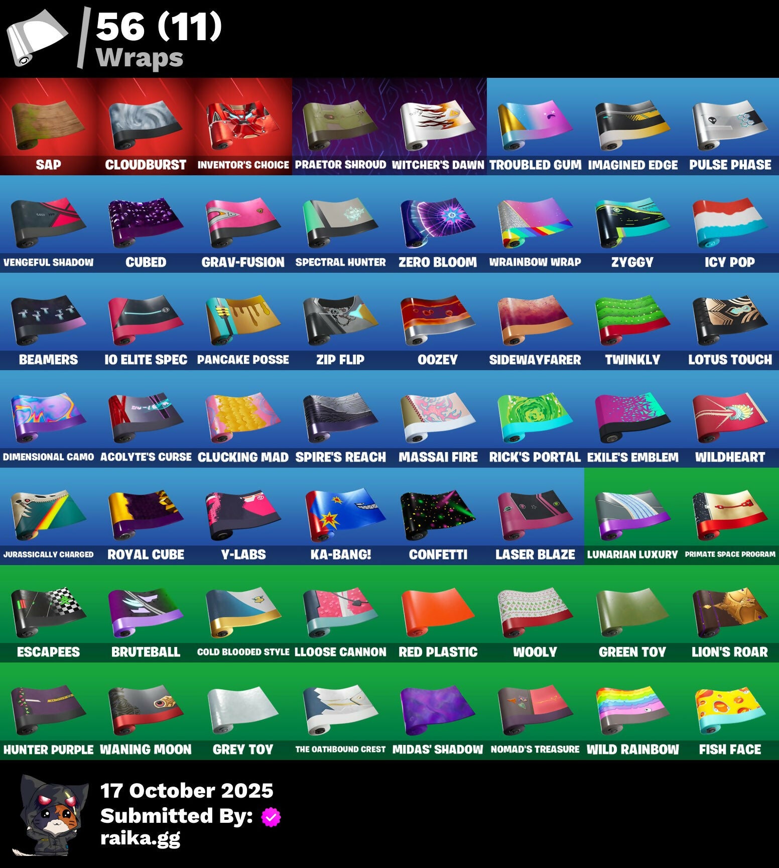 10 Field Flyer, 10 Stealth Sail, 2022, 6-Carat Cutter, 8-Ball Janky, A Warrior Prepares, Abduction, AbseNz, Abyssal Blade, Acolyte's Curse, Aerial, Aerial Acrobat, Agent Jones, Agent Jones (Jump 31), Alpha Staff, Always Fantabulous, Ancestral Bloom, Ascension Nezumi, Astro Armor, Athleisure Assassin, Aura, Axe-tral Form, Azarath Metrion Zinthos!, Back Bloom, Bad Joke, Balance Board, Banner, Baseball, Basketball Hoop, Battle Call, Bawk Off, Beamers, Bean Bag, Bear Hug, Beastfang, Beef Blade, Beskar, Big Bite, Bitter Sweets, Black Hole, Black Panther, Black Stripe, Blade of the Waning Moon, Blustery Bag, Board Breaker, Boba Bling, Boba Snack, Bobo, Bombastic Winterfest, Bone Patrol, Boneyard Brand, Boogie Down, Boomin', Boots 'N' Cats, Both Eyes Open, Bounty 'Brella, Brain Freeze, Breakfast Bounty, Breakpoint, Breathless Blades, Bronzed Scimitars, Bruteball, Bubbloon, Bullpen Brawler Dusty, Bunzy, Burst Case Scenario, Butter Robot, Cacodemon, Called Shot, Cap Kick, Captain Marvel, Cardistry, Carnage, Carnage Cleaver, Cash Stash, Catwoman Comic Book Outfit, Catwoman's Grappling Claw, Chainsaur, Challenger Menace - Flame, Champion's Crest, Charlotte, Charlotte's Logo, Chibi, Chigusa, Chimpanski Wants You, Choice Knit, Chomp Cud!!, Chop Chop, Chop Dropper, Choppy, Chrome Cloudcruiser, Clawz Retro, Clean Sweep, Cloud Llama Board, Cloudburst, Club President Helsie, Cluck, Cluck (Slurpy), Clucking Mad, Cold Blooded Style, Combocopter, Commander's Descent, Confetti, Copycat's Sword, Coral Commandos, Cosmic Sun, Crescent Shroom, Crimson Crest, Crimson Wish, Crowning Achievement, Crucible Blade, Crystal Axe of the Masters, Cube Marking, Cubed, D'Ark, D.C. 63, Dark Blessing, Dark Symbiote, Datafiber Chargepack, Daughter of Trigon, Demons Beware, Demonslayer Blade, Designated Hitters, Diamond Diva, Dimensional Camo, Dimensional Gate, Dino Deck, Division, Dizzie, Doctor Doom, Doctor Slone, Doctor Slone (Prismatic), Don't Start Now, Doom Chalice, Doom Slayer, Double Header, Double Tags, Dream, Driver, Droopy, Dropout, Drummies, Dual Katanas, Dusty, Dynamo Grav-Suit, Eagle's Form, Eggar, Enchanted Lifebloom, Endless Scroll, Escapees, Evasive Maneuvers, Exile's Emblem, Extra Round, Fabio Sparklemane, Fancy Footwork, Fanged Foresight, Fashion Accident Janky, Fish Face, Fishstick, Fishstick Janky, Fistbump, Flapjack Flyer, Flavor-Dusted Sparklewings, Flip Flyer, Focused, Foundational 'Brella, Galactic Pack, Gangnam Style, Geralt, Geralt Of Rivia, Get Loose, Giddy Gunner, Ginger Gunner, Gladius of Potassius, Glyph Master, Go Mufasa, Golden Daggers, Golden Gambit, Goldy Lock, Good Guy, Grav-Fusion, Green Toy, Grey Toy, Grind Bag, Groot's Sap Axes, Guard Pup, Guggi Was Here, Guggimon, Guggimon (Prismatic), Gugmon, Gum Brawler, Gumbo, Gummy Sack, H4ck // P4ck, Hammerhead Morty, Hand-Forged, Hang Loose Celebration, Har-Har-Har!, Harley Hitter, Harley Quinn, Hatch Pack, Haute Holster, Have A Seat, Haven, Haze, Heat Vision Hunter, Heist Flier, Helsie, Here Comes Trubble, Hidden Haven, High Stakes Club, Holly Hatchets, Hummingboard, Hunter Purple, Hunter's Crest, Hunter's Skyblade, Hush, Hyperboard, Hypnot-Eyes, I Believe, I Need You To Concentrate, I'm Ready!, IO Orchestrator, Icy Pop, Idk, Igni Sign, Imagined Edge, Imagined Order, In Her Sights, Infield Fly, Inflate-A-Roach, Ink Wolf, Inky, Inky Ire, Inside Out, Interstellar Rick, Invasion, Inventor's Choice, Io Elite Spec, Io Eradicator, It's All Gonna Be Red Soon, Ivy Axe, J.B. Chimpanski, Jaguar Strike, Jeweled Cat, Jingle Wing, Joey, Joia Trophy, Joker's Revenge, Joltara, Jones' Field Pack, Josie, Jumbo Popcorn, Jungle, Jurassically Charged, Ka-Bang!, Kablammo!, Kal-El's Cape, Kick Back, King's Cowl, Kingmaker, Kittanas, Kondor, Kor, Kor Flails, Kor's Toolkit, Kree Backplate, Krisabelle, Kymera, Kymera Swarm, Kymera's Plasma Pak, Lara Croft, Laser Blaze, Last Forever, Laugh Riot, Legendary Blade of Insight, Lexa, Lil' Black Heart, Lil' Monster, Lil' Rover, Lil' Saucer, Lil' Treat, Lion's Roar, Llaminator, Llamistletoe, Lloose Cannon, Lobby Classic, Lotus Touch, Love It!, Lt. John Llama, Lumi Core Red, Lunar Charge, Lunar Glow, Lunar Party, Lunarian Luxury, Lunarios, MJ (No Way Home), MJ's Bookbag, Make It Rain, Mancake, Mandalorian, Mane Event, Marigold, Mark Of The Slayer, Mark of the Champion, Marshmallets, Mashed Potato, Massai, Massai Fire, Mave, Maximum Carnage, Mechafusion Interface, Megumi, Menace, Menacing, Meowscles Janky, Mercurial, Merry Fishmas, Midas Crest, Midas Rex, Midas' Shadow, Mighty Marvel 'Brella, Mimic's Shield, Mind's Eye, Mini Slayer, Modena Icon, Moonglide, Moonglow, Alight, Most Wanted, Mudhorn, Muscle Memory, Mwahaha, My Idol!, My World, Mystique, Nailed It, Nanameter, Ne'Jari Warhammer, Neymar Jr, Neymar Jr (Exhibition), Neymar Jr., Nezumi, Ninja, Ninja Style, Ninja's Edge, Nitebeam, No Ghost, No Way Homerun Hitter, No Witnesses, Noble Shroud, Nomad's Treasure, Null Claws, Oath & Sorrow, Off, On, Ooh Yum!, Oozey, Pancake Posse, Patch Pack, Pele's Air Punch, Pelé's Air Punch, Pitch Patroller, Pizza Party, Planet, Poison Ivy, Polar Peely, Power of Mar-Vell, Praetor Shroud, Predator, Primal Hunter, Primate Space Program, Protector, Protector Of The Pledge, Pry Axe, Pull Up, Pulse Phase, Punchline, Punk Ororo, Quick Bite, Rachel Roth, Rage Quit, Raven, Raven's Curse, Raz, Razor Crest, Ready When You Are, Rebel Slice, Rebirth Raven, Red Card, Red Jade, Red Plastic, Reese, Renzo The Destroyer, Rick, Rick Sanchez, Rick Sanchez (Prismatic), Rick's Portal, Rick's Ufo Cruiser, Ridgeback, Rift Bubbles, Rift-sterpiece, Rocket Blaster, Rocket Science, Ronin, Ronin's Mission, Royal Cube, Running Rick, Saltwater Satchel, Salvaged Chute, Sandstone Joey, Sap, Savage, Say So, Scales Of Justice, Scarlet Commander, Scootin', Scuba Crystal, Selene, Sentinel, Seven Signet, Sgt. Snooze, Shadow Caliper, Shadow Ghost, Shanta, Shanta's Lifebloom, Shattered Hope, Shattered Wing, Shield Of The Mighty, Shield Surprise, Shine Pack, Sidewayfarer, Sideways Warr