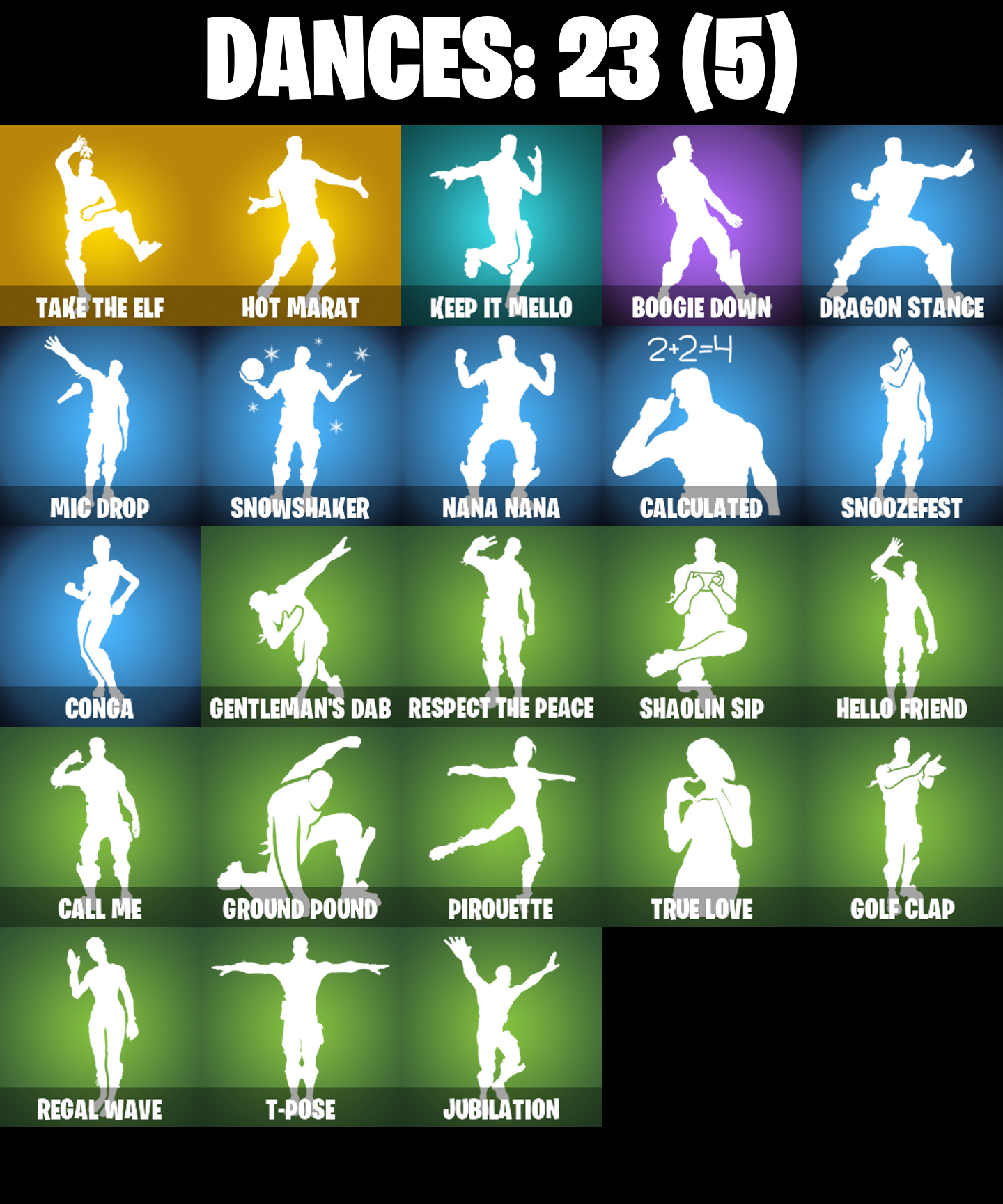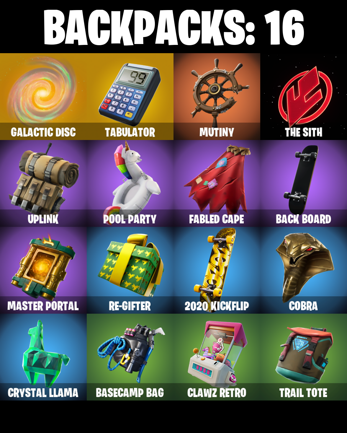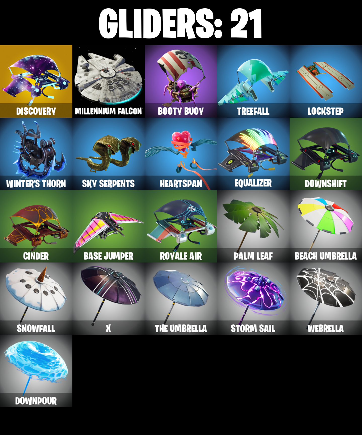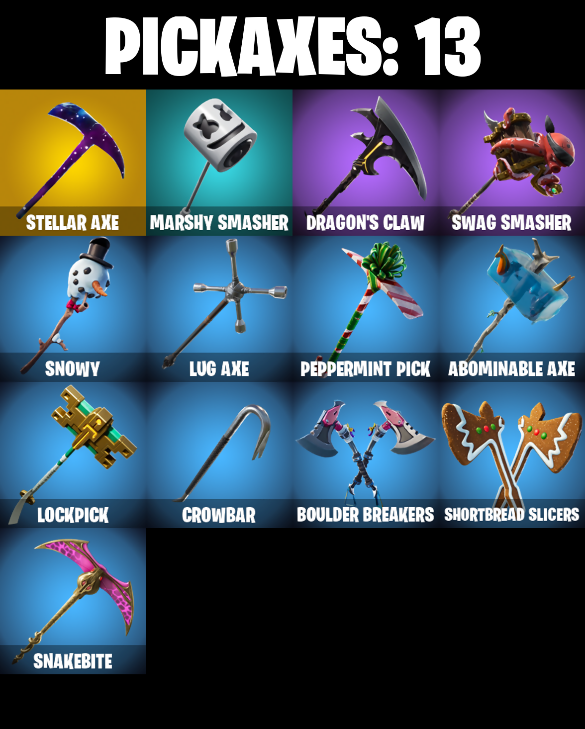 2020 Kickflip, Abominable Axe, Back Board, Base Jumper, Basecamp Bag, Beach Umbrella, Blackheart, Blackheart (Stage 8), Boogie Down, Booty Buoy, Boulder Breakers, Calculated, Call Me, Cinder, Clawz Retro, Cobra, Conga, Crowbar, Crystal Llama, Discovery, Downpour, Downshift, Dragon Stance, Dragon's Claw, Ember, Equalizer, Fabled Cape, Galactic Disc, Galaxy, Gentleman's Dab, Golf Clap, Ground Pound, Heartspan, Hello Friend, Hot Marat, Hybrid, Hybrid (Stage 4), Jubilation, Keep It Mello, Lockpick, Lockstep, Lt. Evergreen, Lug Axe, Marshy Smasher, Master Portal, Mic Drop, Millennium Falcon, Mutiny, Nana Nana, Palm Leaf, Peely, Peppermint Pick, Pirouette, Pool Party, Prodigy, Re-Gifter, Regal Wave, Respect The Peace, Royale Air, Shaolin Sip, Shortbread Slicers, Sidewinder, Sidewinder (Dark), Sky Serpents, Snakebite, Snoozefest, Snowfall, Snowshaker, Snowy, Stellar Axe, Storm Sail, Swag Smasher, T-Pose, Tabulator, Take The Elf, The Sith, The Umbrella, Trail Tote, Treefall, True Love, Uplink, Webrella, Winter's Thorn, Wooly Warrior, X