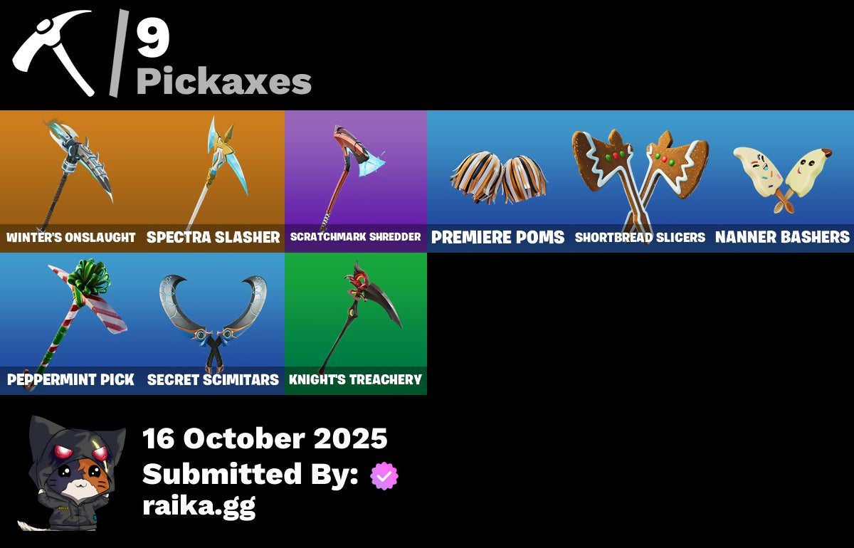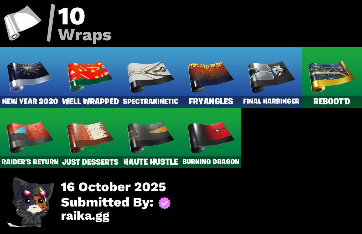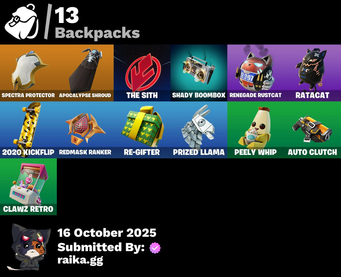 2020 Kickflip, Apocalypse Shroud, Auto Clutch, Burning Dragon, Call Me, Clawz Retro, Comet, Crowning Achievement, Determined Renegade, Do The Split, Downpour, Doze Dab, E.G.O., Final Harbinger, Fish Hook, Flashback Breakdown, Frostburn, Fryangles, Harbinger Armor Omegarok, Haute Hustle, Hope, Hope's Look, I'm A Mystery, Just Desserts, Knight's Helm, Knight's Honor, Knight's Treachery, Lil Split, Lil' Longboat, Lt. Evergreen, Millennium Falcon, Monks, Nanner Bashers, New Year 2020, Omegarok, Omegarok Grin, Peely Whip, Peppermint Pick, Premiere Poms, Prized Llama, Raider's Return, Raider's Wayfarer, Ratacat, Ratacat Roamer, Re-Gifter, Real Slim Shady, Rebel Brella, Reboot'd, Redmask Ranker, Renegade Lynx, Renegade River, Renegade Rustcat, Resistance Banner, Respect The Peace, Rocket League, Runway Racer, Scratchmark Shredder, Secret Scimitars, Shady Boombox, Shortbread Slicers, Sith, Skerran, Slim Shady, Snowshaker, Spectra Knight, Spectra Protector, Spectra Slasher, Spectrakinetic, Split Happens, Sundae Glider, The Sith, The Umbrella, Time Breaker Lil Split, Time Breaker Renegade Lynx, Time Brella, Tootsee, Treefall, Wanted: Jones, Well Wrapped, Winter's Onslaught, Wooly Warrior