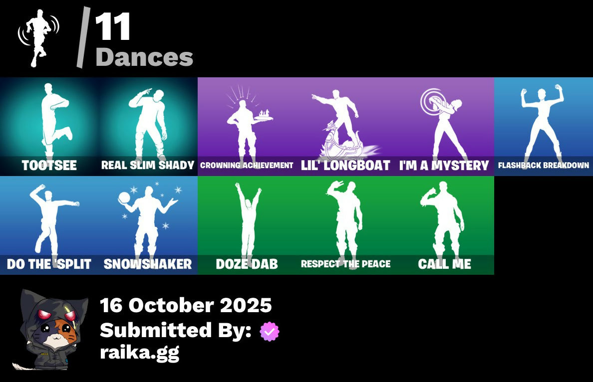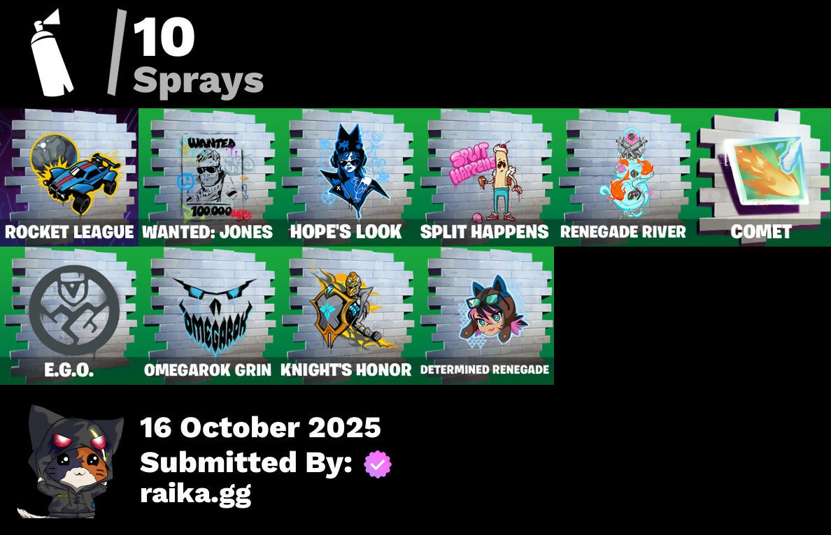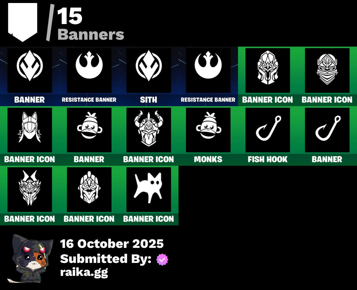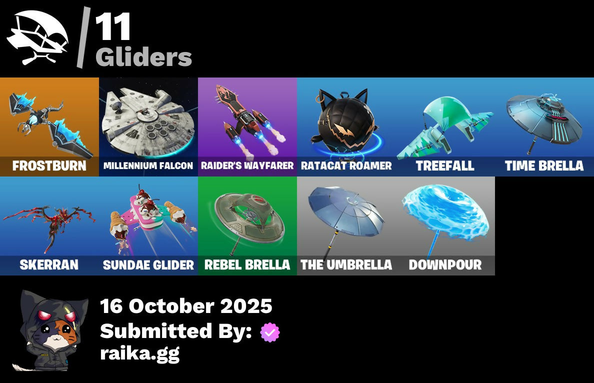 2020 Kickflip, Apocalypse Shroud, Auto Clutch, Burning Dragon, Call Me, Clawz Retro, Comet, Crowning Achievement, Determined Renegade, Do The Split, Downpour, Doze Dab, E.G.O., Final Harbinger, Fish Hook, Flashback Breakdown, Frostburn, Fryangles, Harbinger Armor Omegarok, Haute Hustle, Hope, Hope's Look, I'm A Mystery, Just Desserts, Knight's Helm, Knight's Honor, Knight's Treachery, Lil Split, Lil' Longboat, Lt. Evergreen, Millennium Falcon, Monks, Nanner Bashers, New Year 2020, Omegarok, Omegarok Grin, Peely Whip, Peppermint Pick, Premiere Poms, Prized Llama, Raider's Return, Raider's Wayfarer, Ratacat, Ratacat Roamer, Re-Gifter, Real Slim Shady, Rebel Brella, Reboot'd, Redmask Ranker, Renegade Lynx, Renegade River, Renegade Rustcat, Resistance Banner, Respect The Peace, Rocket League, Runway Racer, Scratchmark Shredder, Secret Scimitars, Shady Boombox, Shortbread Slicers, Sith, Skerran, Slim Shady, Snowshaker, Spectra Knight, Spectra Protector, Spectra Slasher, Spectrakinetic, Split Happens, Sundae Glider, The Sith, The Umbrella, Time Breaker Lil Split, Time Breaker Renegade Lynx, Time Brella, Tootsee, Treefall, Wanted: Jones, Well Wrapped, Winter's Onslaught, Wooly Warrior