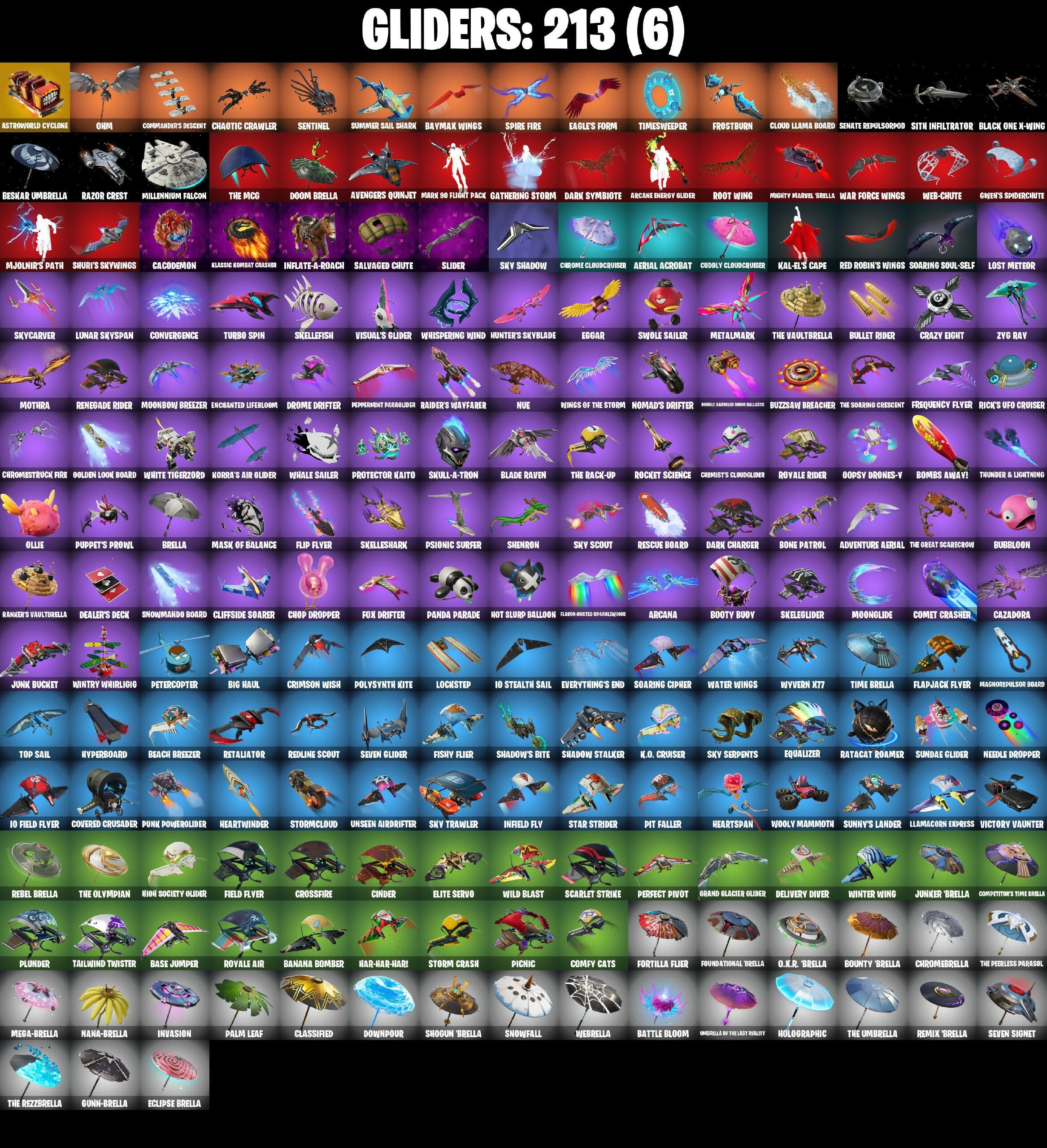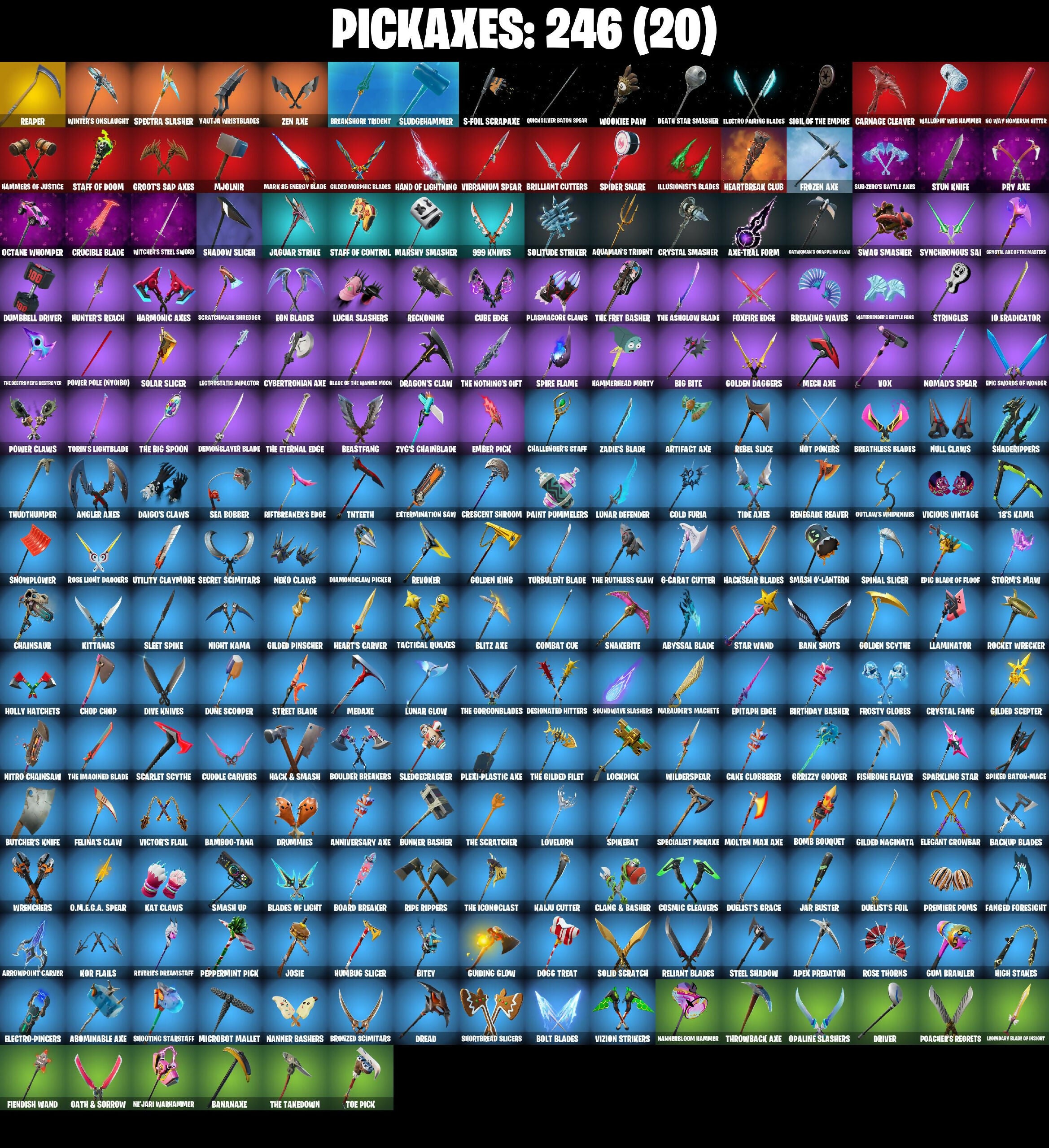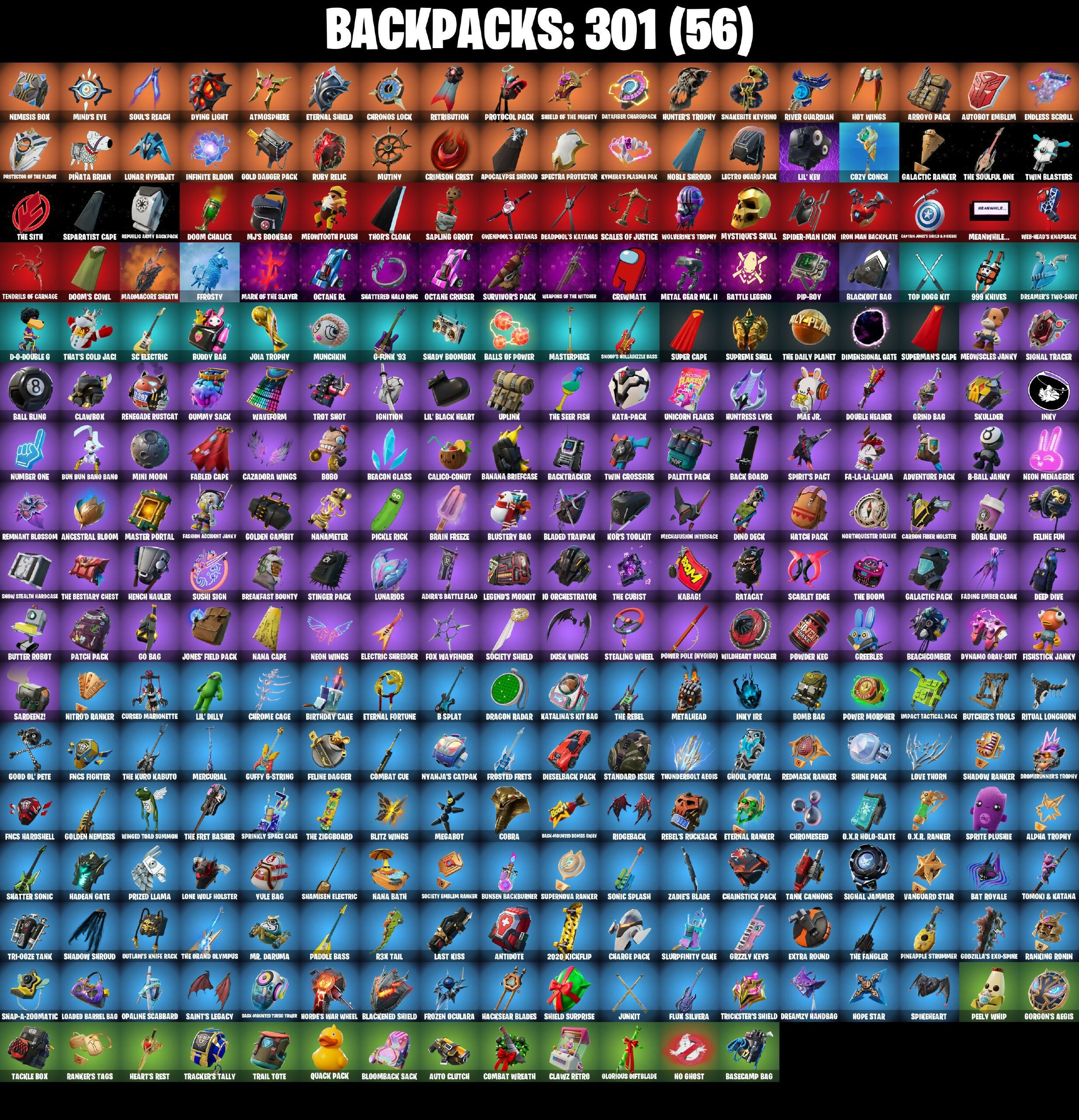 *Keyed Up, 1-Ball, 10 Field Flyer, 10 Stealth Sail, 18's Kama, 2020 Kickflip, 6-Carat Cutter, 8-Ball Janky, 8-Ball Vs Scratch, 999 Knives, A Warrior Prepares, Abominable Axe, Absenz, Abyssal Blade, Adira's Battle Flag, Adventure Aerial, Adventure Pack, Aerial Acrobat, Aerial Assault Bomber, Agent Jones, Agent Jones (Jump 31), Agent Peely, Air Shredder, Alpha Trophy, Ancestral Bloom, Andy Fangeron, Angler Axes, Anniversary Axe, Antidote, Apex Predator, Aphrodite, Apocalypse Shroud, Aquaman, Aquaman's Trident, Arachrobatics, Arcana, Arcane Energy Glider, Arctic Adeline, Arrowpoint Carver, Arroyo Pack, Arthur Curry, Artifact Axe, Ask Me, Astro Armor, Astroworld Cyclone, Atmosphere, Aurelian, Auto Clutch, Autobot Emblem, Avatar's Flourish, Avengers Quinjet, Axe-Tral Form, Azarath Metrion Zinthos, B Splat, B.R.U.T.E. Gunner, Back Board, Back-Mounted Bombs Chevy, Backtracker, Backup Blades, Balance Board, Ball Bling, Balls Of Power, Bamboo-Tana, Banana Bomber, Banana Briefcase, Bananaxe, Bank Shots, Baron's Hoard, Base Jumper, Basecamp Bag, Bat Royale, Battle Blessing, Battle Bloom, Battle Legend, Baymax Wings, Beach Breezer, Beachcomber, Beacon Glass, Bean Bag, Beastfang, Beep Beep, Beerus, Beskar, Beskar Umbrella, Big Bite, Big Fan, Big Haul, Bike To Go, Bim Bam Boom, Birthday Basher, Birthday Cake, Bitey, Bizcochito, Black Eternal Knight, Black One X-wing, Blackened Shield, Blackheart, Blackout Bag, Blade Raven, Blade of The Waning Moon, Bladed Travpak, Blades of Light, Blitz Axe, Blitz Wings, Blizzibelle, Bloomback Sack, Blustery Bag, Board Breaker, Boba Bling, Boba Snack, Bobo, Bolt Blades, Bomb Bag, Bomb Bouquet, Bombs Away!, Bone Patrol, Boogie Down, Boomin', Boosting Ki, Boots 'N' Cats, Booty Buoy, Boulder Breakers, Bounty Brella, Brain Freeze, Breakfast Bounty, Breaking Waves, Breakpoint, Breakshore Trident, Breathless Blades, Brella, Brilliant Cutters, Brite Bomber, Bronzed Scimitars, Brush Your Shoulders, Bubbloon, Buddy Bag, Bullen Brawler Dusty, Bullet Rider, Bun Bun Banjo Banjo, Bunker Basher, Bunker Jonesy, Bunsen Backburner, Burning Ambition Bullseye, Burning Ember, Butcher's Knife, Butcher's Tools, Butter Robot, Buzzsaw Breaker, Bytes, Cacodemon, Cake Clobberer, Calamity, Calico-Conut, Call Me, Called Shot, Captain Clamerica, Captain James's Skull & Phone, Carbon Fiber Holster, Card Drop, Cardistry, Carefree, Carnage, Carnage Cleaver, Catalyst, Catwoman's Grappling Claw, Cauldron Chill, Cazadora, Cazadora Wings, Cerberus, Chainsaur, Chainstick Pack, Chalked Up 1-Ball, Challenger's Staff, Chaos Director, Chaotic Crawler, Charge Pack, Charlotte, Chef's Special, Chemist's Cloudglider, Choice Knit, Chop Chop, Chop Dropper, Chrome Cage, Chrome Cloudcruiser, Chrome Punk, Chromebrella, Chromesseo, Chromestruck Fire, Cinder, Clang & Basher, Clark Kent, Classic Wolverine, Classified, Clawbox, Clawz Retro, Clean Sweep, Cliffside Soarer, Clone Trooper, Cloud Llama Board, Club President Relik, Cluck, Cluck (Slurpy), Cluck Strut, Cobra, Coin Flip, Cold Furia, Colossal Manical-Raime, Combat Cue, Combat Tech Jules, Combat Wreath, Comet Crasher, Comfy Cats, Commander's Descent, Competitor's Time Brella, Conch Call, Conga, Controller Crew, Convergence, Cosmic Cleavers, Count It!, Covered Crusader, Cozy Conch, Crazy Eight, Crescent Shroom, Crewmate, Crimson Crest, Crimson Wish, Cronus Lock, Crossfire, Crowning Achievement, Crucible Blade, Crystal Axe of The Masters, Crystal Fang, Crystal Smasher, Cube Assassin, Cube Edge, Cuddle Carvers, Cuddly Cloudcruiser, Curling Iron, Cursed Marionette, Cybertronian Axe, Cyclo Curl, D-O-Double G, DJ Yonder, Daigo, Daigo's Claws, Dance Off, Dark, Dark Charger, Dark Symbiote, Dark-Mounted Turbo Tower, Datafiber Chardvpack, Dawn Duelist Nissa, Deadpool, Deadpool's Katanas, Dealer's Deck, Death Star Smasher, Deep Dive, Delivery Diver, Demi, Demon Hunter Hope, Demon Slayer Blade, Designated Hitters, Diamond Diva, Diamond Throne, Diamondclaw Picker, Dieselback Pack, Dimensional Gate, Dino Deck, Dirtbike Challenge, Distraction Dance, Dive Knives, Dizzie, Do The Split, Doctor Doom, Doctor Slone, Dogg Treat, Dome Drakens Trophy, Don't Start Now, Doom Brella, Doom Chalice, Doom Slayer, Doom's Cowl, Double Header, Downpour, Doze Dab, Dragon Radar, Dragon Stance, Dragon's Claw, Dramatic Flares, Dread, Dreamer's Two-Shot, Dreamzy Handbag, Driver, Drome Drifter, Droop, Droopy, Drummies, Duelist's Foil, Duelist's Grace, Dumbbell Driver, Dune Scooper, Dusk, Dusk Wings, Dusty, Dying Light, Dynamo Grav-Suit, Dynamo Tntina, Dynamo Tntona-B, Eagle's Form, Eclipse Brella, Eggar, Electric Shredder, Electro Pairing Blades, Electro-Pincers, Electrostatic Impactor, Elegant Crowbar, Elite Servo, Ember, Ember Pick, Empress Fan Dance, Enchanted Lifebloom, Endless Scroll, Energized Godzilla, Eon Blades, Epic Blade of Floof, Epic Swords of Wonder, Epitaph Edge, Equalizer, Era, Eternal Fortune, Eternal Knight, Eternal Ranker, Eternal Shield, Evasive Maneuvers, Everything's End, Explorer Emilie, Expressionism, Extermination Saw, Extra Round, FNCS Fighter, FNCS Hardshell, FNCS Renegade, Fa-La-La-Llama, Fabio Sparklzlane, Fable, Fabled Cape, Fade, Fading Ember Cloak, Fancy Peter Griffin, Fang Dance, Fanged Foresight, Fashion Accident Janky, Felina, Felina's Claw, Feline Dagger, Feline Fun, Ffrostv, Field Flyer, Fiendish Wand, Finesse Finisher, Fishbone Flayer, Fishy Flier, Fisstick Janky, Fist Bump, Flapjack Flyer, Flashback Breakdown, Flip Flyer, Flippin' Away, Flux Silvera, Foil Flex, Fortilla Flier, Foundational Brella, Fox Drifter, Fox Wayfinder, Foxfire Edge, Frequency Flyer, Frost Squad, Frostburn, Frosted Frets, Frosty Globes, Frozen Axe, Frozen Oculata, G-Funk '93, Galactic Pack, Galactic Ranker, Gangnam Style, Gathering Storm, Gear Specialist Maya, Gentleman's Dab, Geralt Of Rivia, Get Griddy, Get Out Of Your Mind, Ghoul Portal, Giddy-Up, Gilded Morphic Blades, Gilded Naginata, Gilded Pinscher, Gilded Scepter, Glorious Giftblade, Go Bag, Go Mufasa, Godzilla Evolved, Godzilla's Exo-